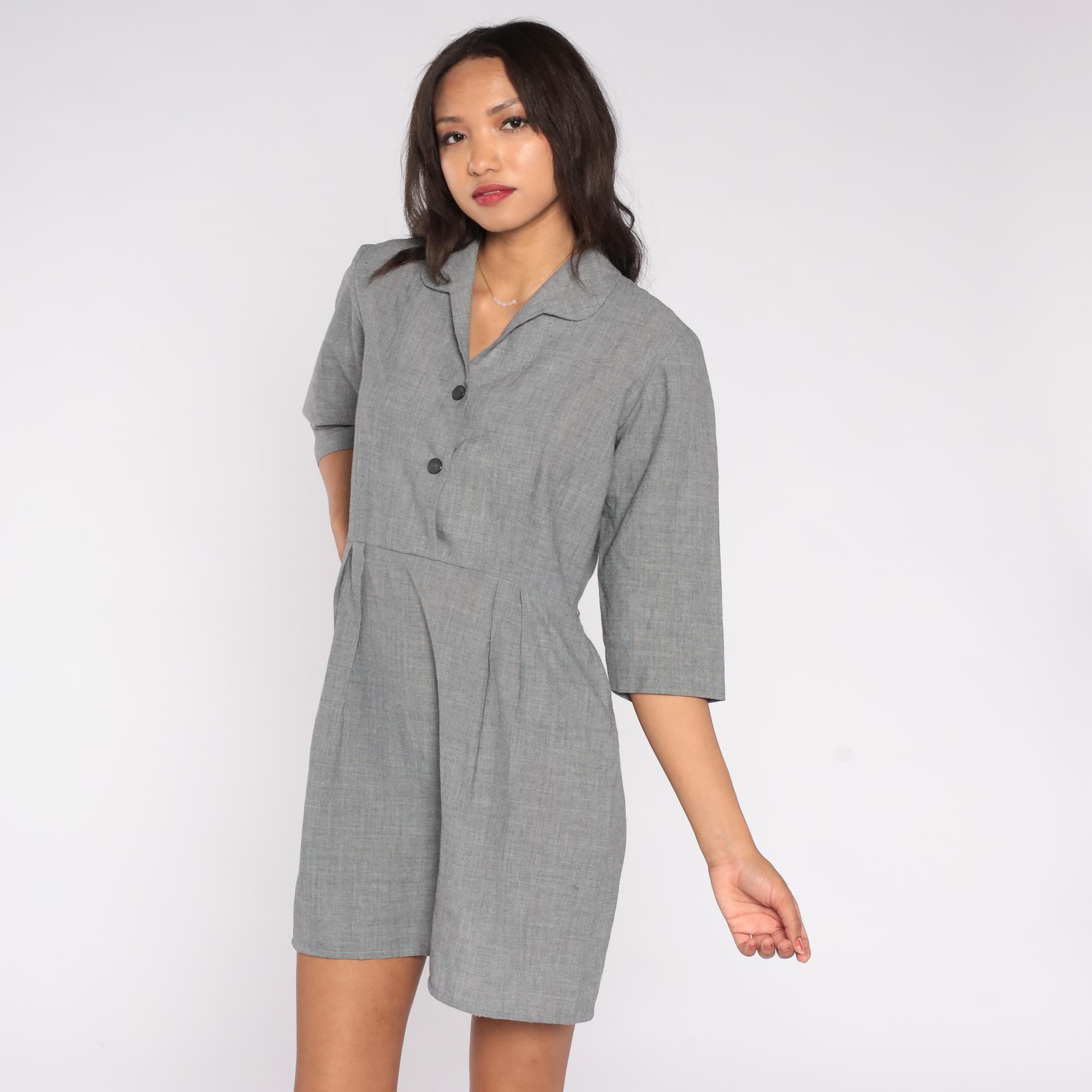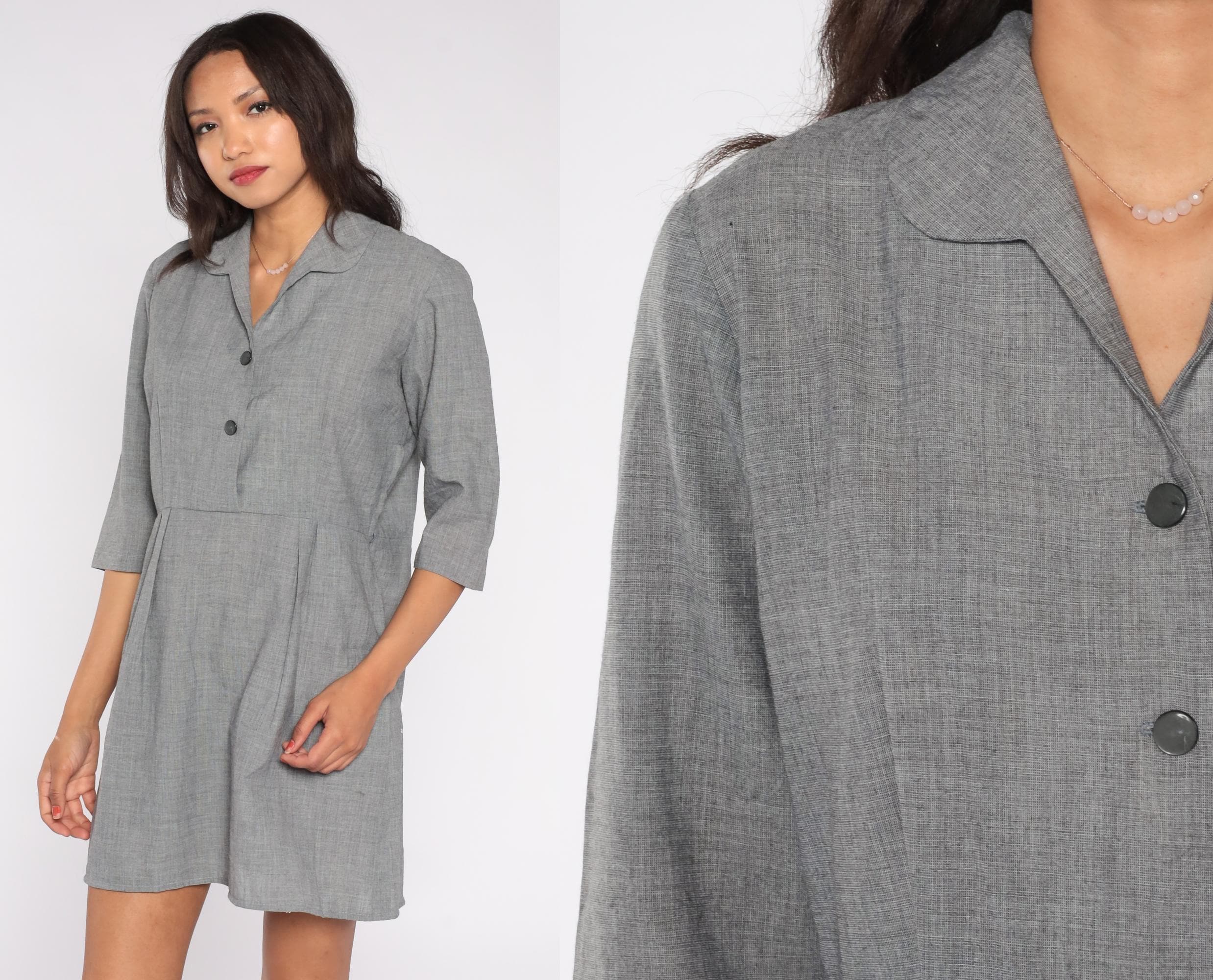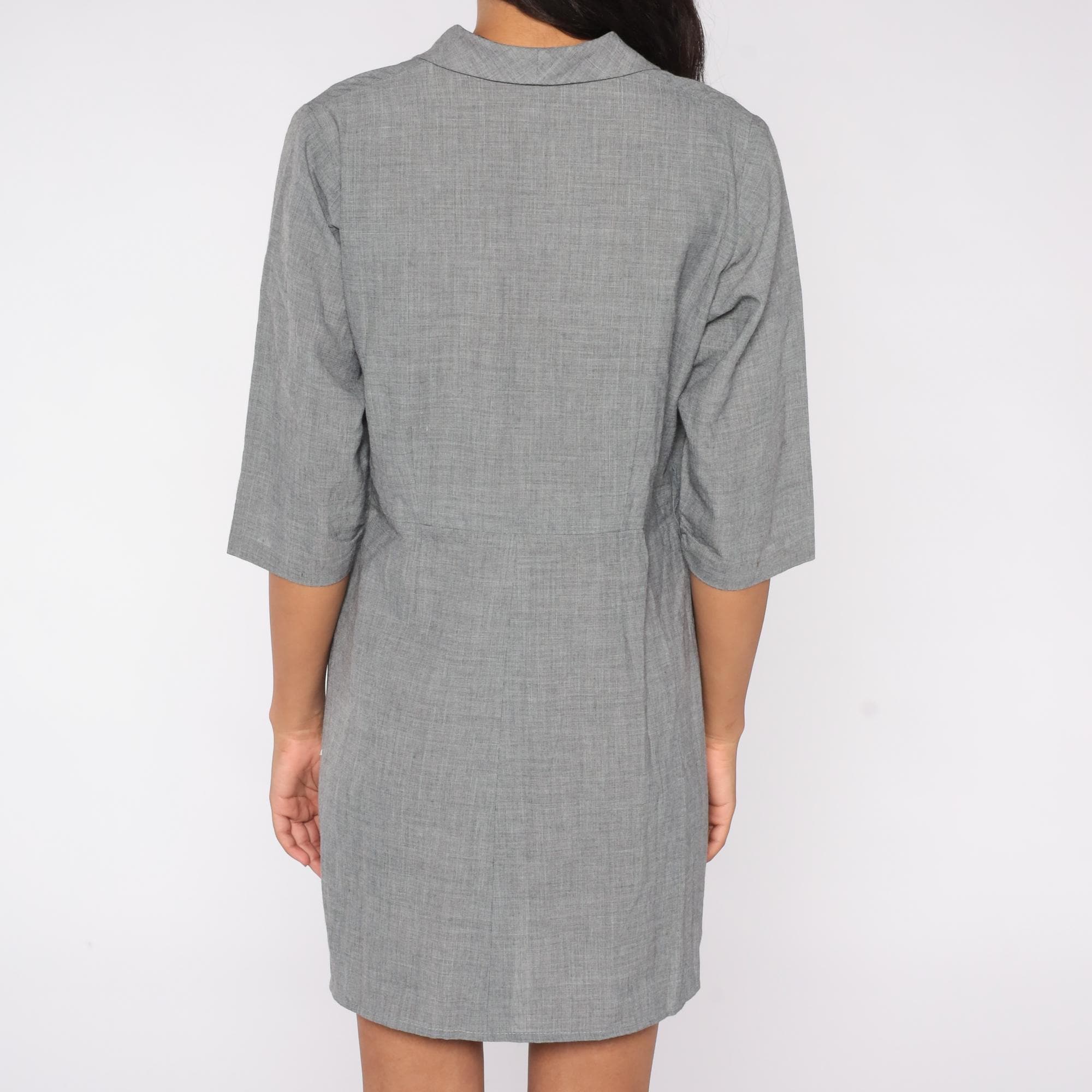 1950s grey shirt dress featuring button-front closure with collar and 3/4 sleeves. Classic A-line silhouette with waist definition and knee-length hemline. Back zip closure.