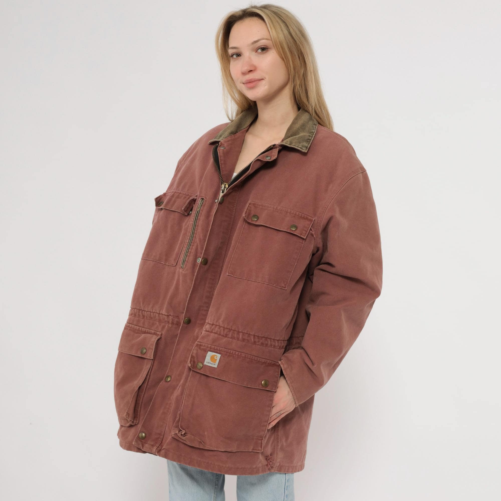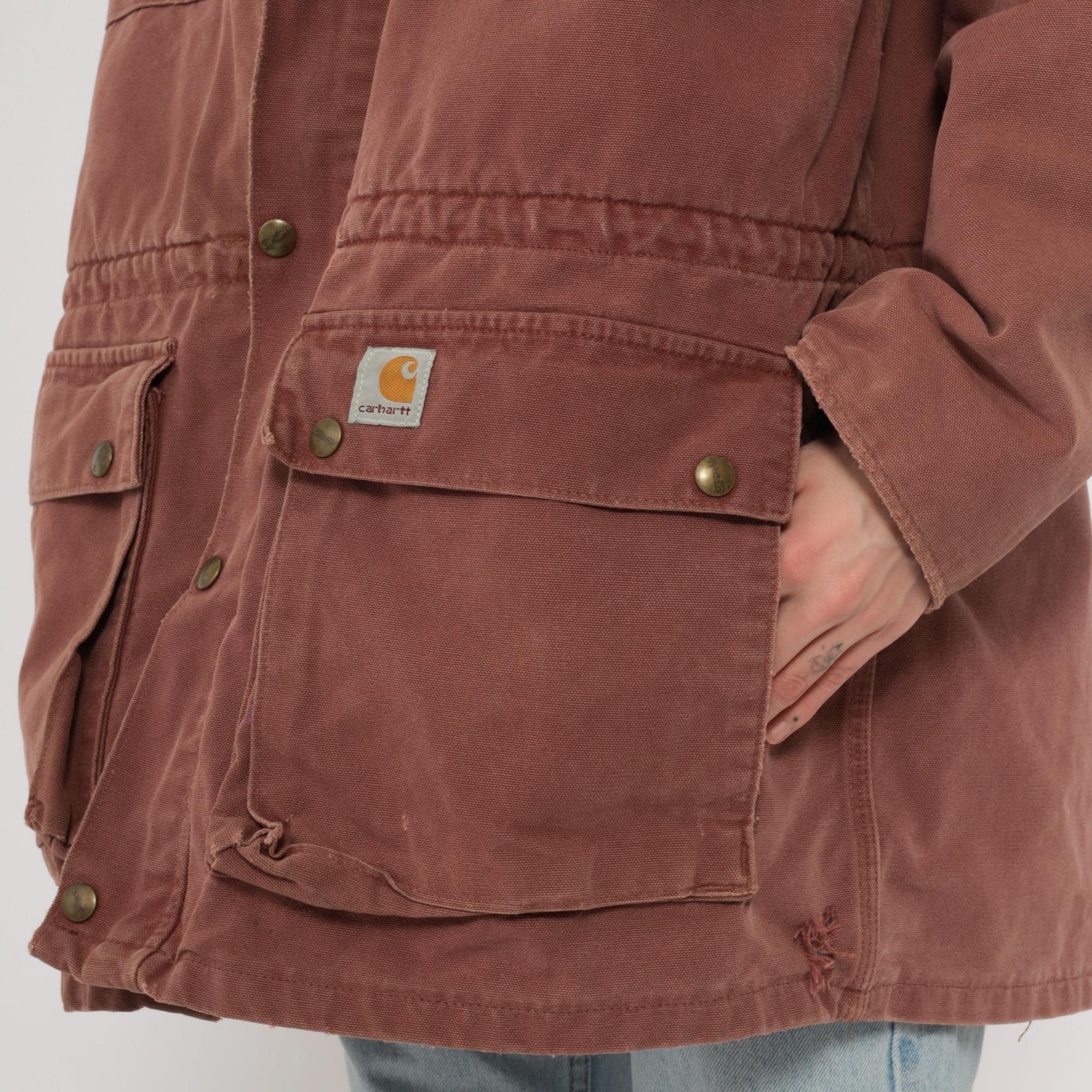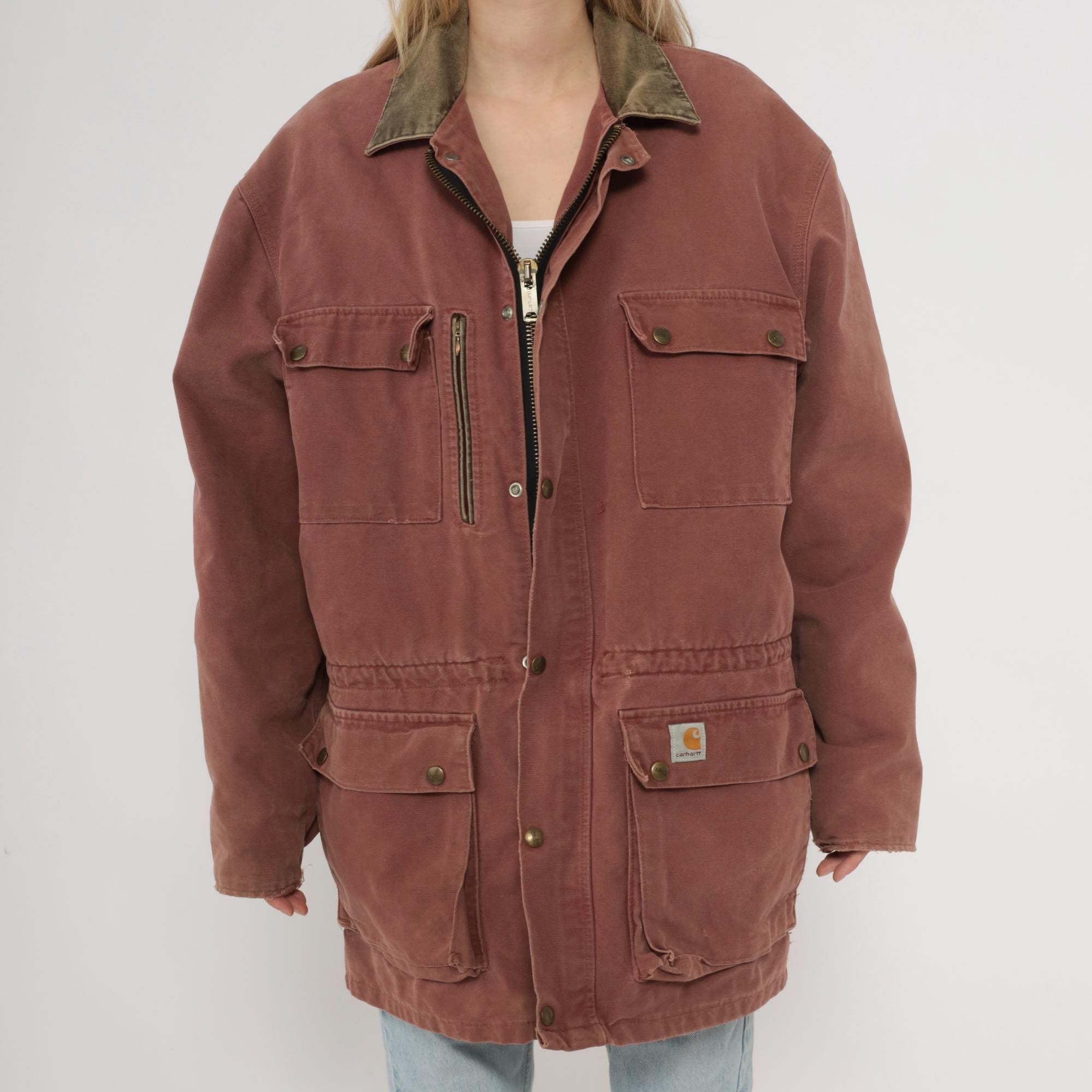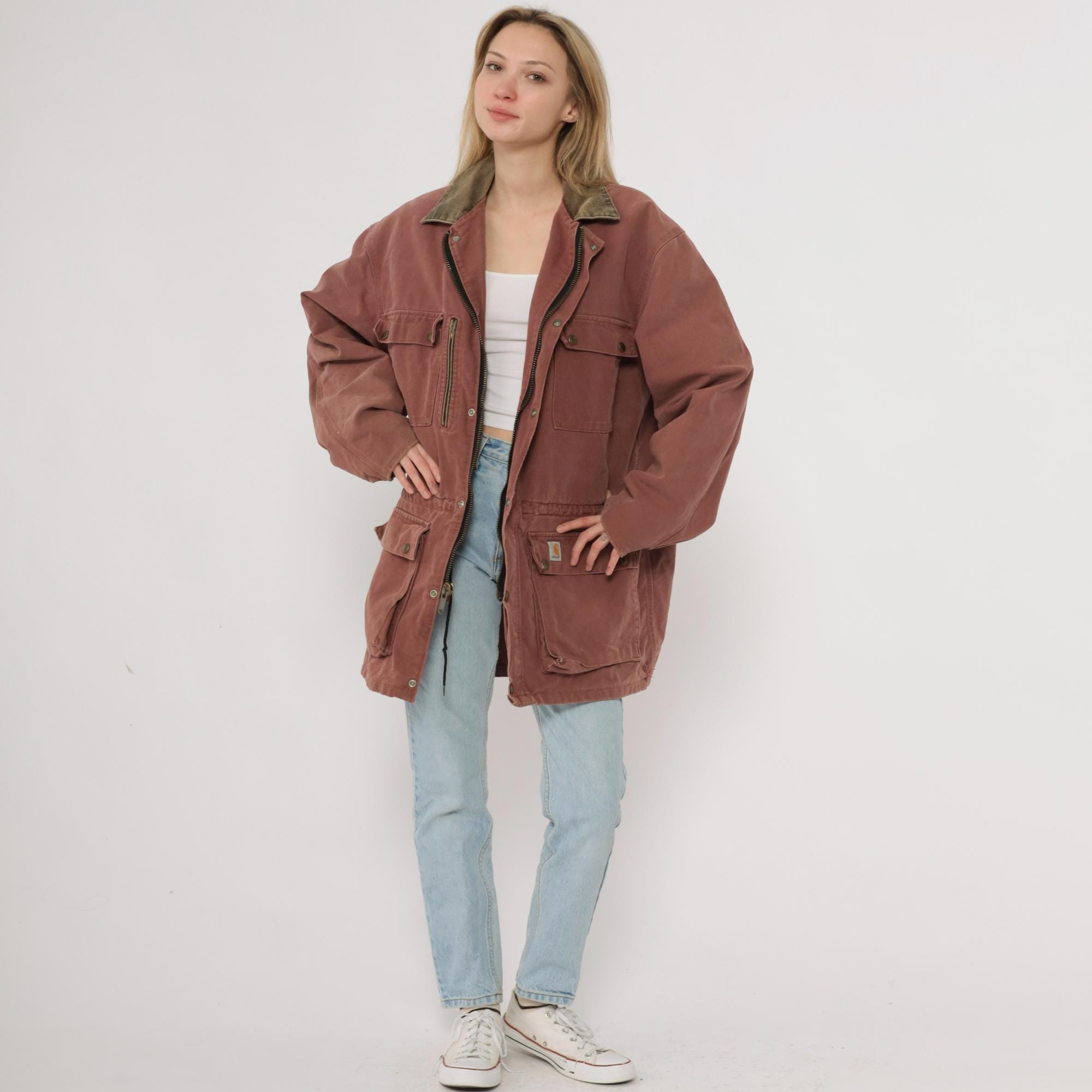 90s brown Carhartt chore coat jacket featuring heavy canvas duck cotton with blanket lining. Multiple chest and lower pockets with snap closures, zip front with snap storm flap, and contrast collar.