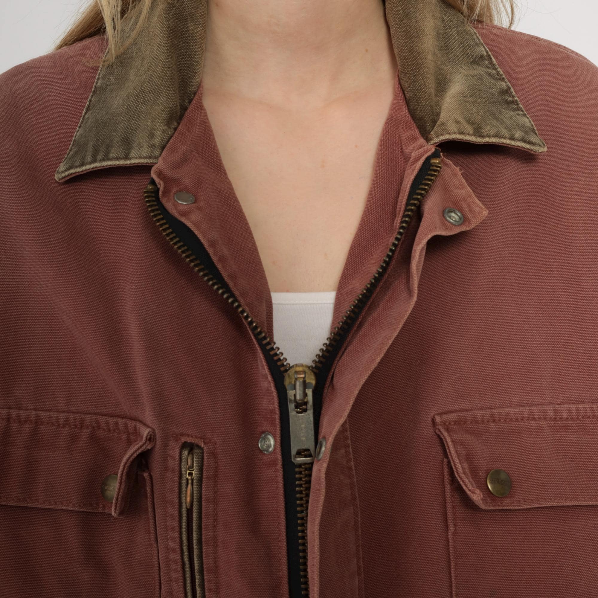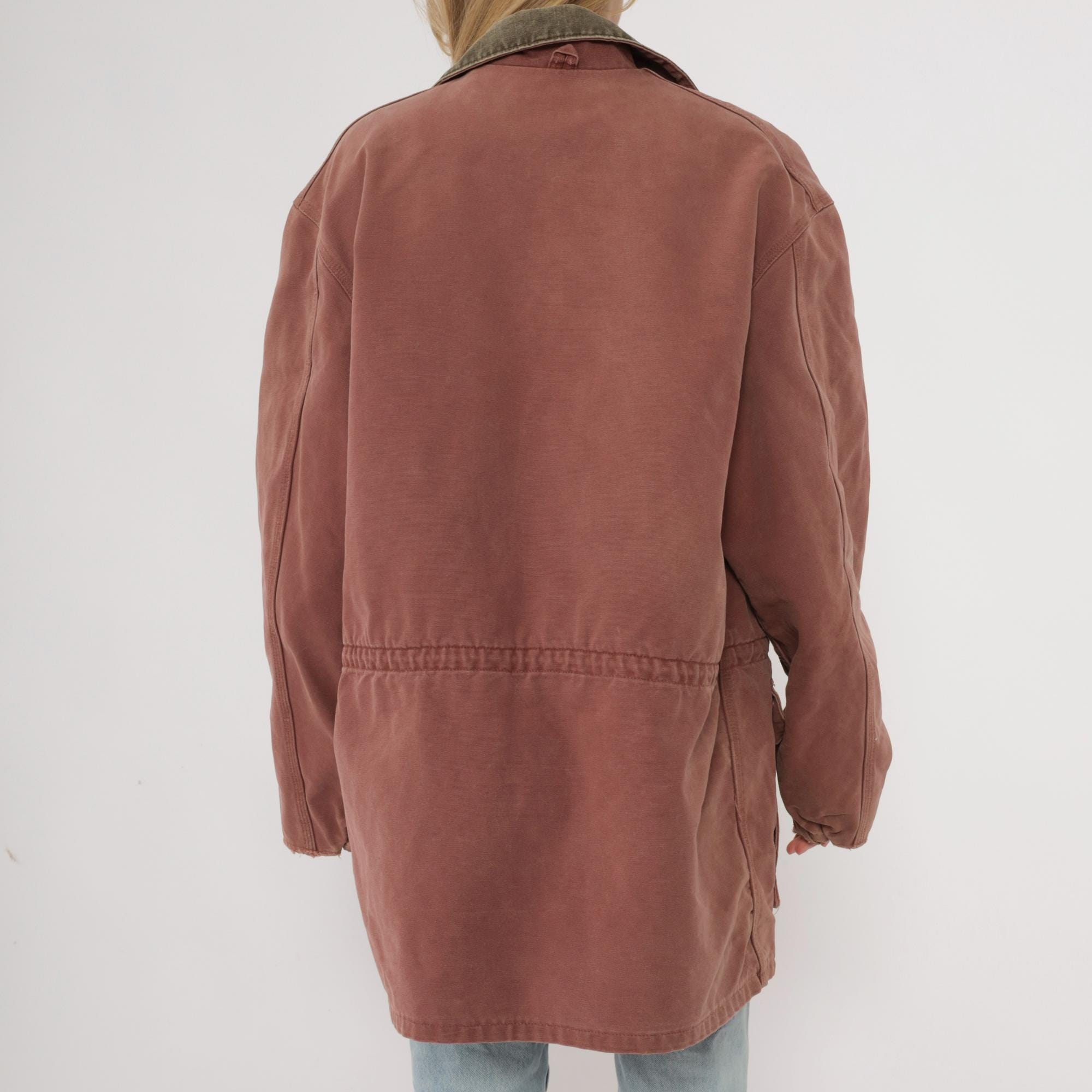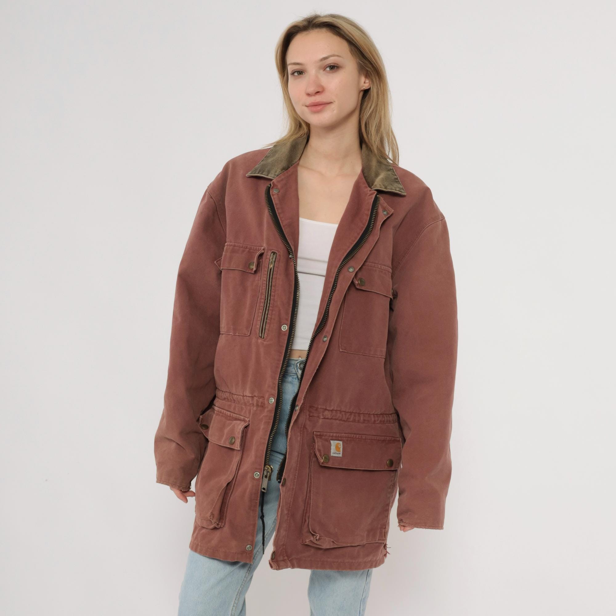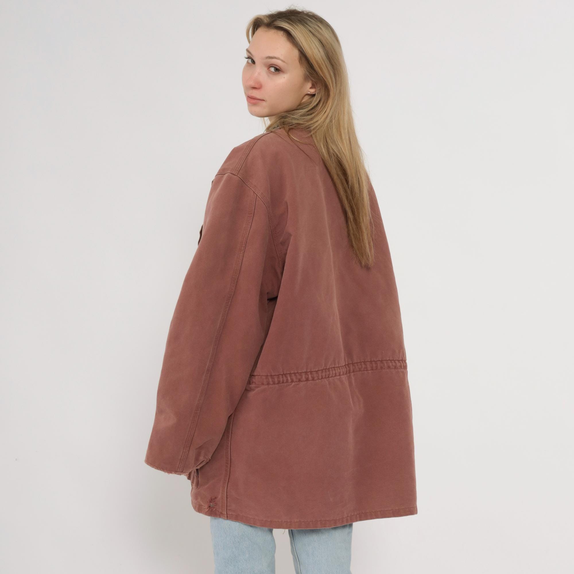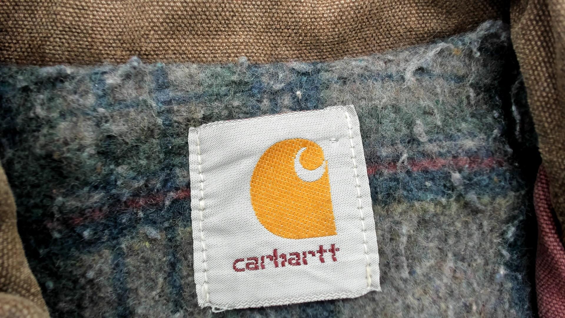 90s brown Carhartt chore coat jacket featuring heavy canvas duck cotton with blanket lining. Multiple chest and lower pockets with snap closures, zip front with snap storm flap, and contrast collar.