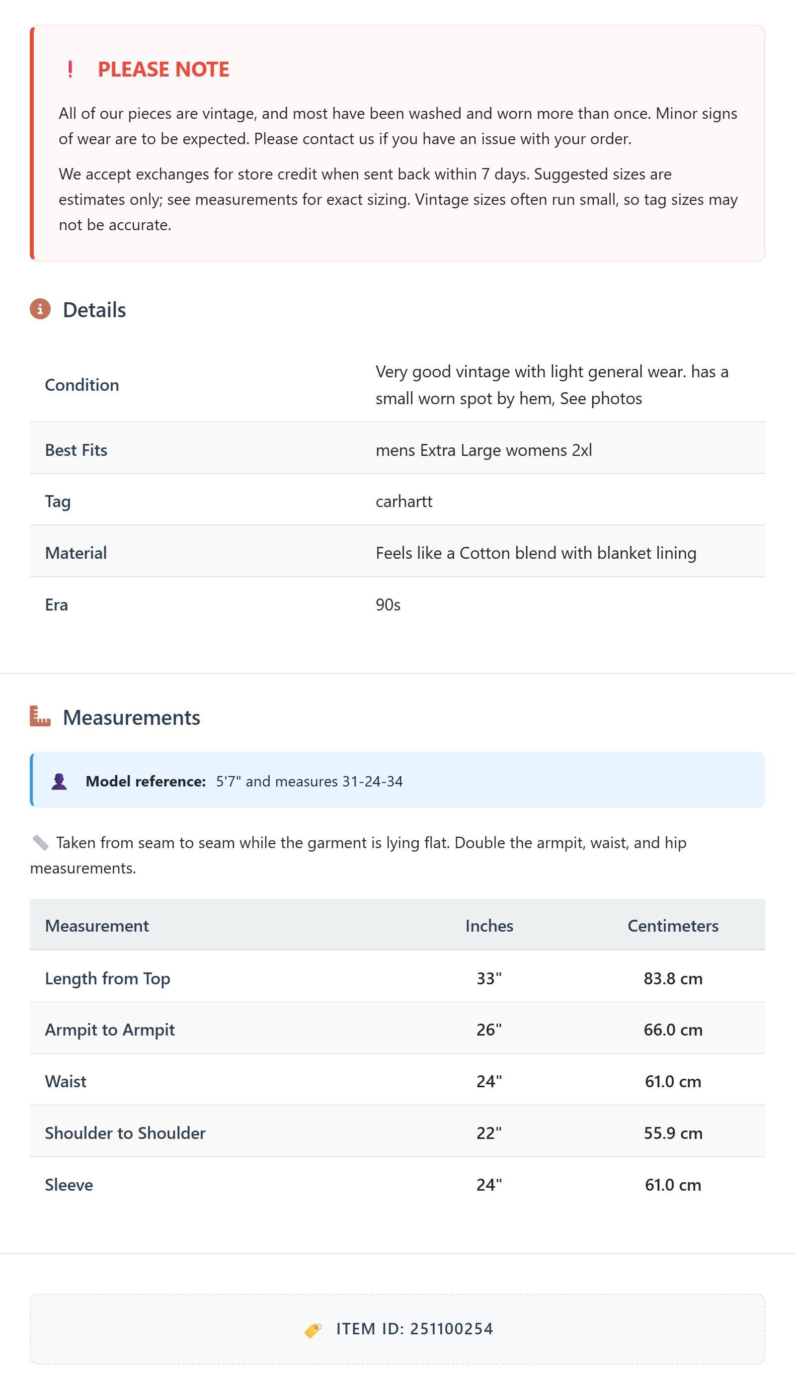 All of our pieces are vintage, and most have been washed and worn more than once. Minor signs of wear are to be expected. Please contact us if you have an issue with your order. We accept exchanges for store credit when sent back within 7 days.