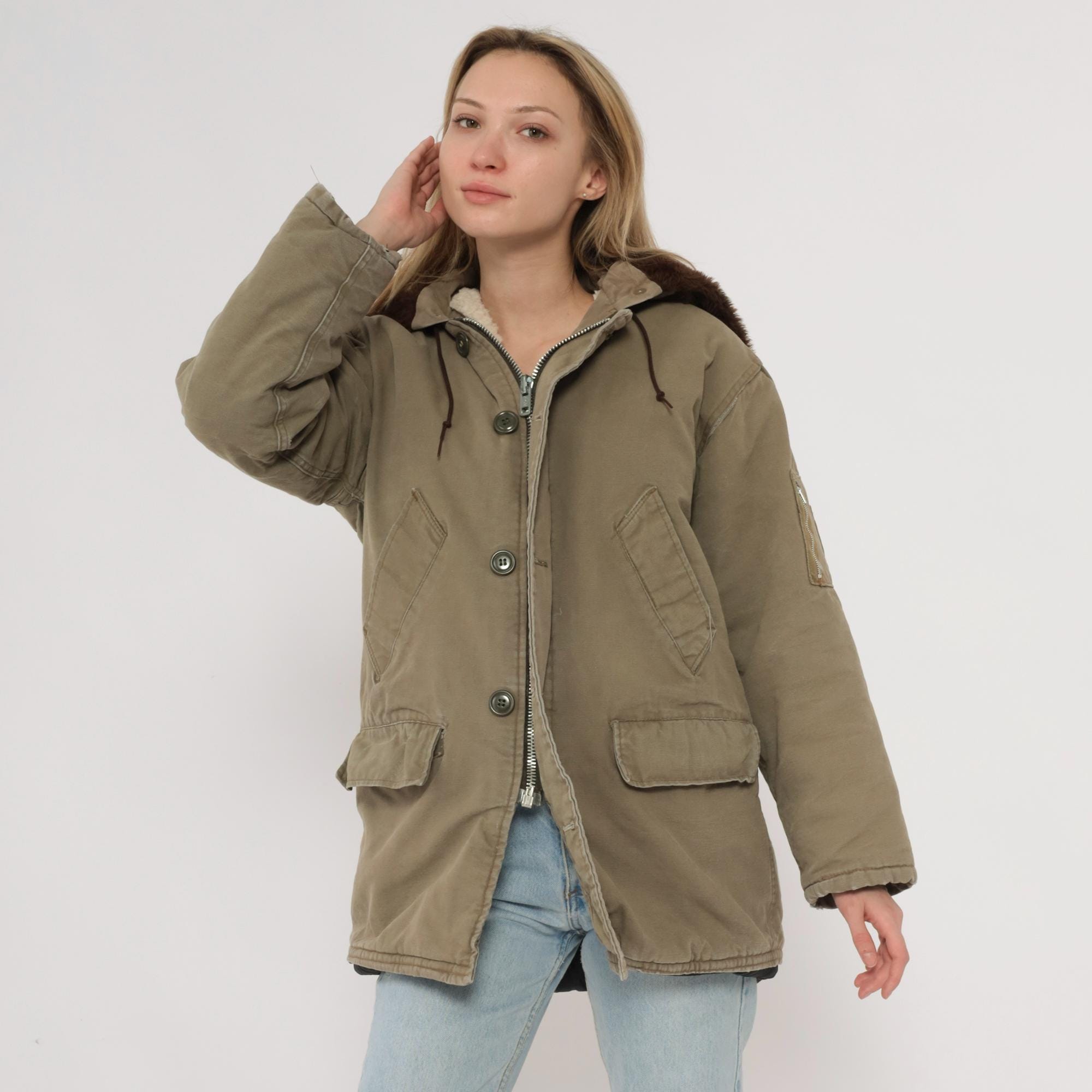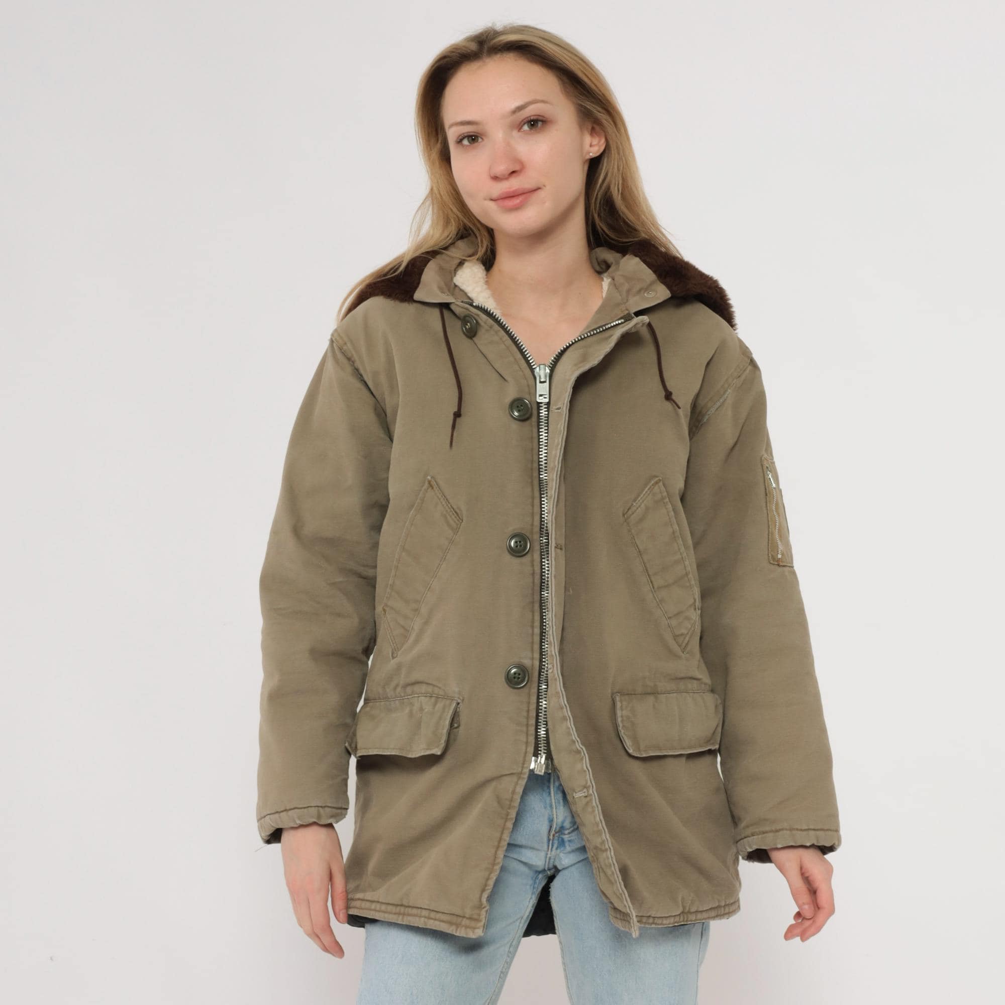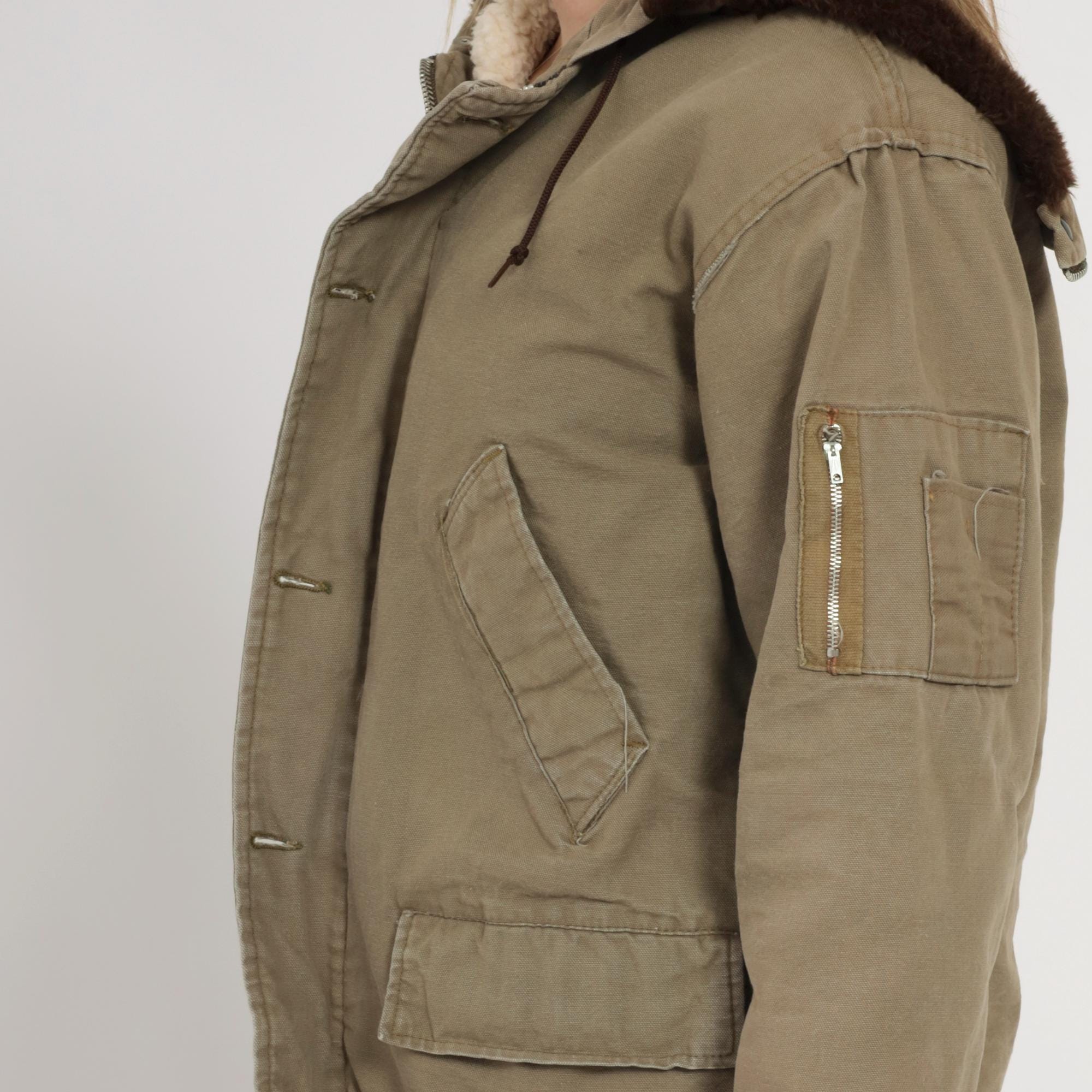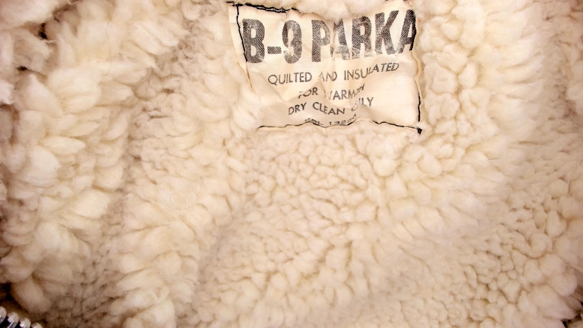 WWII B-9 parka from 1943-1945 featuring olive military cotton with faux sherpa lining and detachable fur collar. Hooded design with button and zip front closure, multiple pockets, and drawstring waist. Authentic wartime military issue piece.