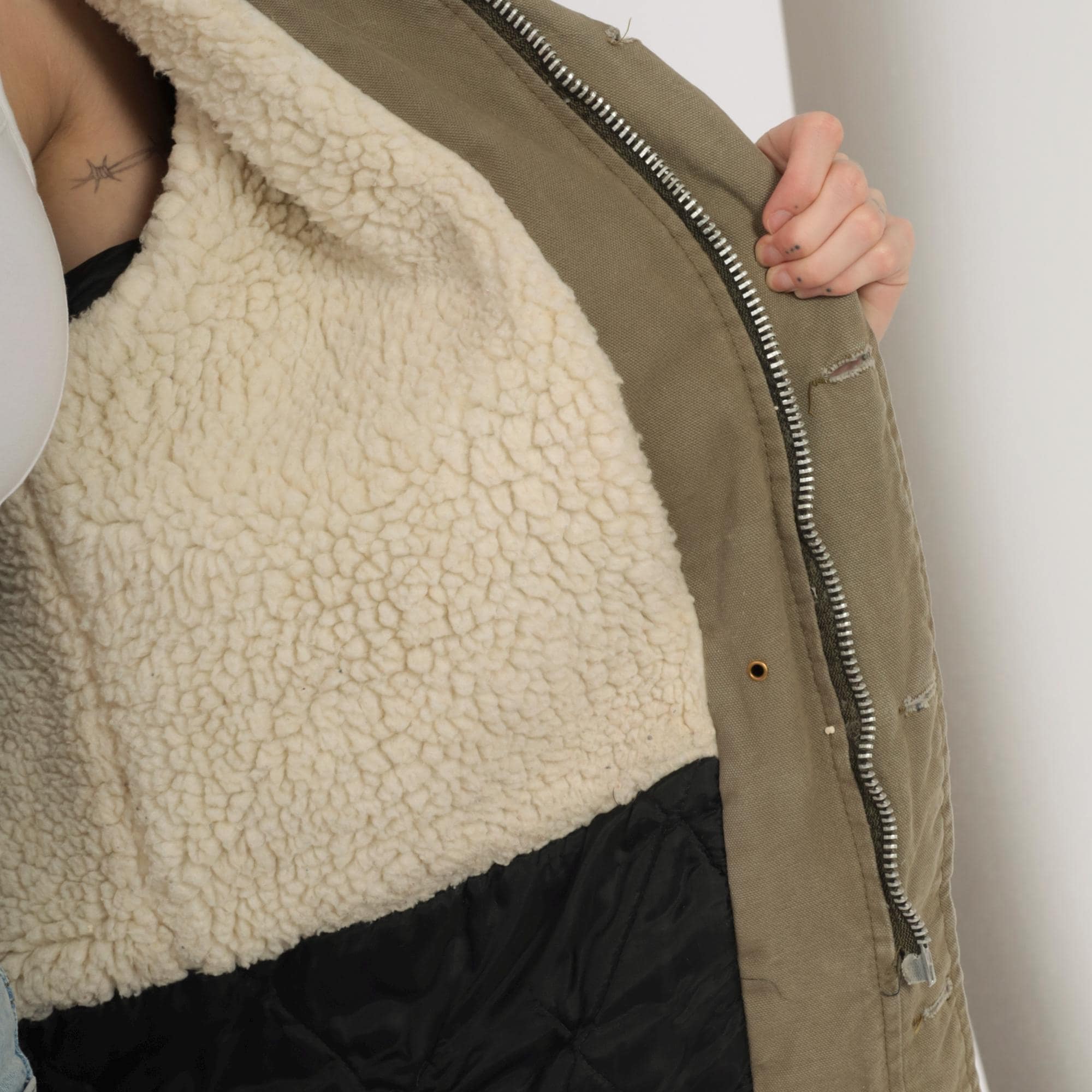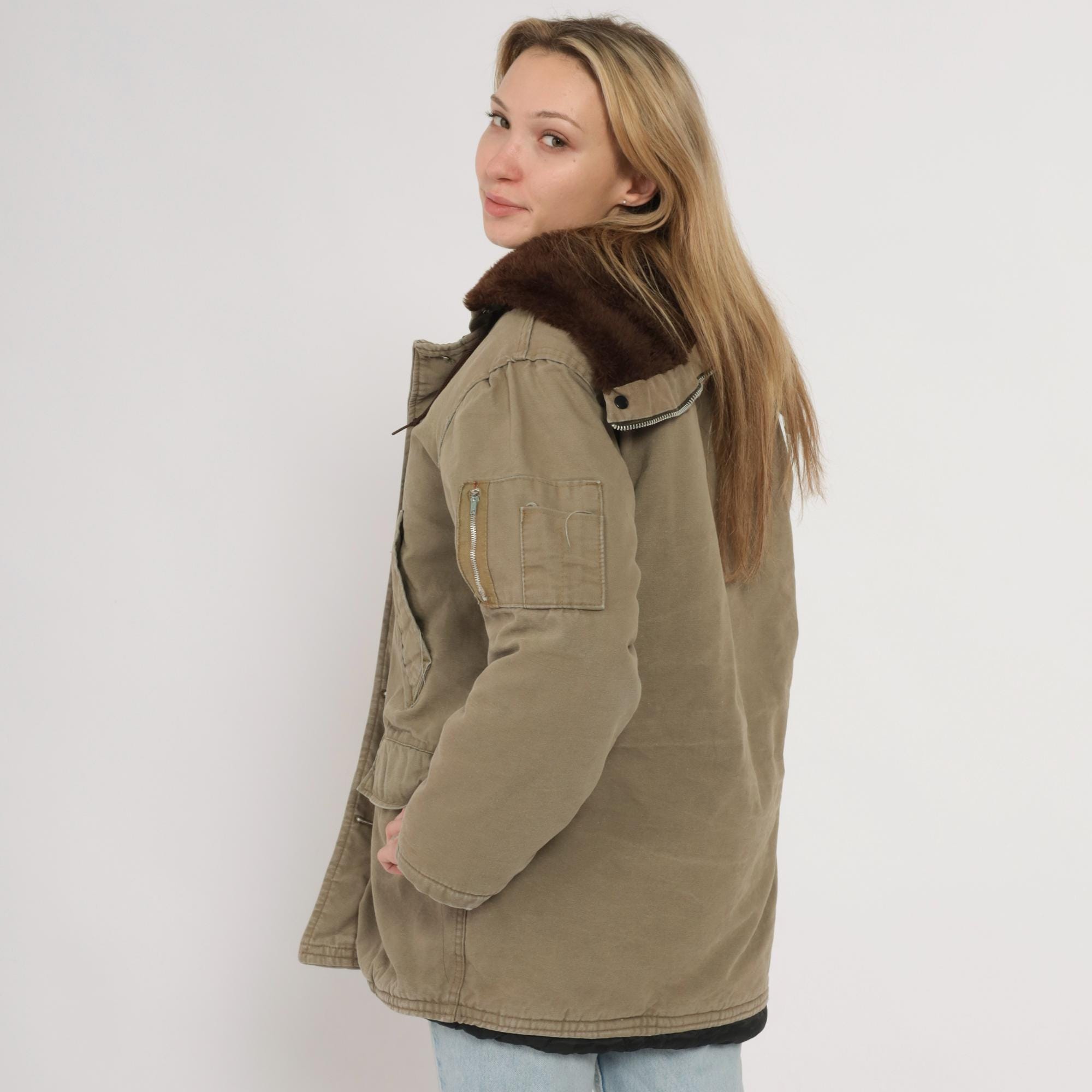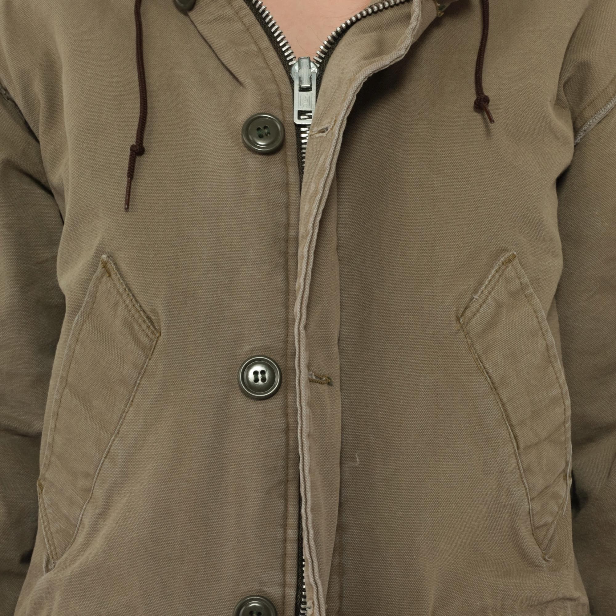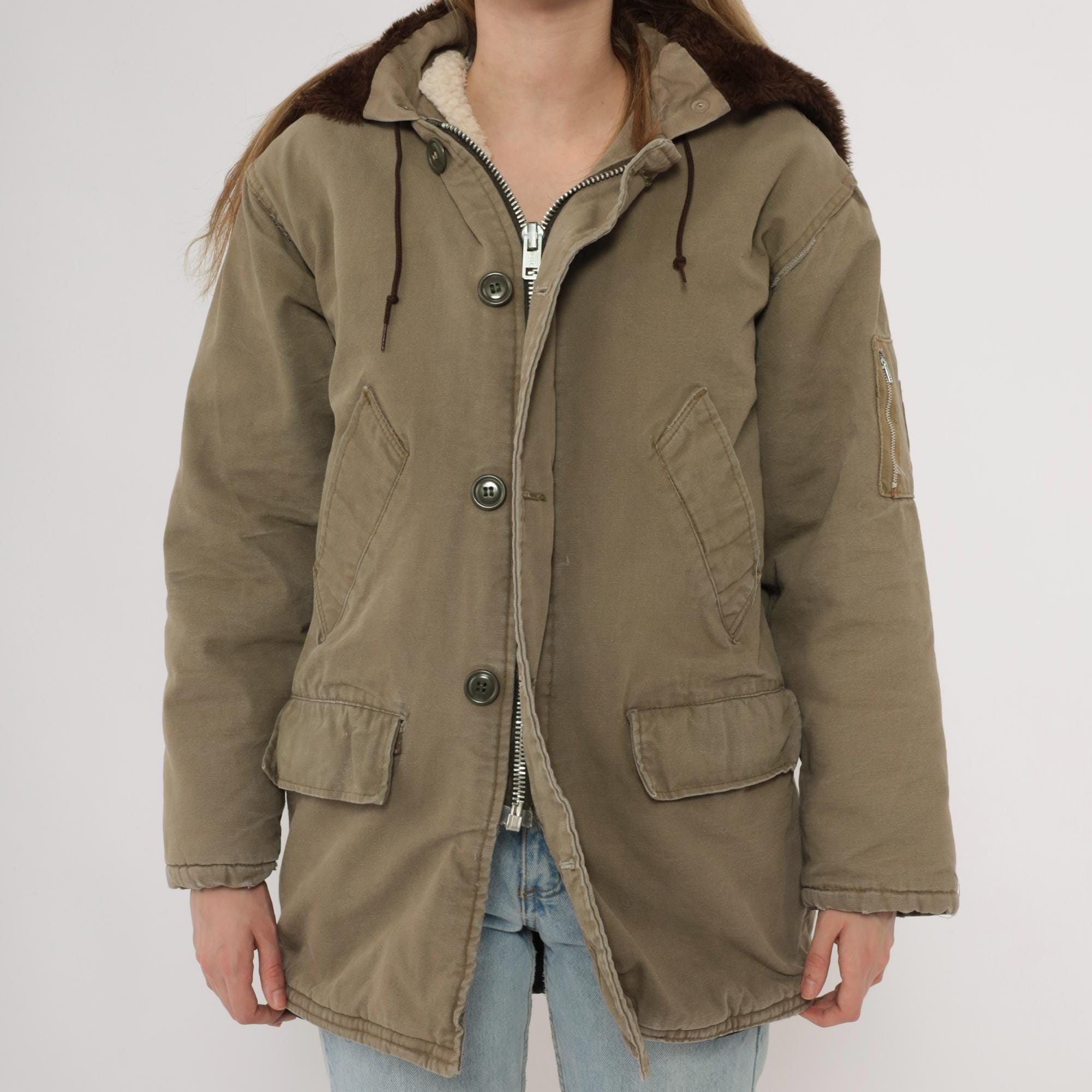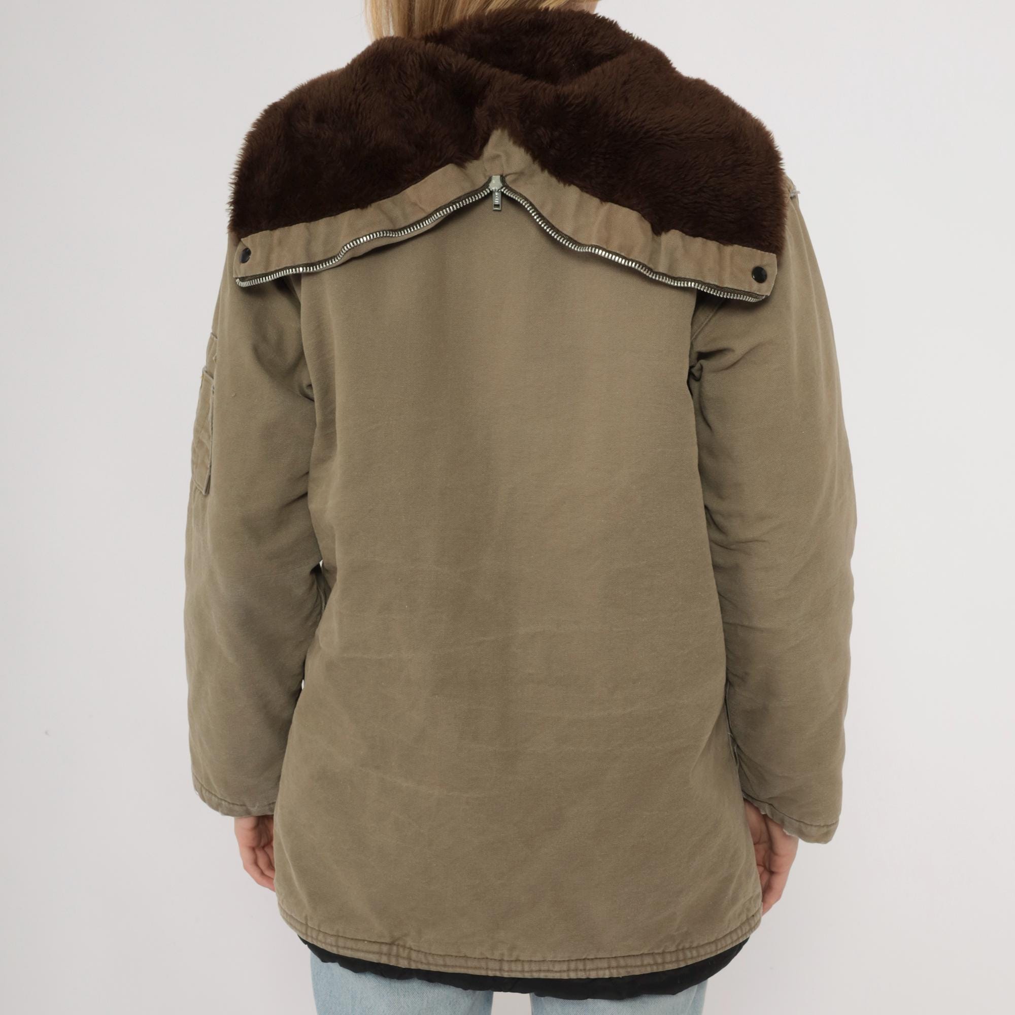 WWII B-9 parka from 1943-1945 featuring olive military cotton with faux sherpa lining and detachable fur collar. Hooded design with button and zip front closure, multiple pockets, and drawstring waist. Authentic wartime military issue piece.