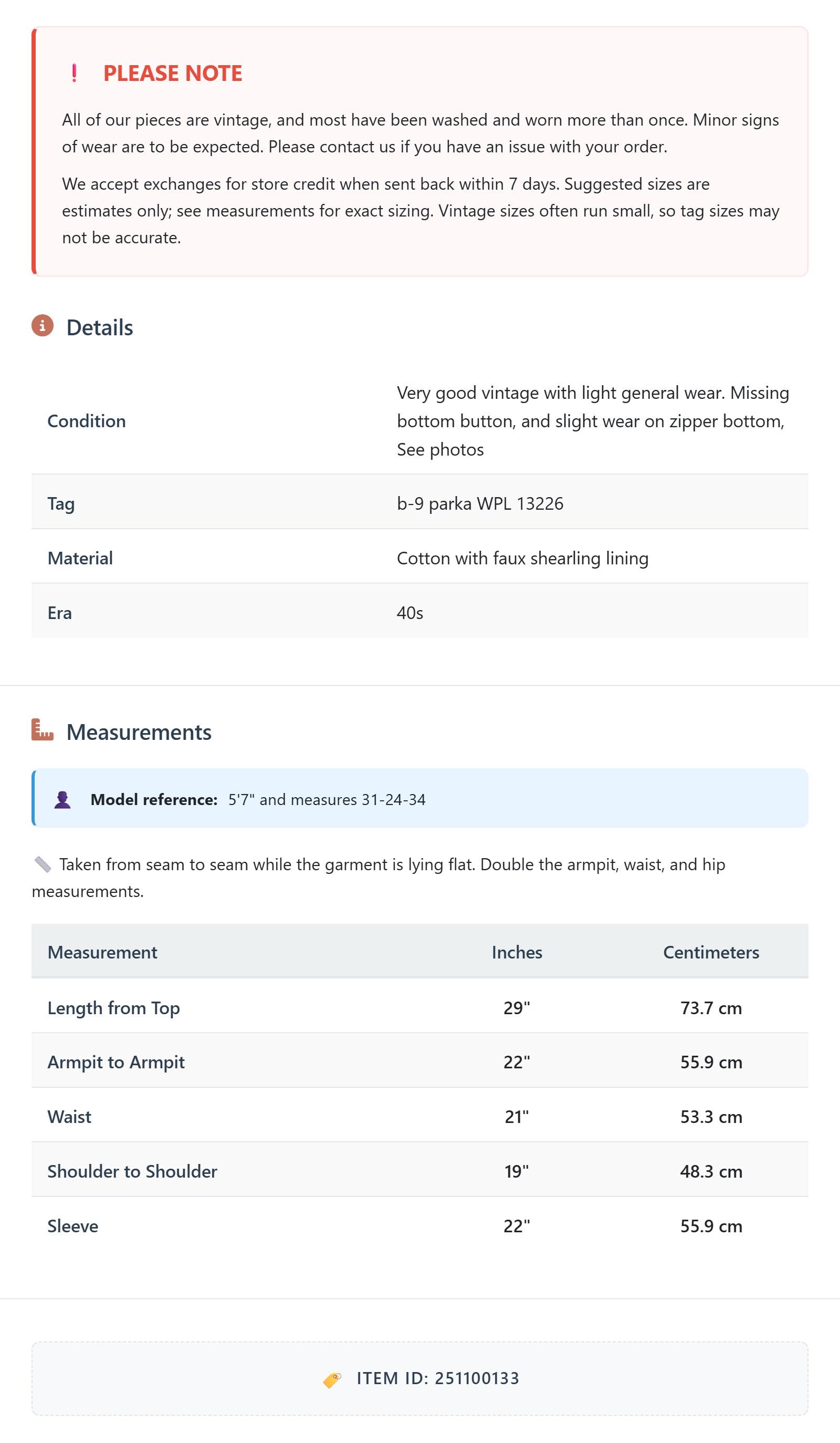 All of our pieces are vintage, and most have been washed and worn more than once. Minor signs of wear are to be expected. Please contact us if you have an issue with your order. We accept exchanges for store credit when sent back within 7 days.
