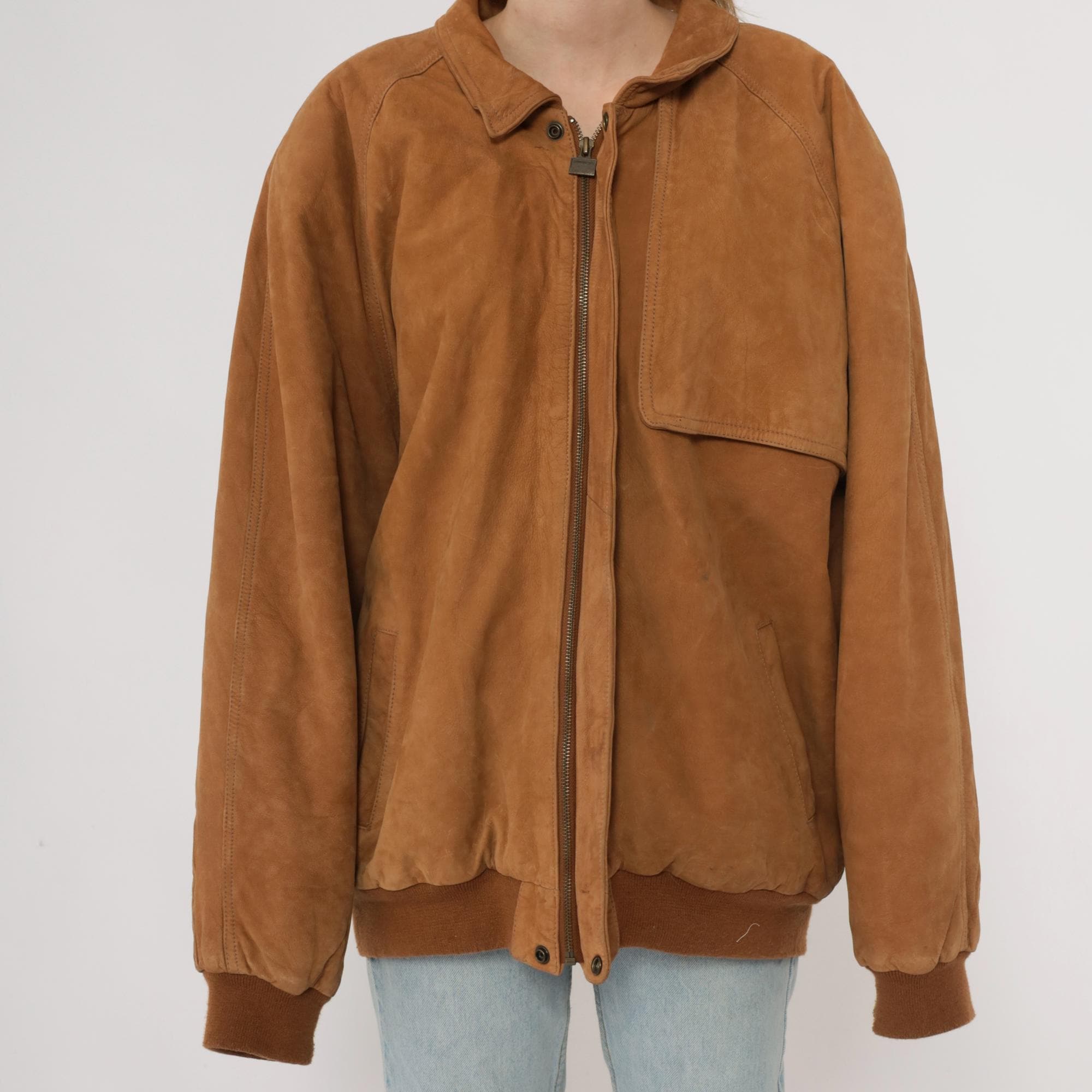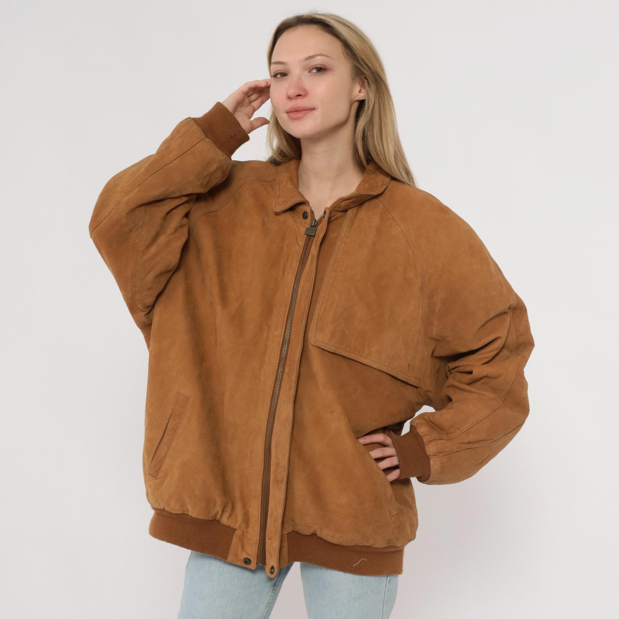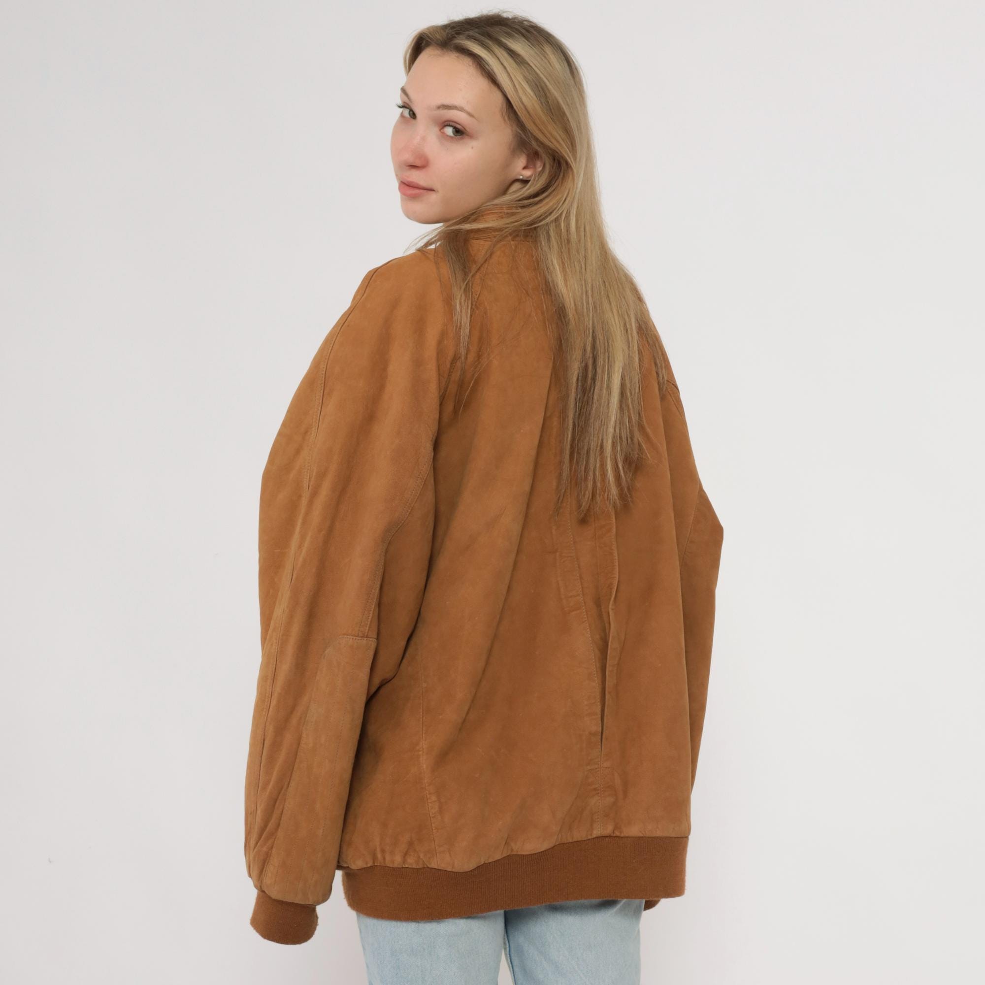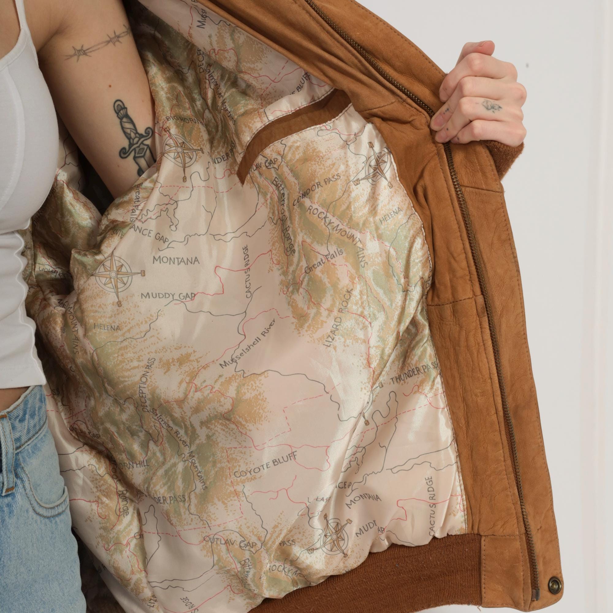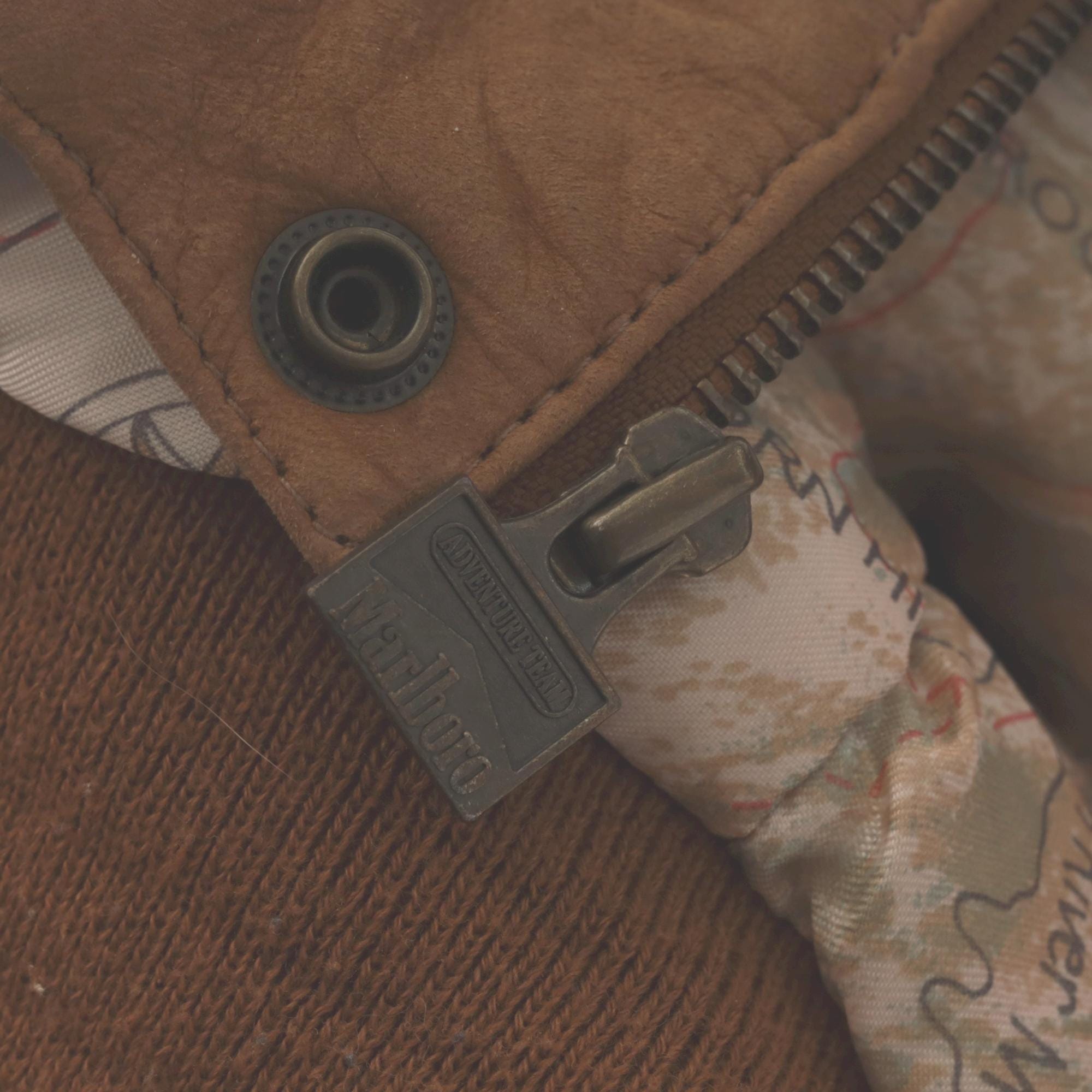 90s brown leather bomber jacket by Marlboro featuring zip front closure with snap collar and raglan sleeves. Ribbed cuffs and hem with polyester lining. Relaxed fit with chest pocket detail.