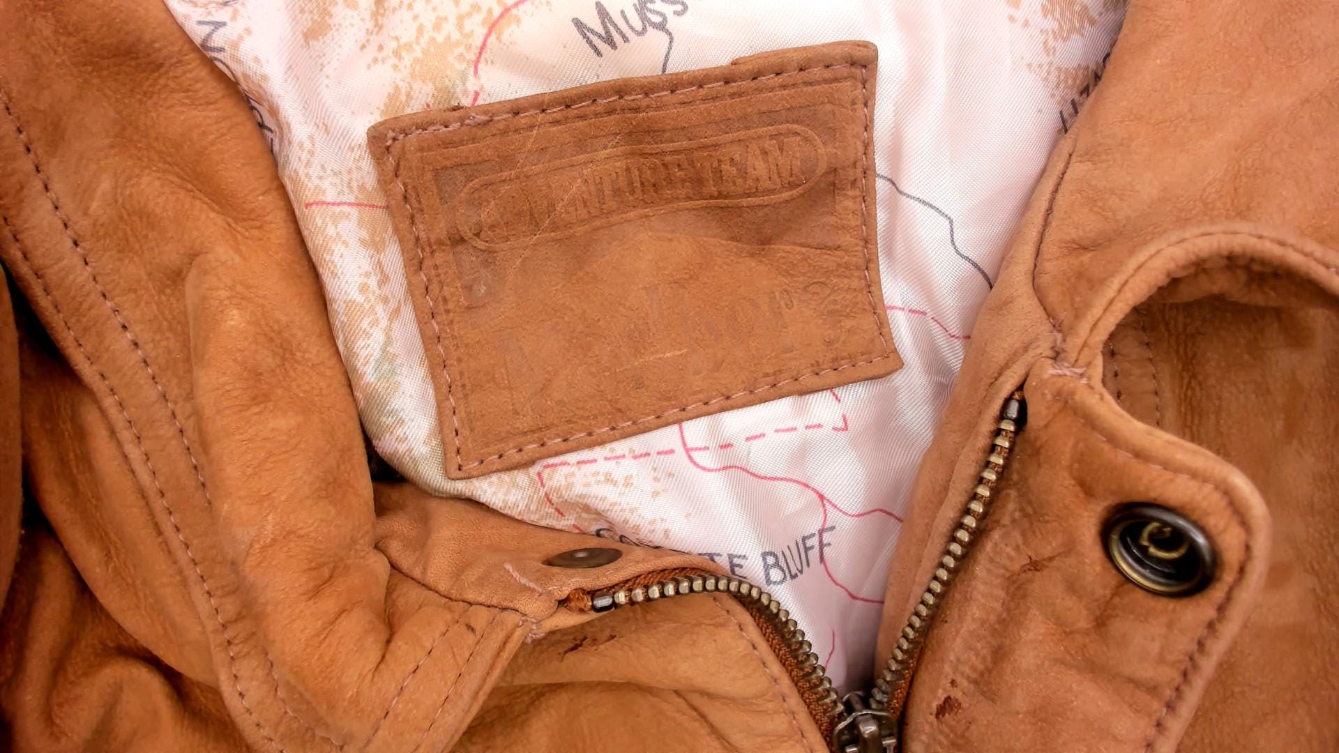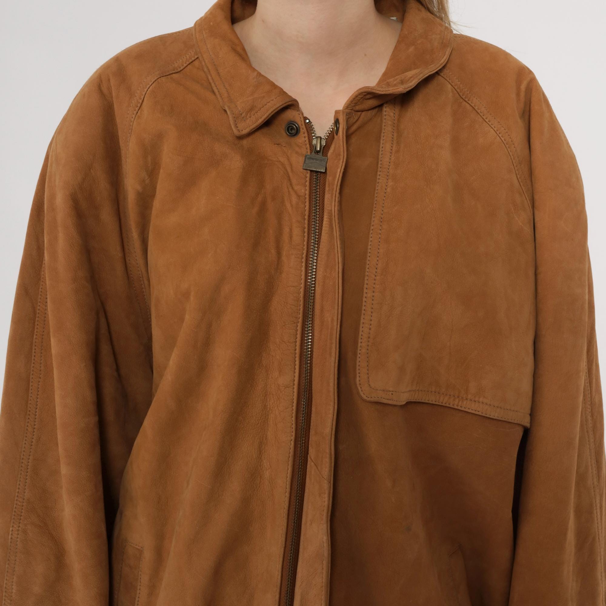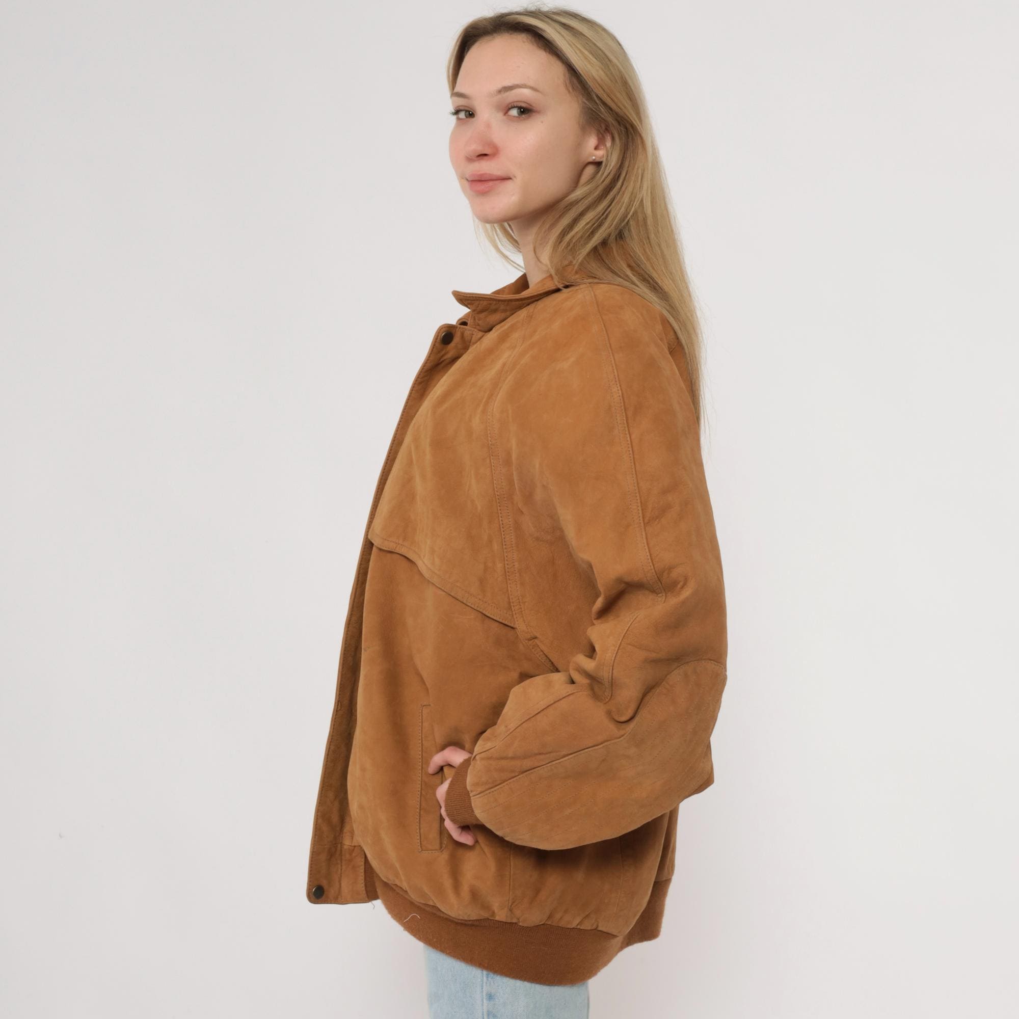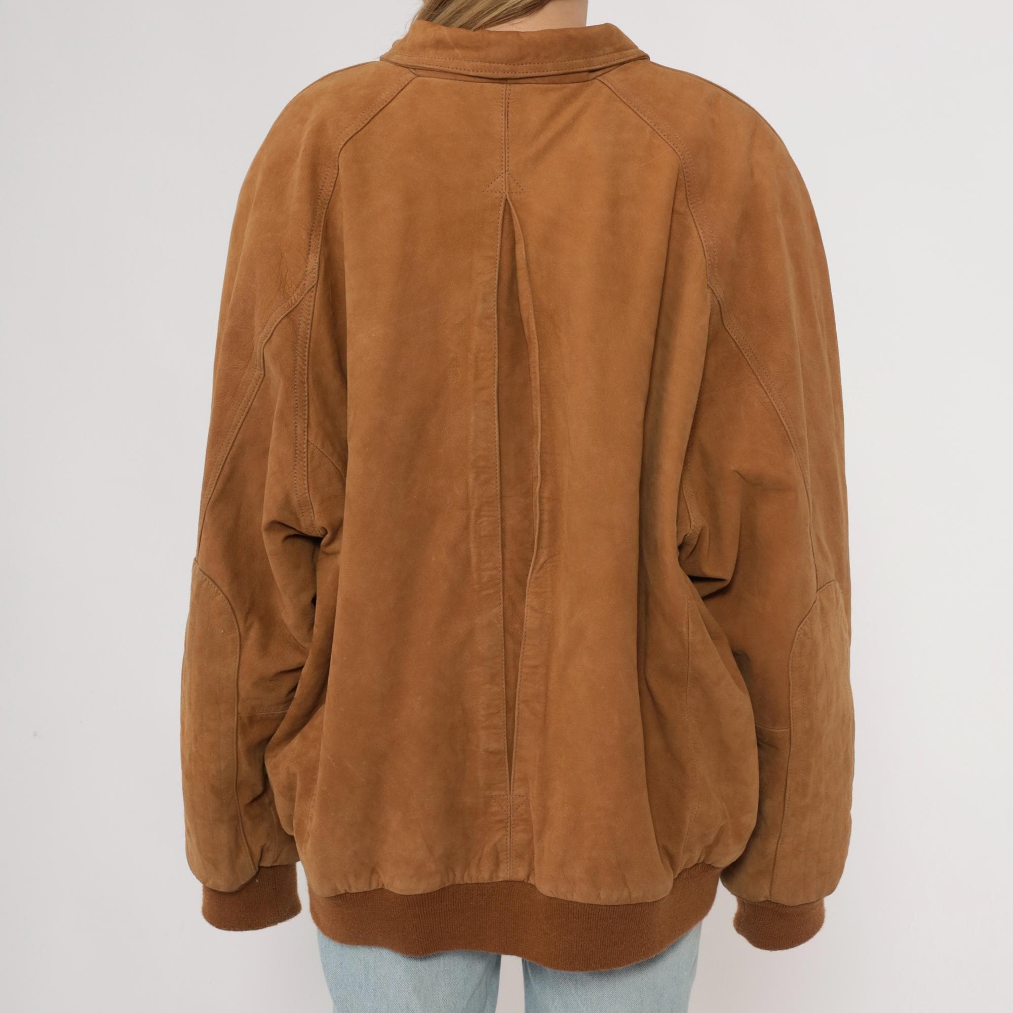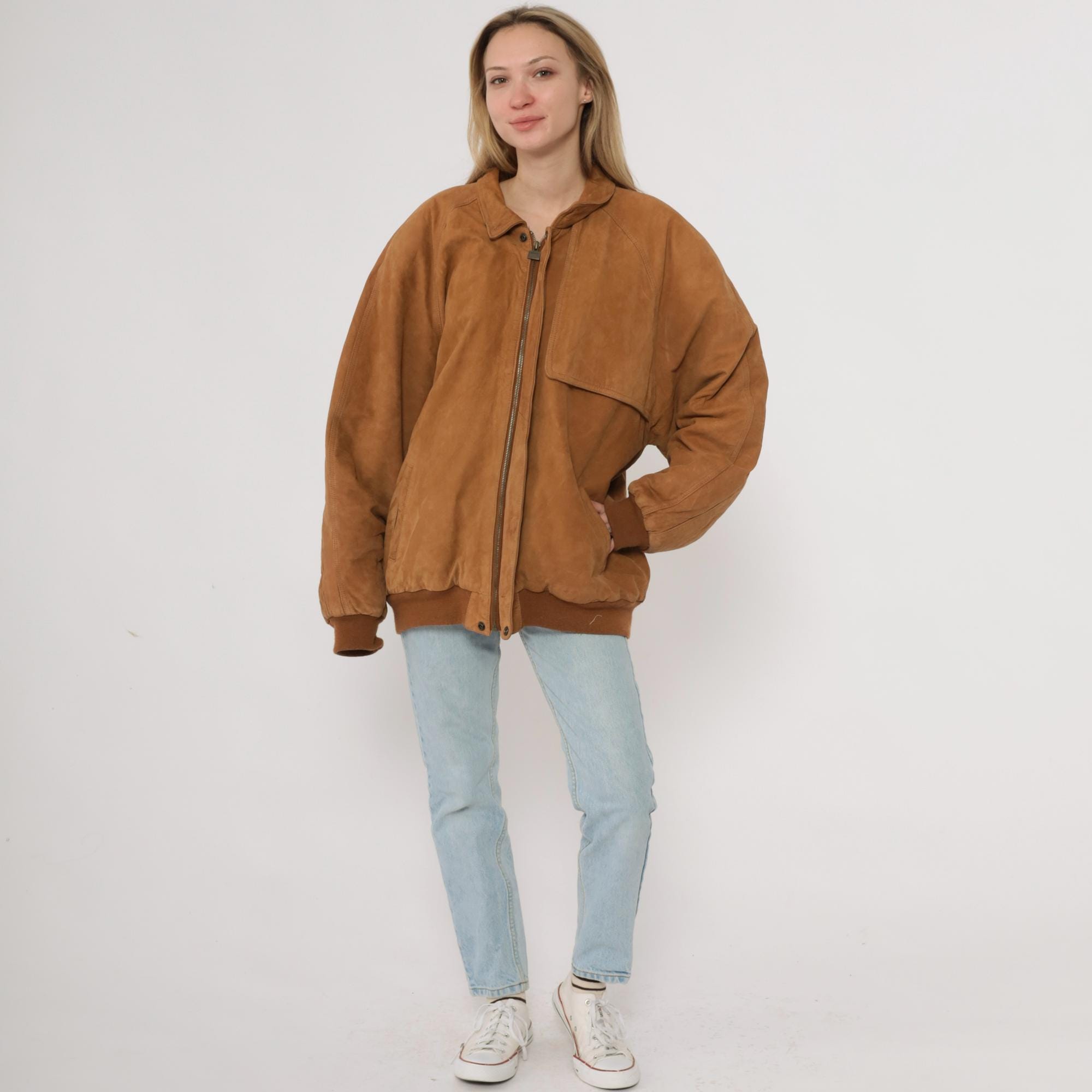 90s brown leather bomber jacket by Marlboro featuring zip front closure with snap collar and raglan sleeves. Ribbed cuffs and hem with polyester lining. Relaxed fit with chest pocket detail.