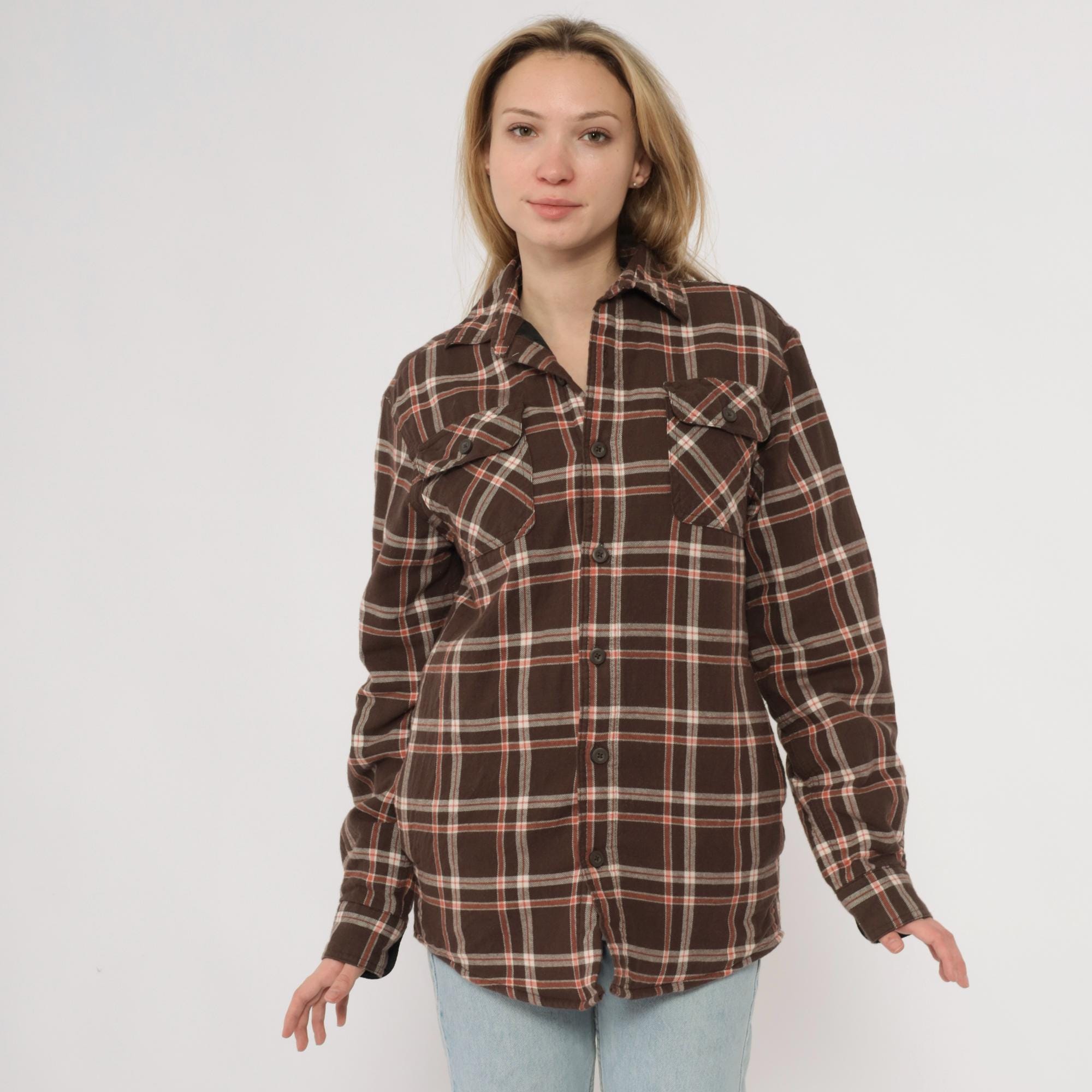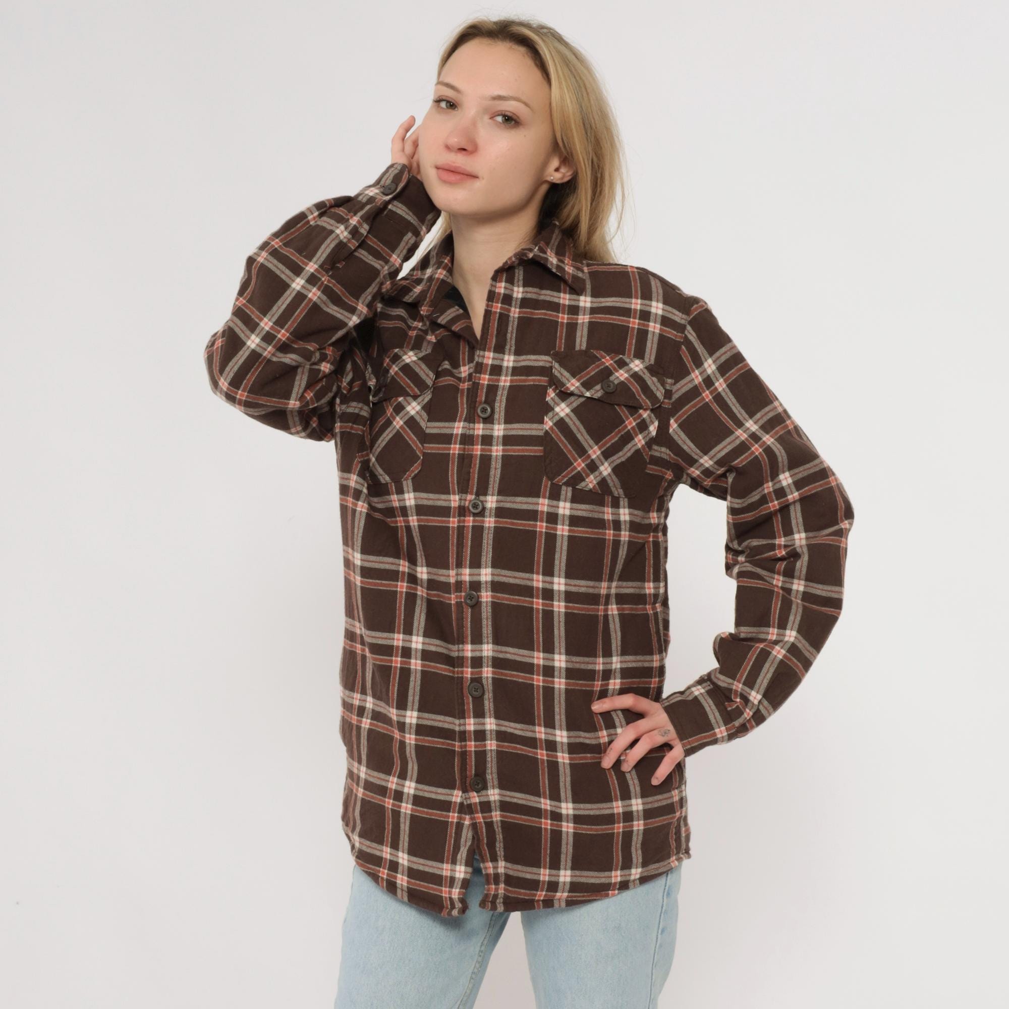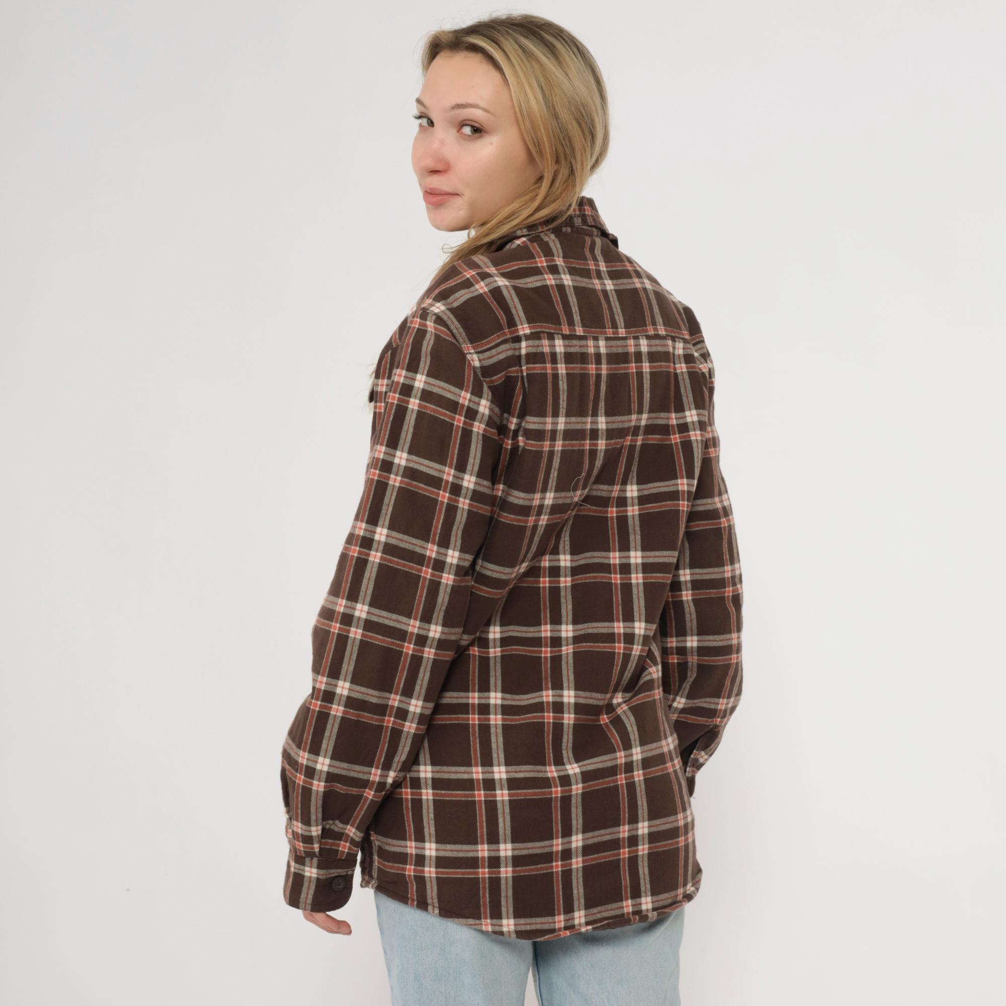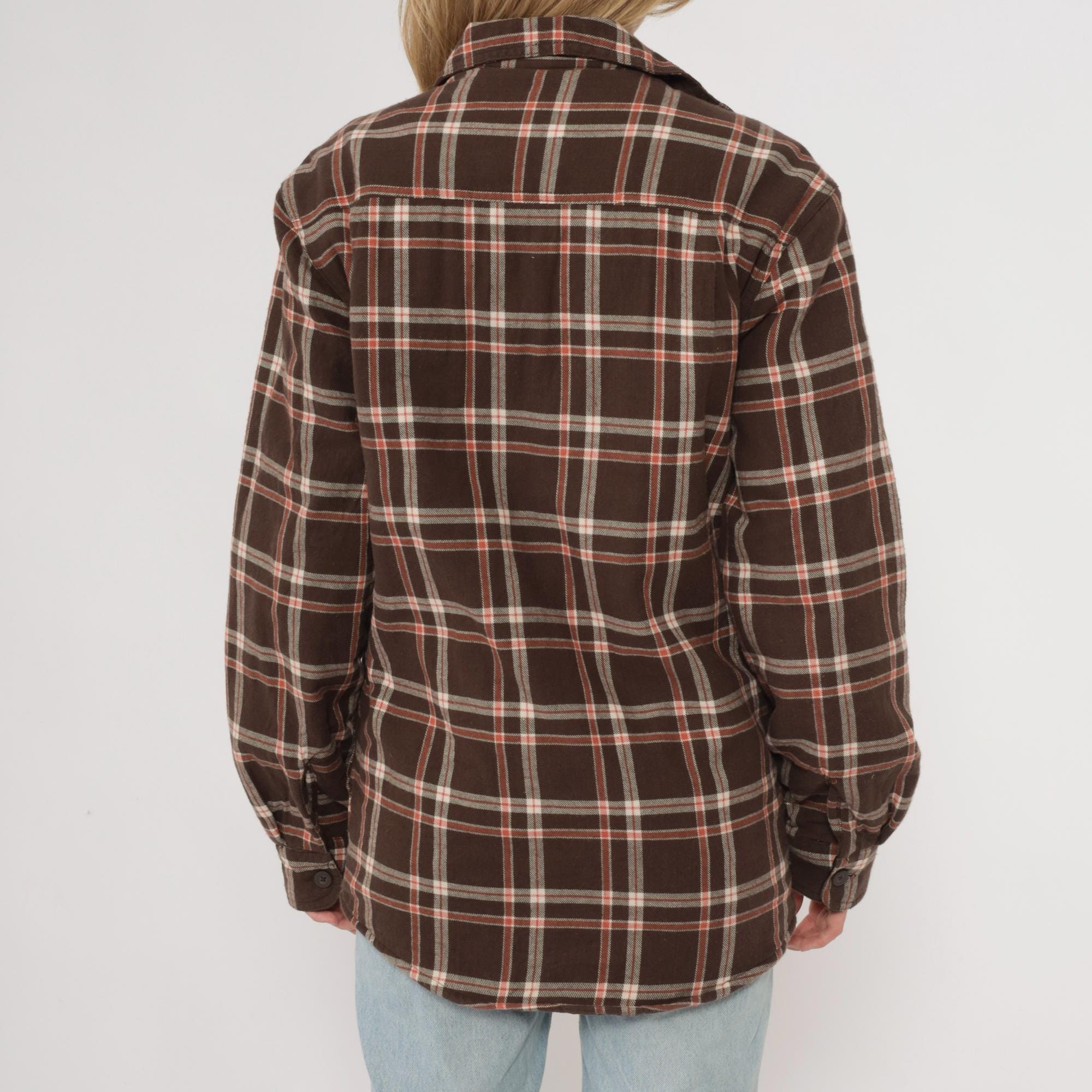 90s brown plaid flannel shirt from Wrangler with rust and cream accents, quilted lining, and two chest pockets with button flap closures. Long sleeves with button cuffs, collar neckline, full button front closure.