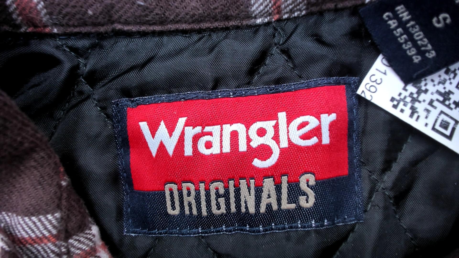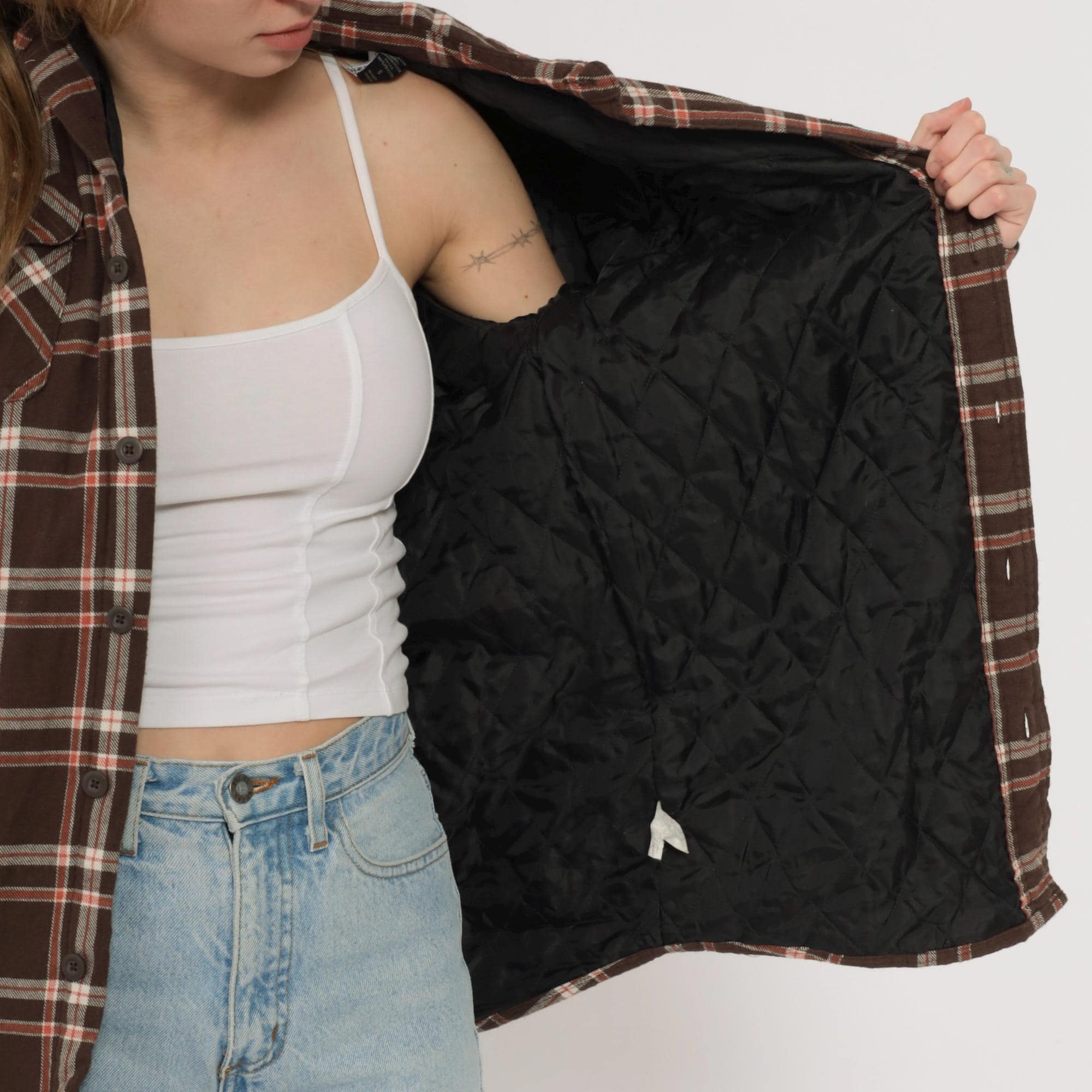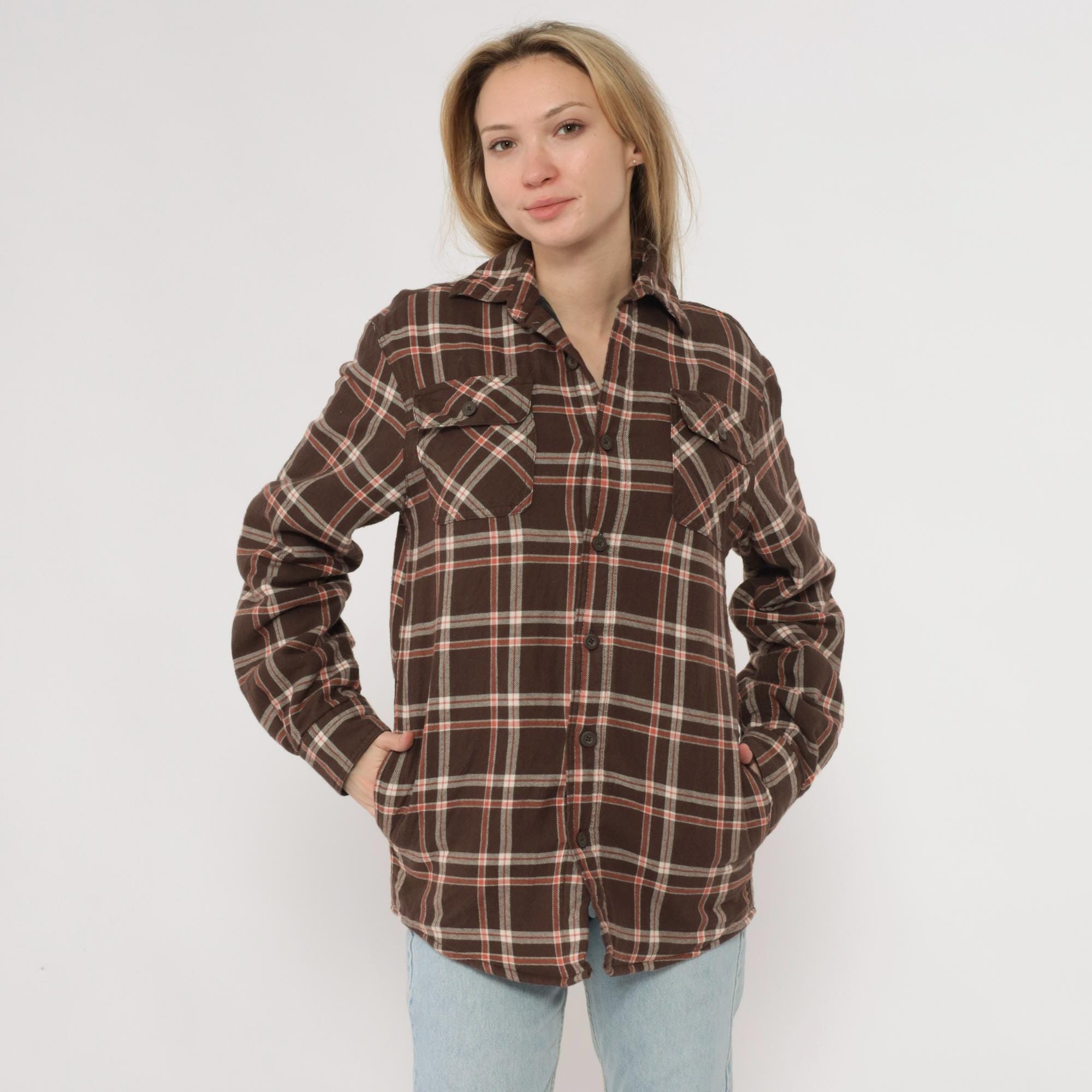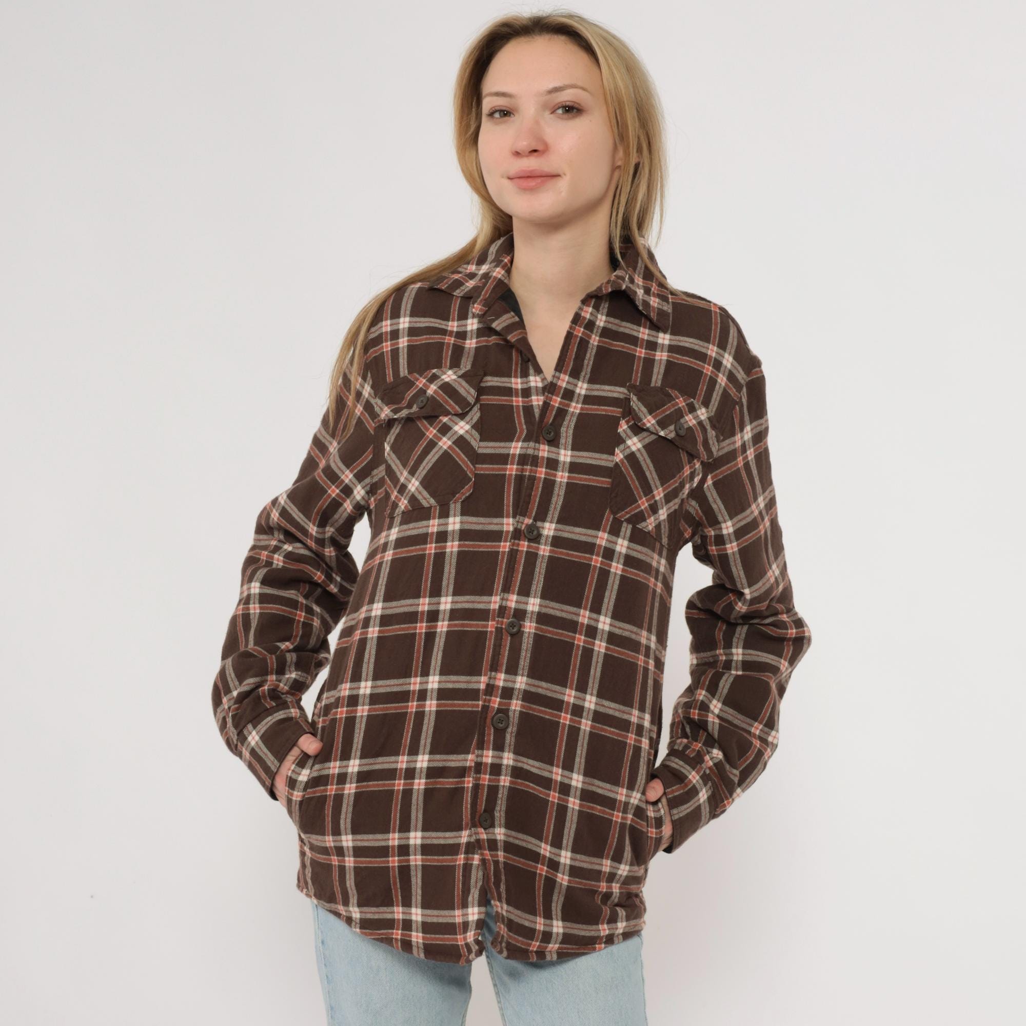 90s brown plaid flannel shirt from Wrangler with rust and cream accents, quilted lining, and two chest pockets with button flap closures. Long sleeves with button cuffs, collar neckline, full button front closure.