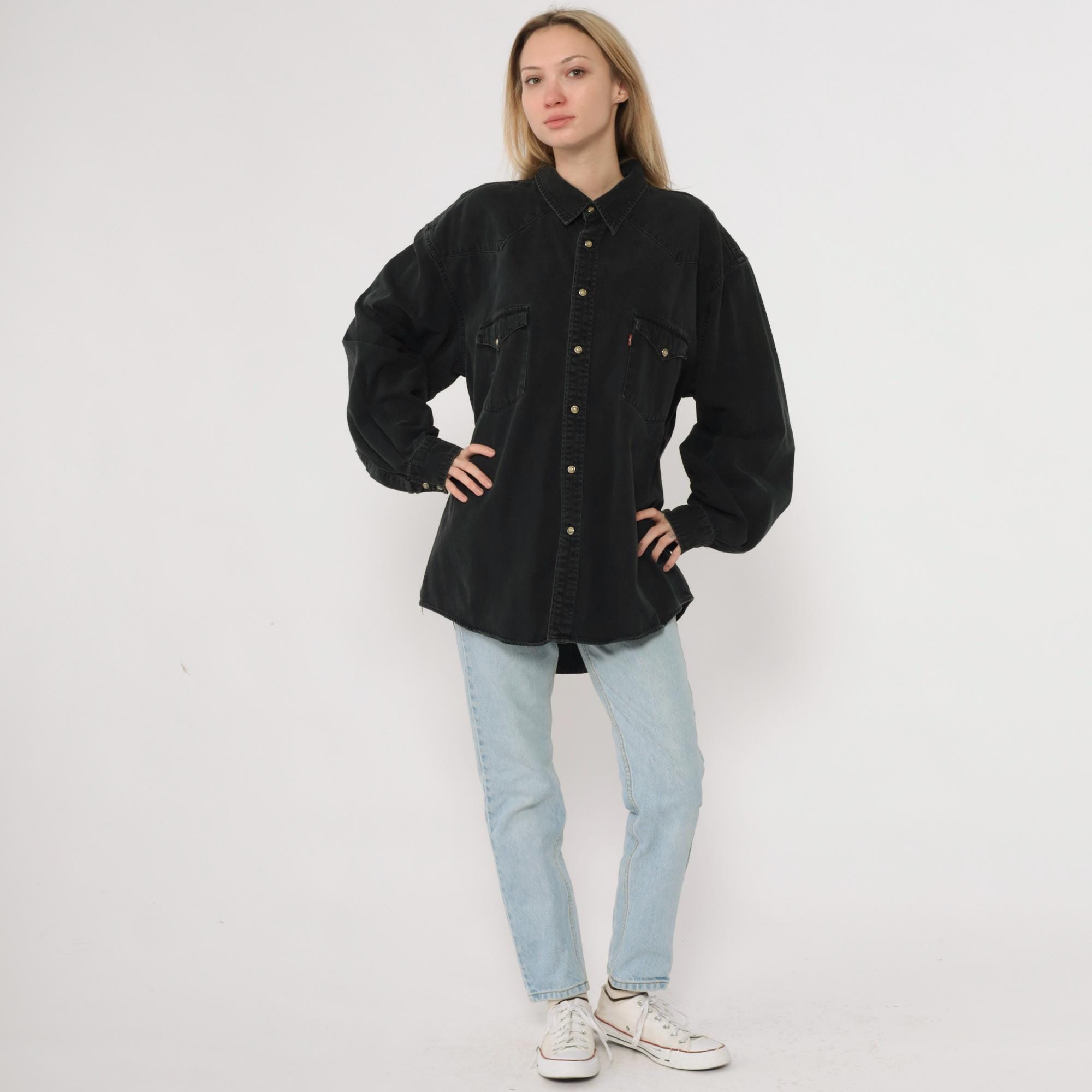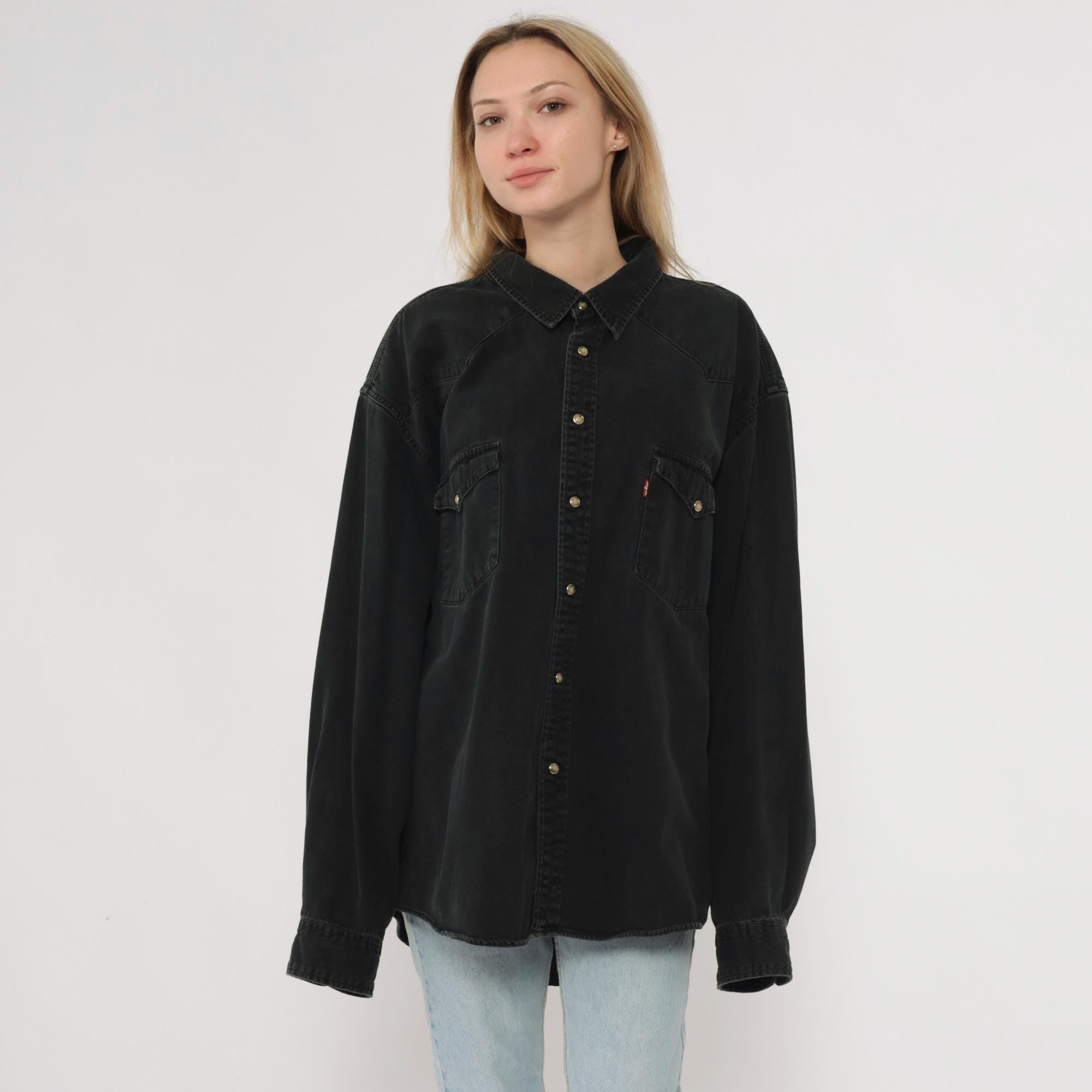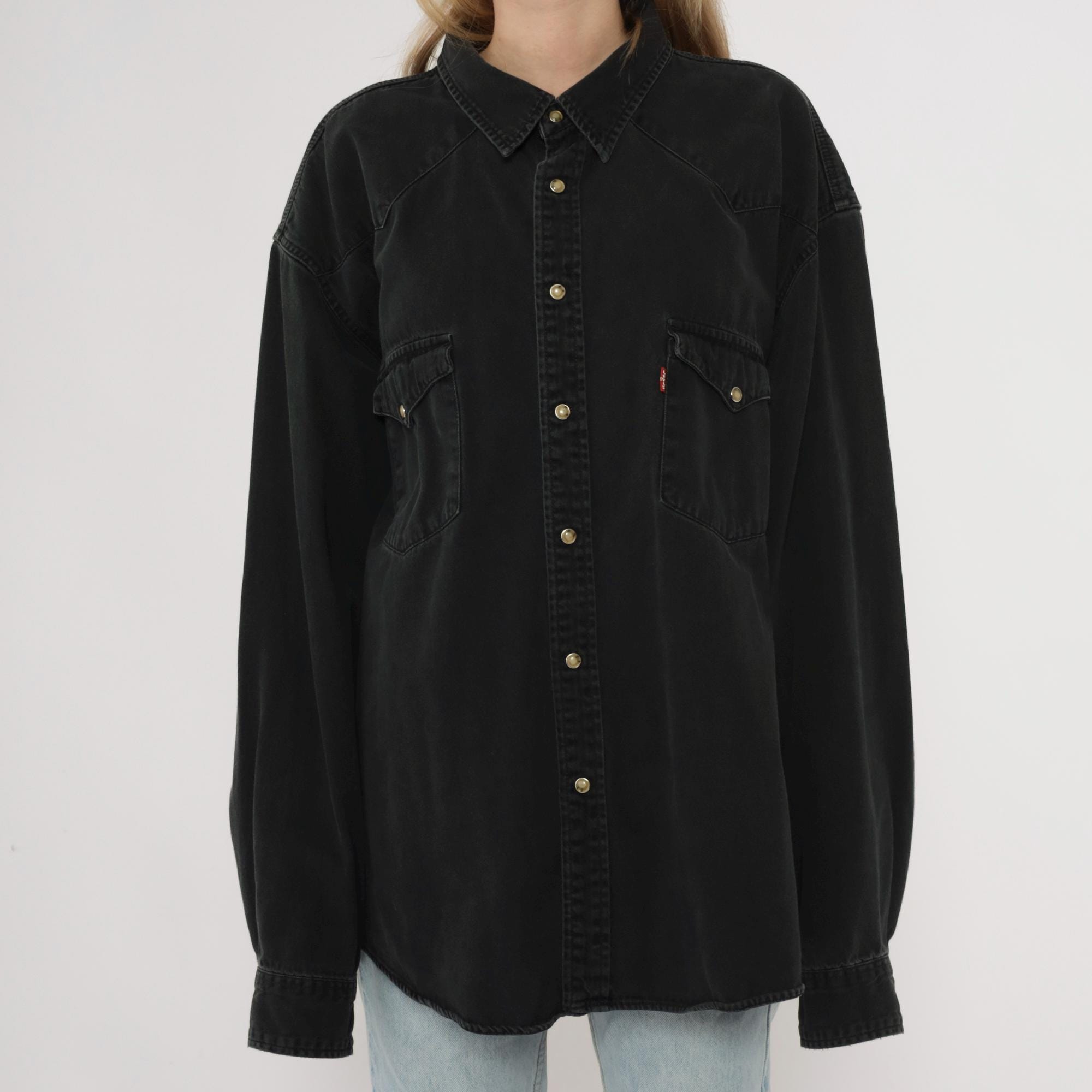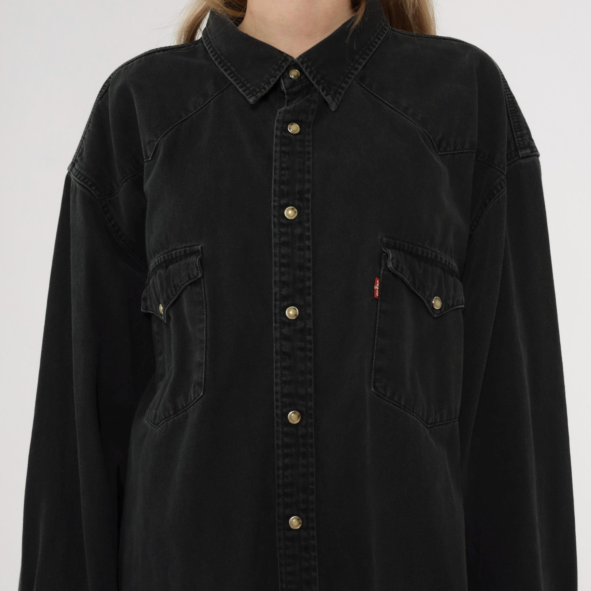 Y2K black denim shirt from Levi's with oversized XXL fit. Collar neckline with full button front closure, long sleeves with button cuffs, and two chest pockets with button flap closures. Western-style yoke detail across the back shoulders.