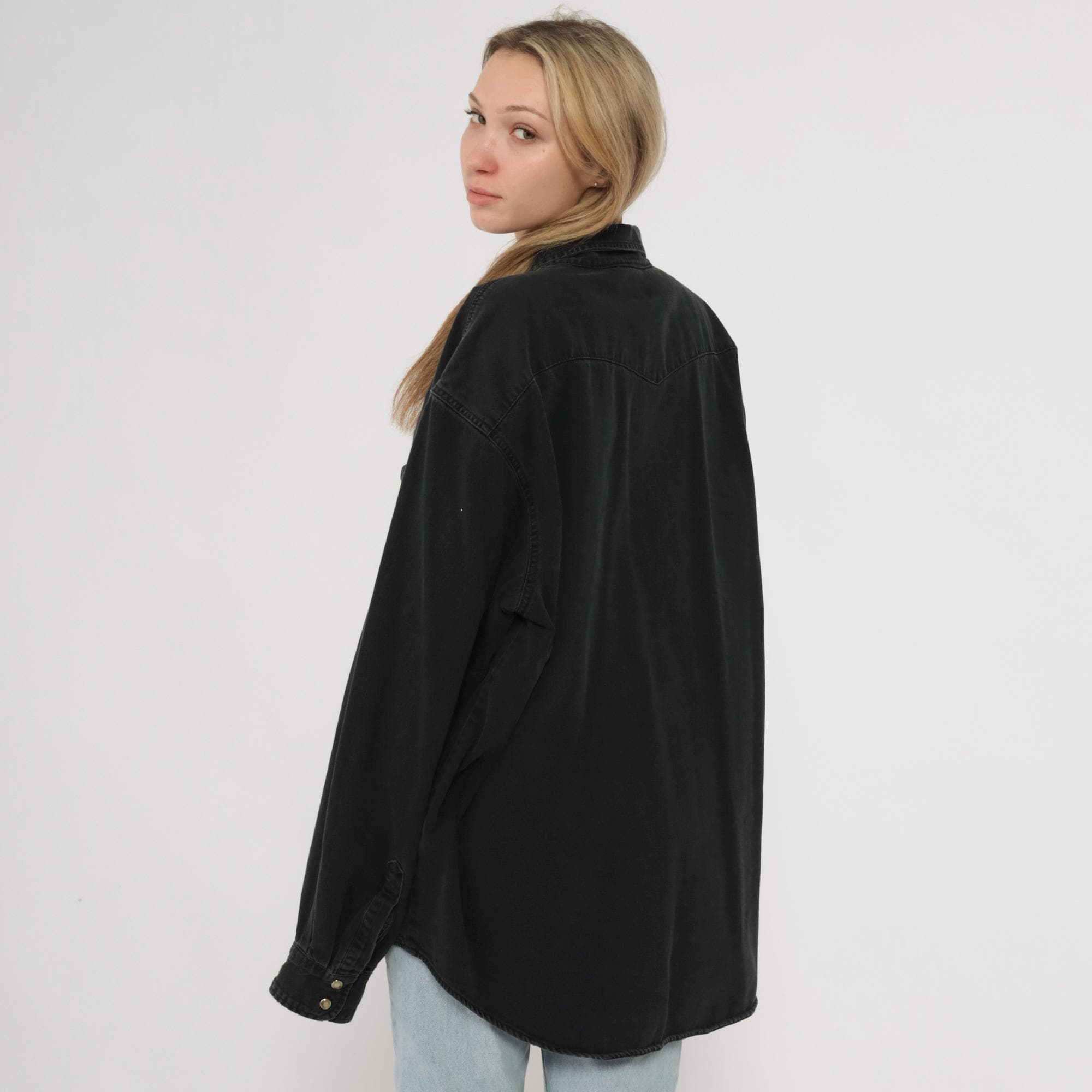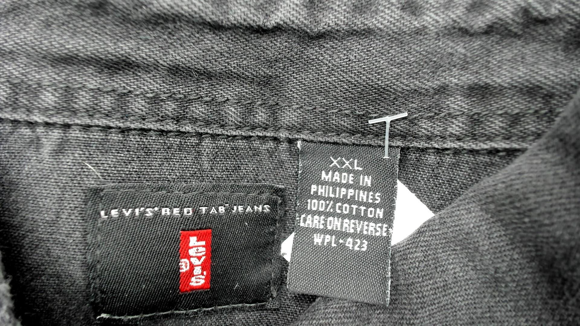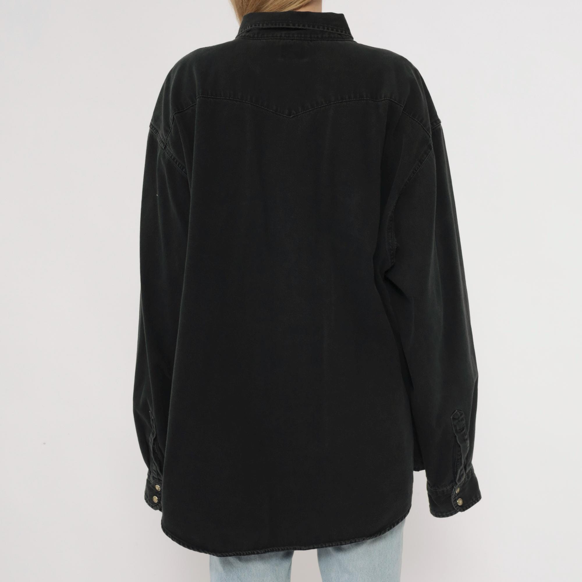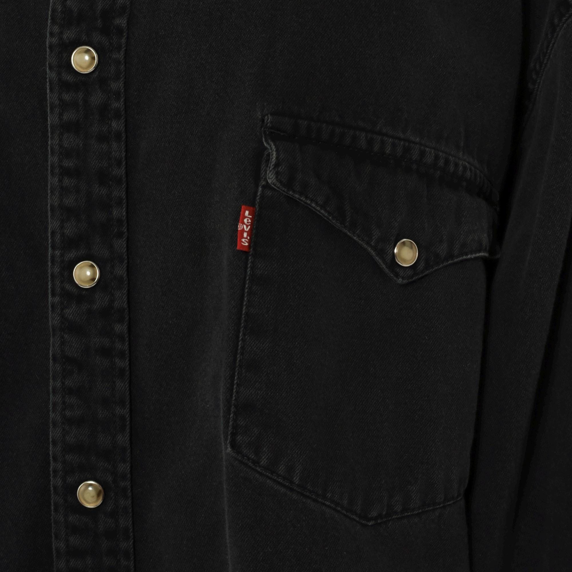 Y2K black denim shirt from Levi's with oversized XXL fit. Collar neckline with full button front closure, long sleeves with button cuffs, and two chest pockets with button flap closures. Western-style yoke detail across the back shoulders.