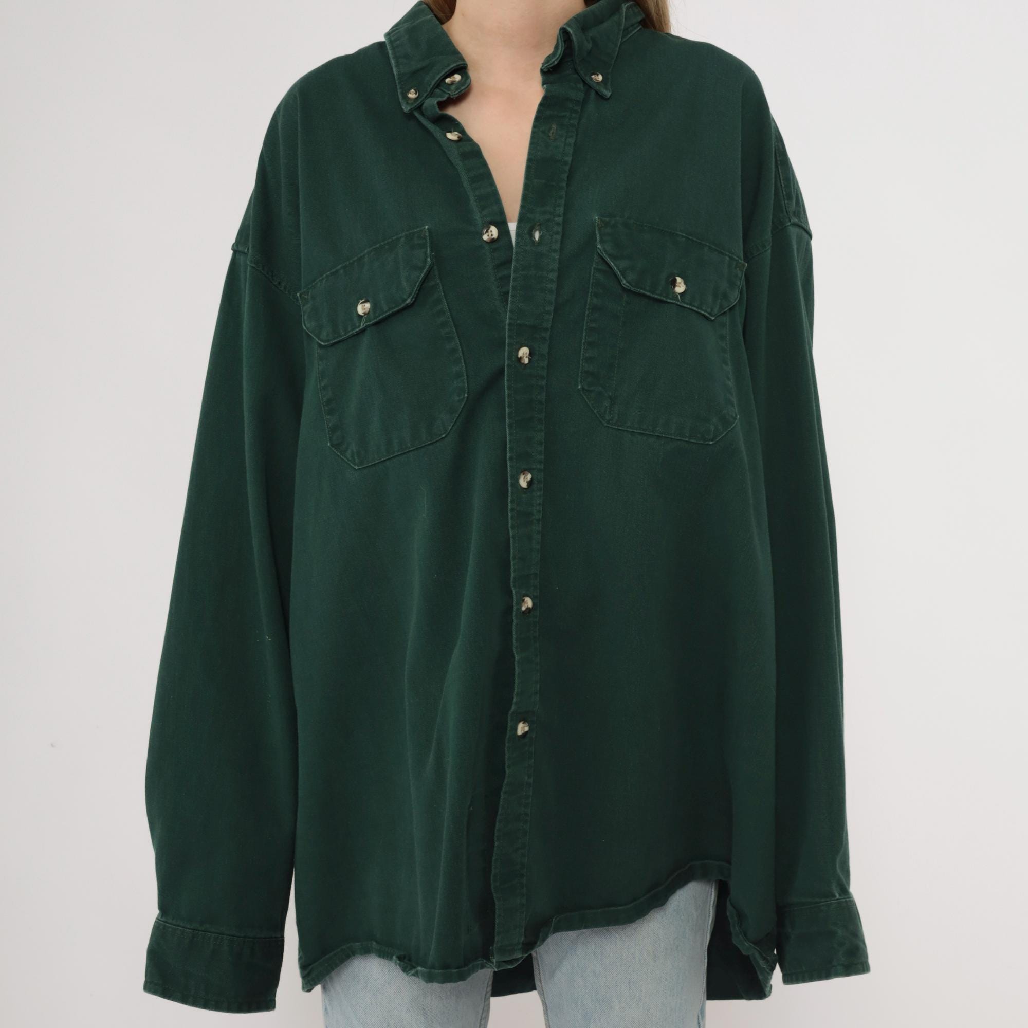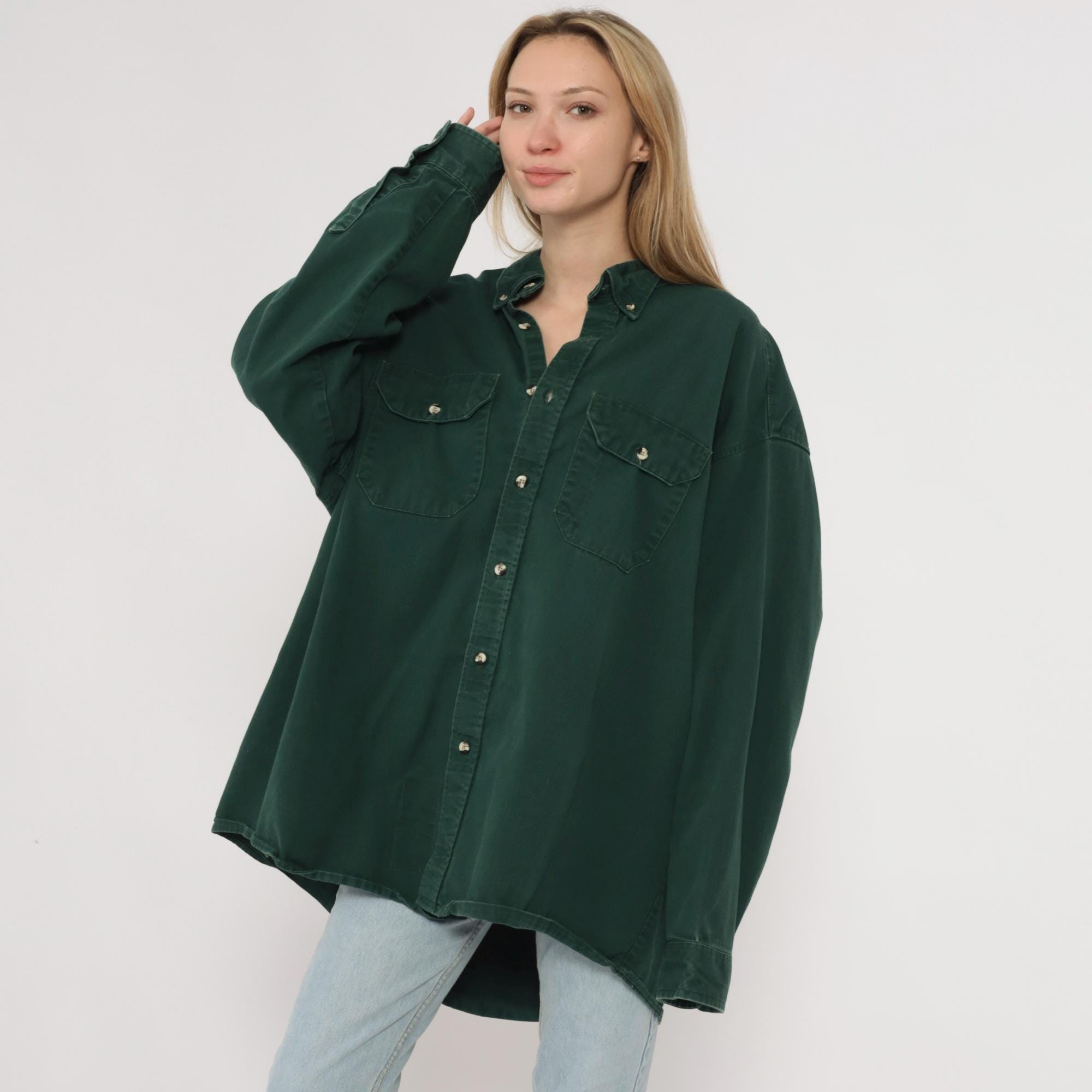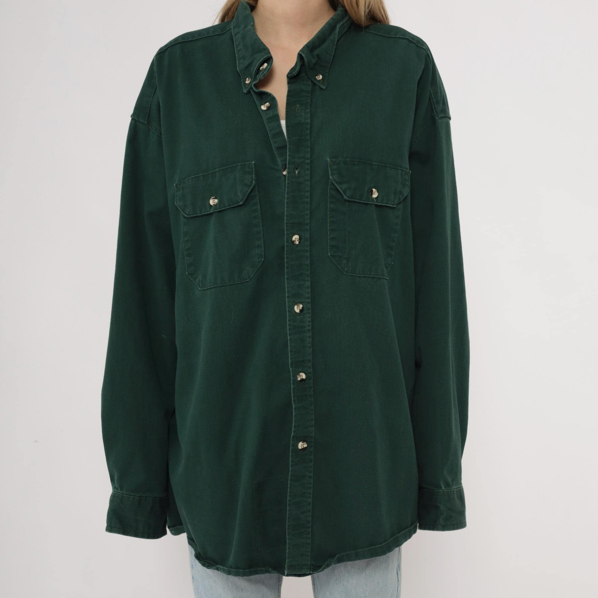 Y2K dark green shirt from Wrangler with two chest pockets and button flap closures. Long sleeves with button cuffs, collar neckline, and full button front closure. Relaxed fit in solid forest green. Cotton. Tagged size XXL regular.