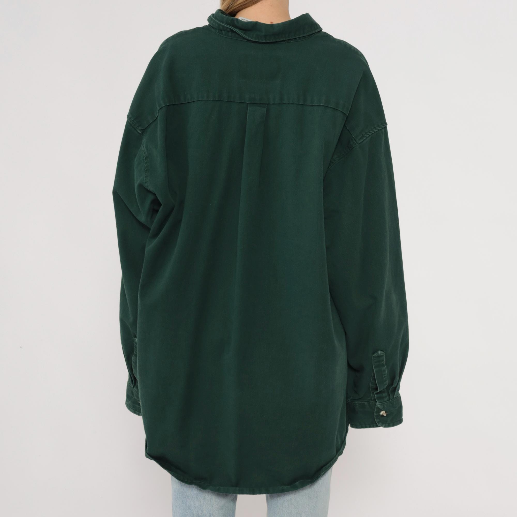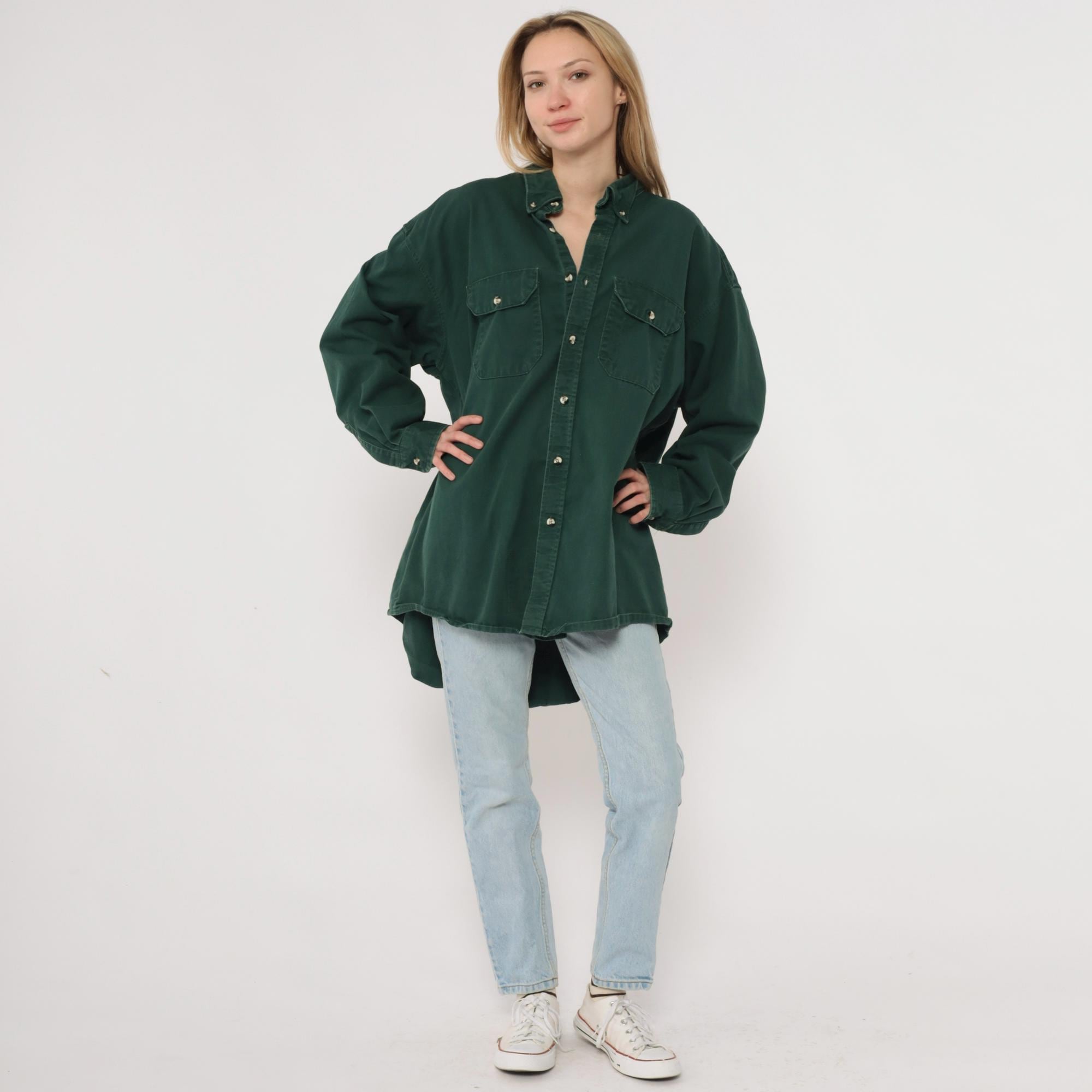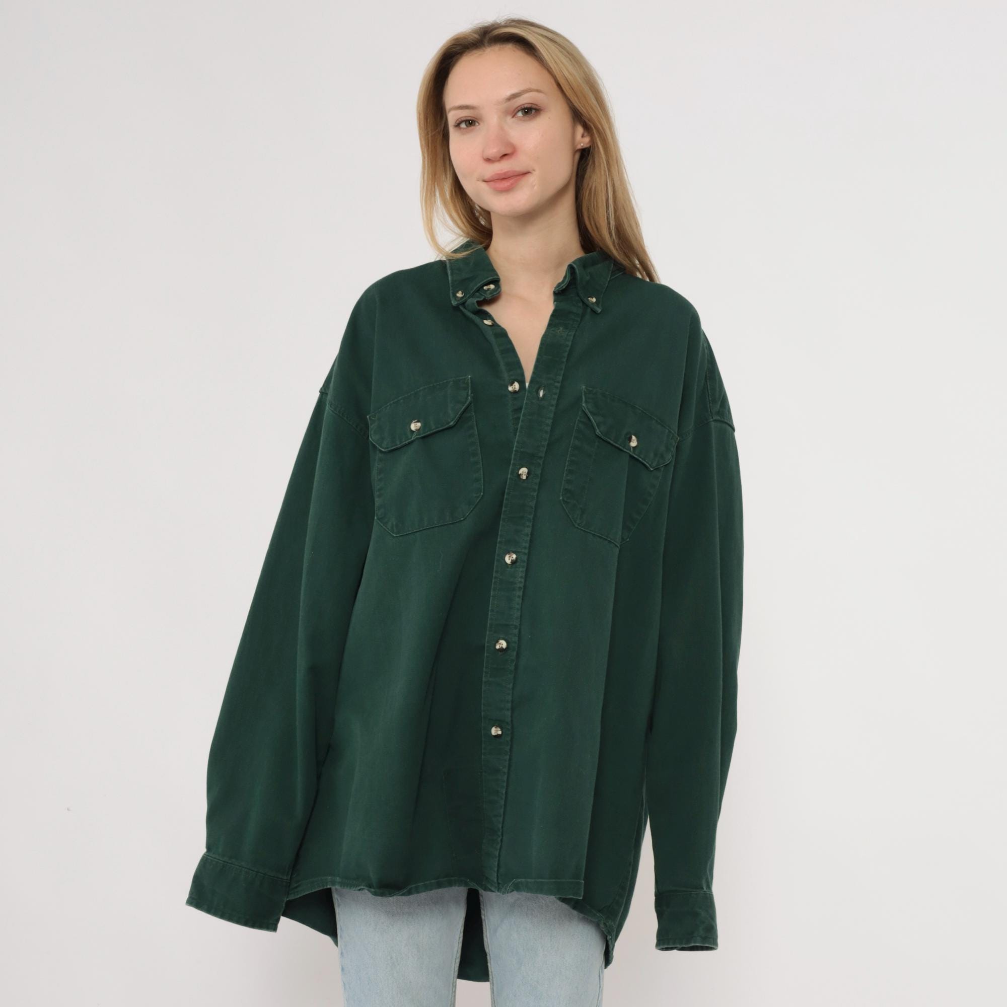 Y2K dark green shirt from Wrangler with two chest pockets and button flap closures. Long sleeves with button cuffs, collar neckline, and full button front closure. Relaxed fit in solid forest green. Cotton. Tagged size XXL regular.