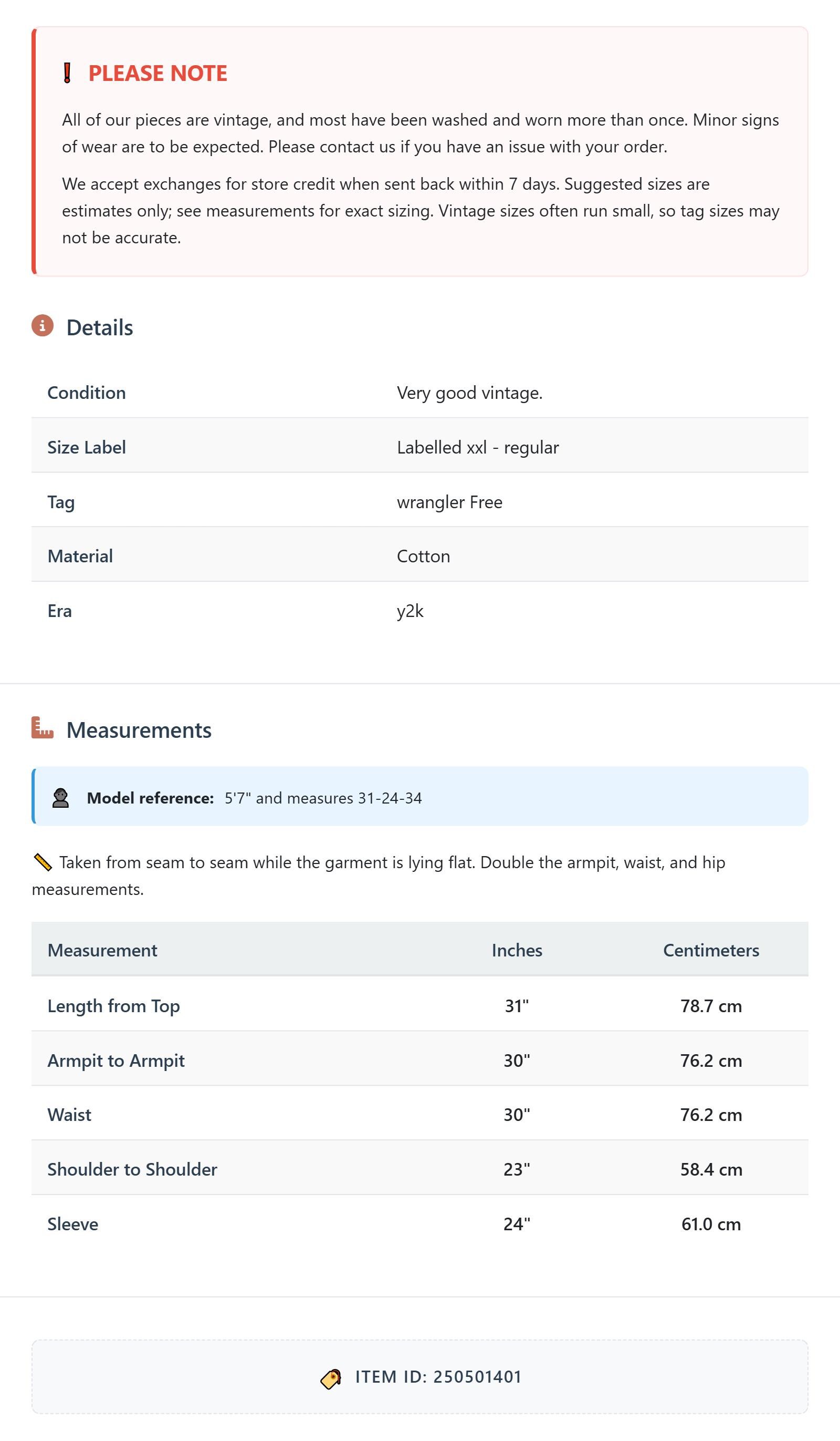 All of our pieces are vintage, and most have been washed and worn more than once. Minor signs of wear are to be expected. Please contact us if you have an issue with your order. We accept exchanges for store credit when sent back within 7 days.