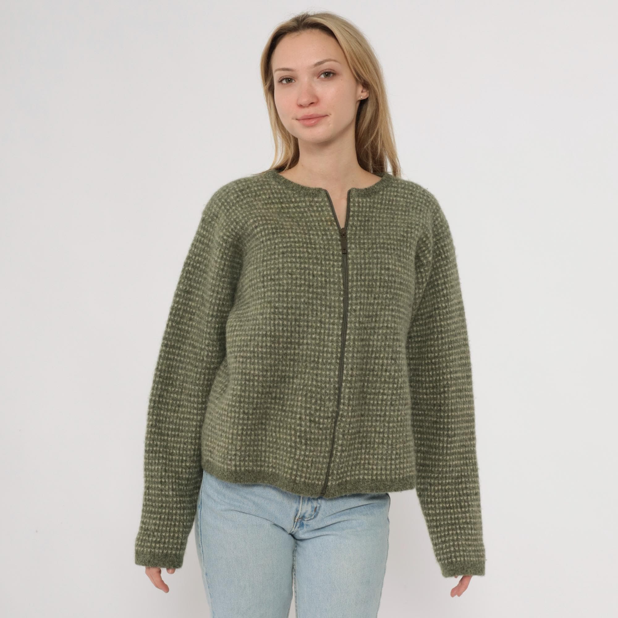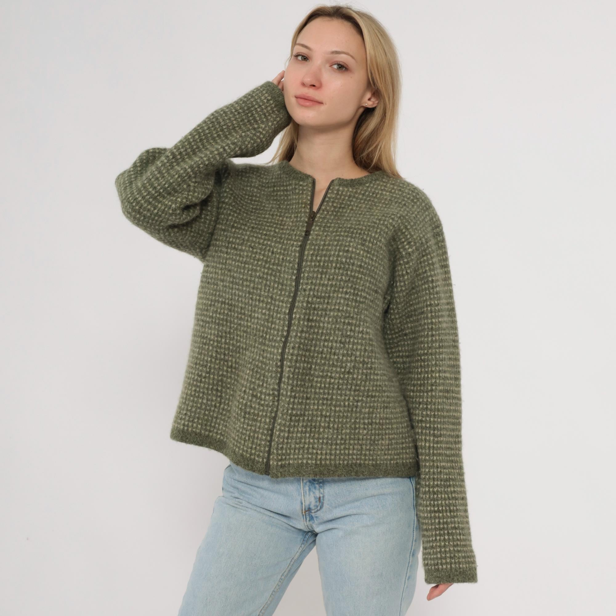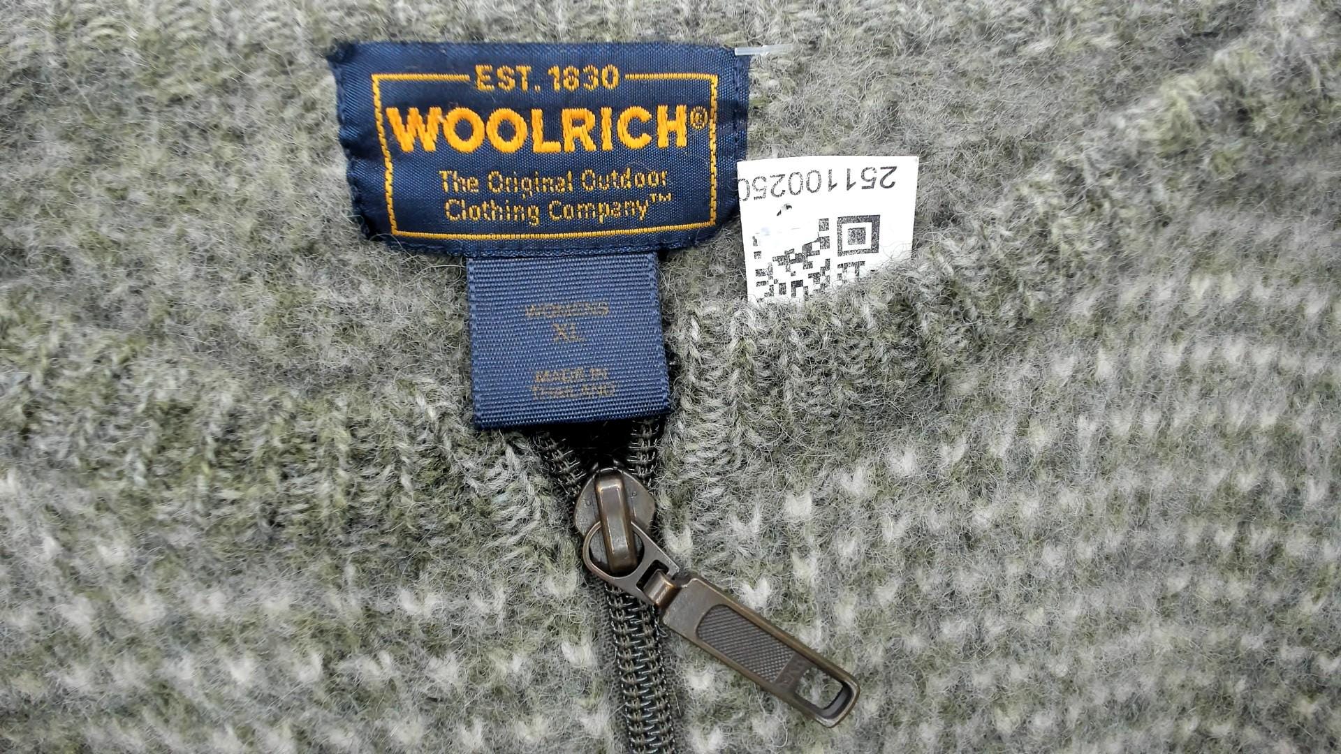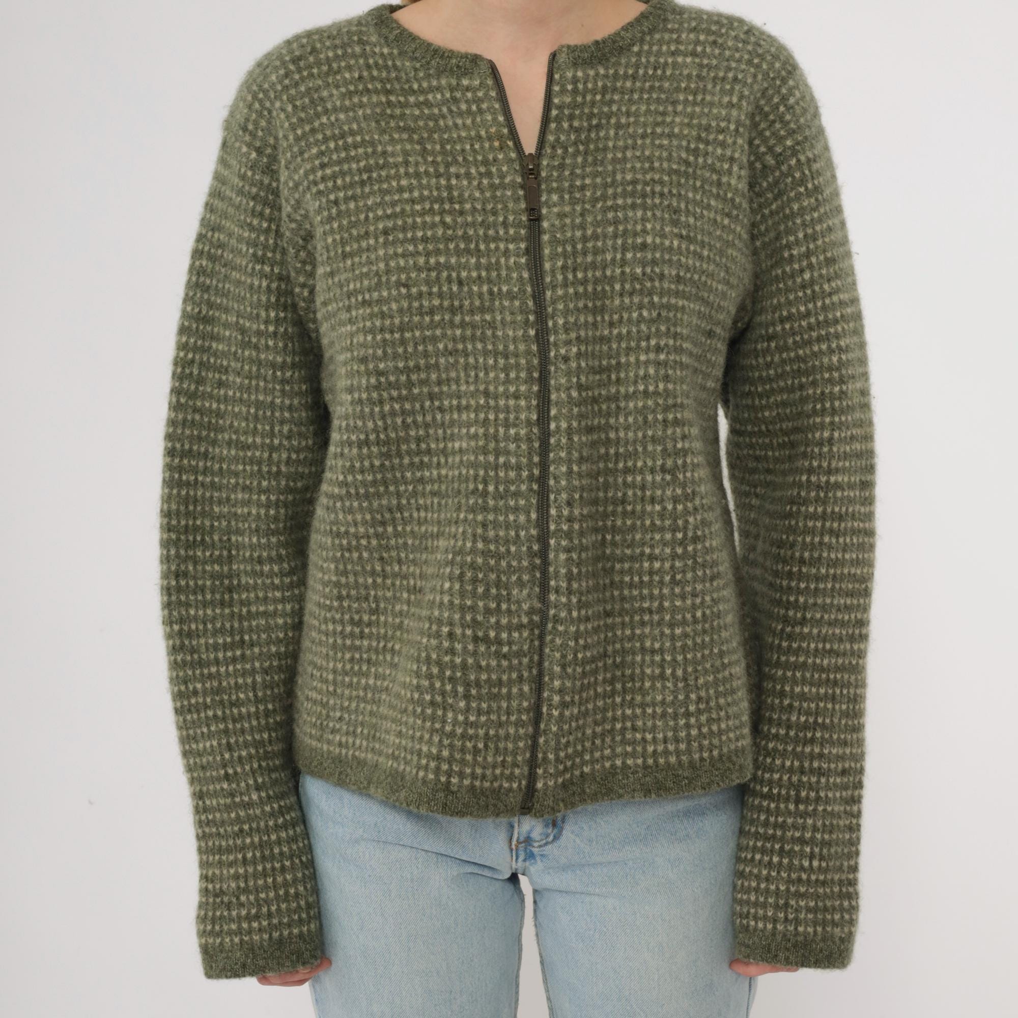 Y2K green and cream zip-up sweater from Woolrich with textured knit pattern across the fabric. Crew neckline with full front zipper closure and long sleeves. Ribbed trim at neckline, cuffs, and hem. Wool. Tagged size Extra Large.