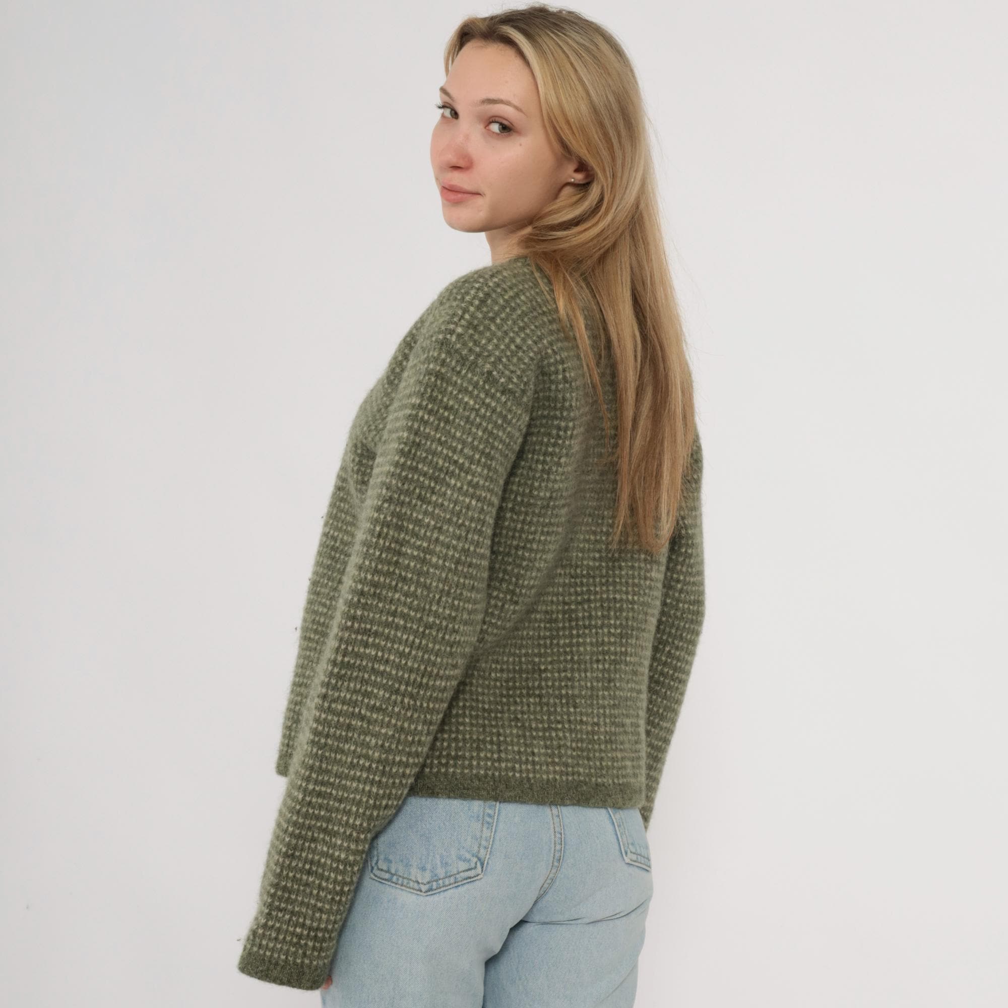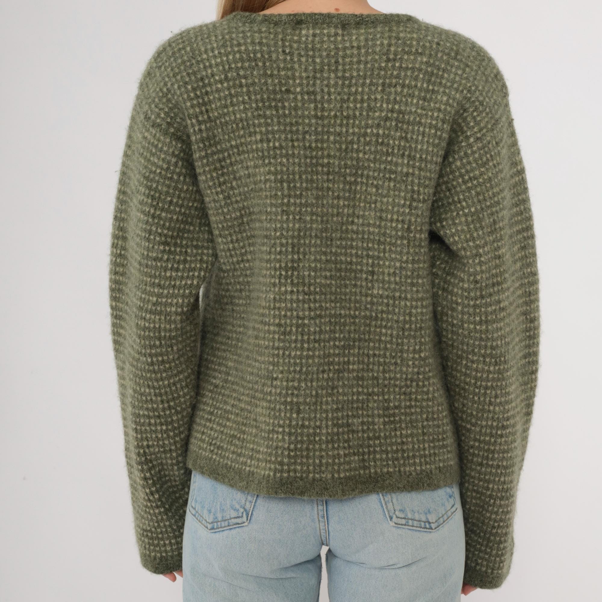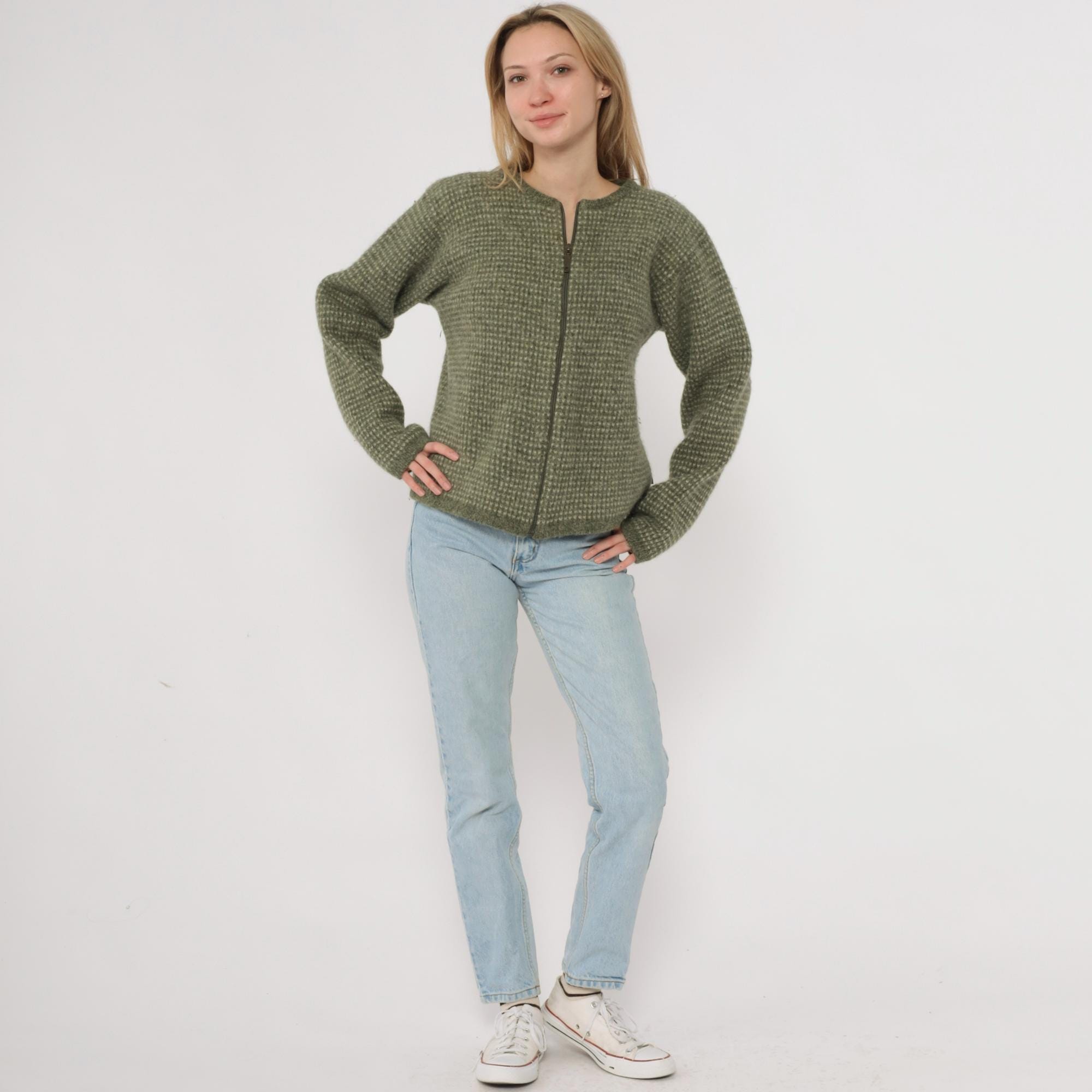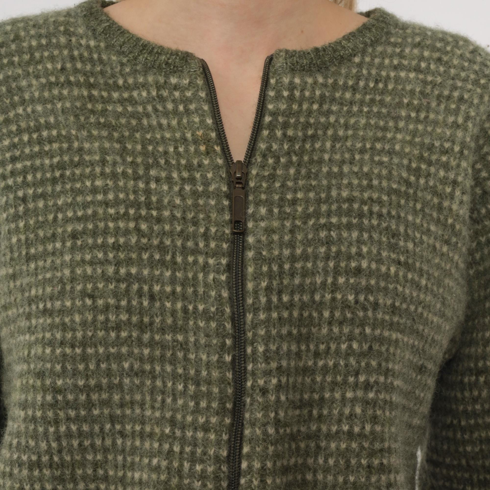 Y2K green and cream zip-up sweater from Woolrich with textured knit pattern across the fabric. Crew neckline with full front zipper closure and long sleeves. Ribbed trim at neckline, cuffs, and hem. Wool. Tagged size Extra Large.