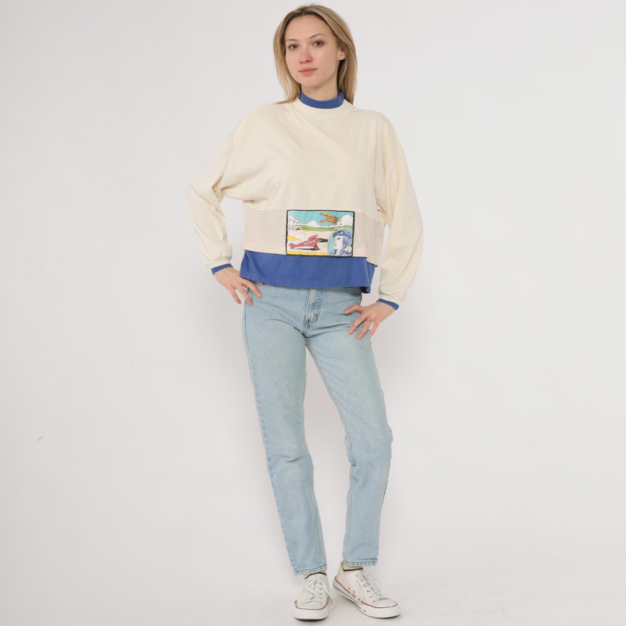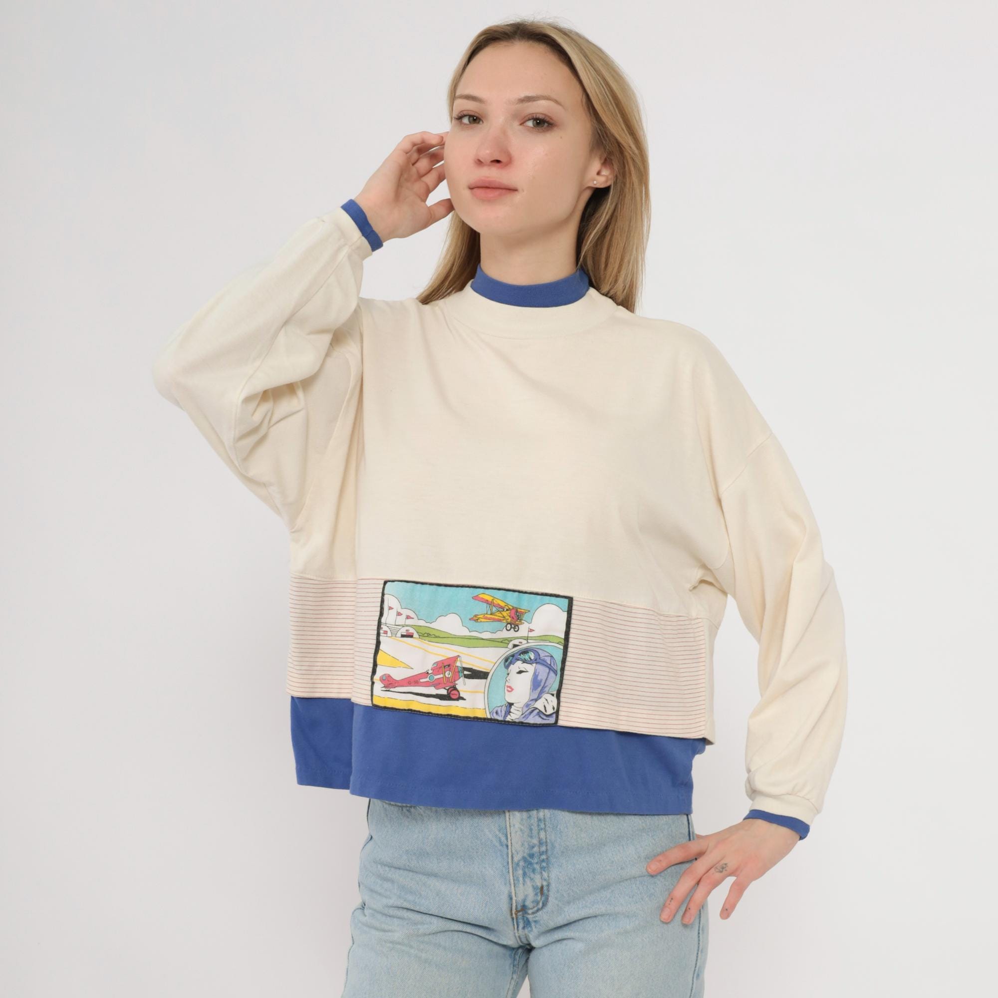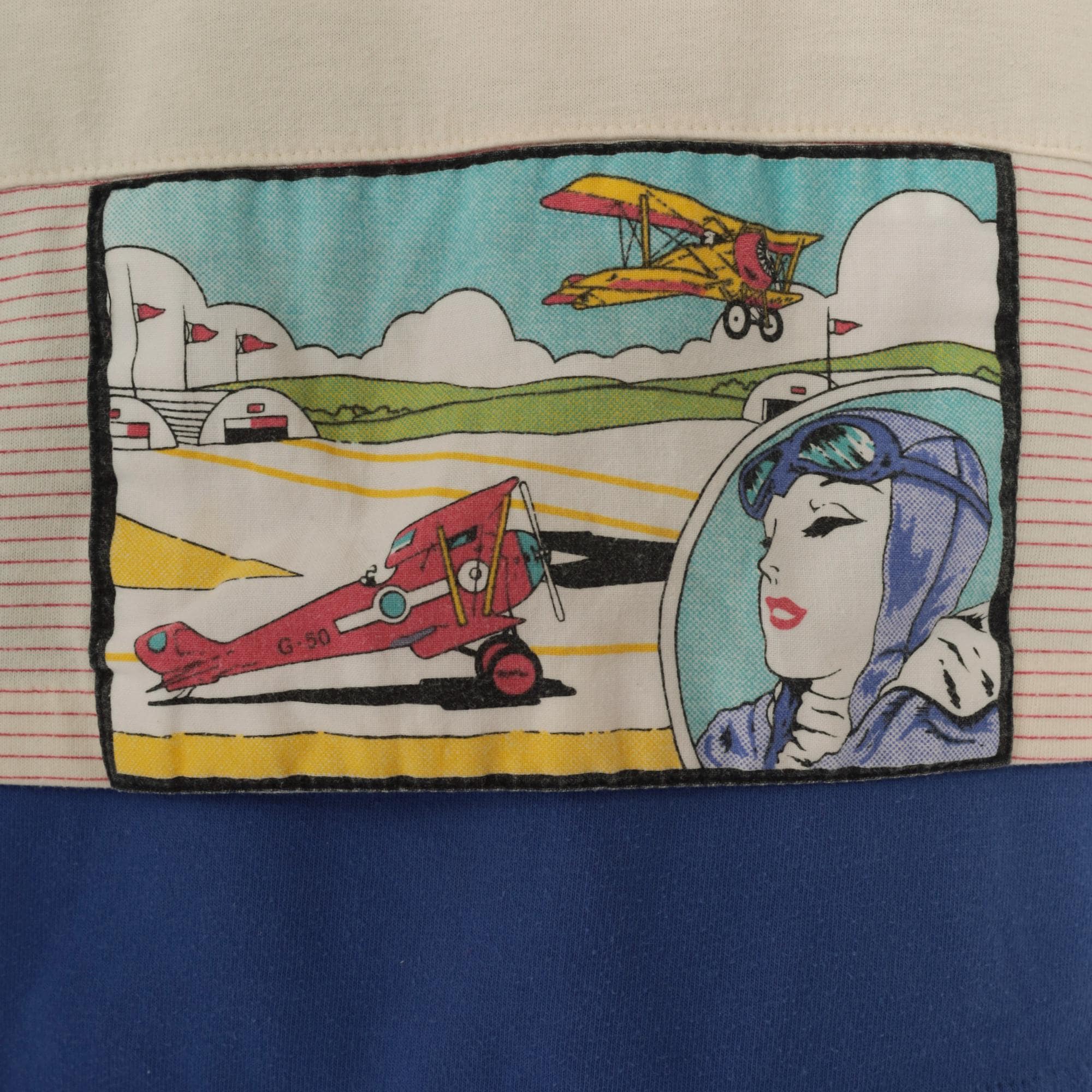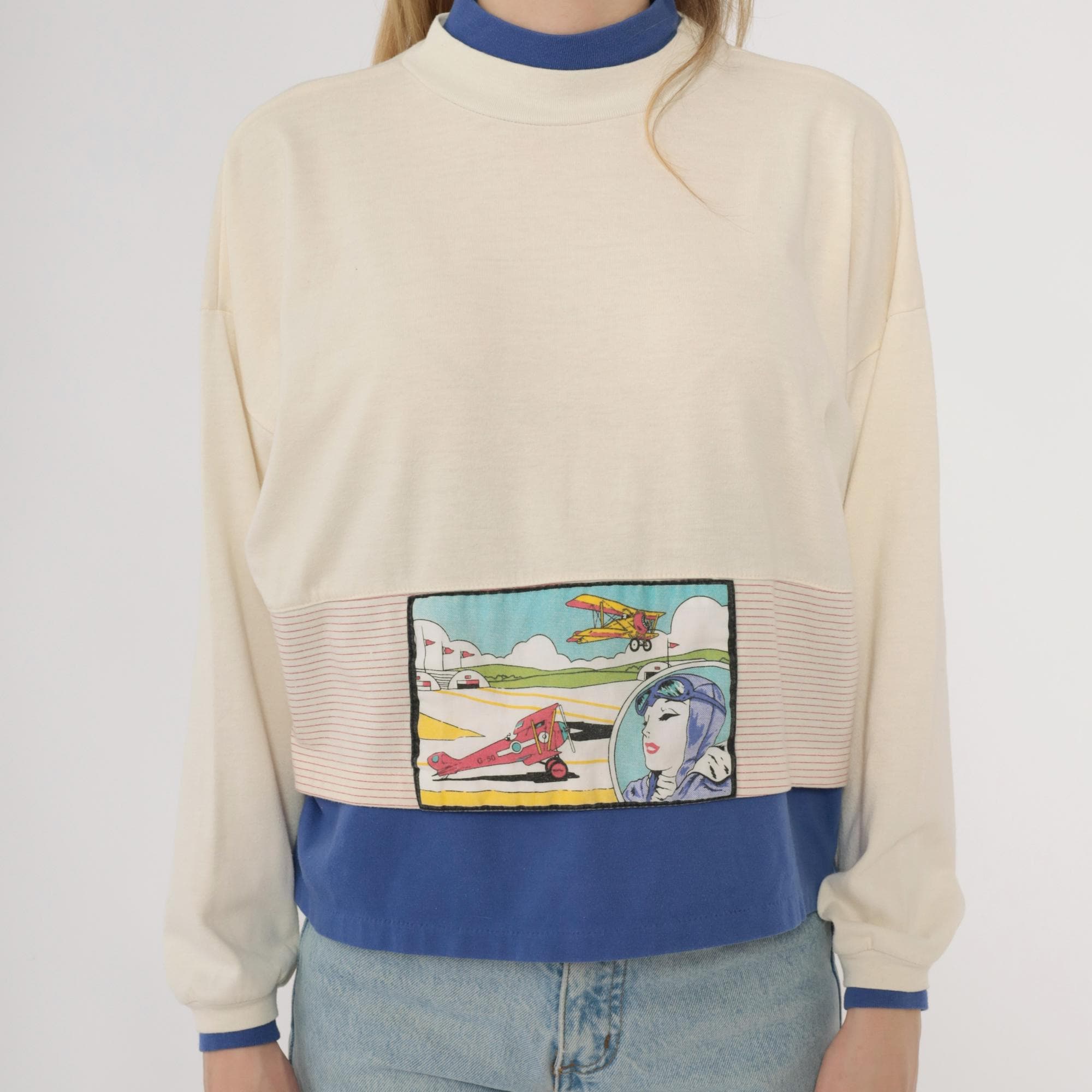 80s cream and blue sweatshirt from ev ltd with vintage aviation graphic panel. Colorful airplane and pilot illustration with striped accents above and below the graphic patch. Blue ribbed trim at crew neckline, cuffs, and hem. Long sleeves with cropped body length. Cotton and polyester blend. Tagged size Large.