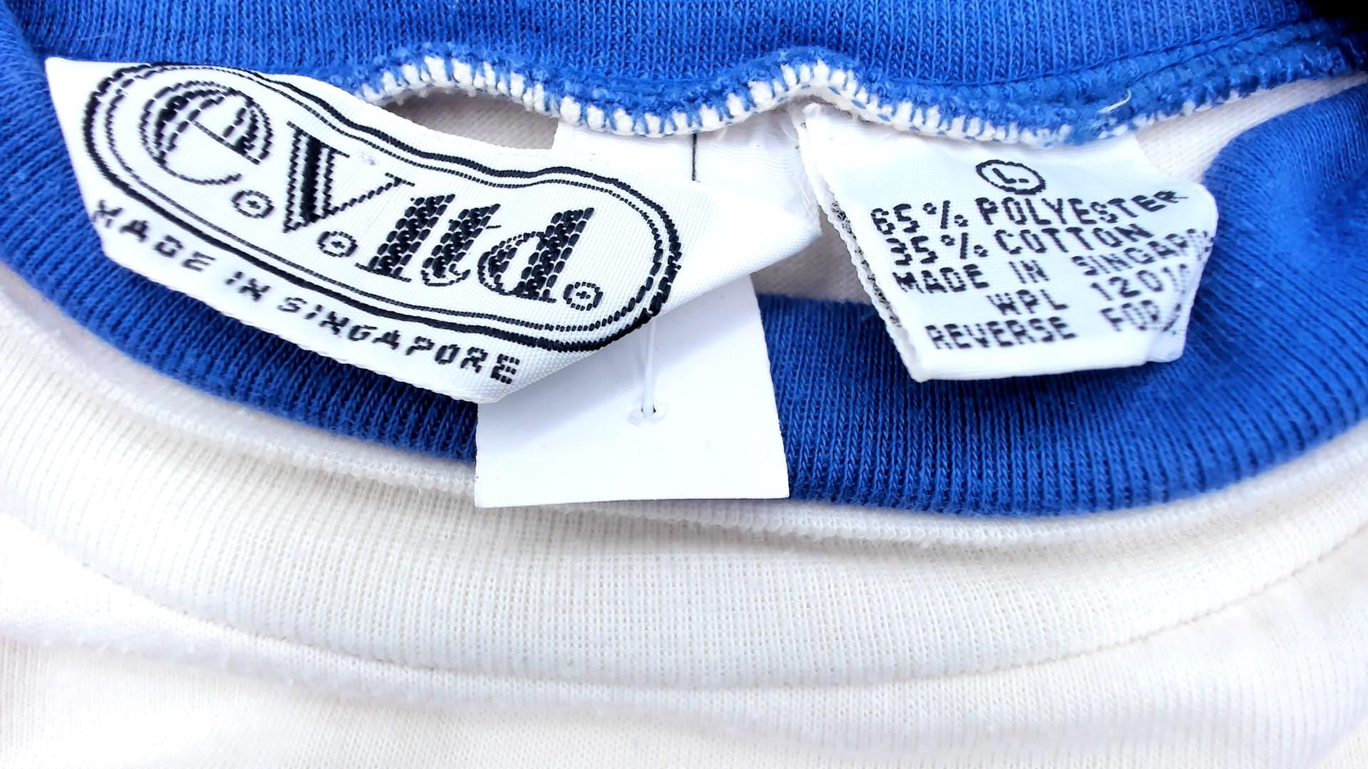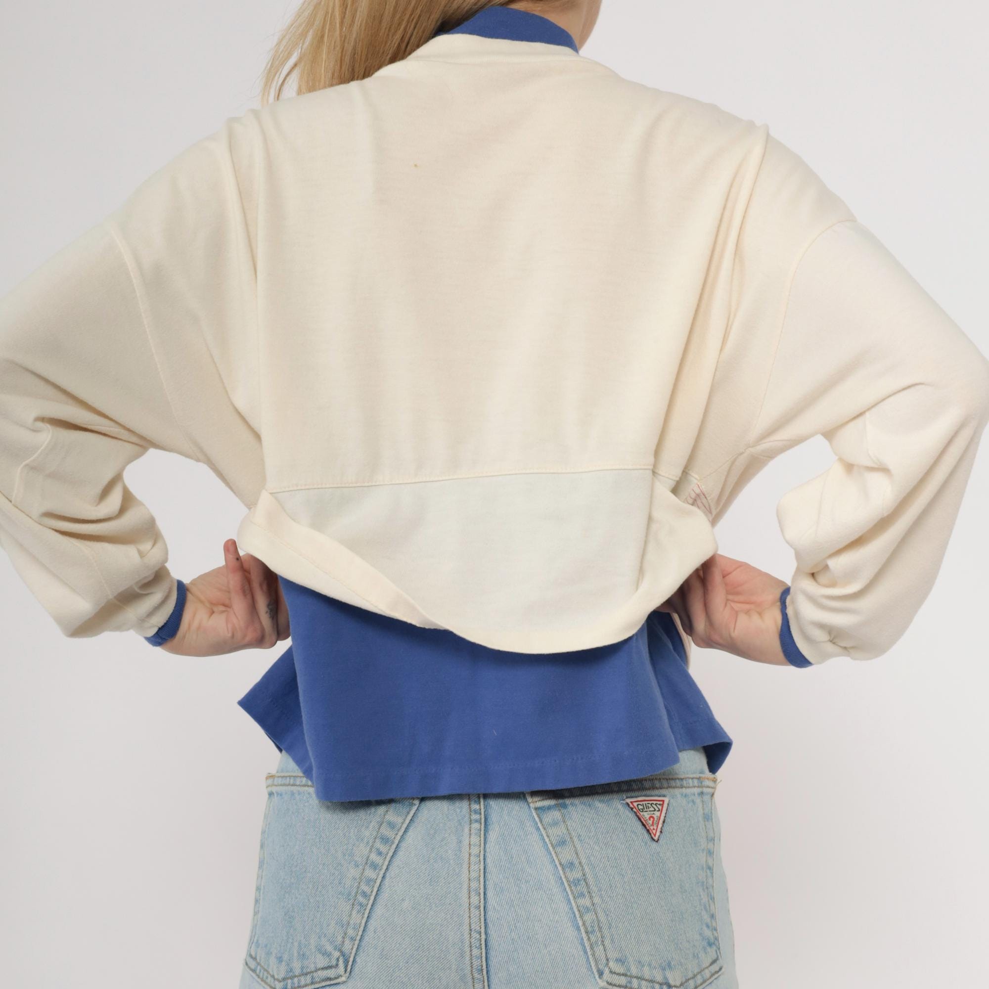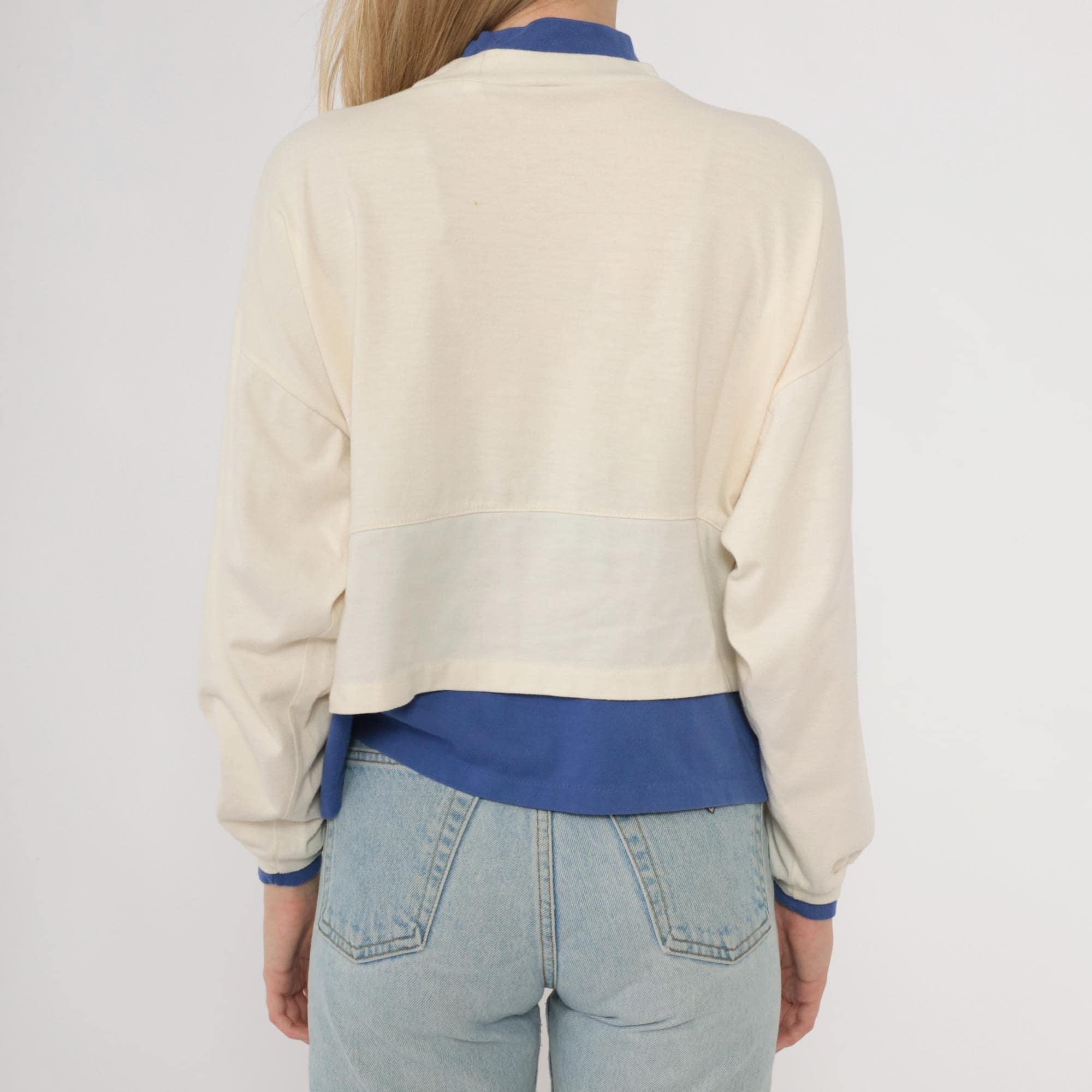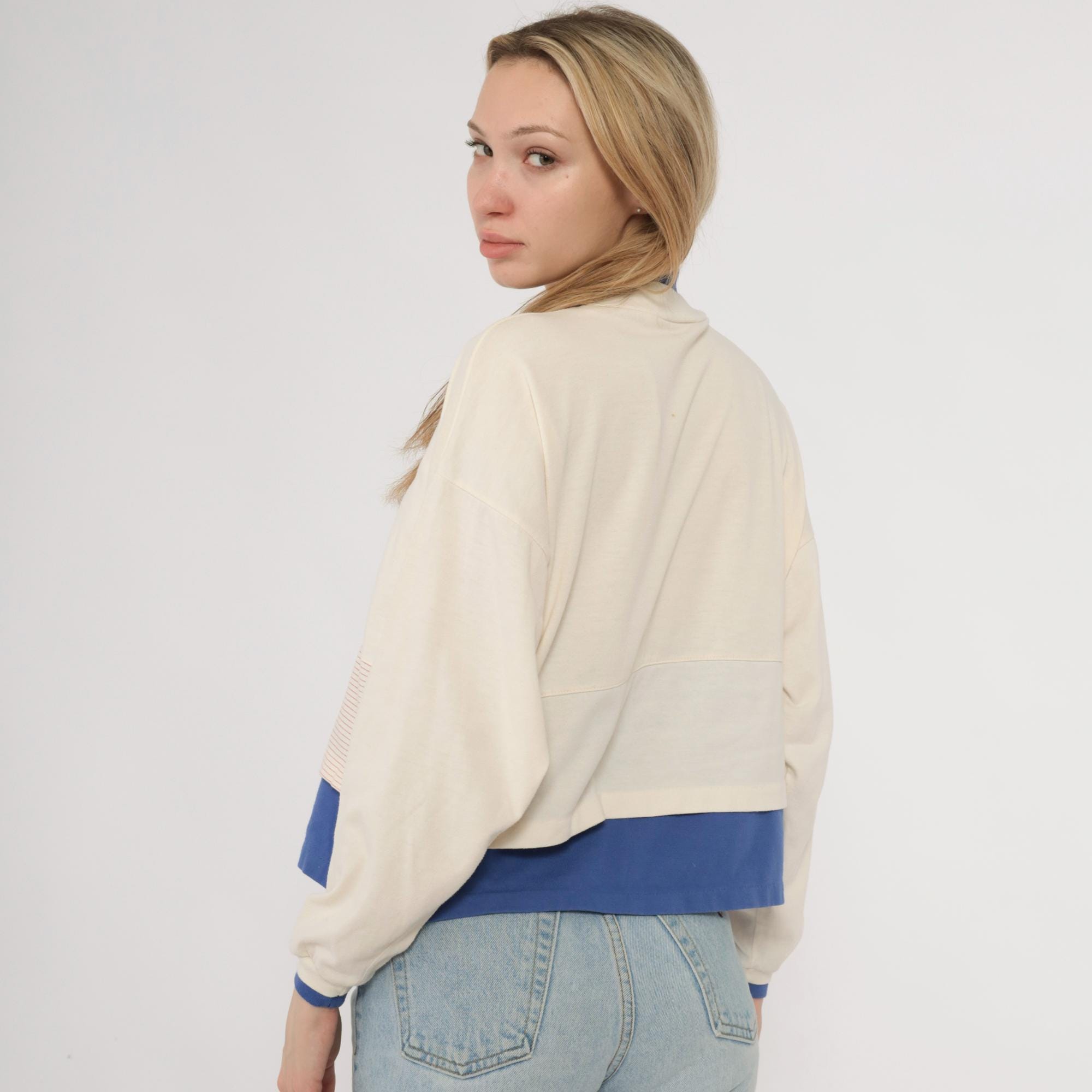 80s cream and blue sweatshirt from ev ltd with vintage aviation graphic panel. Colorful airplane and pilot illustration with striped accents above and below the graphic patch. Blue ribbed trim at crew neckline, cuffs, and hem. Long sleeves with cropped body length. Cotton and polyester blend. Tagged size Large.