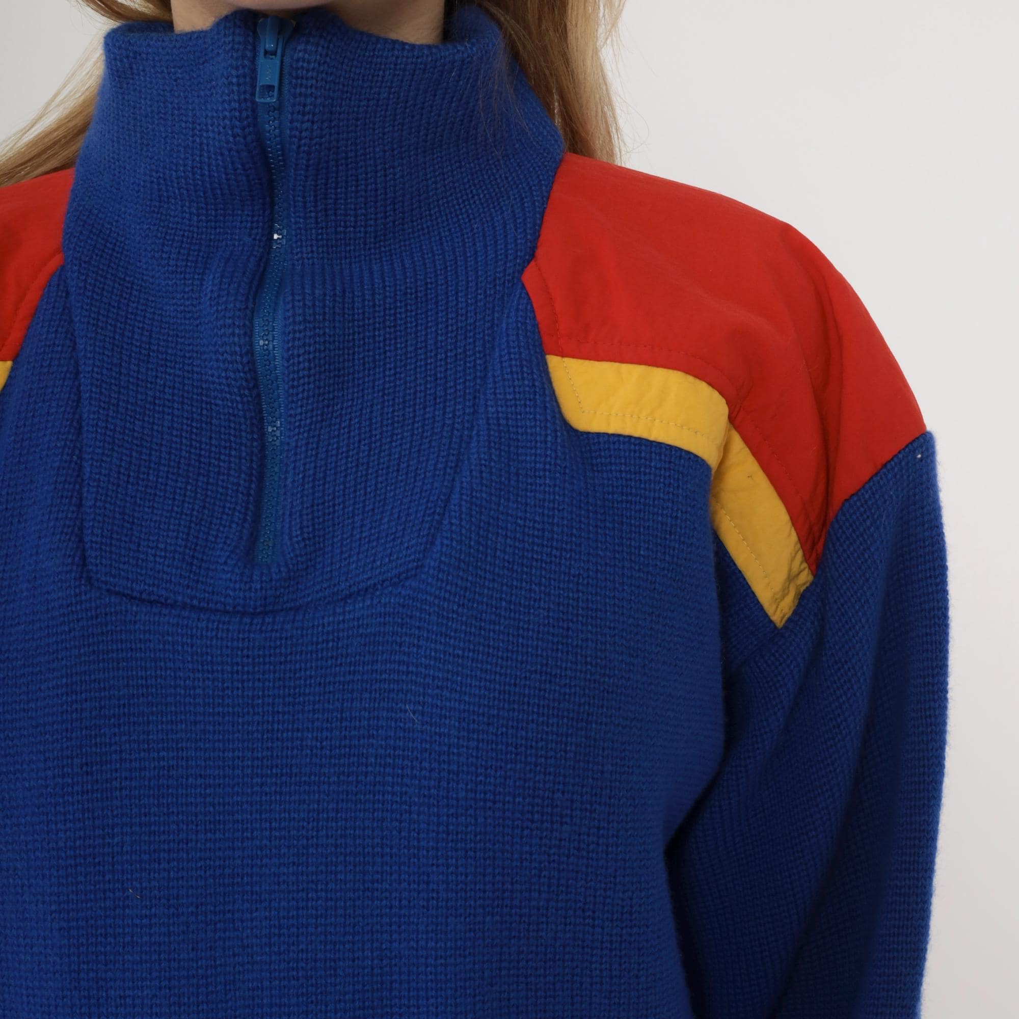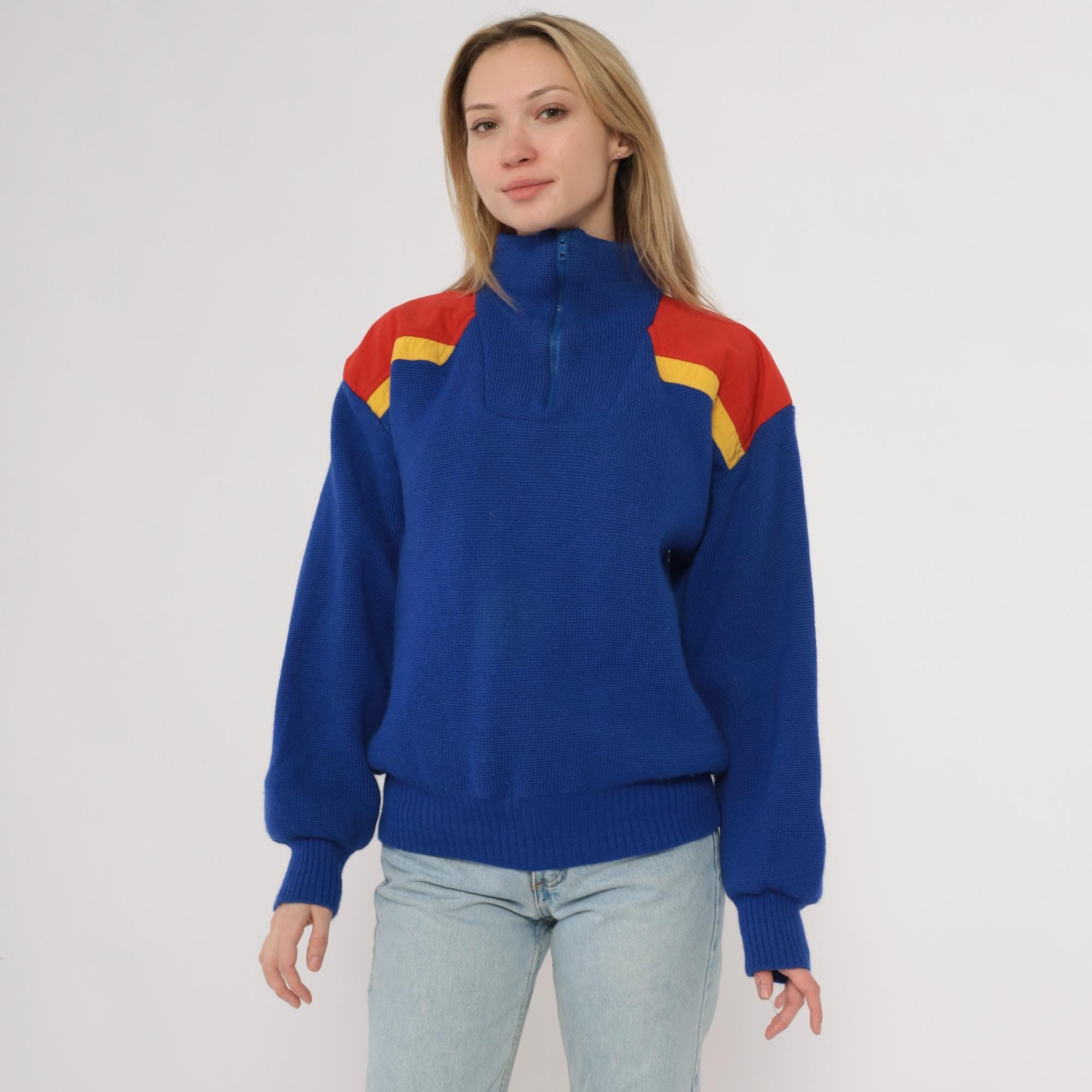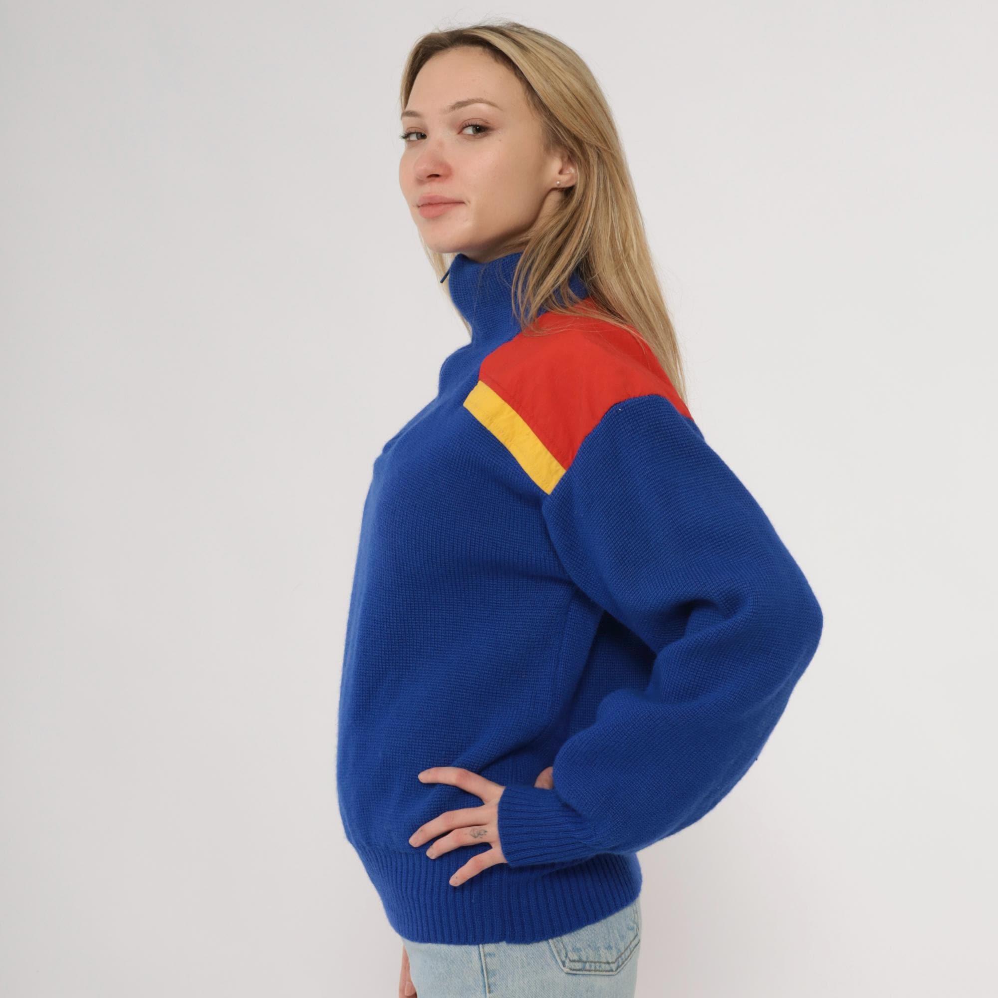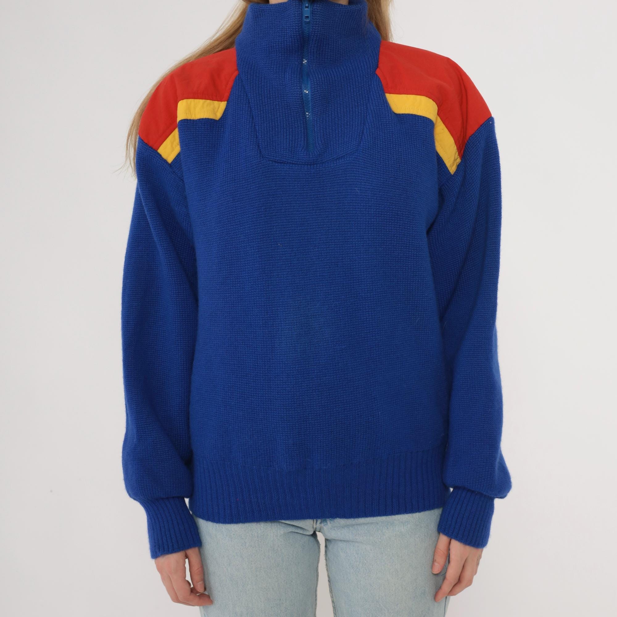 80s blue color-blocked sweater from Slalom with red and yellow shoulder panels. Half-zip front closure with ribbed collar, chunky knit texture throughout. Long sleeves with ribbed cuffs and ribbed hem.