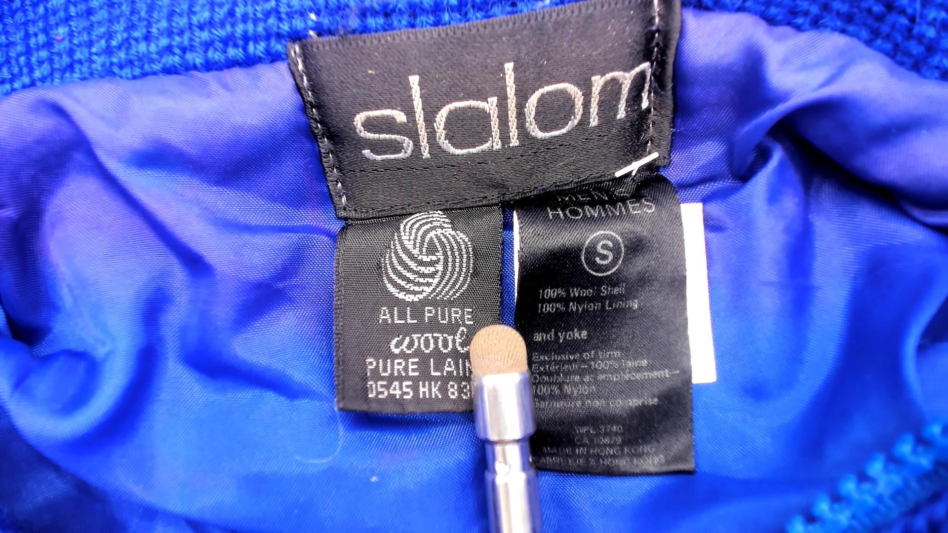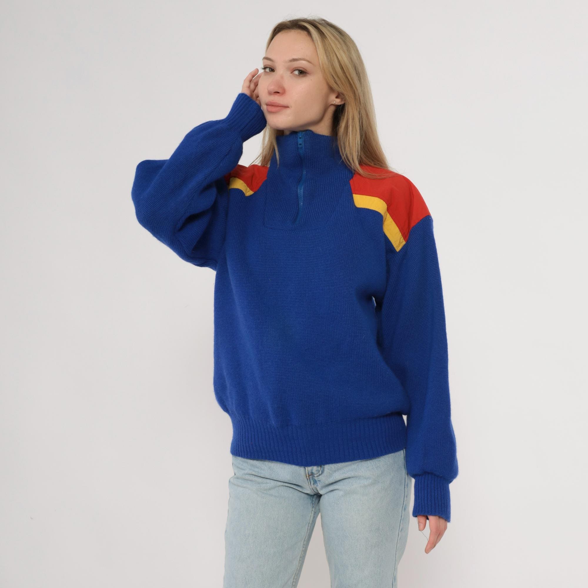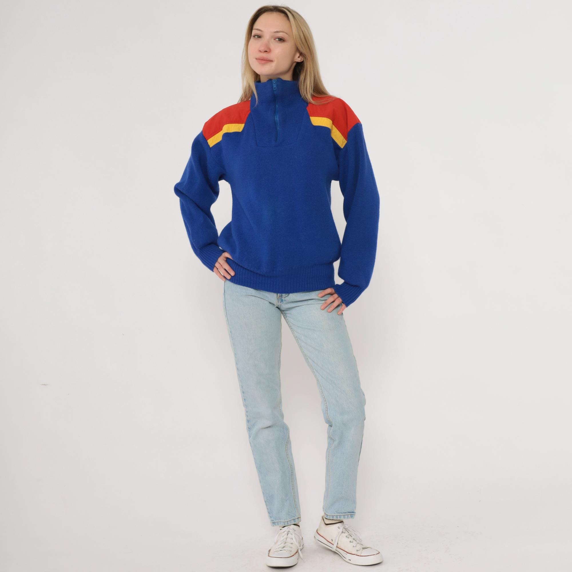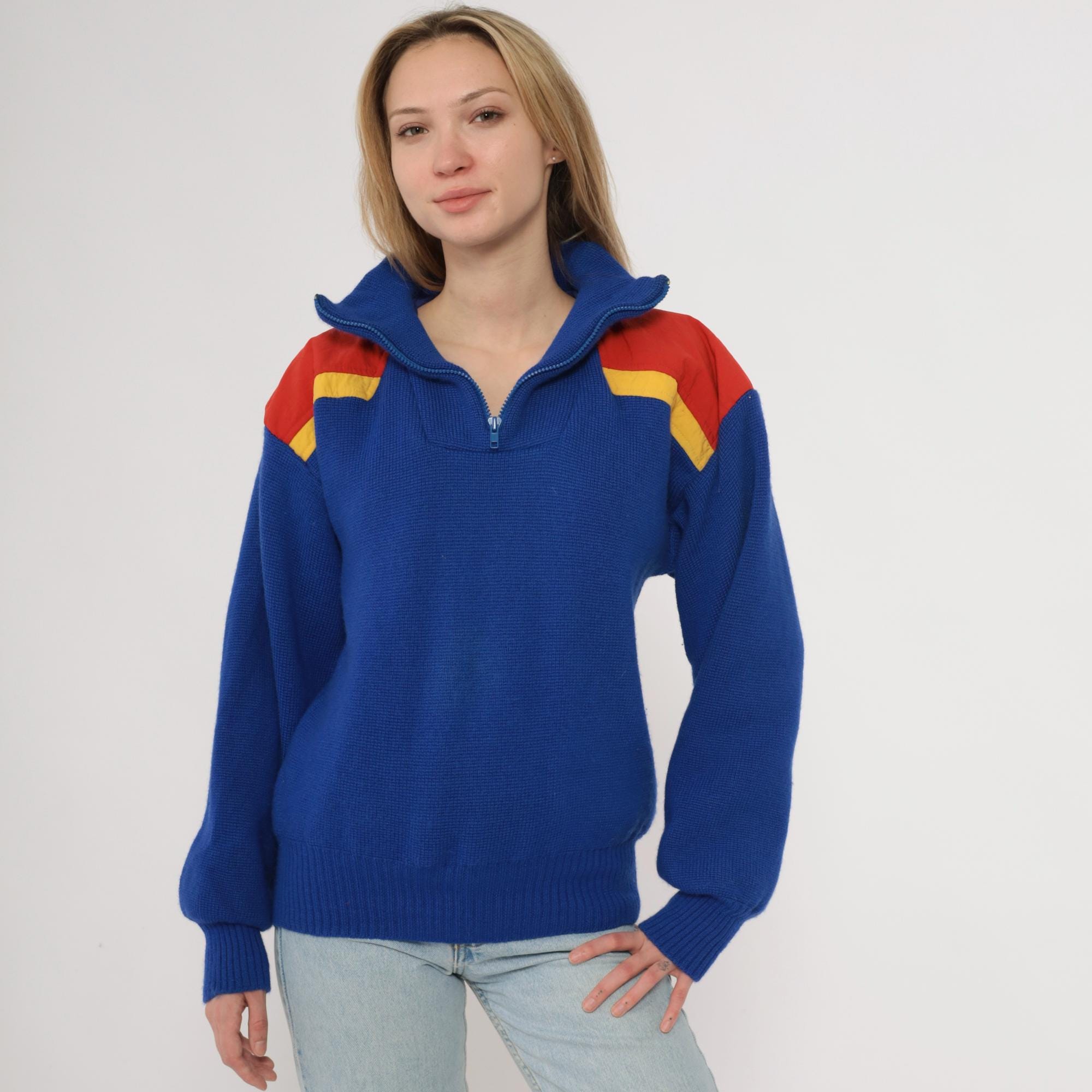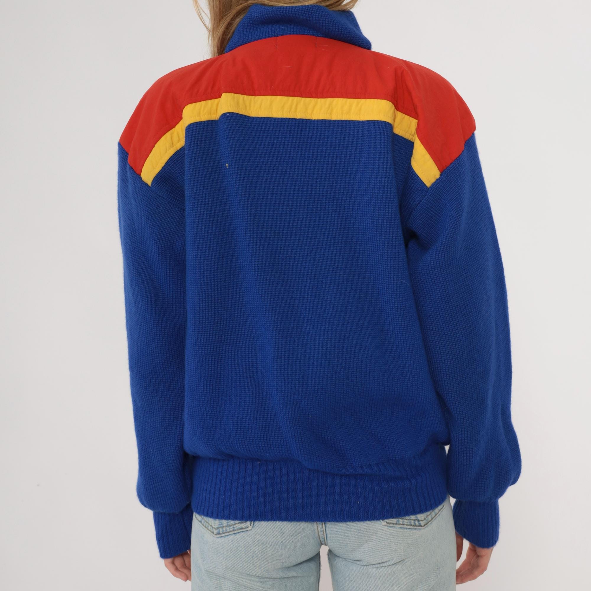 80s blue color-blocked sweater from Slalom with red and yellow shoulder panels. Half-zip front closure with ribbed collar, chunky knit texture throughout. Long sleeves with ribbed cuffs and ribbed hem.