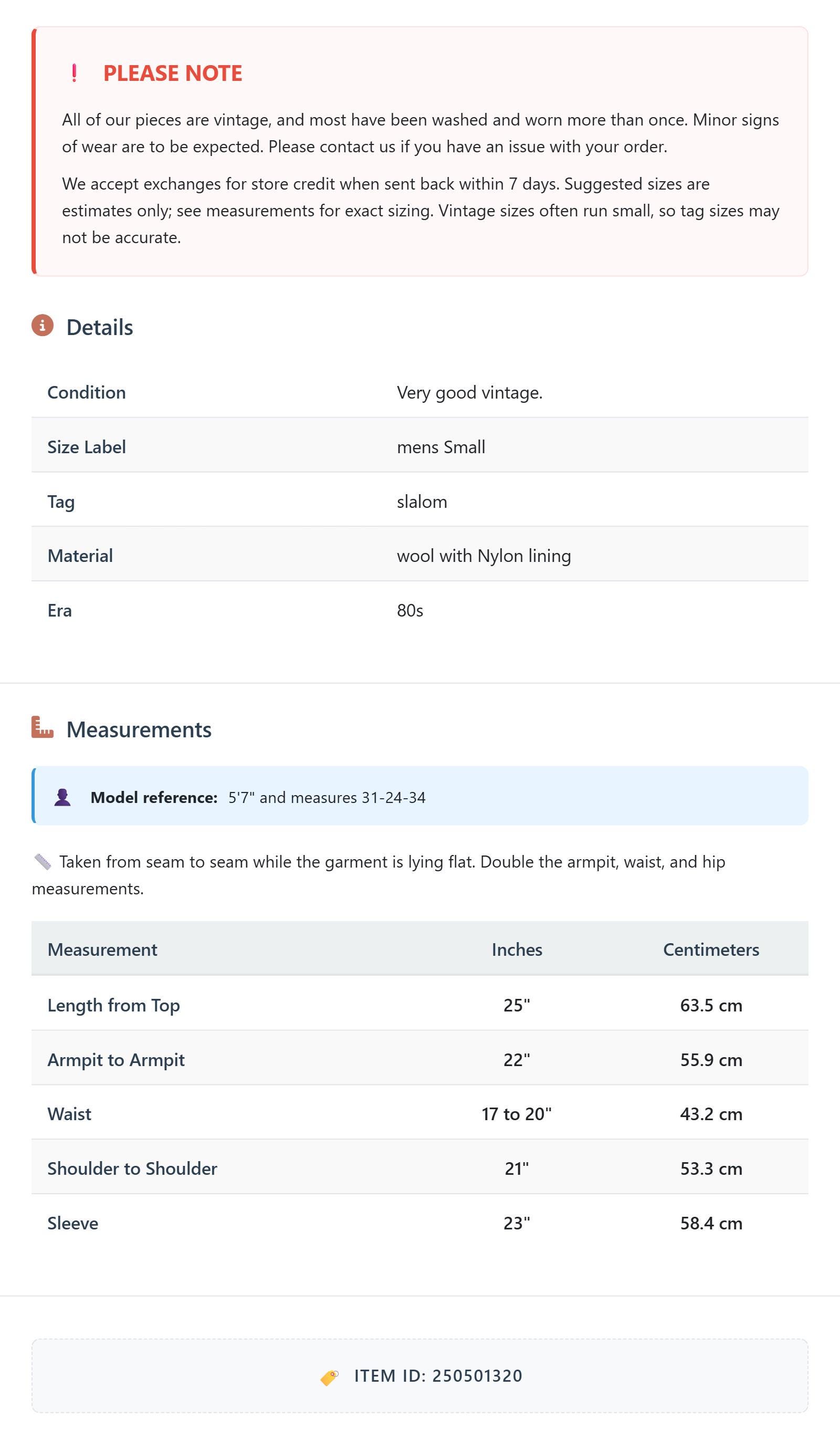 All of our pieces are vintage, and most have been washed and worn more than once. Minor signs of wear are to be expected. Please contact us if you have an issue with your order. We accept exchanges for store credit when sent back within 7 days.