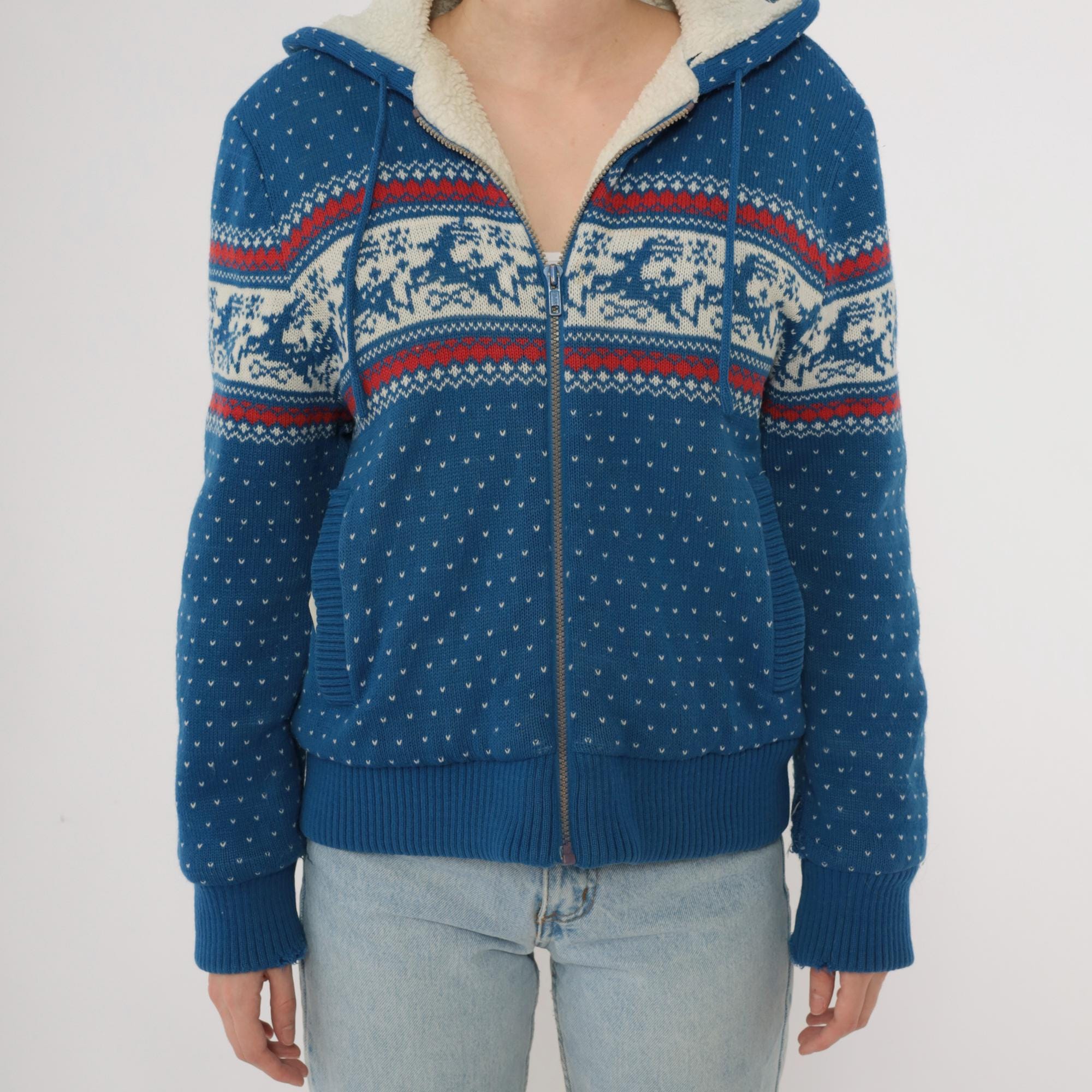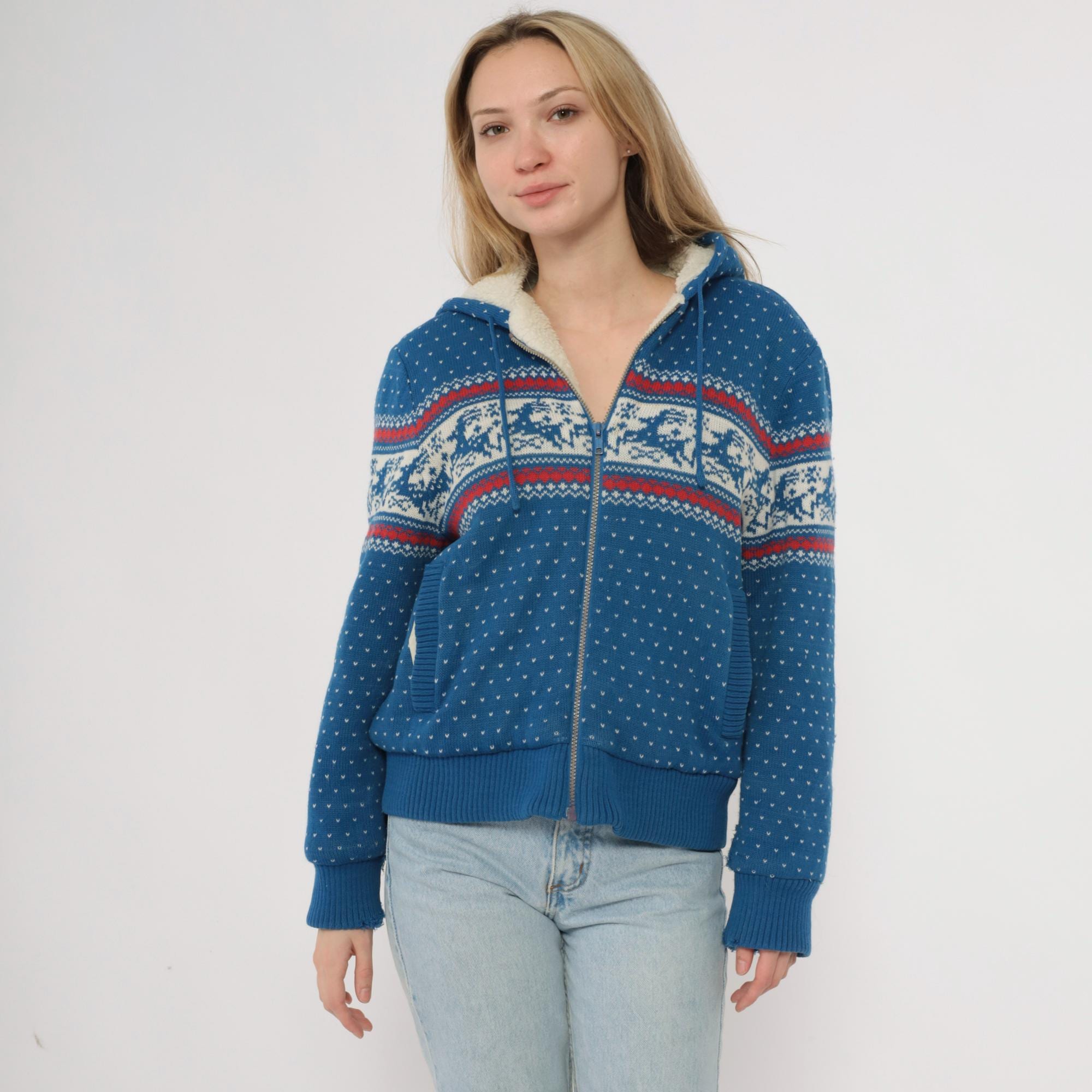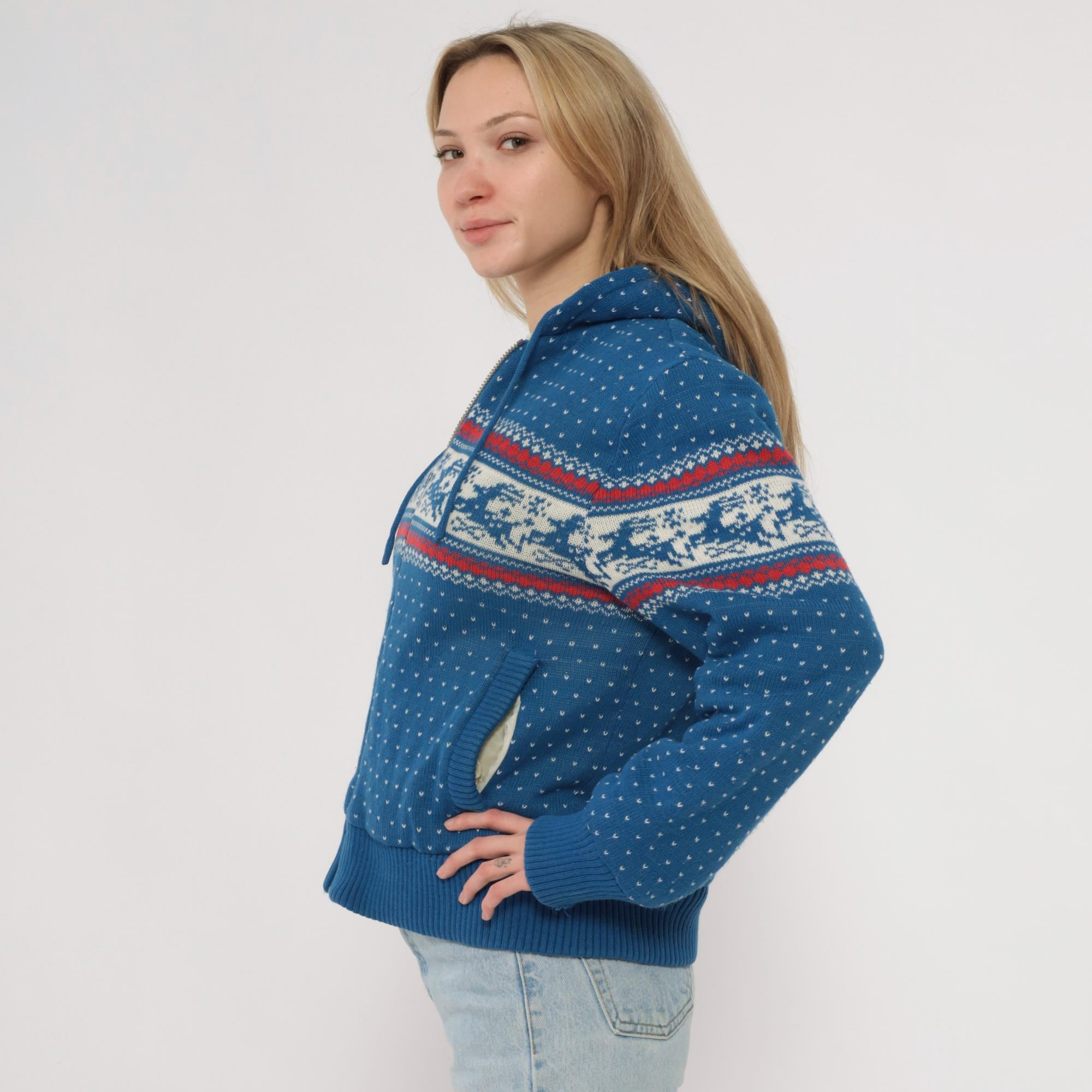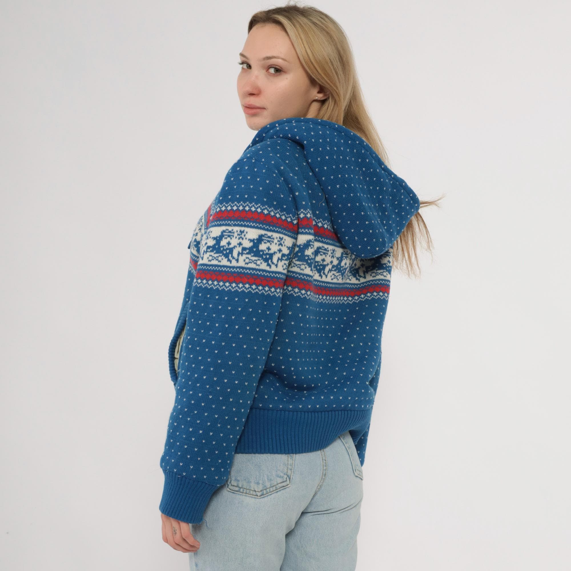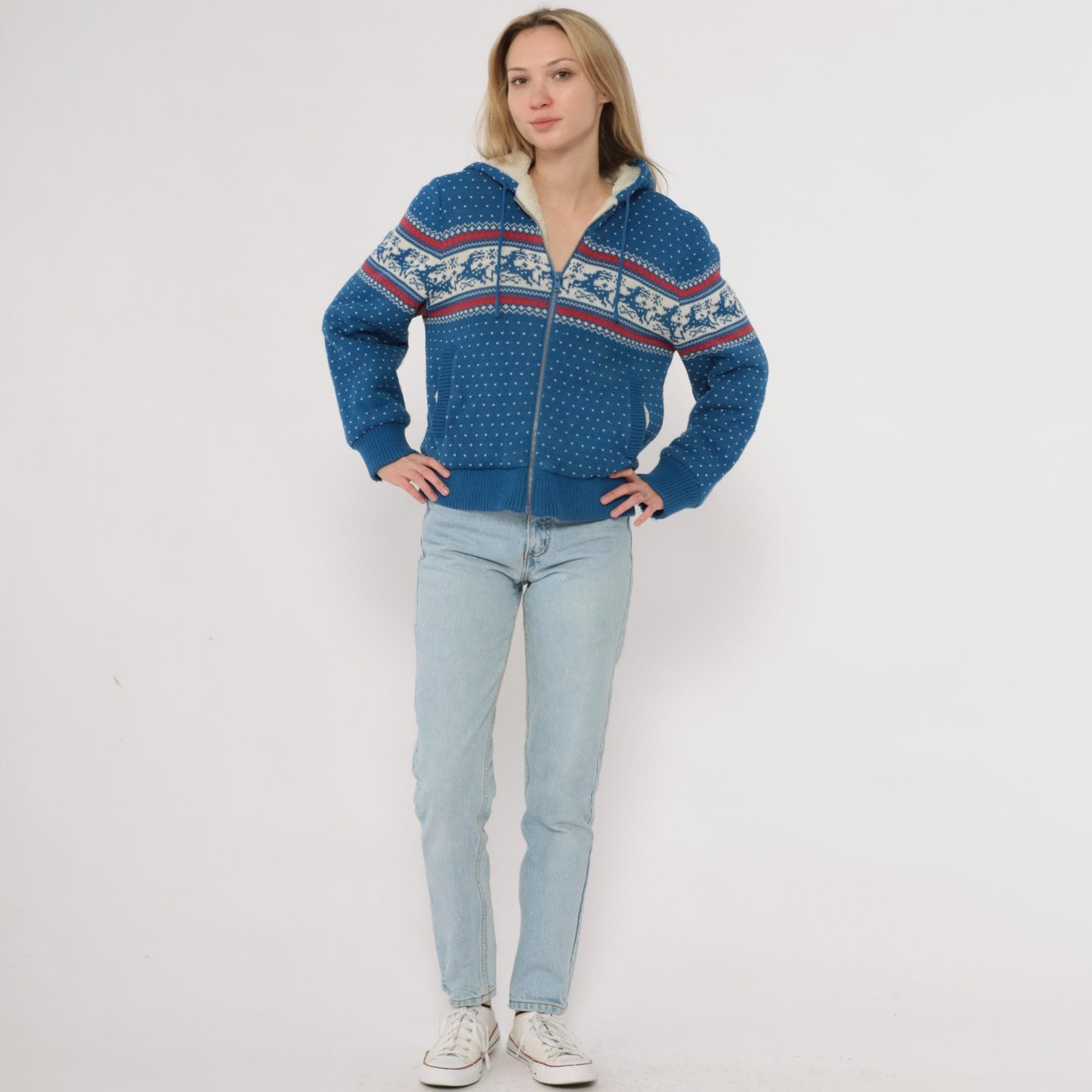 80s blue zip-front hooded jacket with Nordic-inspired pattern bands across chest featuring cream and navy deer motifs with red accent stripes. Small dotted pattern across blue base fabric, ribbed knit cuffs and hem, and attached hood lined with cream sherpa material.