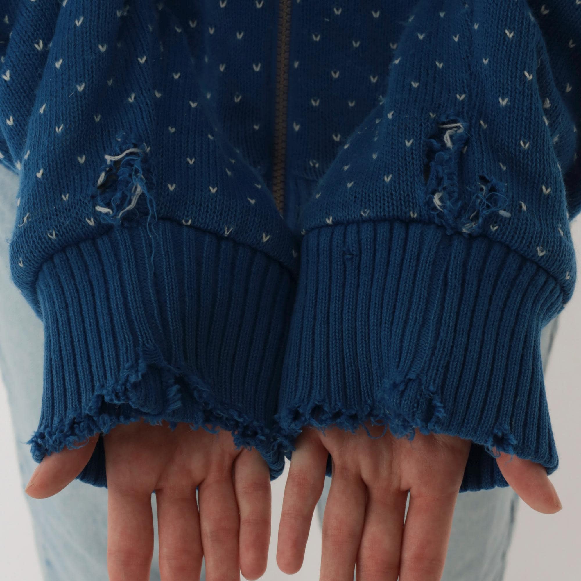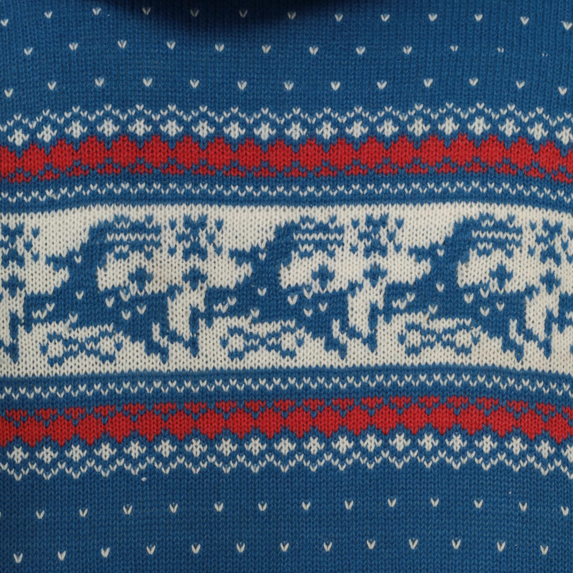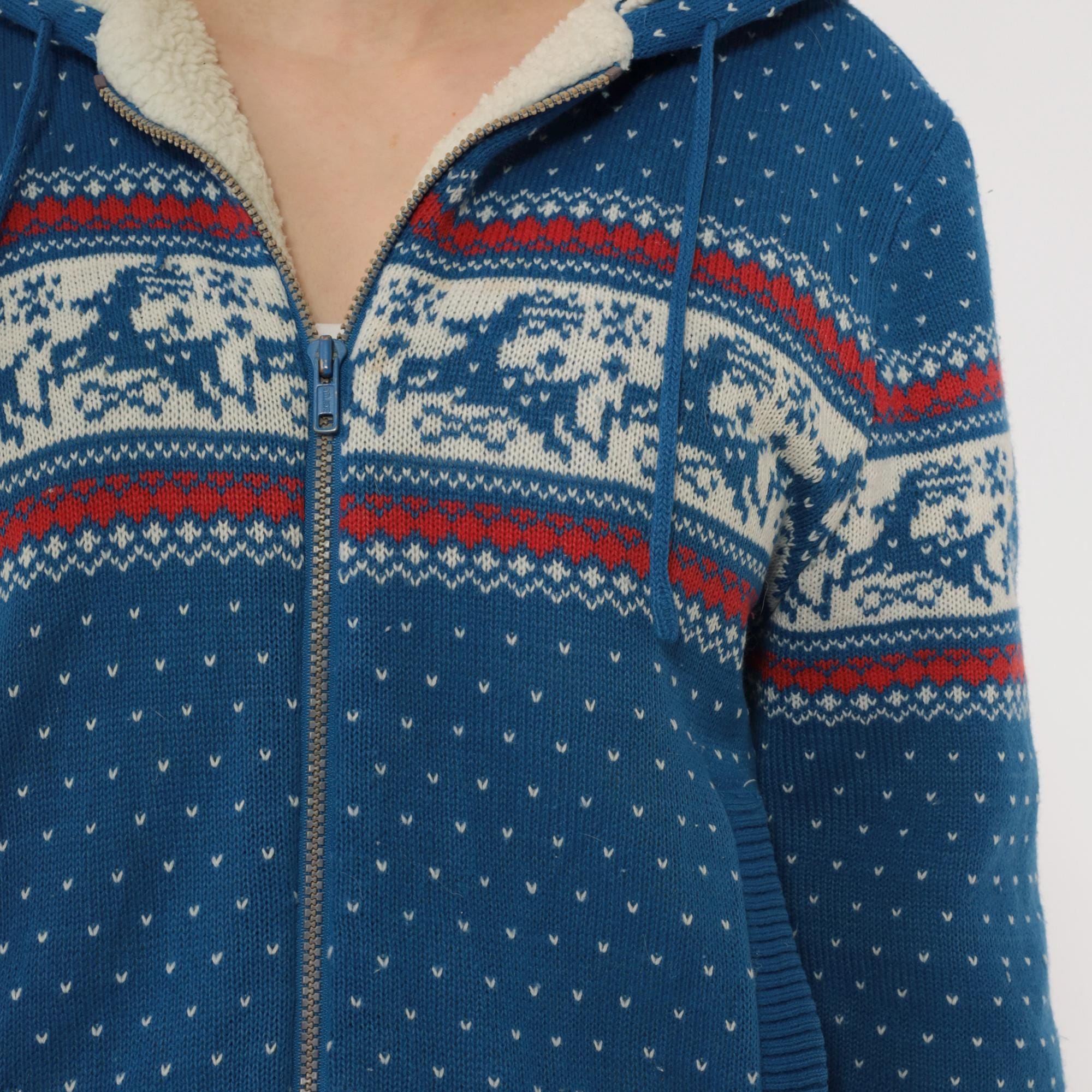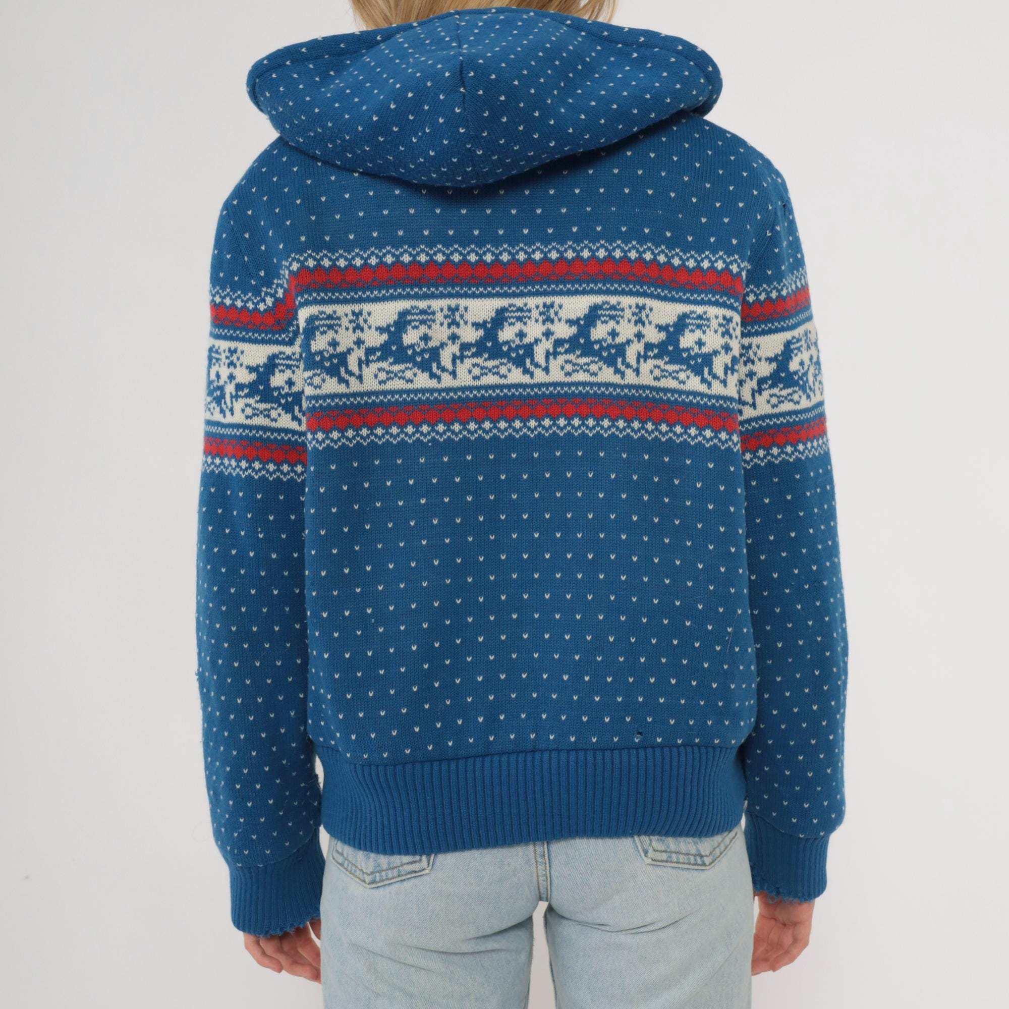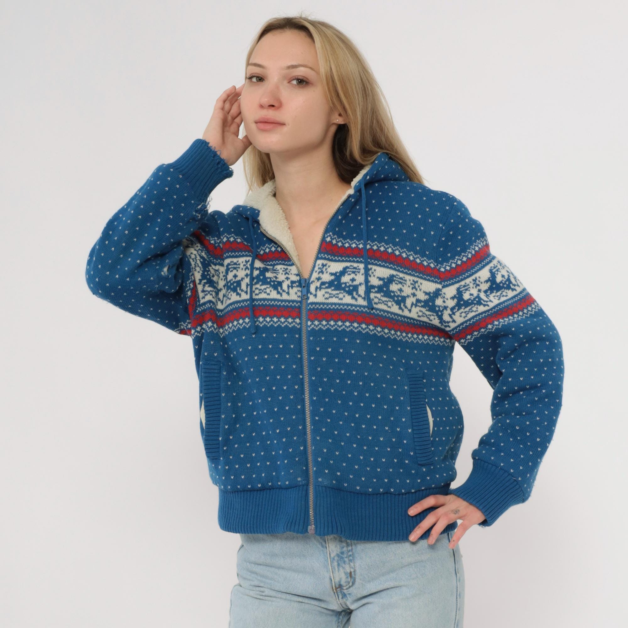 80s blue zip-front hooded jacket with Nordic-inspired pattern bands across chest featuring cream and navy deer motifs with red accent stripes. Small dotted pattern across blue base fabric, ribbed knit cuffs and hem, and attached hood lined with cream sherpa material.