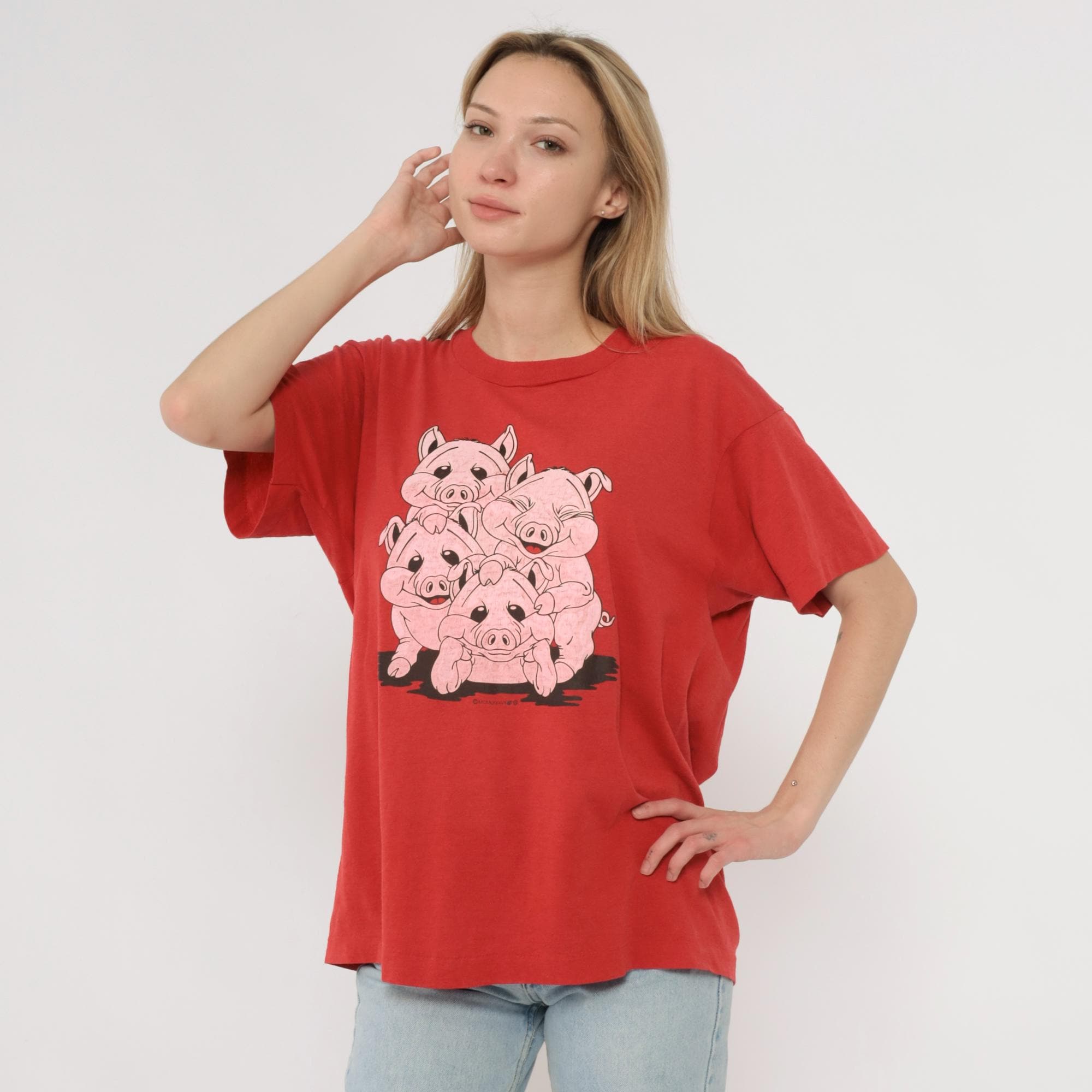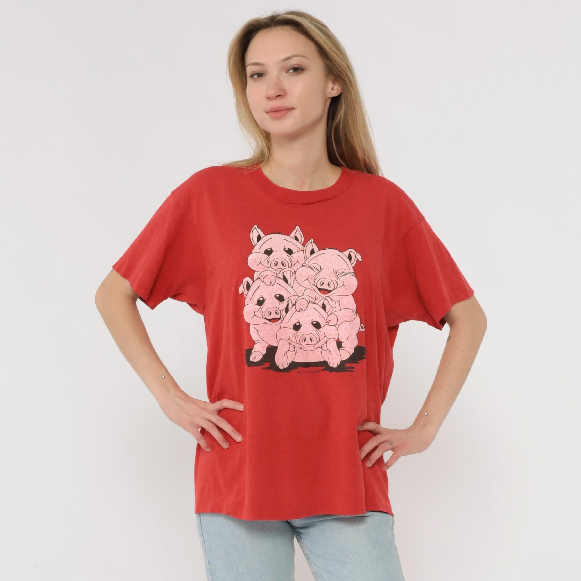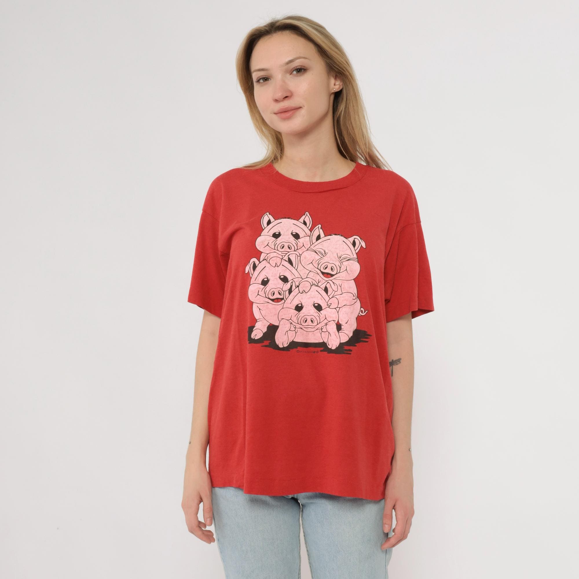 90s red graphic t-shirt from Screen Stars with cartoon pig print across the front. Crew neckline, short sleeves, relaxed fit.
