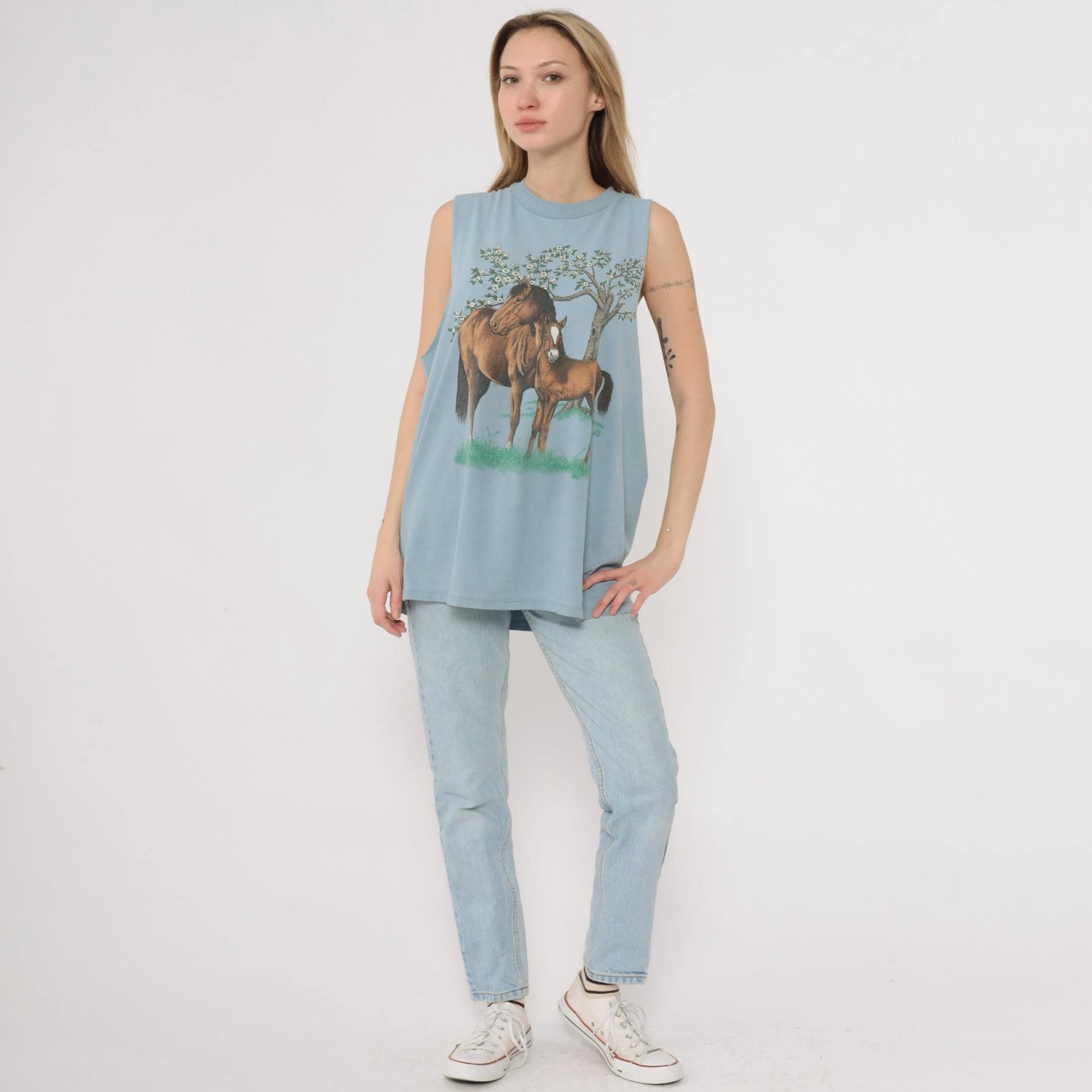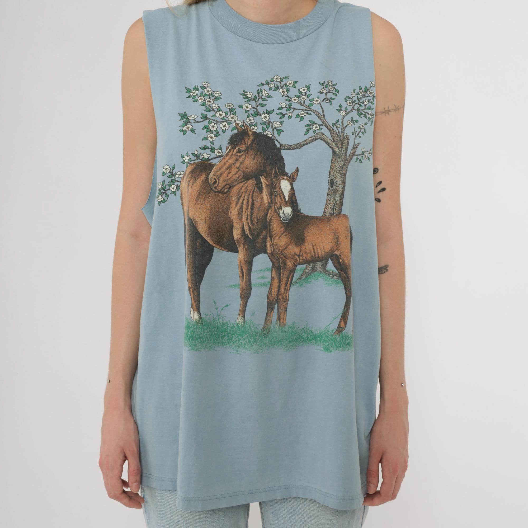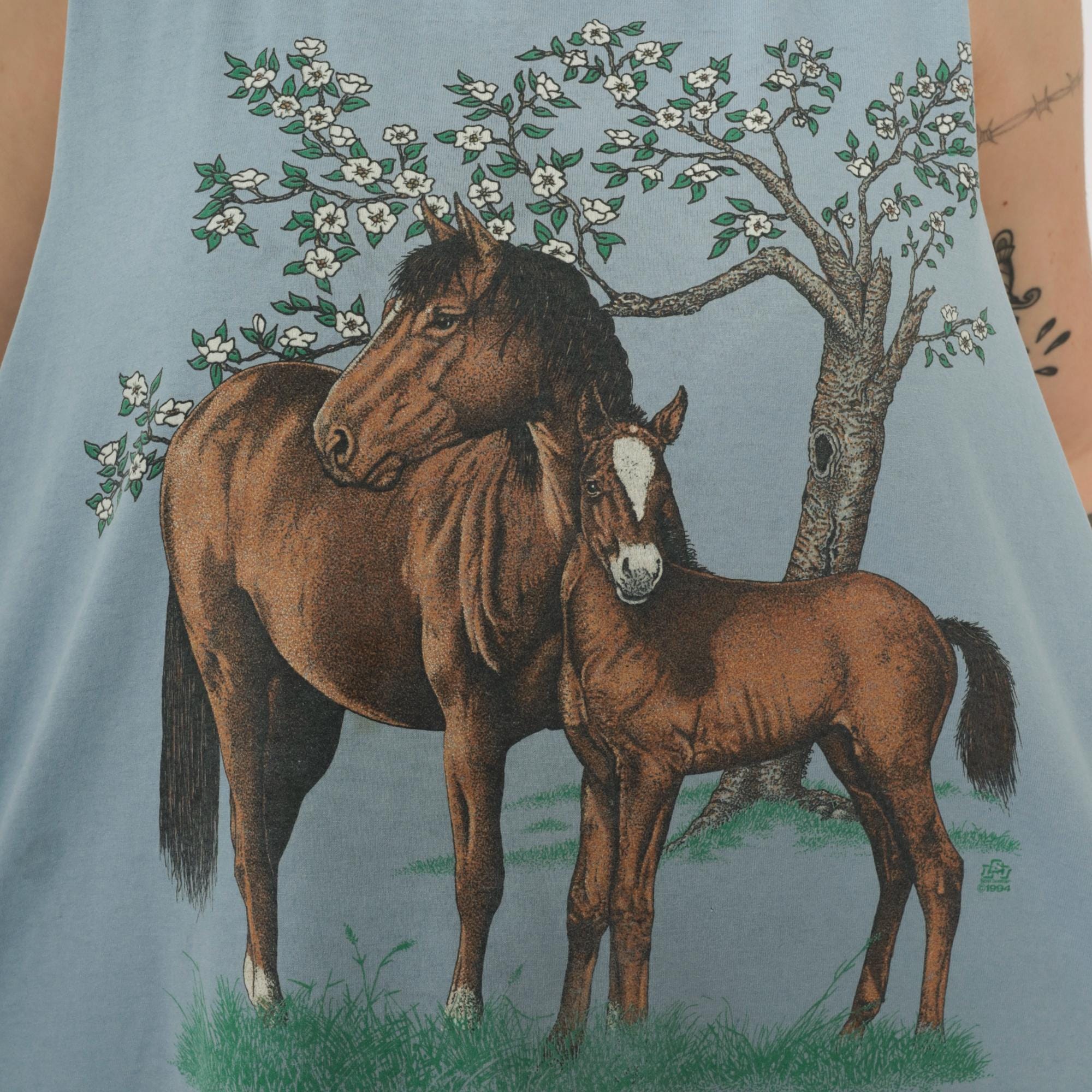 90s pale blue sleeveless tank top from Cotton Grove with horse and foal graphic print on front. Adult horse and young foal stand beneath a flowering tree with white blossoms and green leaves. Crew neckline with raw unfinished sleeve hems.
