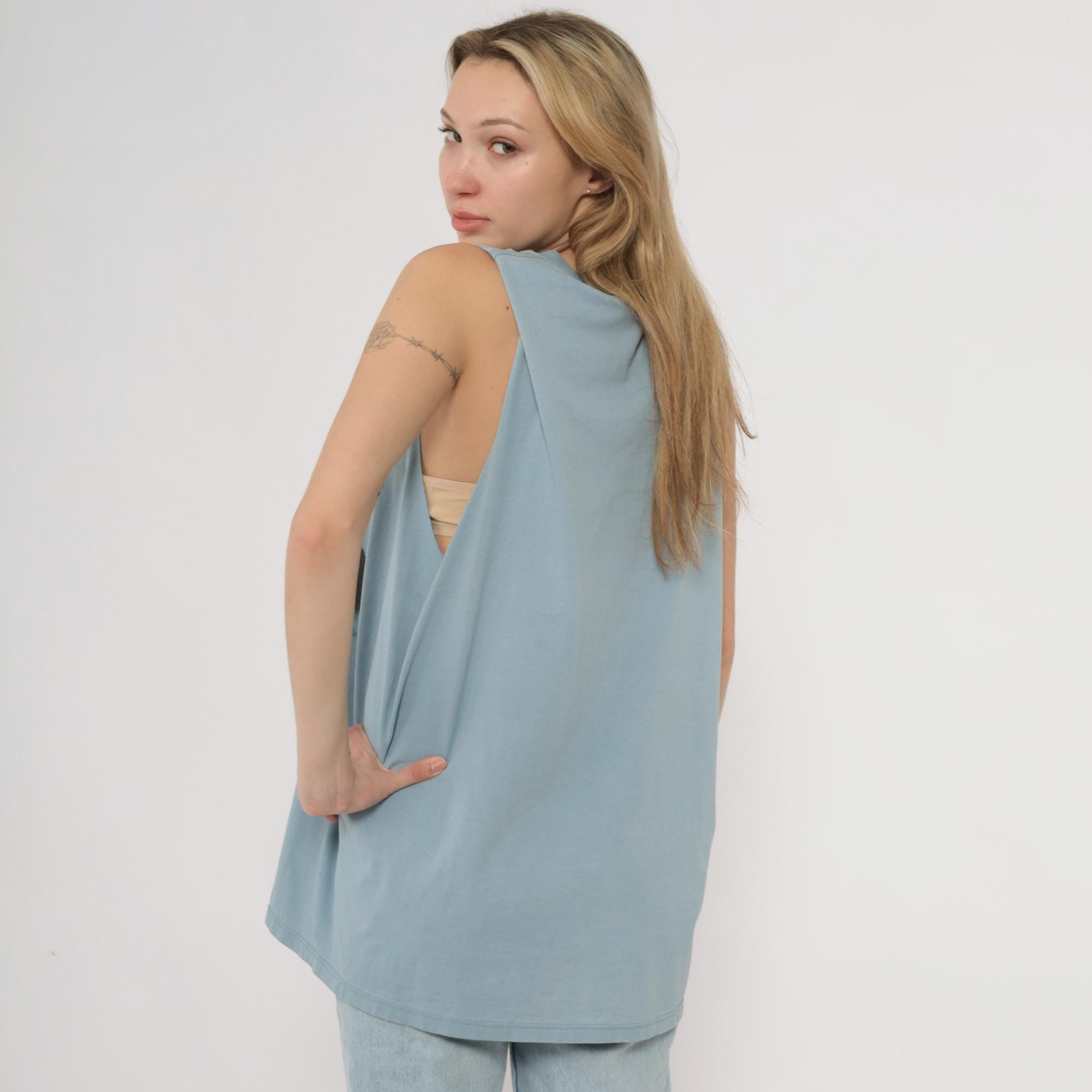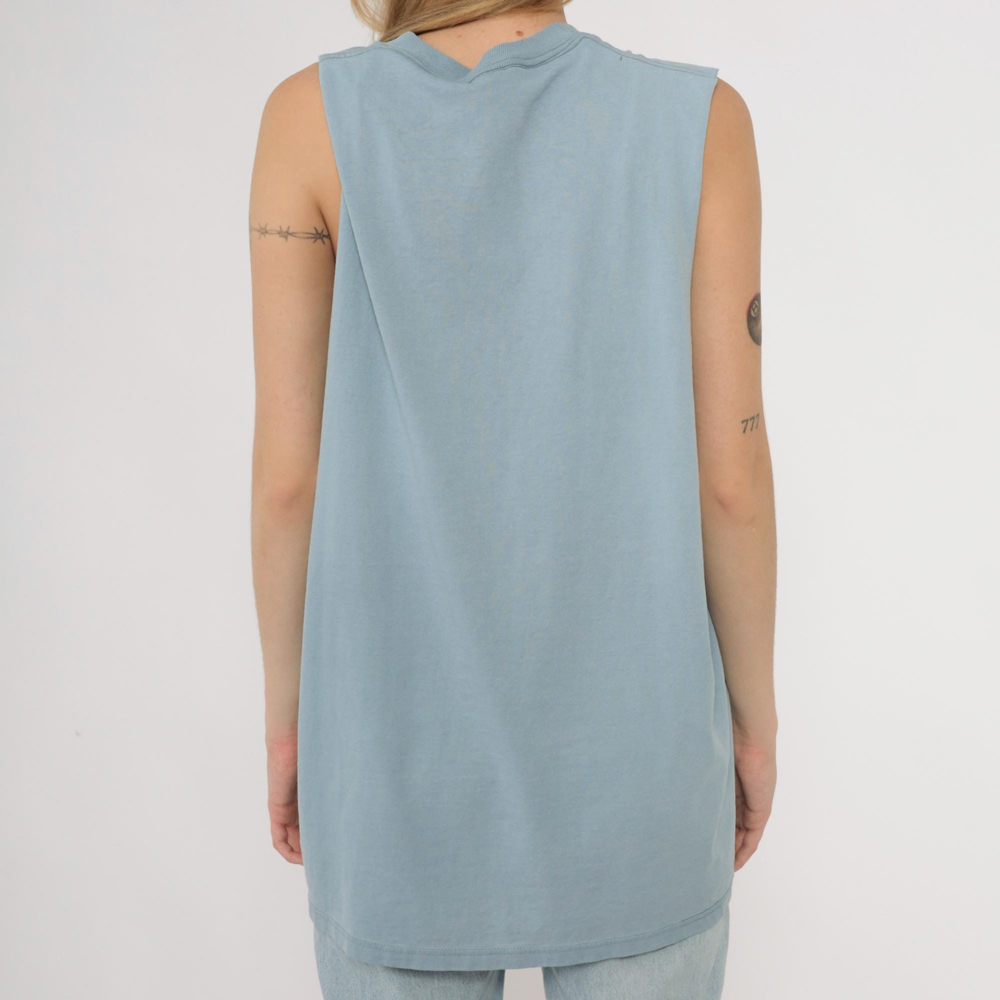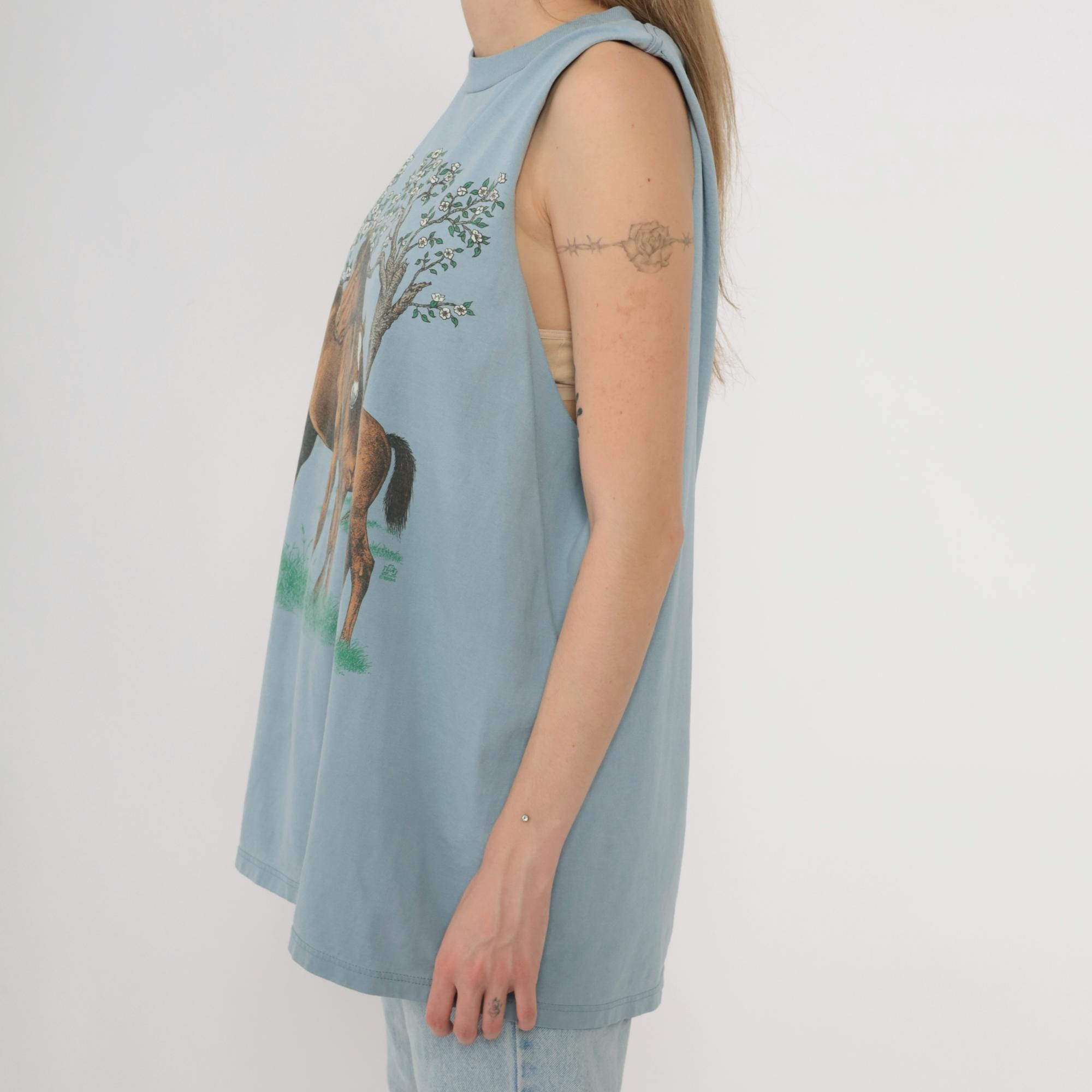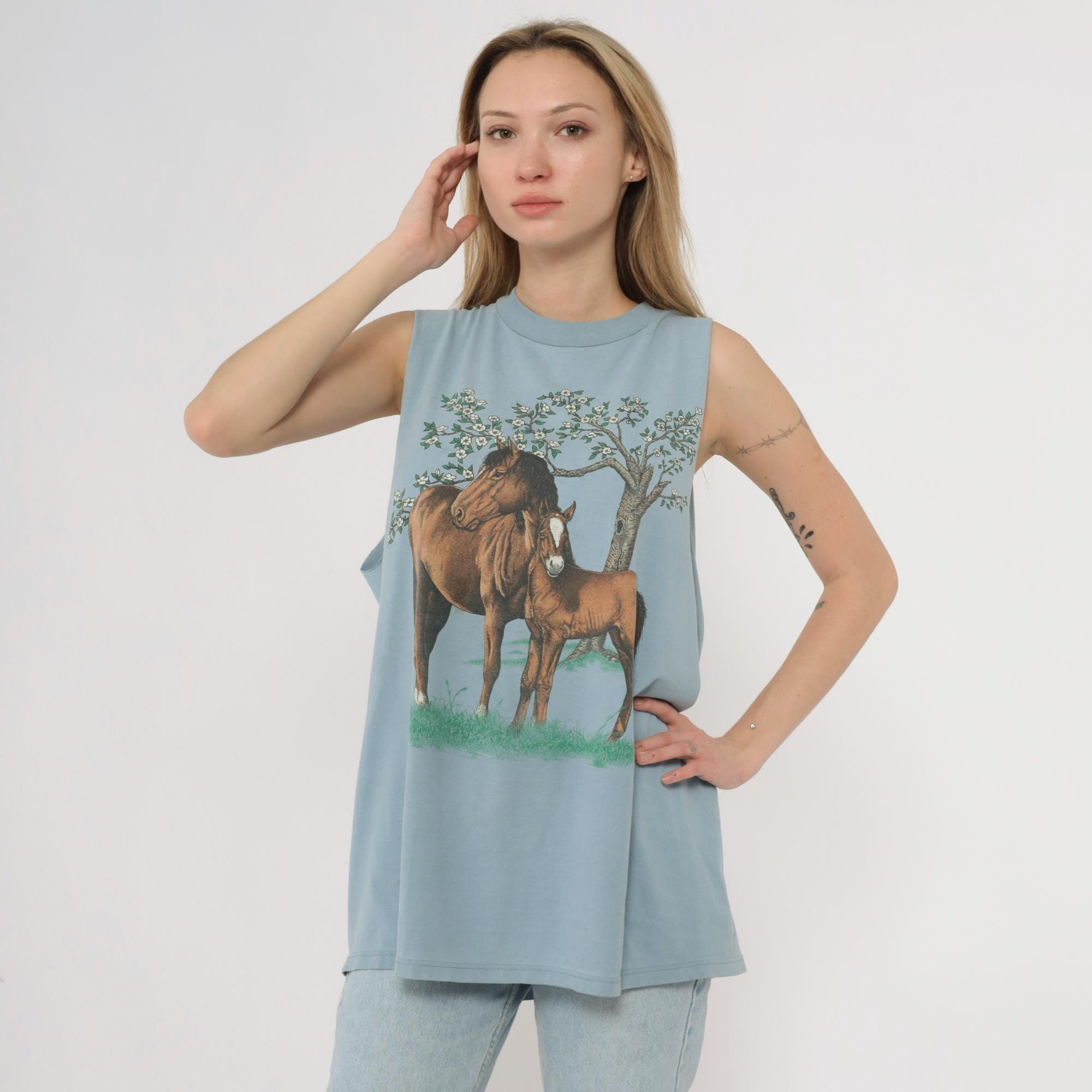 90s pale blue sleeveless tank top from Cotton Grove with horse and foal graphic print on front. Adult horse and young foal stand beneath a flowering tree with white blossoms and green leaves. Crew neckline with raw unfinished sleeve hems.