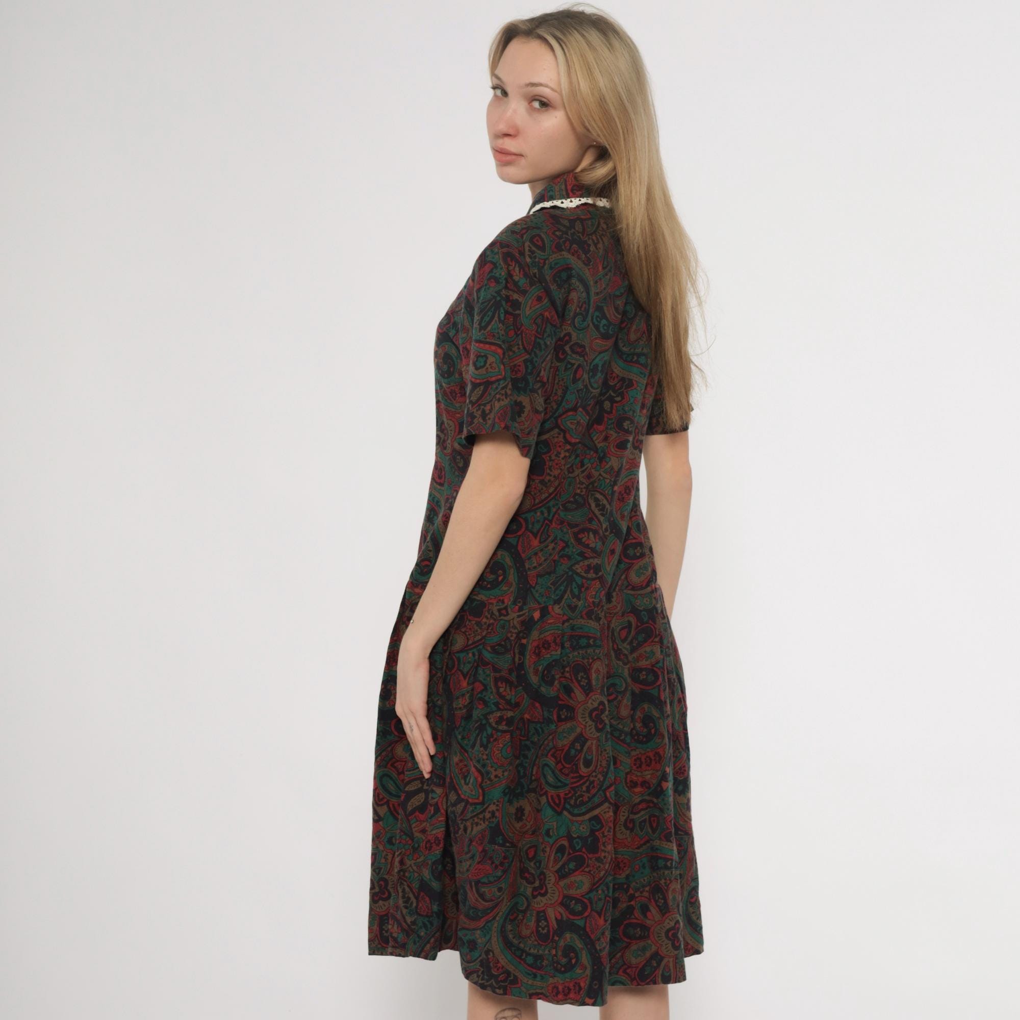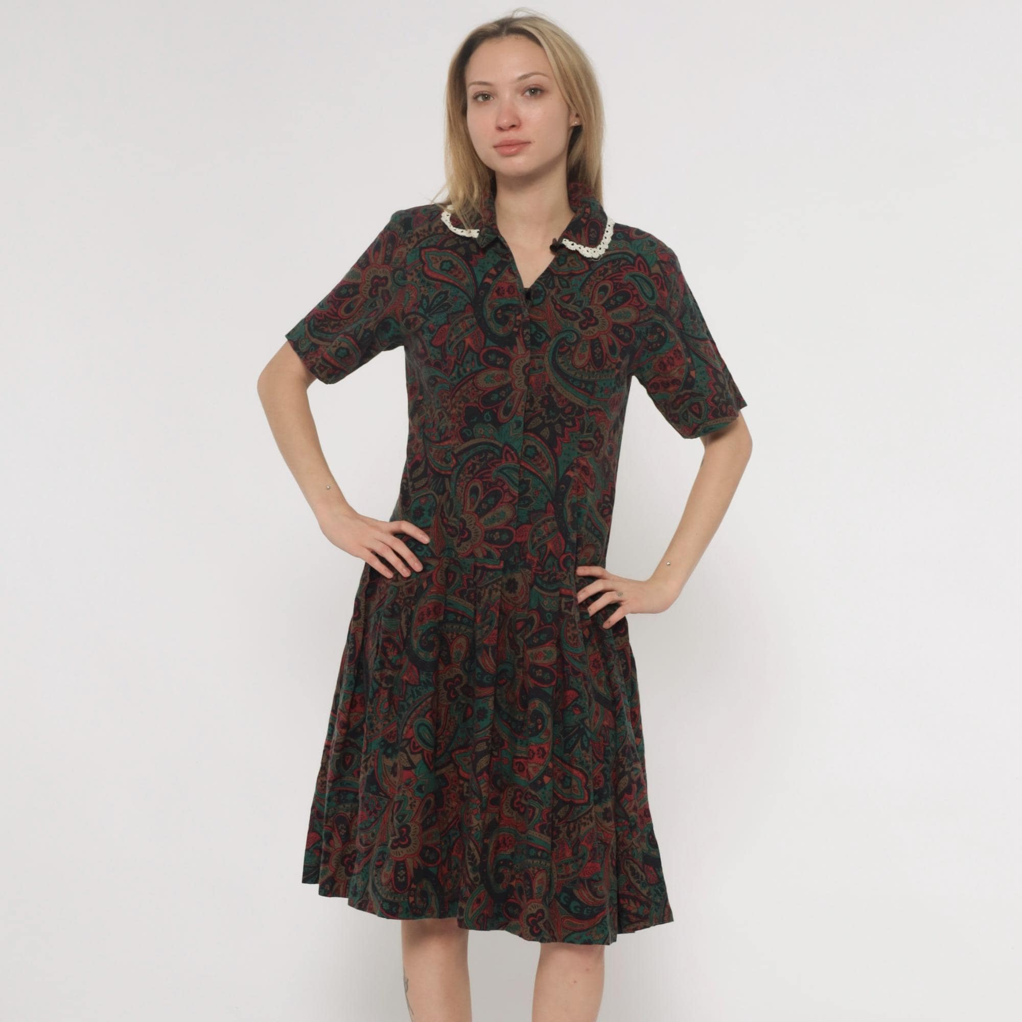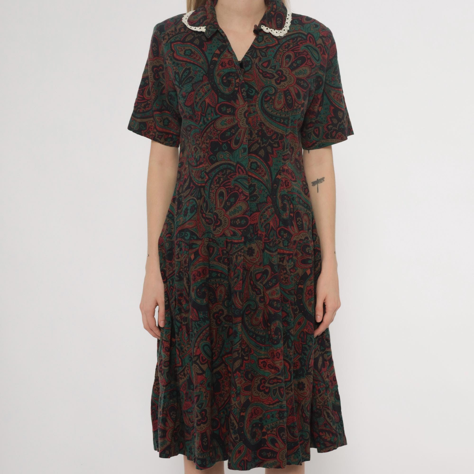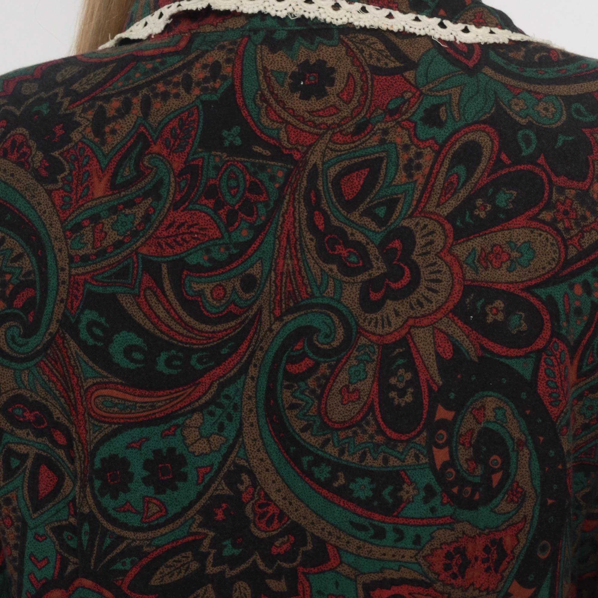 70s paisley dress in burgundy, green, and brown jewel tones. Collar neckline with white crochet trim and button front closure, short sleeves, A-line skirt. Side pockets.