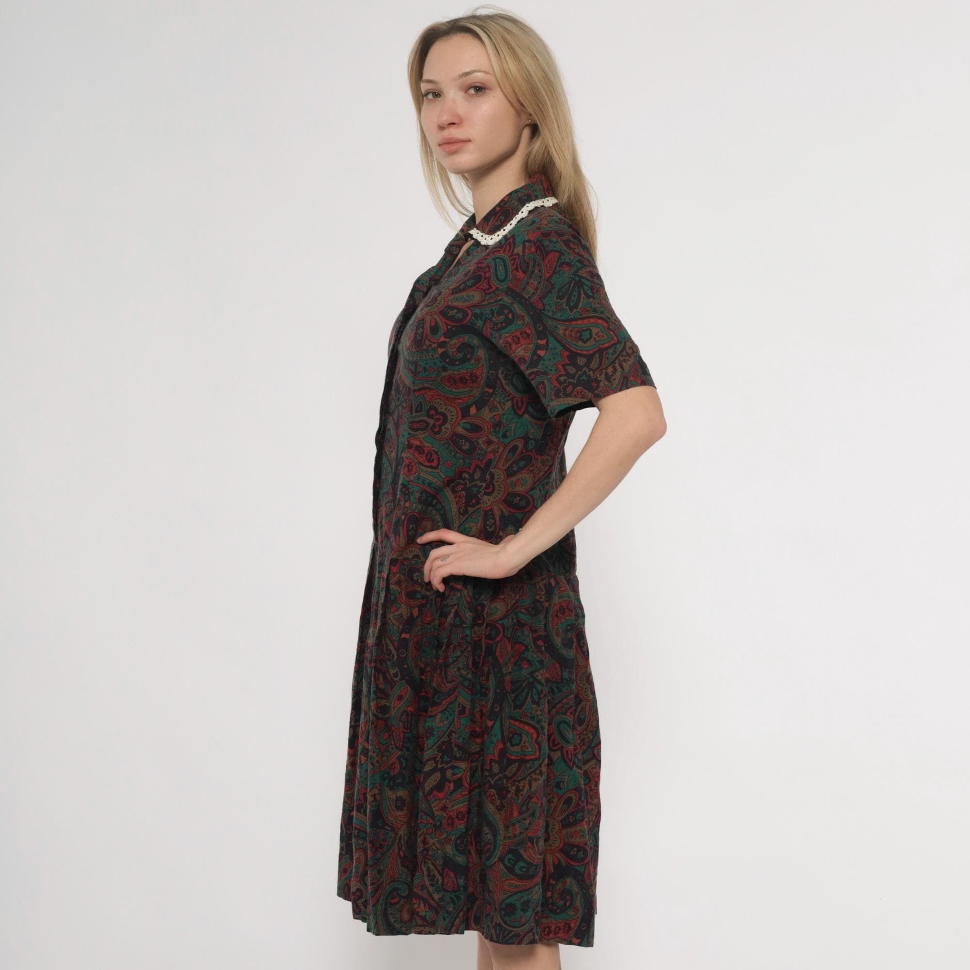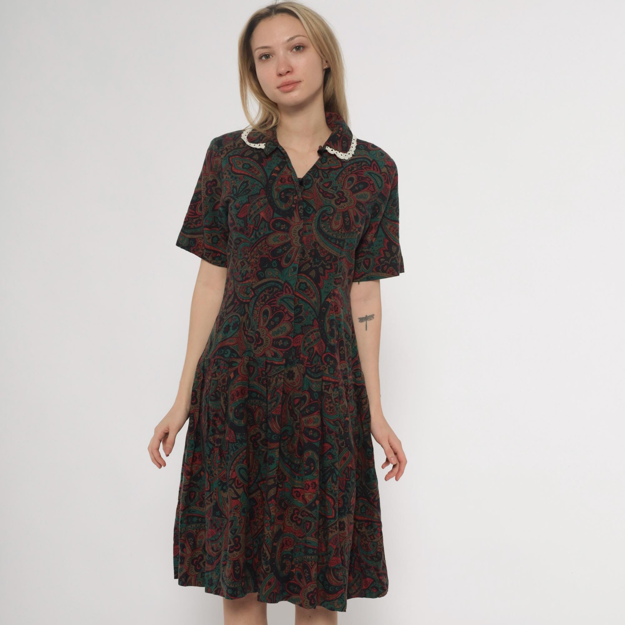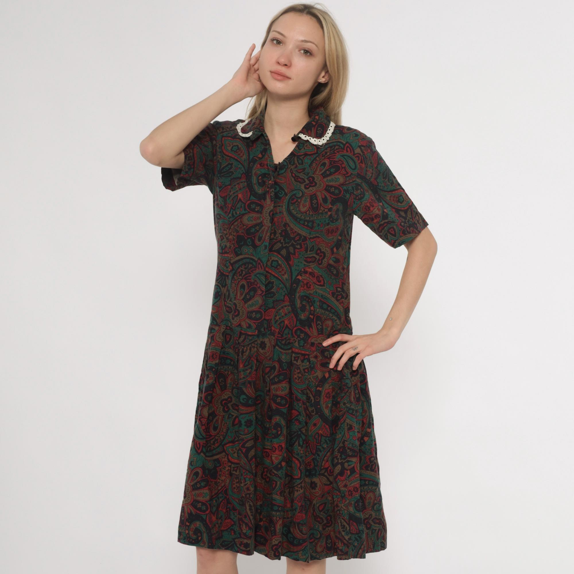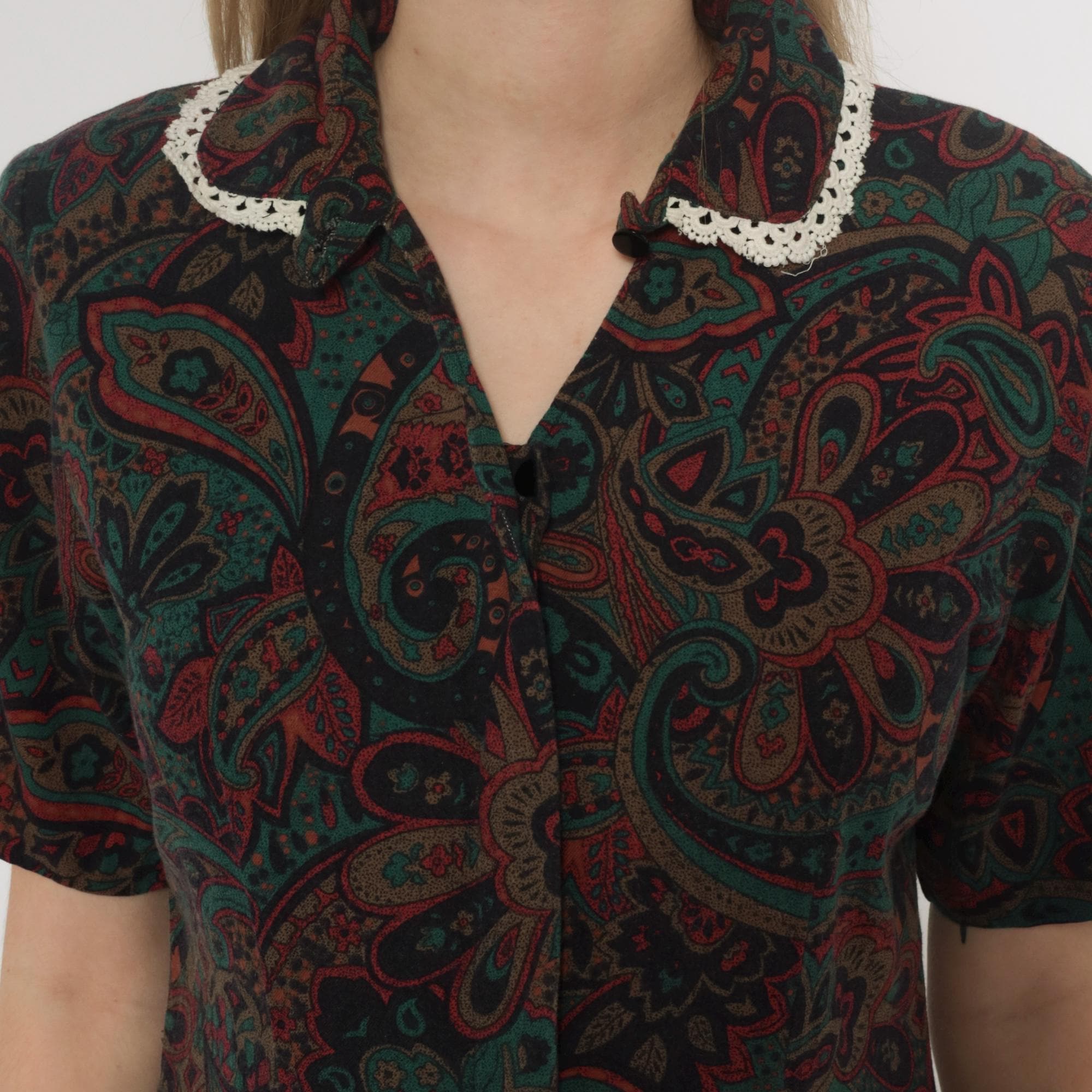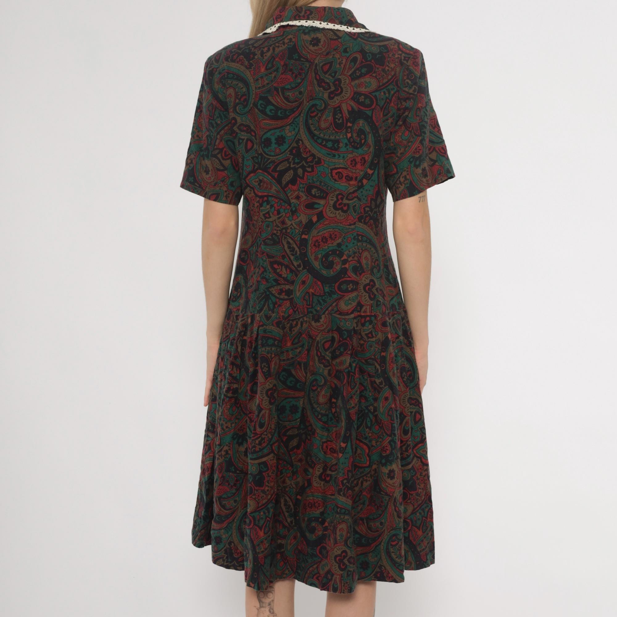 70s paisley dress in burgundy, green, and brown jewel tones. Collar neckline with white crochet trim and button front closure, short sleeves, A-line skirt. Side pockets.