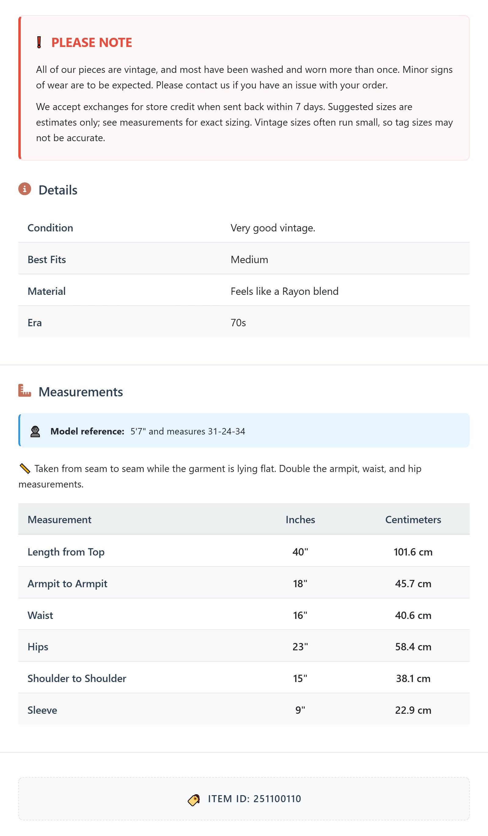 All of our pieces are vintage, and most have been washed and worn more than once. Minor signs of wear are to be expected. Please contact us if you have an issue with your order. We accept exchanges for store credit when sent back within 7 days.