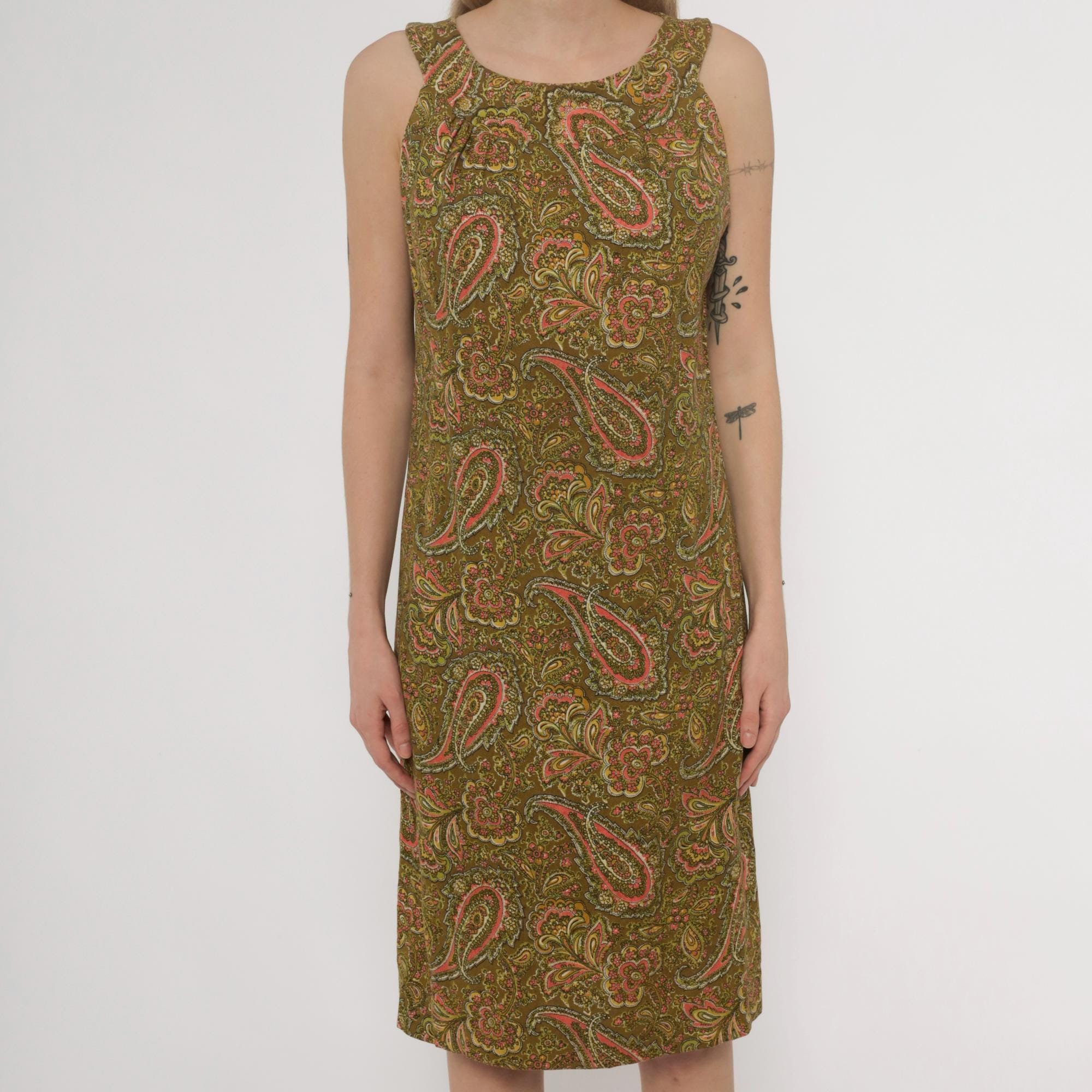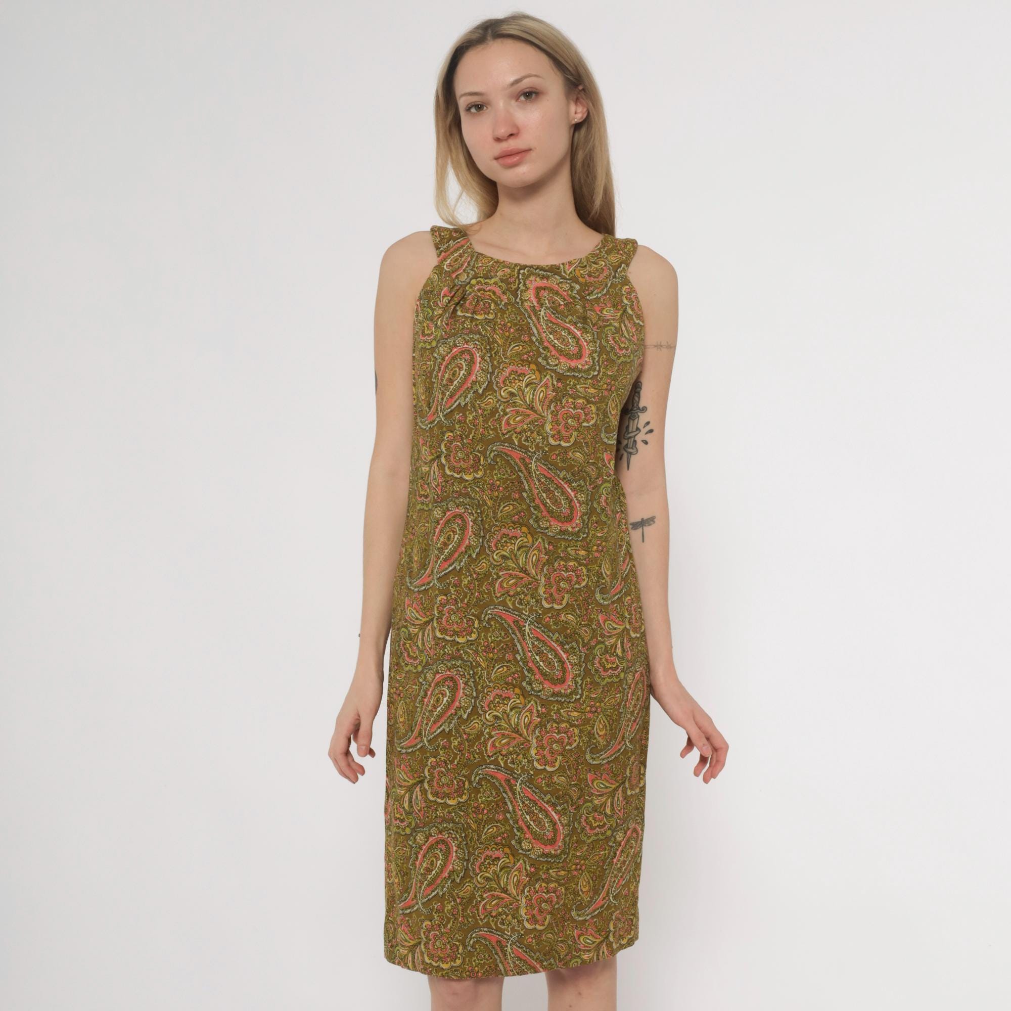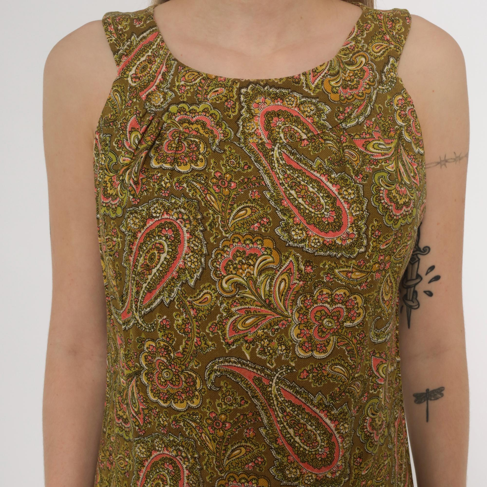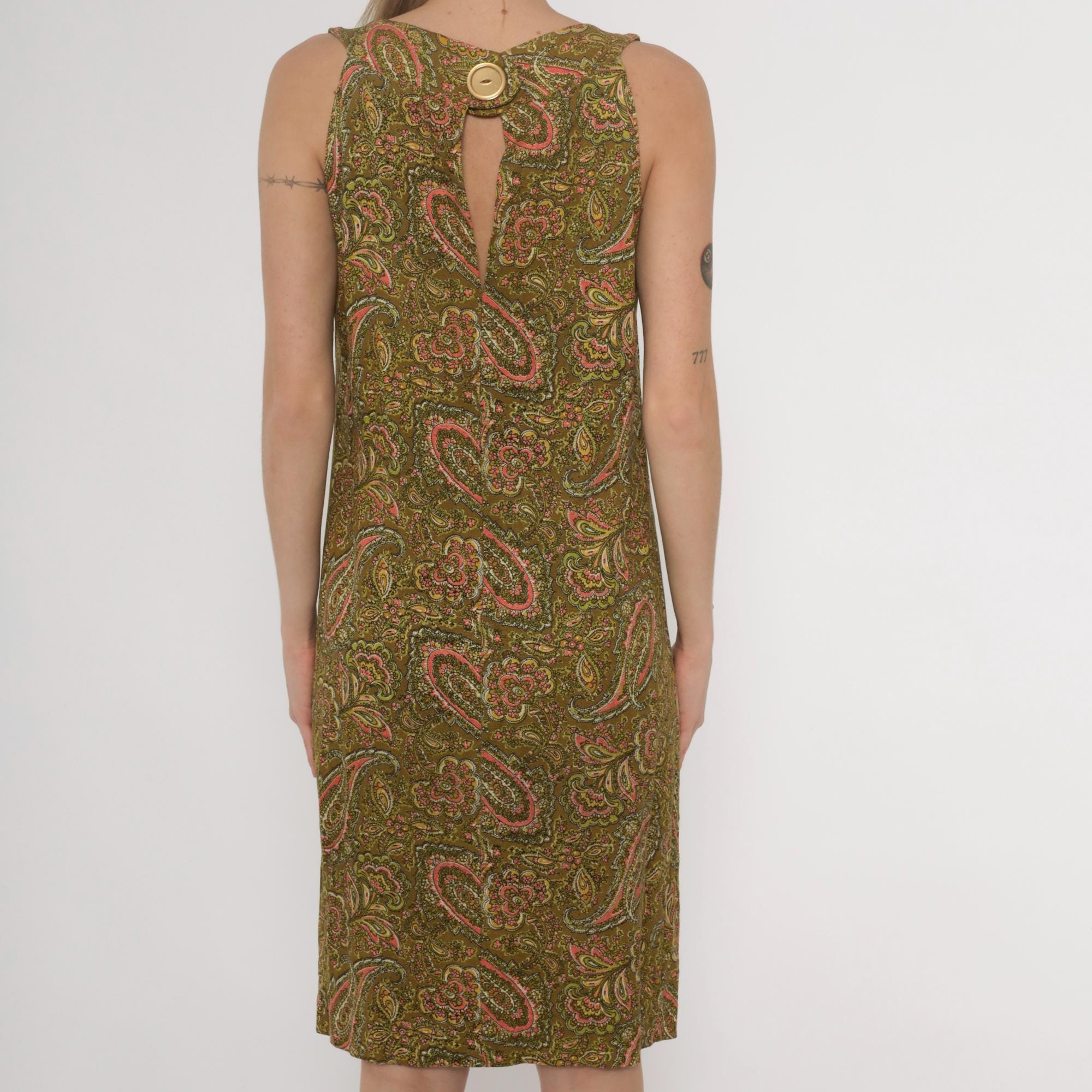 60s olive green paisley dress with rust, coral, and yellow swirl pattern throughout. Sleeveless shift silhouette with round neckline and back keyhole detail with button closure at neck. Straight cut with side seam zipper, knee-length.