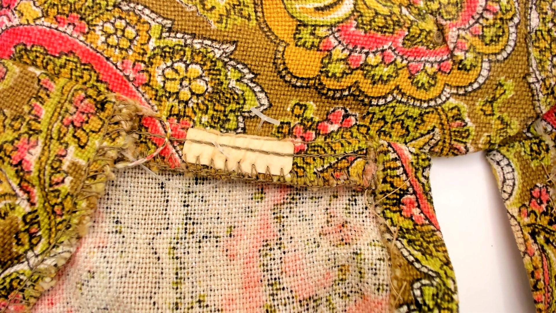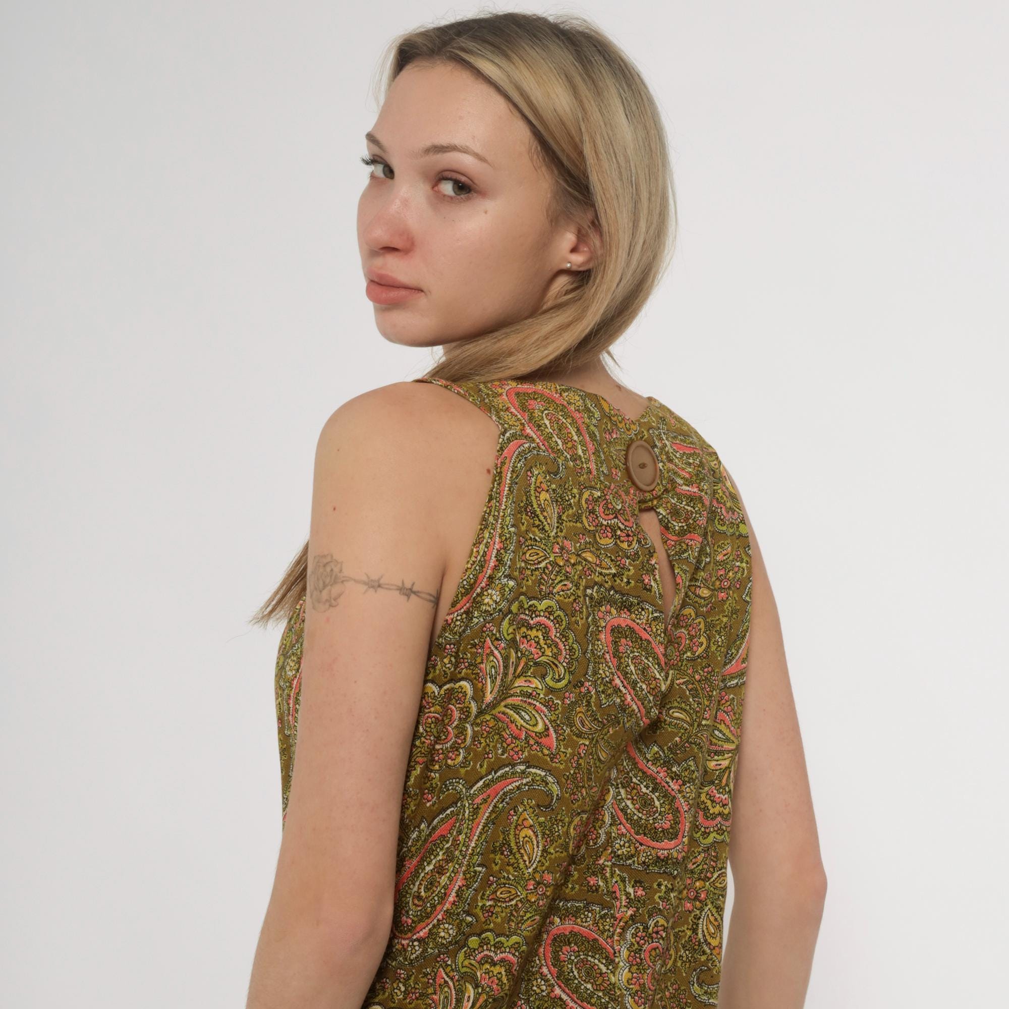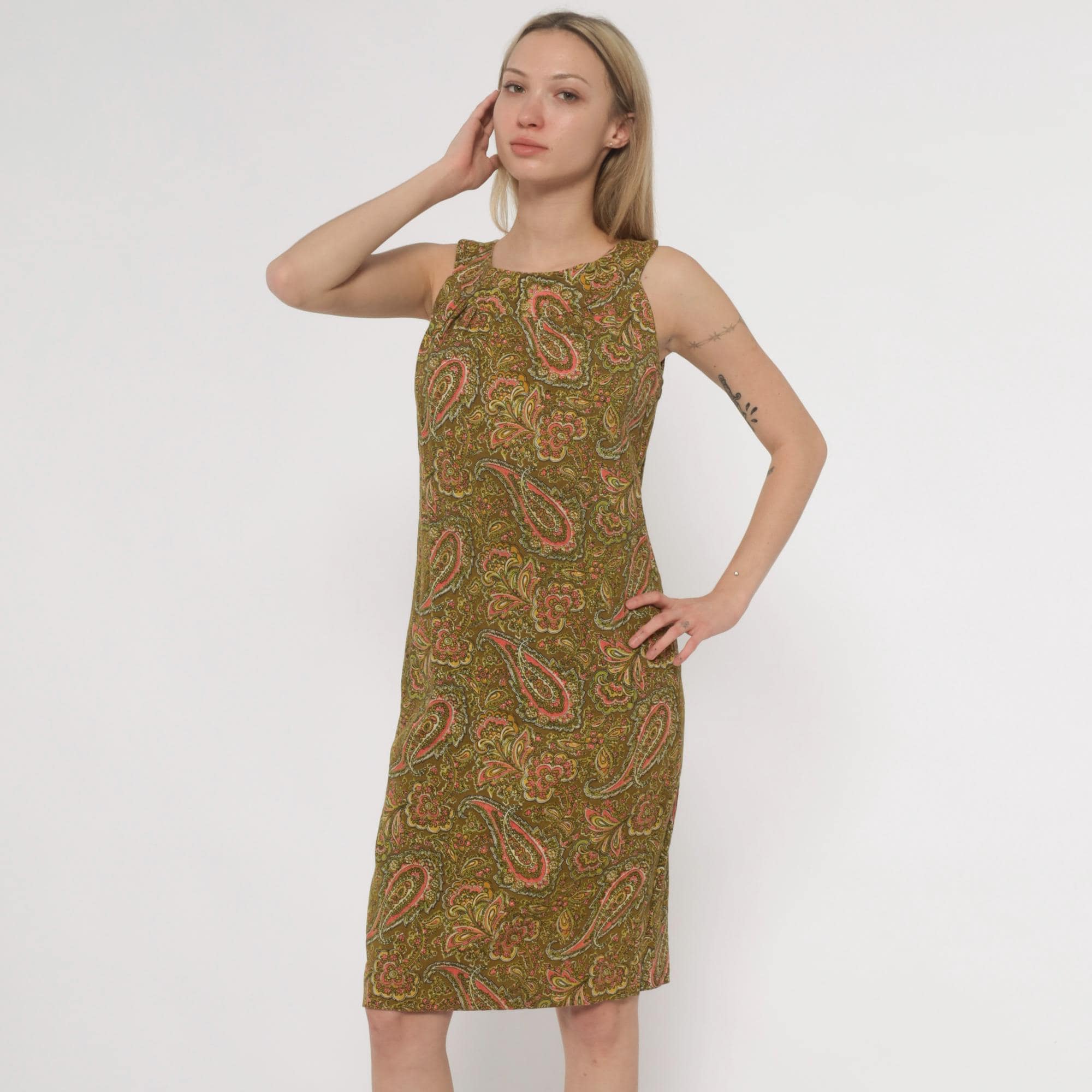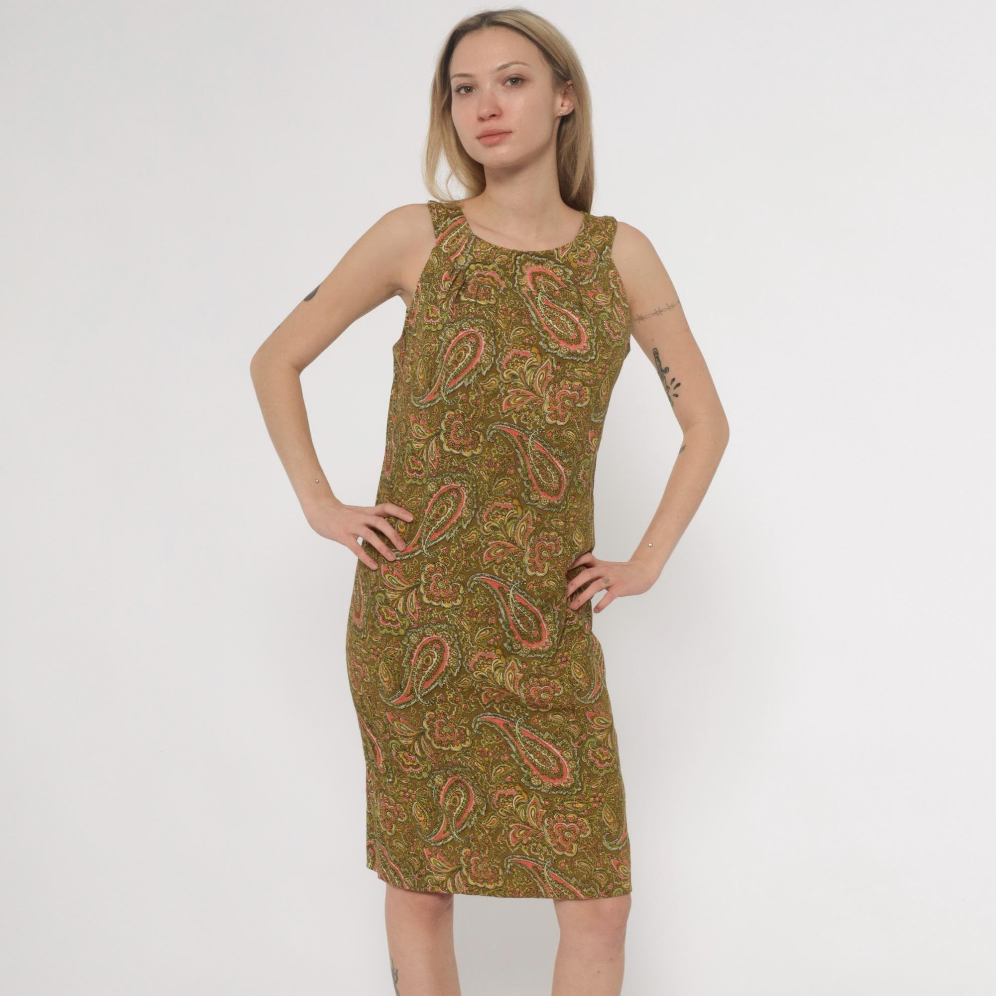 60s olive green paisley dress with rust, coral, and yellow swirl pattern throughout. Sleeveless shift silhouette with round neckline and back keyhole detail with button closure at neck. Straight cut with side seam zipper, knee-length.