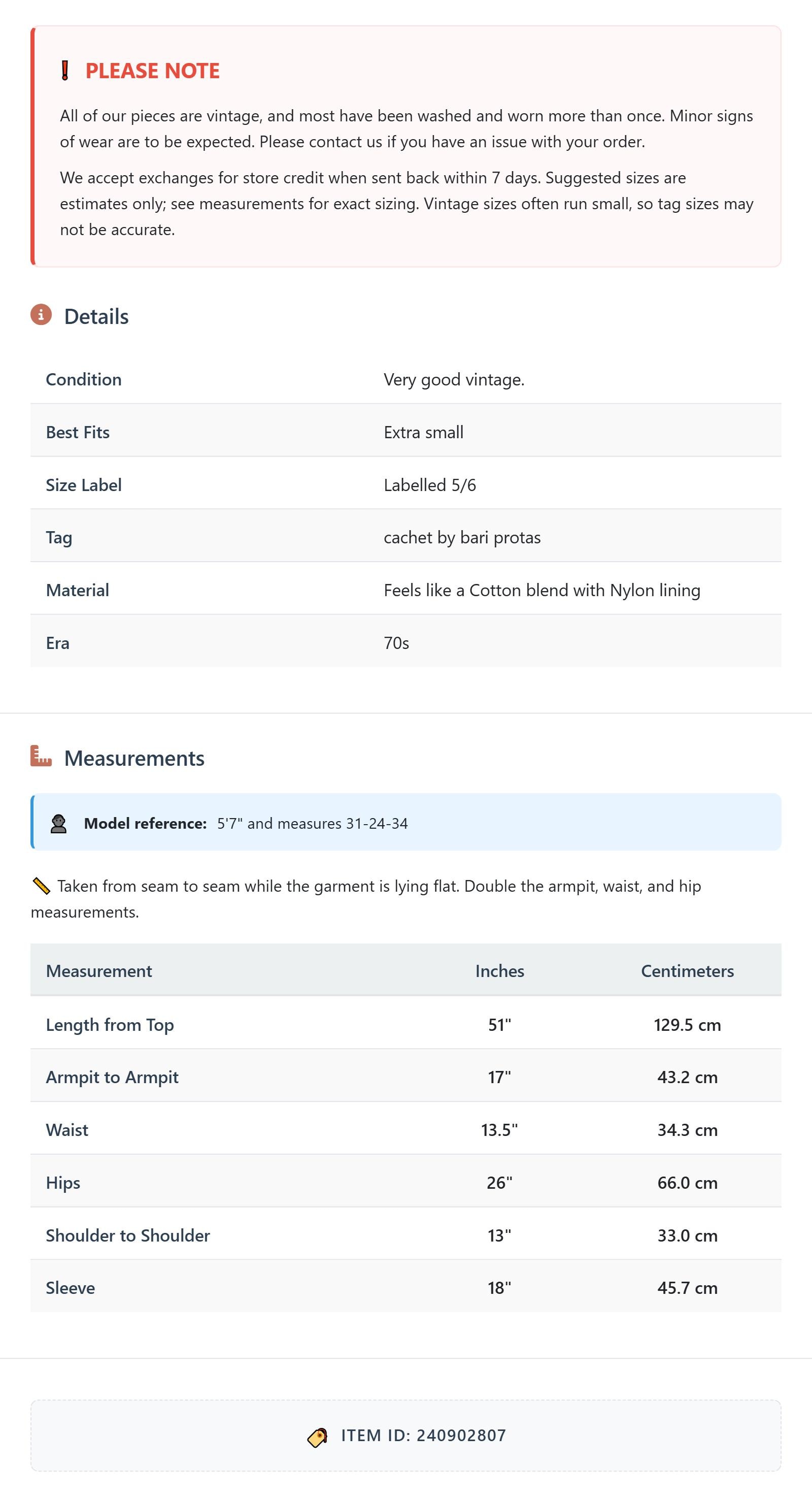 All of our pieces are vintage, and most have been washed and worn more than once. Minor signs of wear are to be expected. Please contact us if you have an issue with your order. We accept exchanges for store credit when sent back within 7 days.