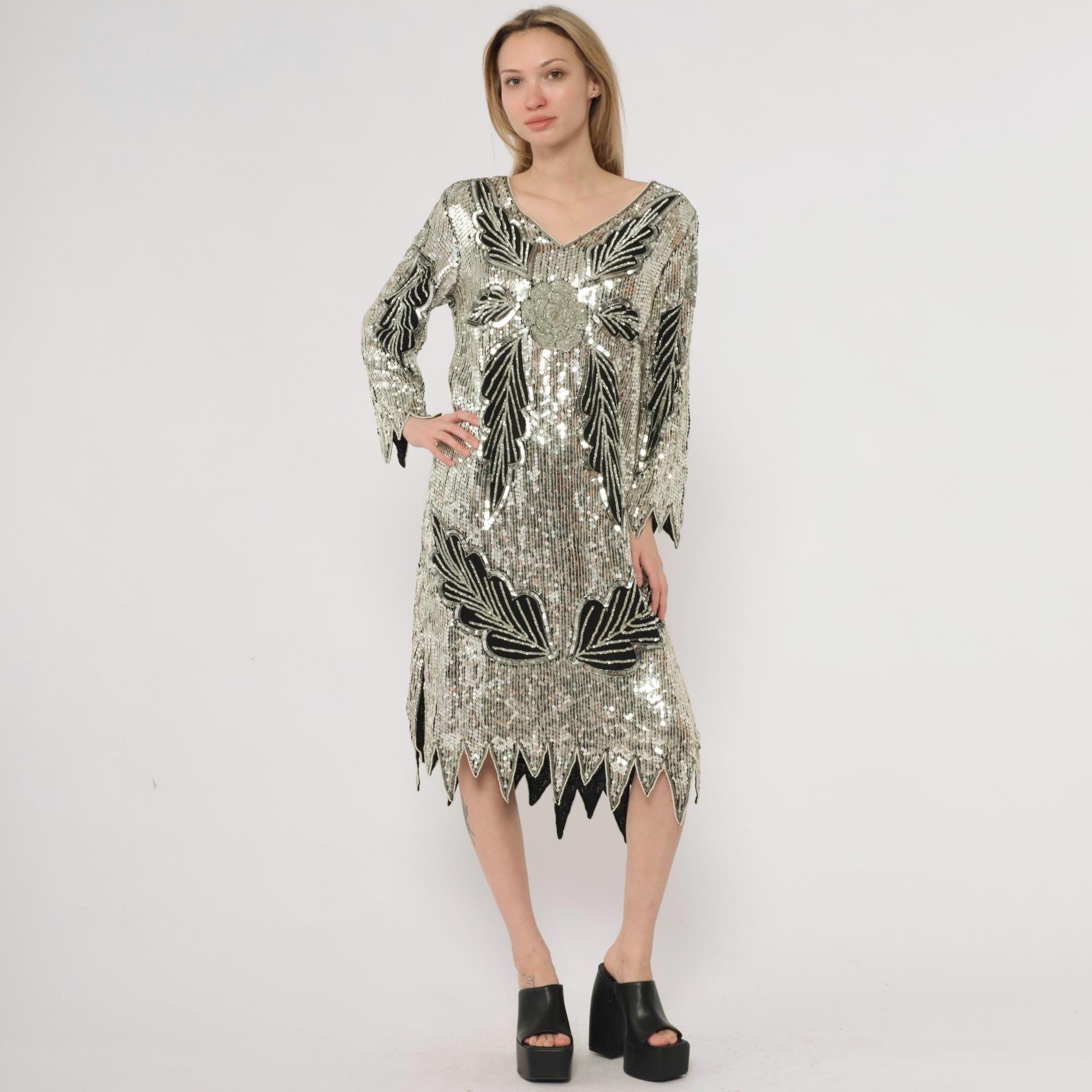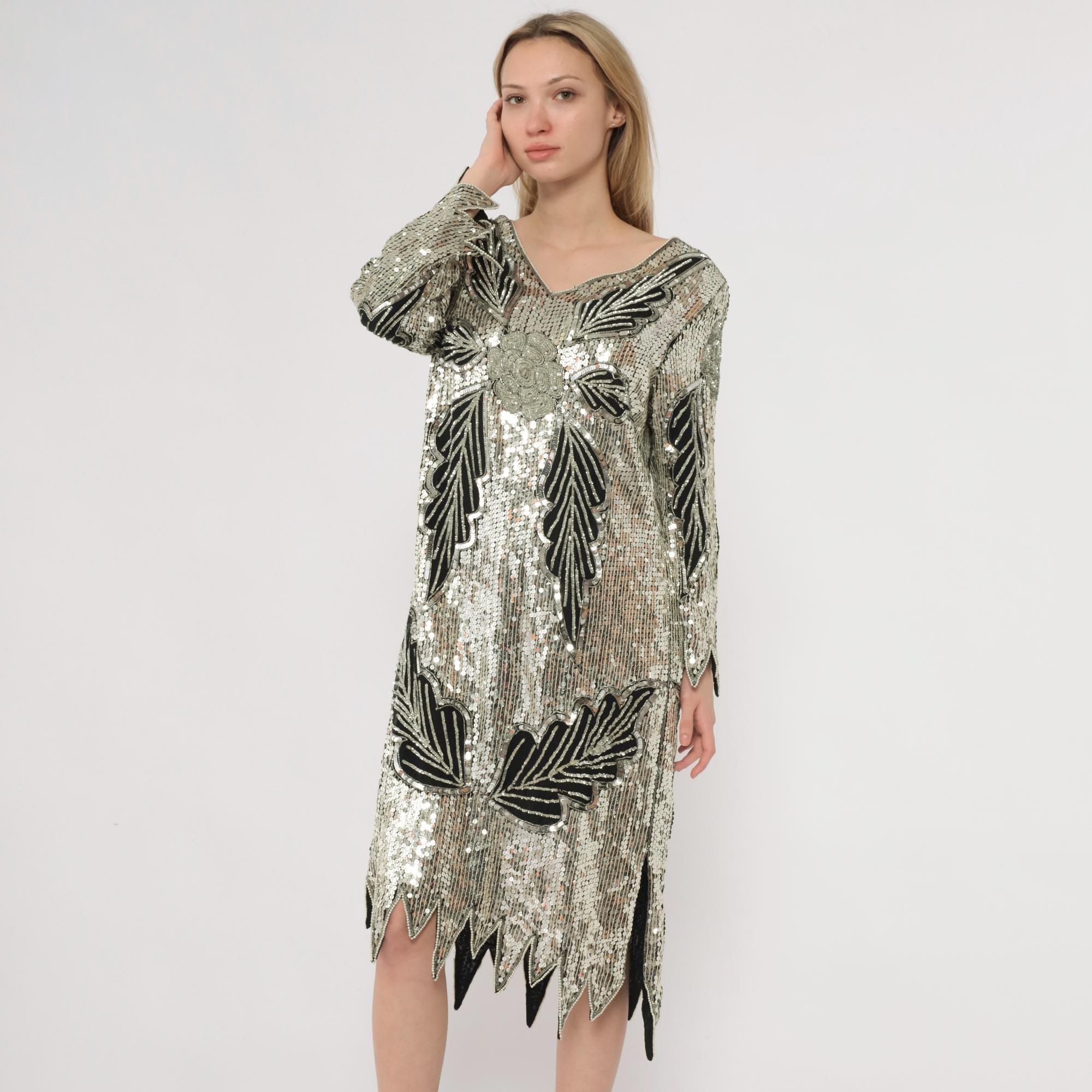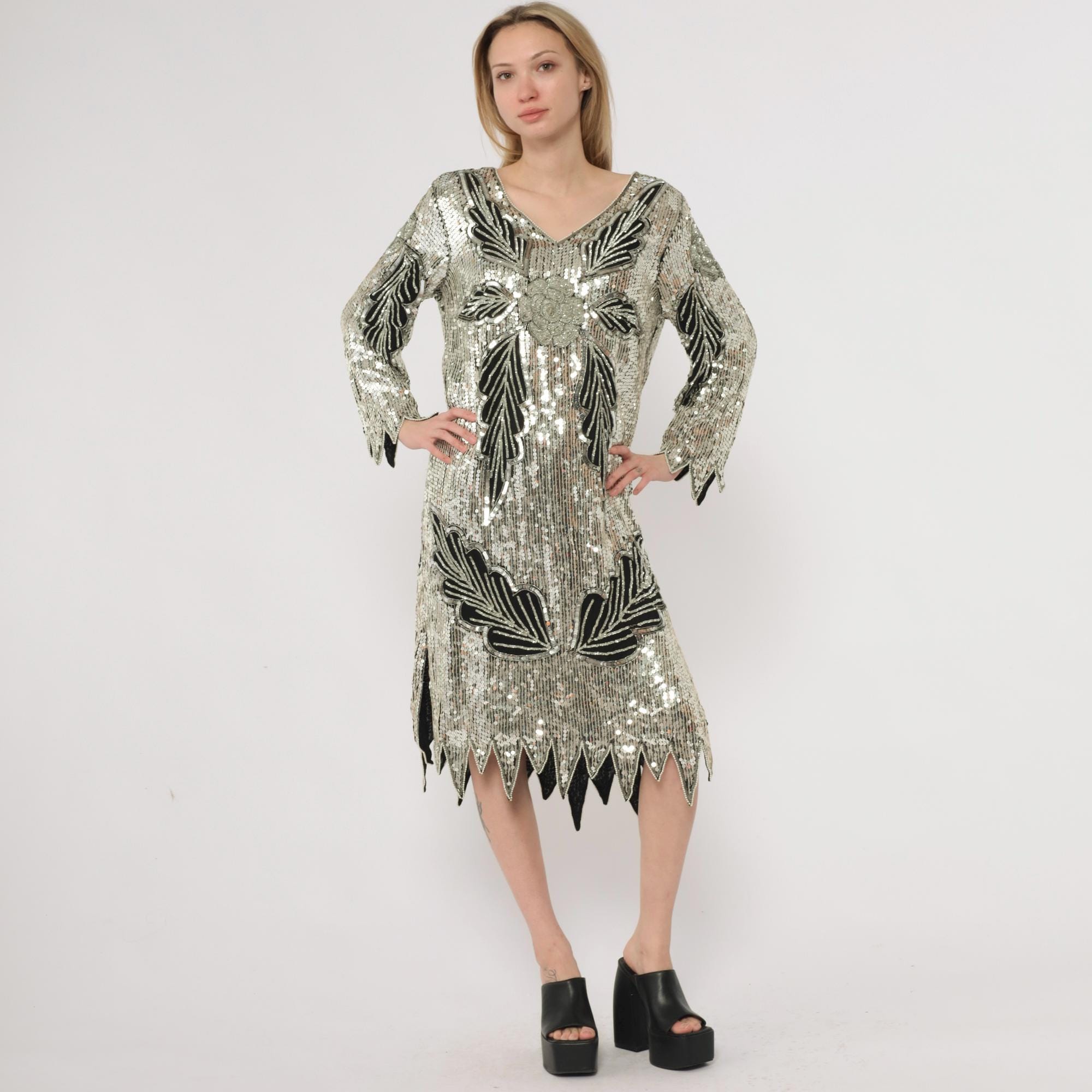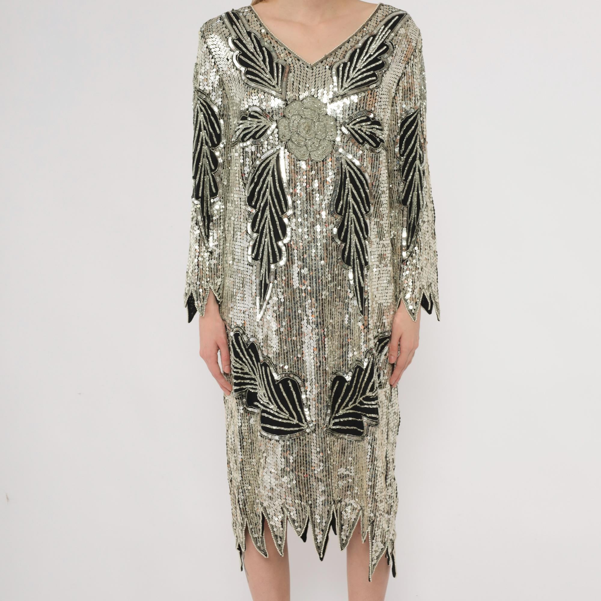90s silver and black sequined midi dress in silk. Art deco-inspired geometric leaf pattern with vertical sequined lines throughout. Long sleeves with pointed scalloped hem detail, V-neckline, straight silhouette.
