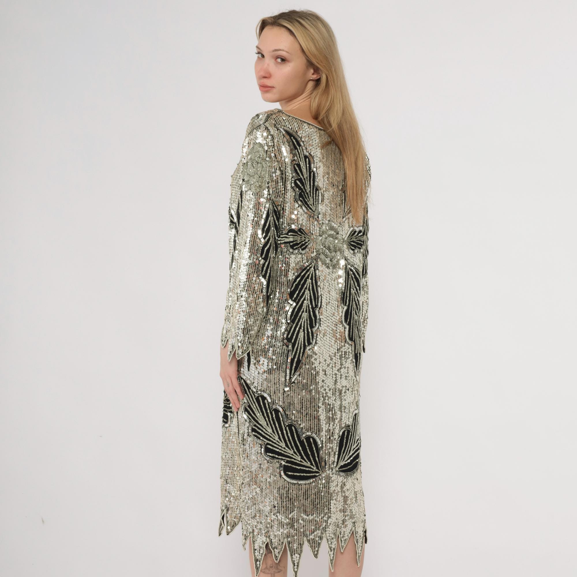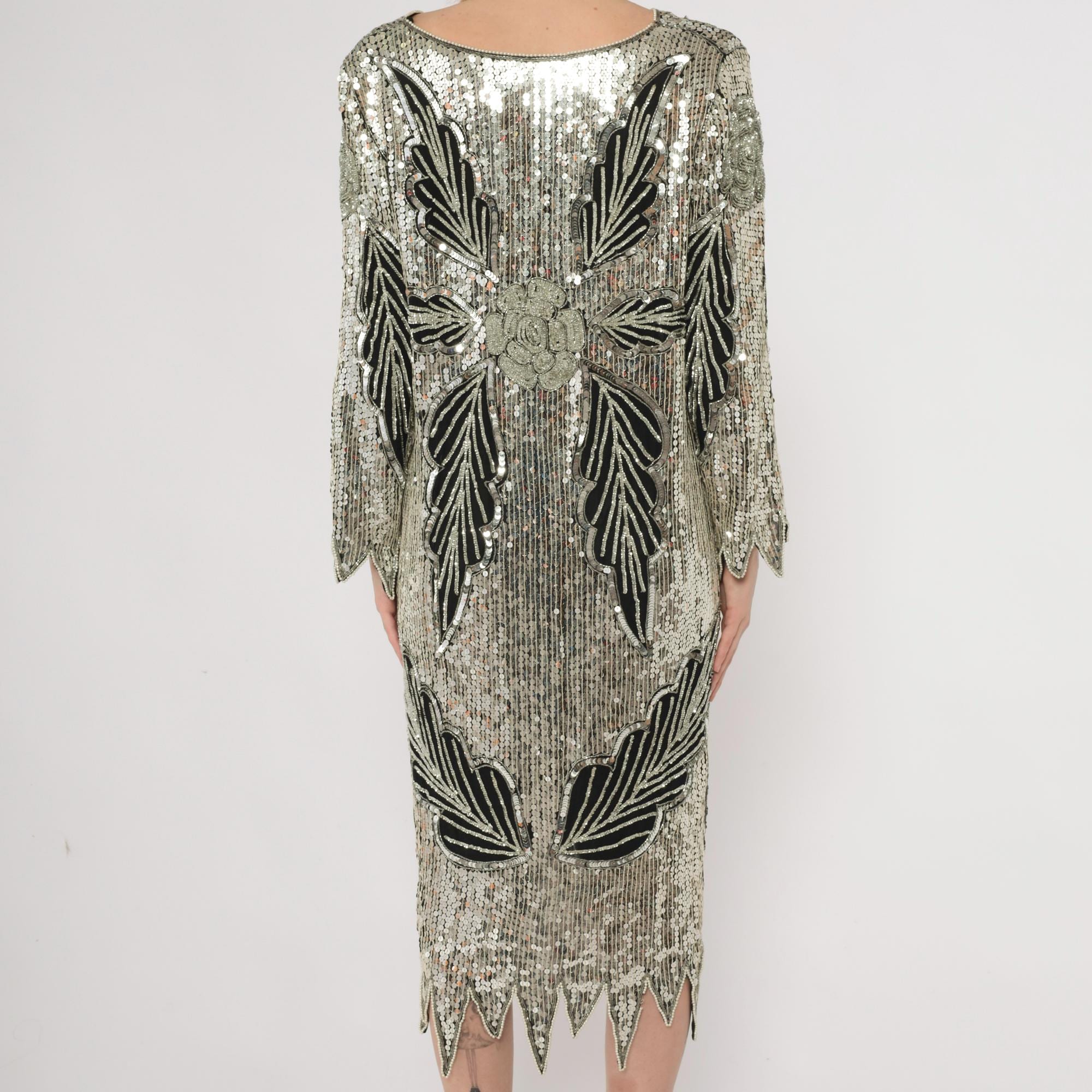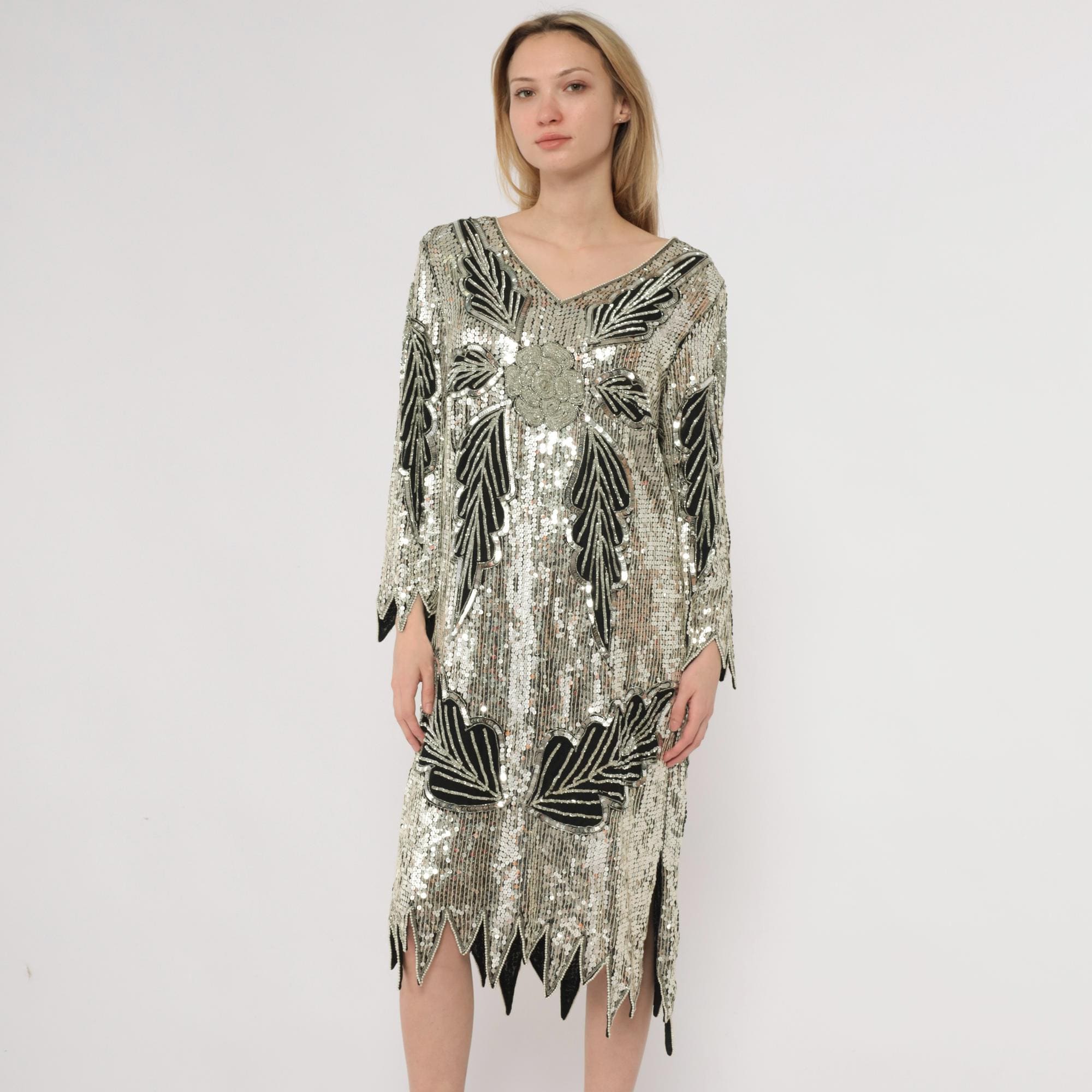90s silver and black sequined midi dress in silk. Art deco-inspired geometric leaf pattern with vertical sequined lines throughout. Long sleeves with pointed scalloped hem detail, V-neckline, straight silhouette.