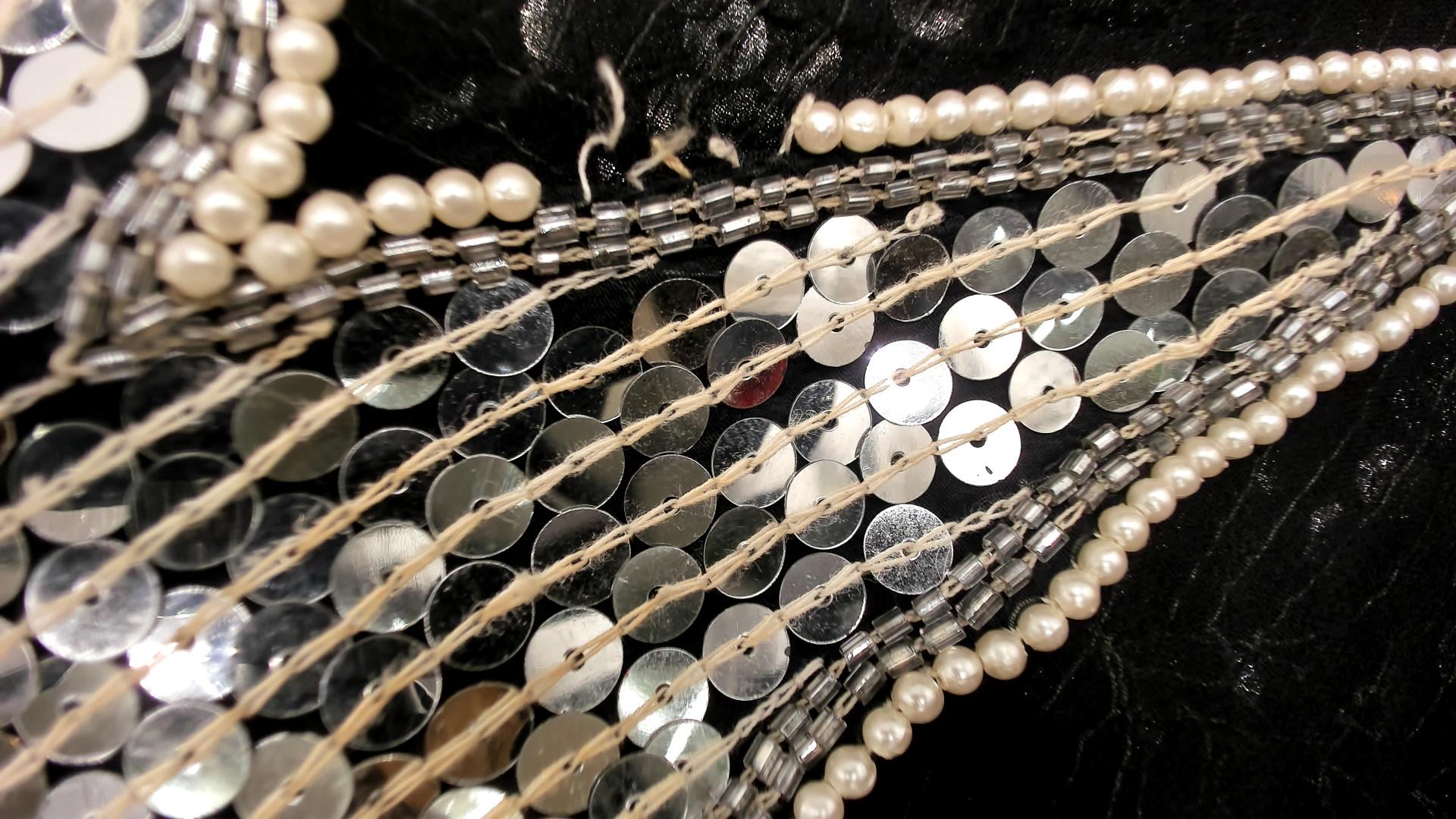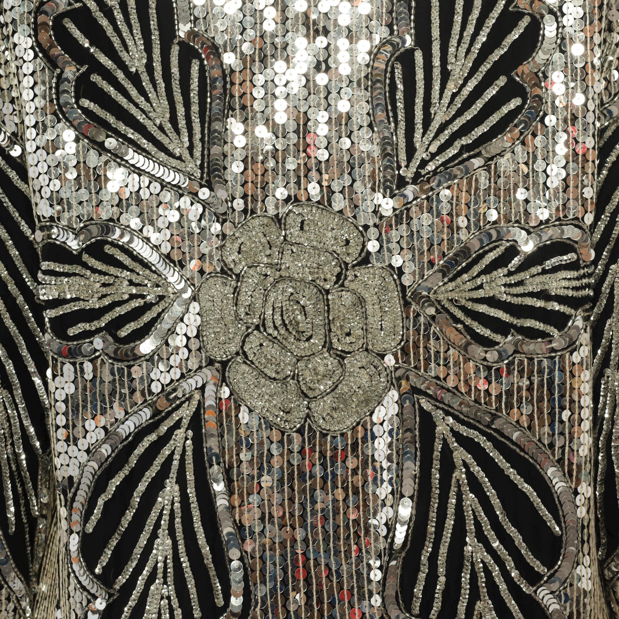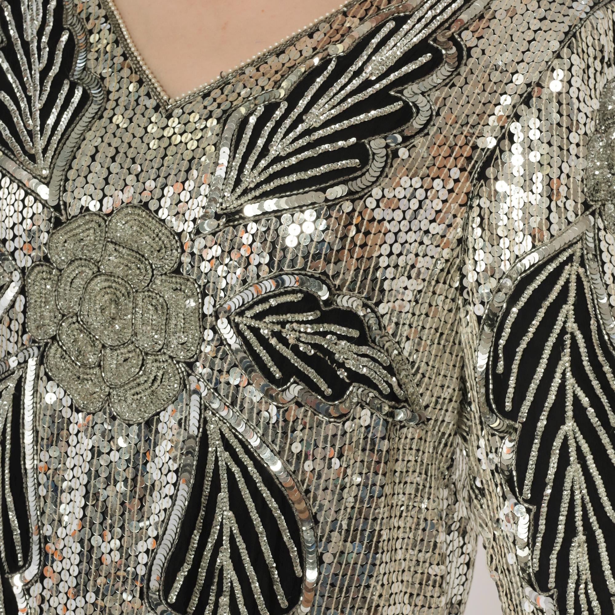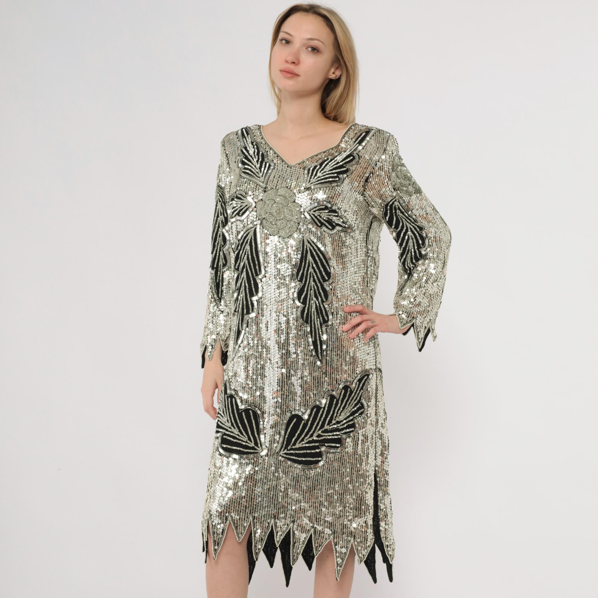 90s silver and black sequined midi dress in silk. Art deco-inspired geometric leaf pattern with vertical sequined lines throughout. Long sleeves with pointed scalloped hem detail, V-neckline, straight silhouette.