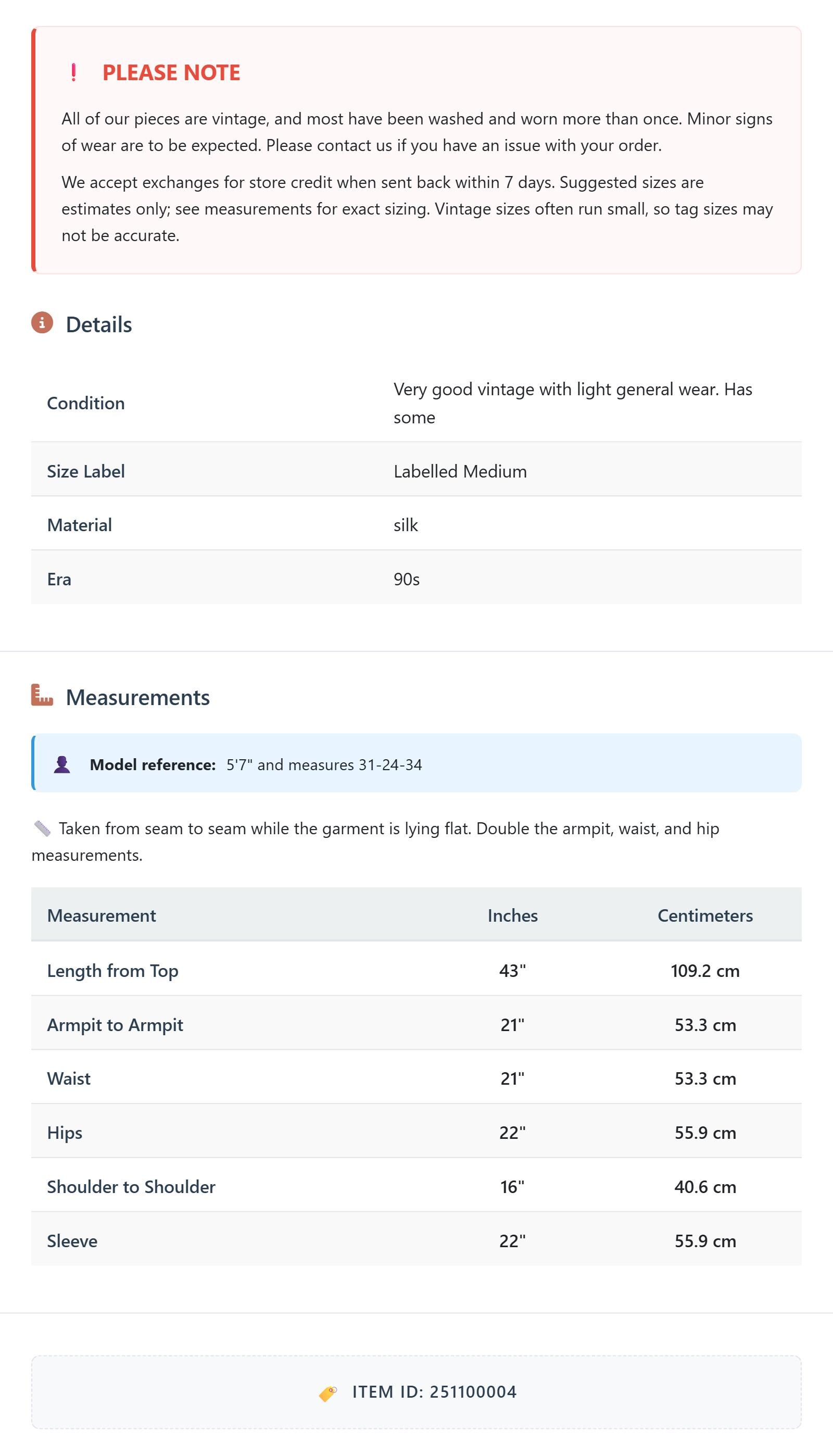 All of our pieces are vintage, and most have been washed and worn more than once. Minor signs of wear are to be expected. Please contact us if you have an issue with your order. We accept exchanges for store credit when sent back within 7 days.
