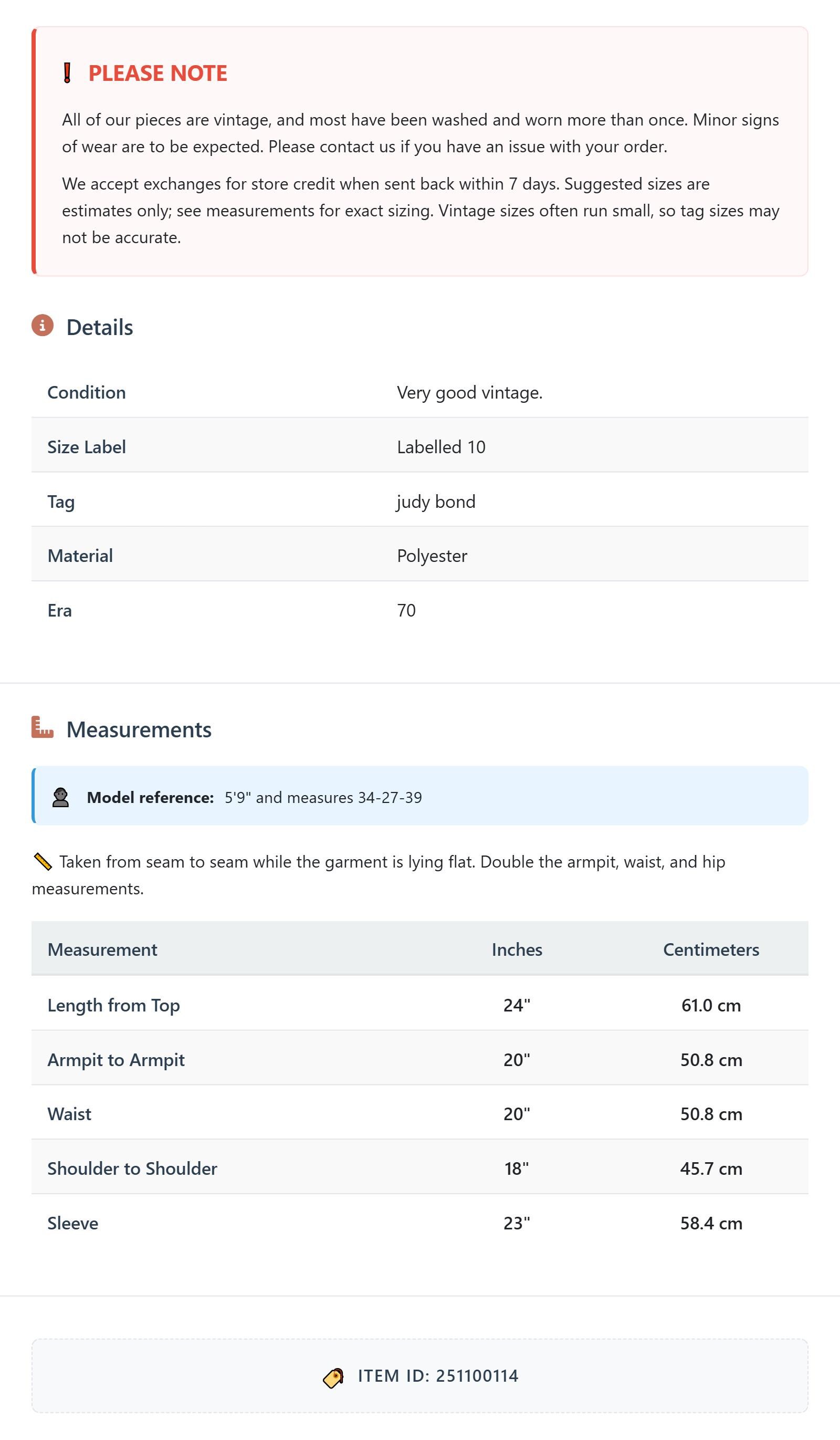 Suggested sizes are estimates only; see measurements for exact sizing. Vintage sizes often run small, so tag sizes may not be accurate.