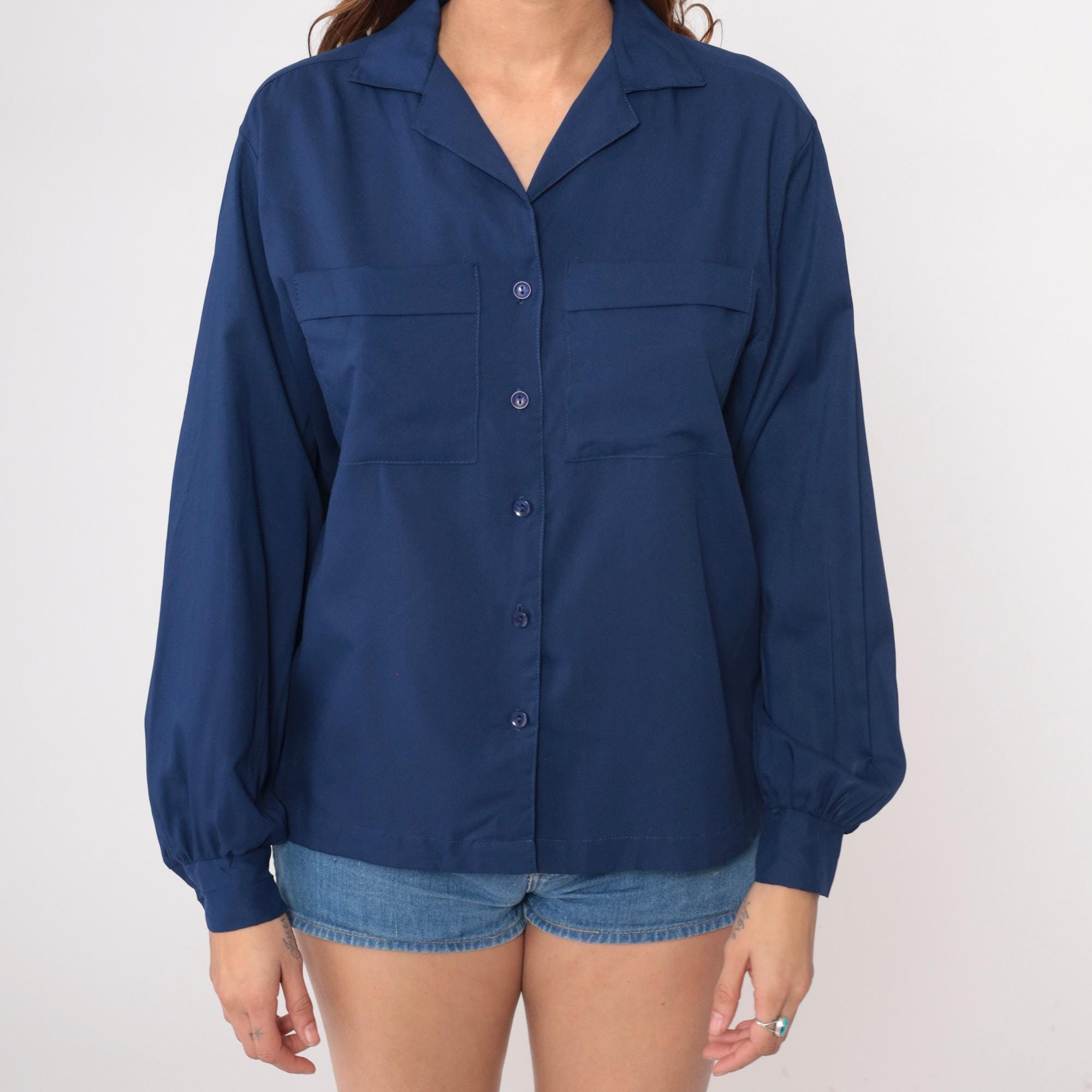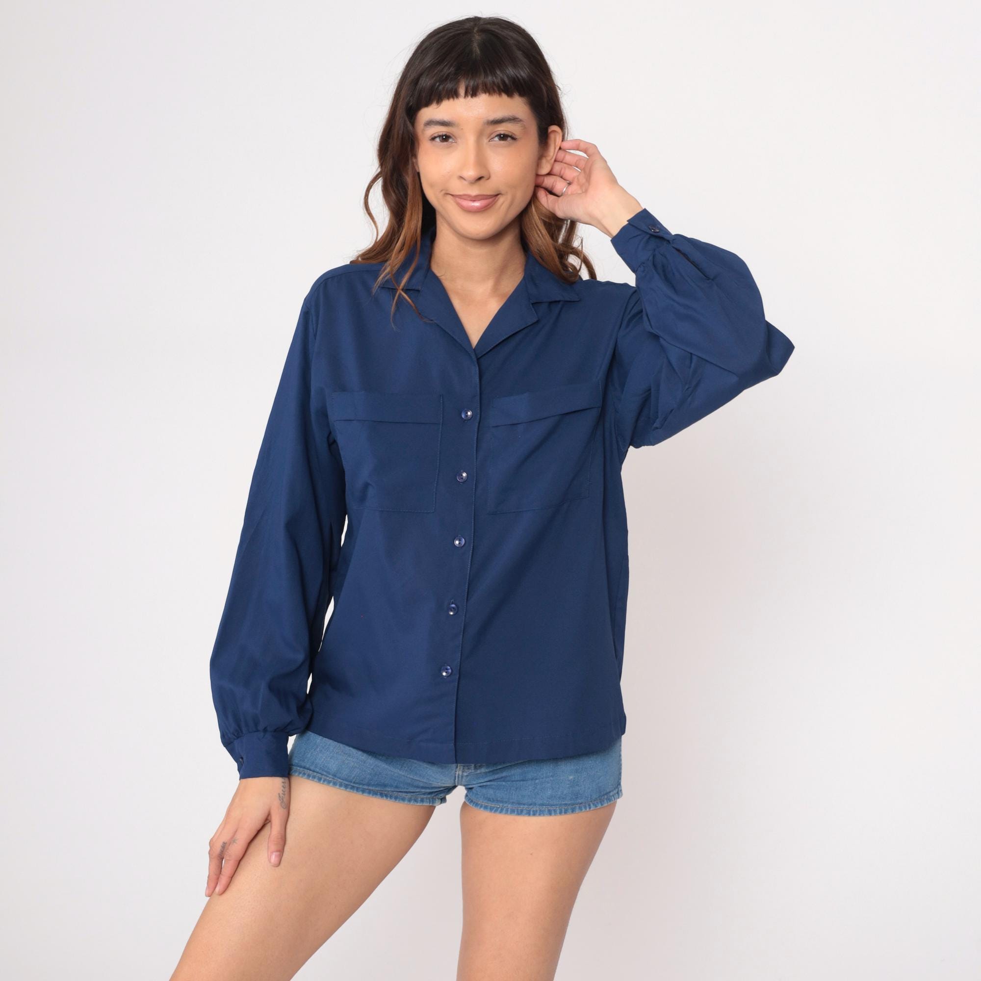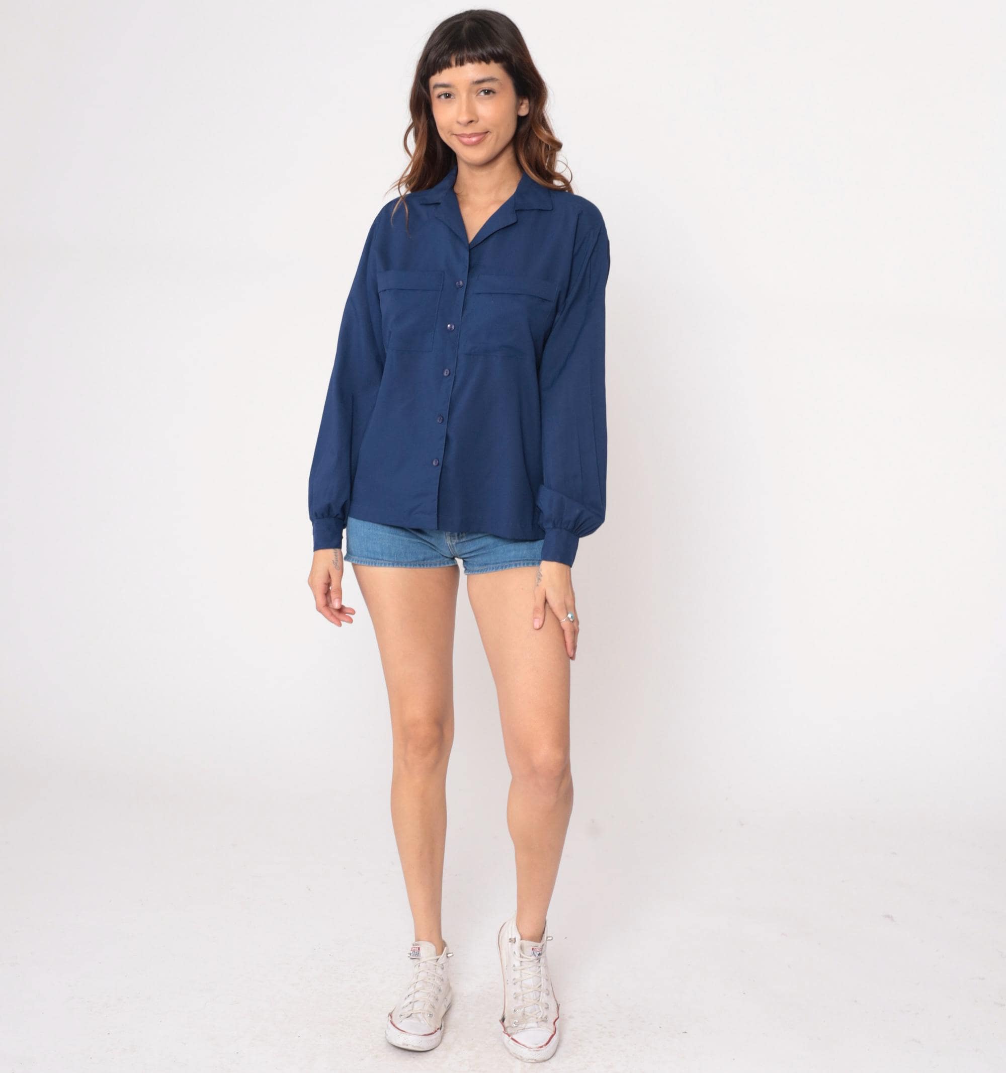 70s navy blue button-up shirt from Judy Bond with notched collar and long sleeves with button cuffs. Two chest patch pockets and full button front closure. Relaxed, boxy fit with clean lines.