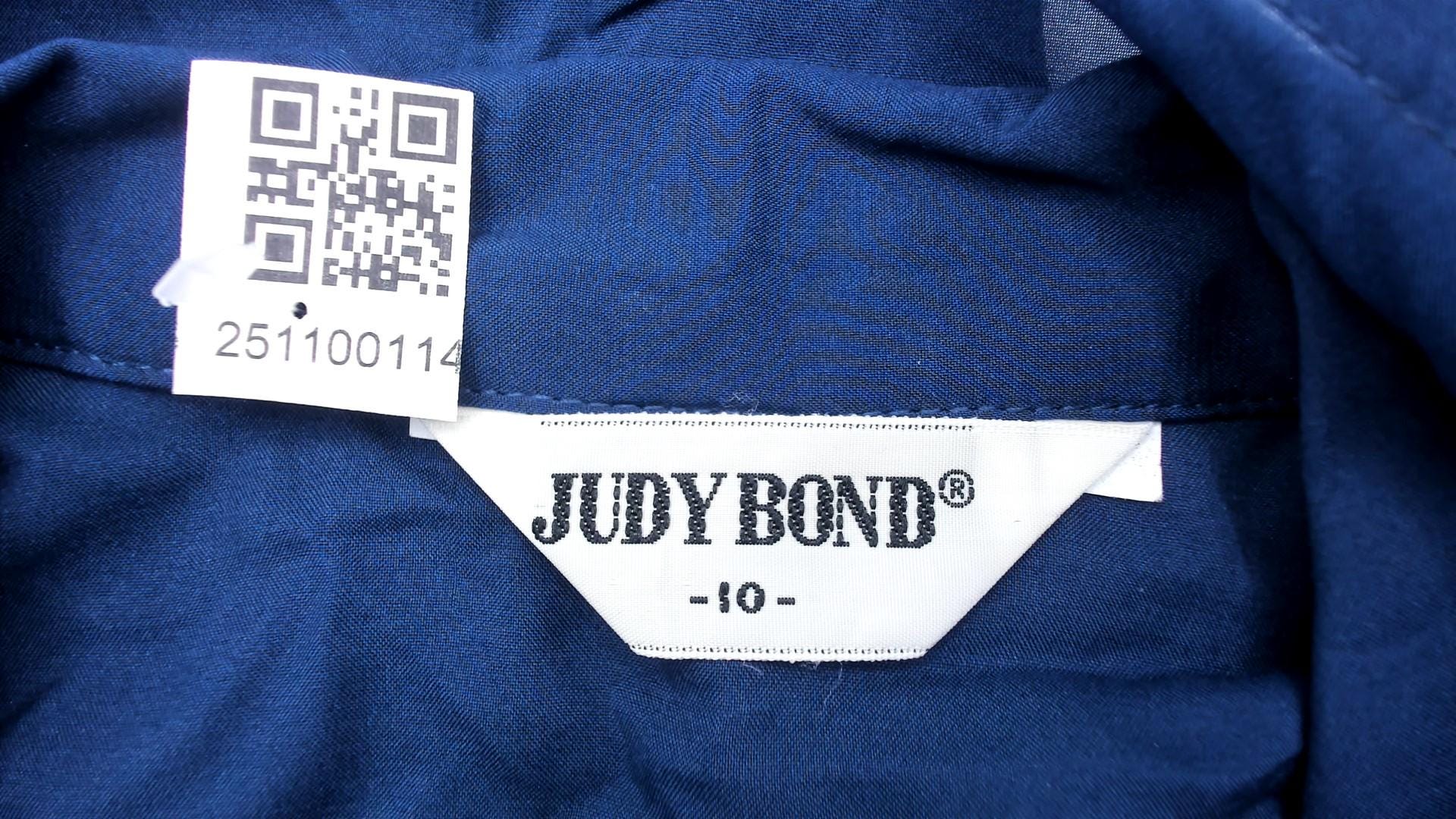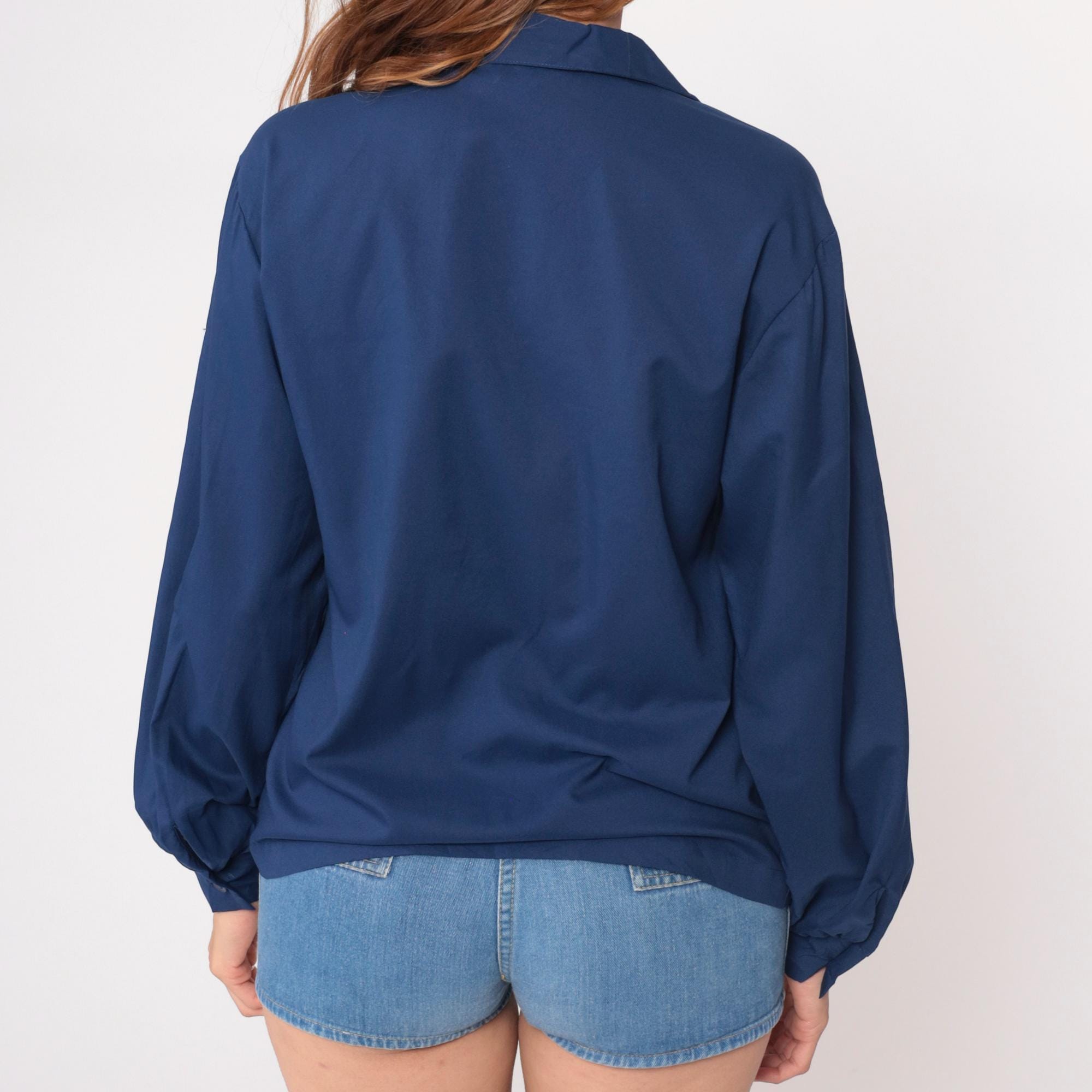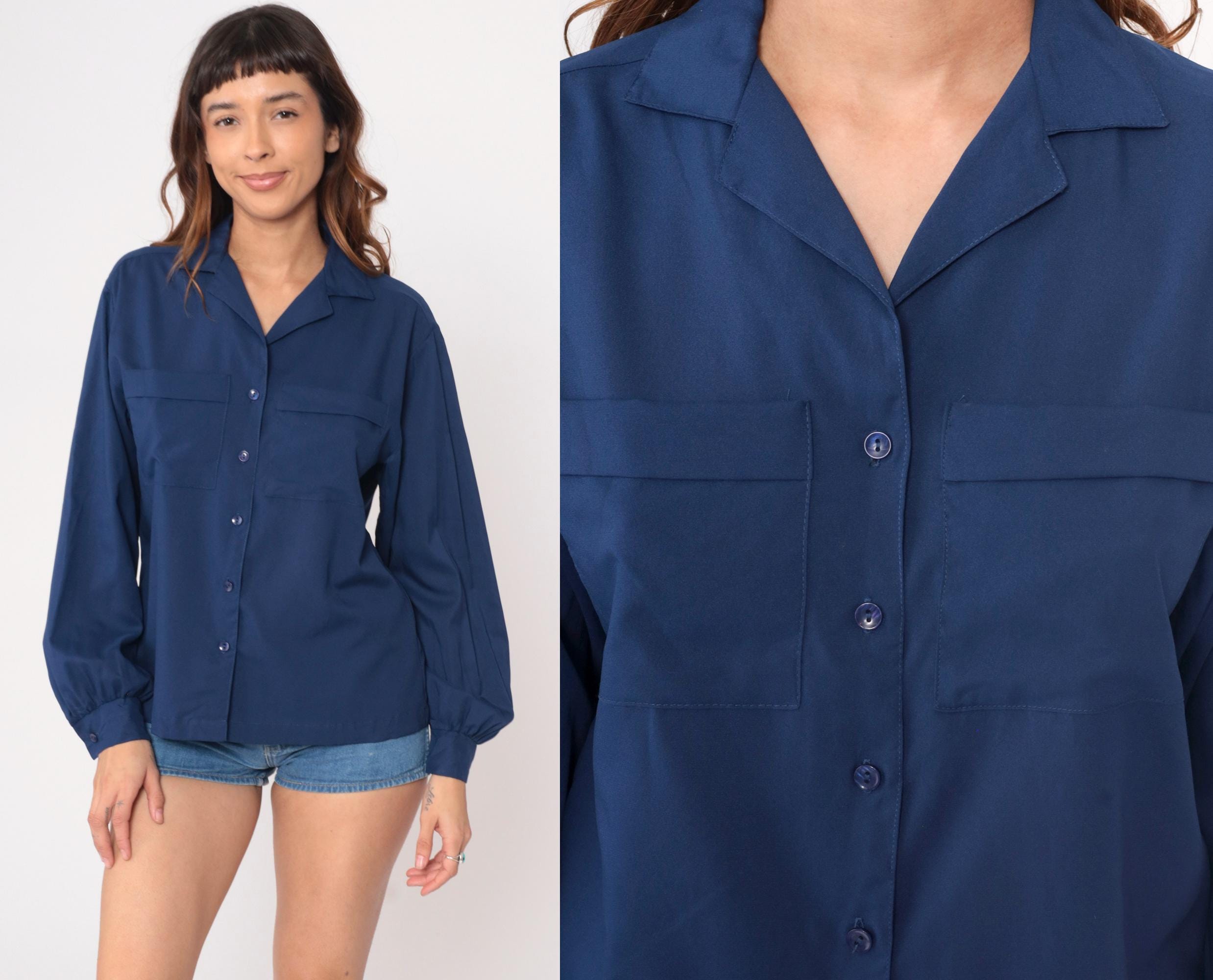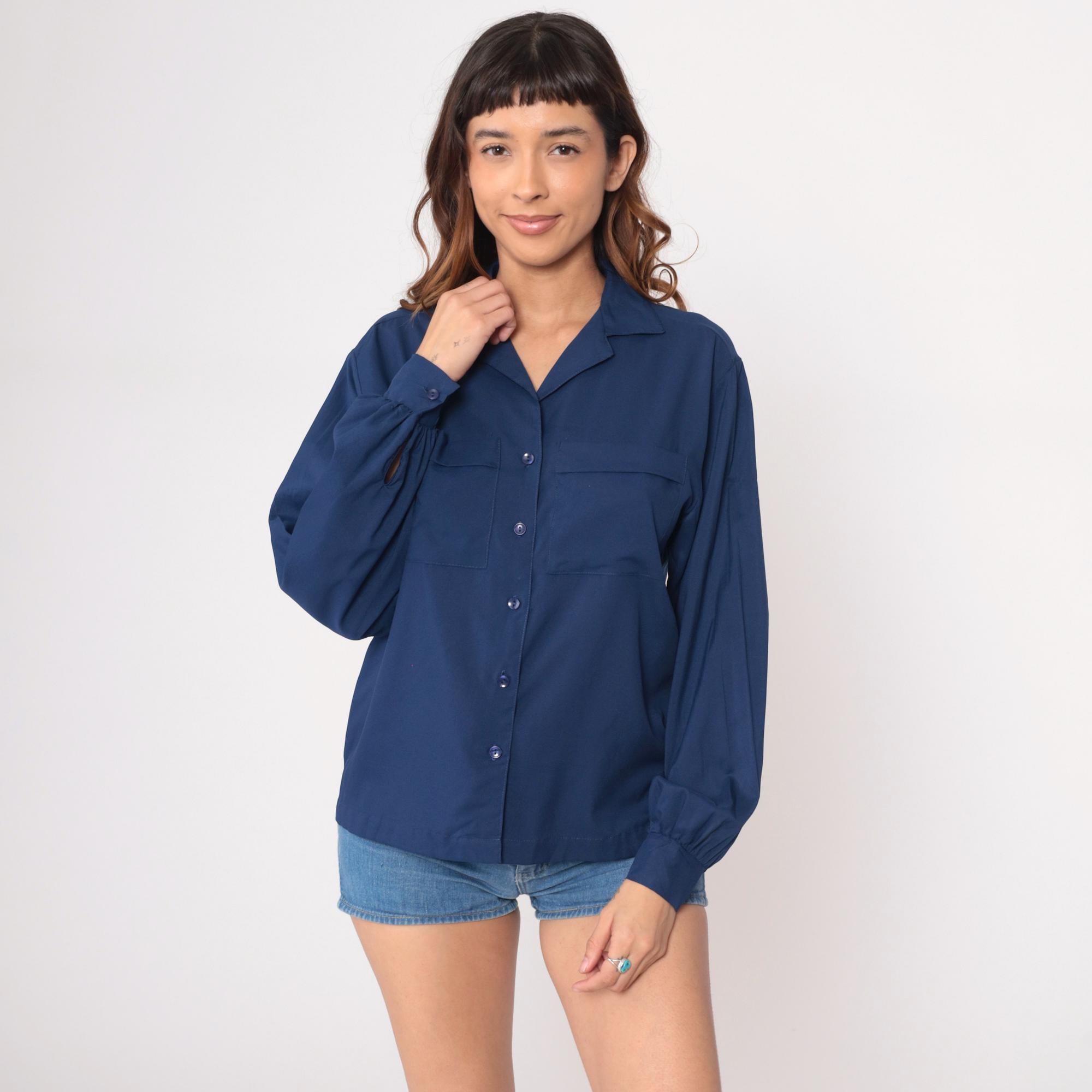 70s navy blue button-up shirt from Judy Bond with notched collar and long sleeves with button cuffs. Two chest patch pockets and full button front closure. Relaxed, boxy fit with clean lines.