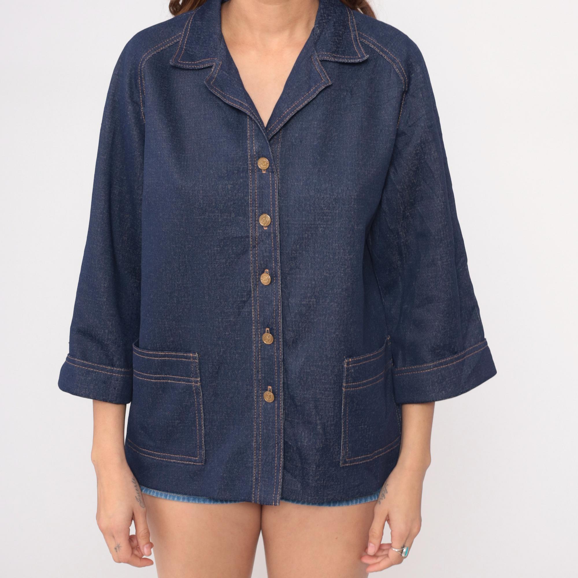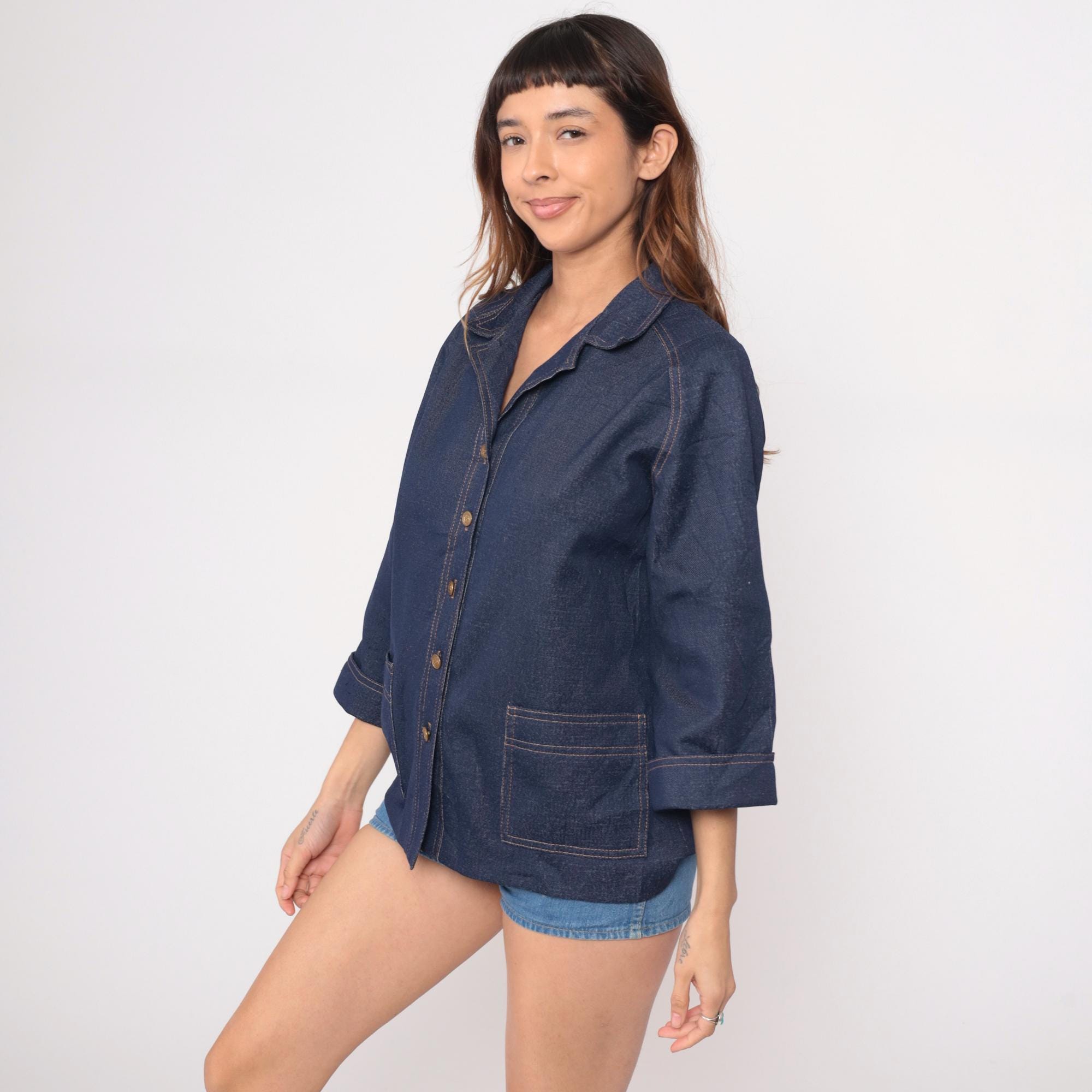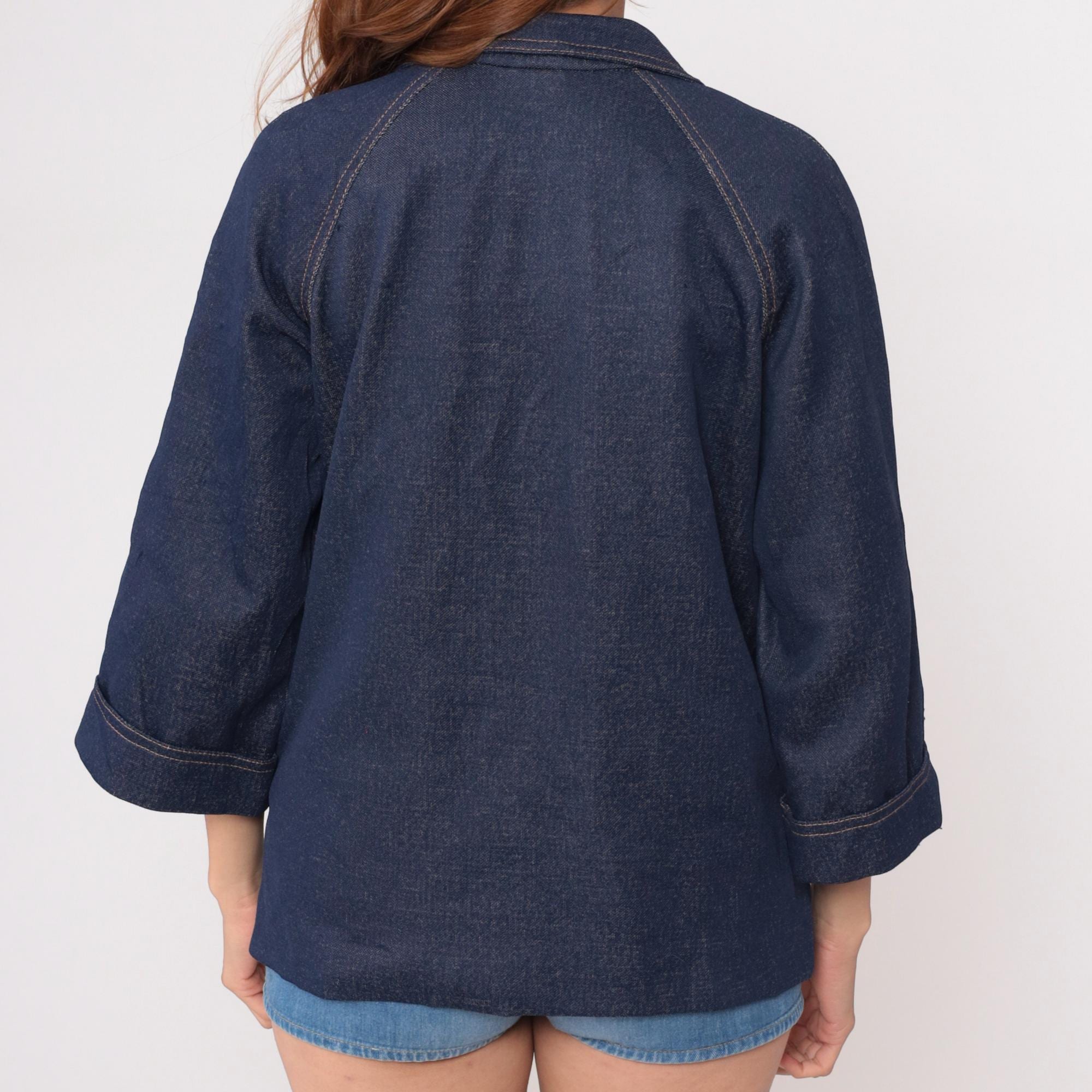 70s dark blue denim jacket from graff with wide notched collar and boxy silhouette. Full button front closure with gold-toned buttons, two chest patch pockets with button flap closures, and two lower patch pockets. Three-quarter length sleeves with button cuffs and contrast tan topstitching throughout.