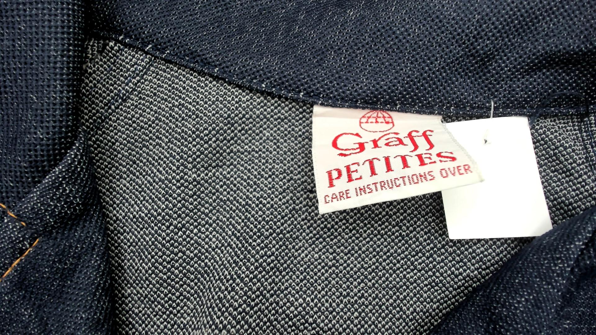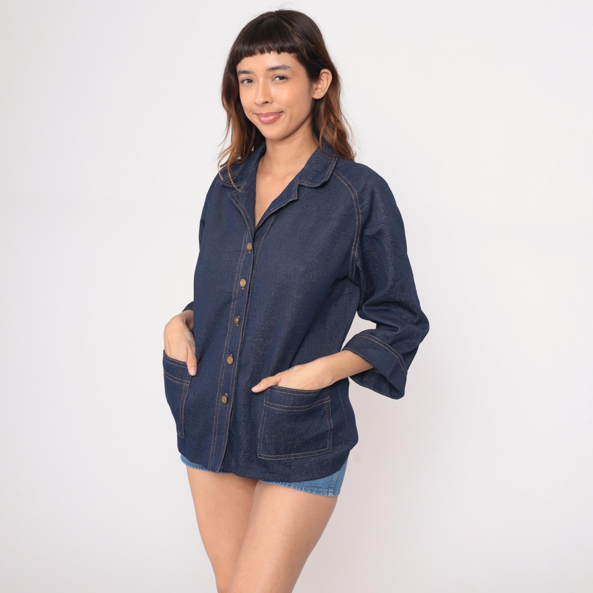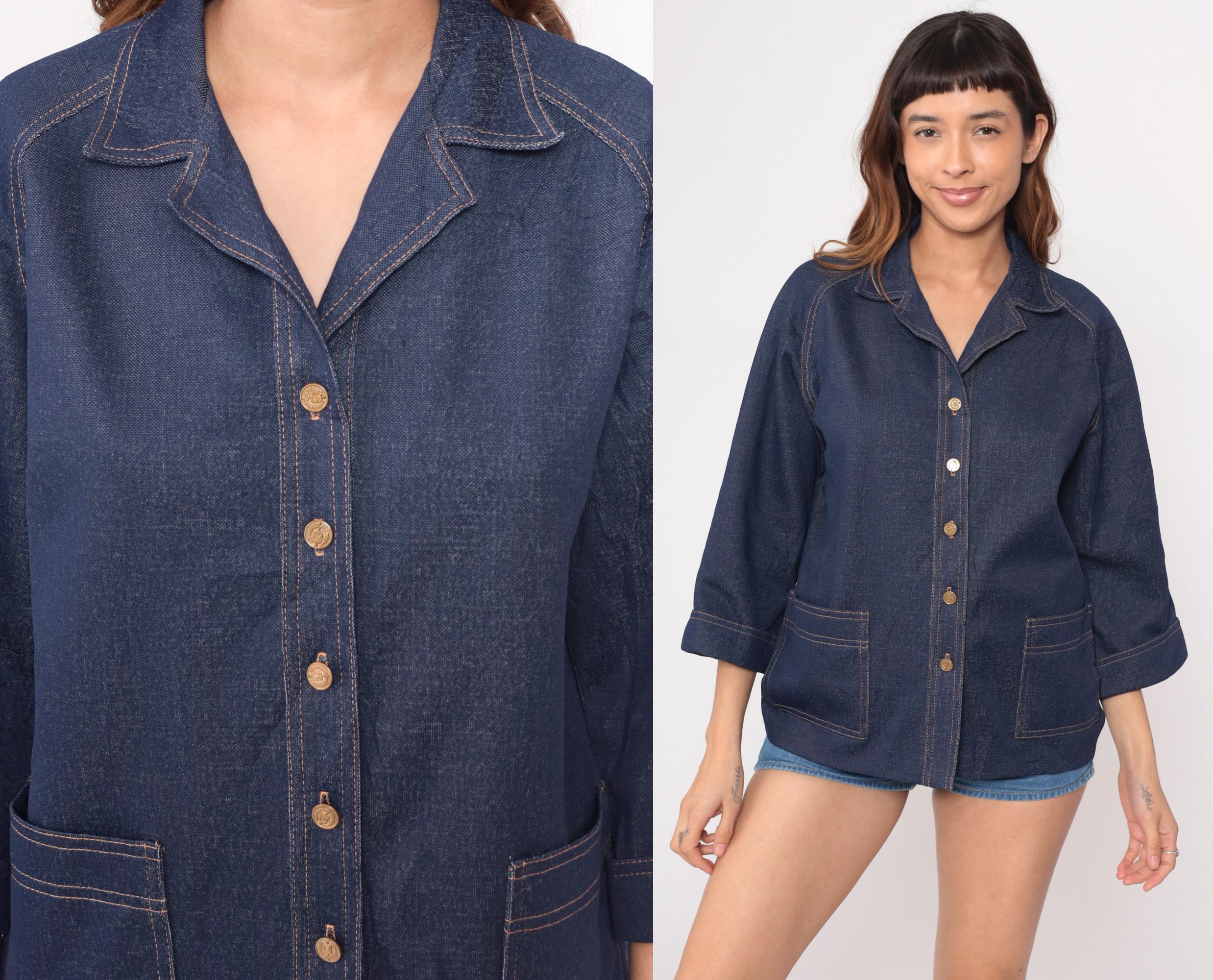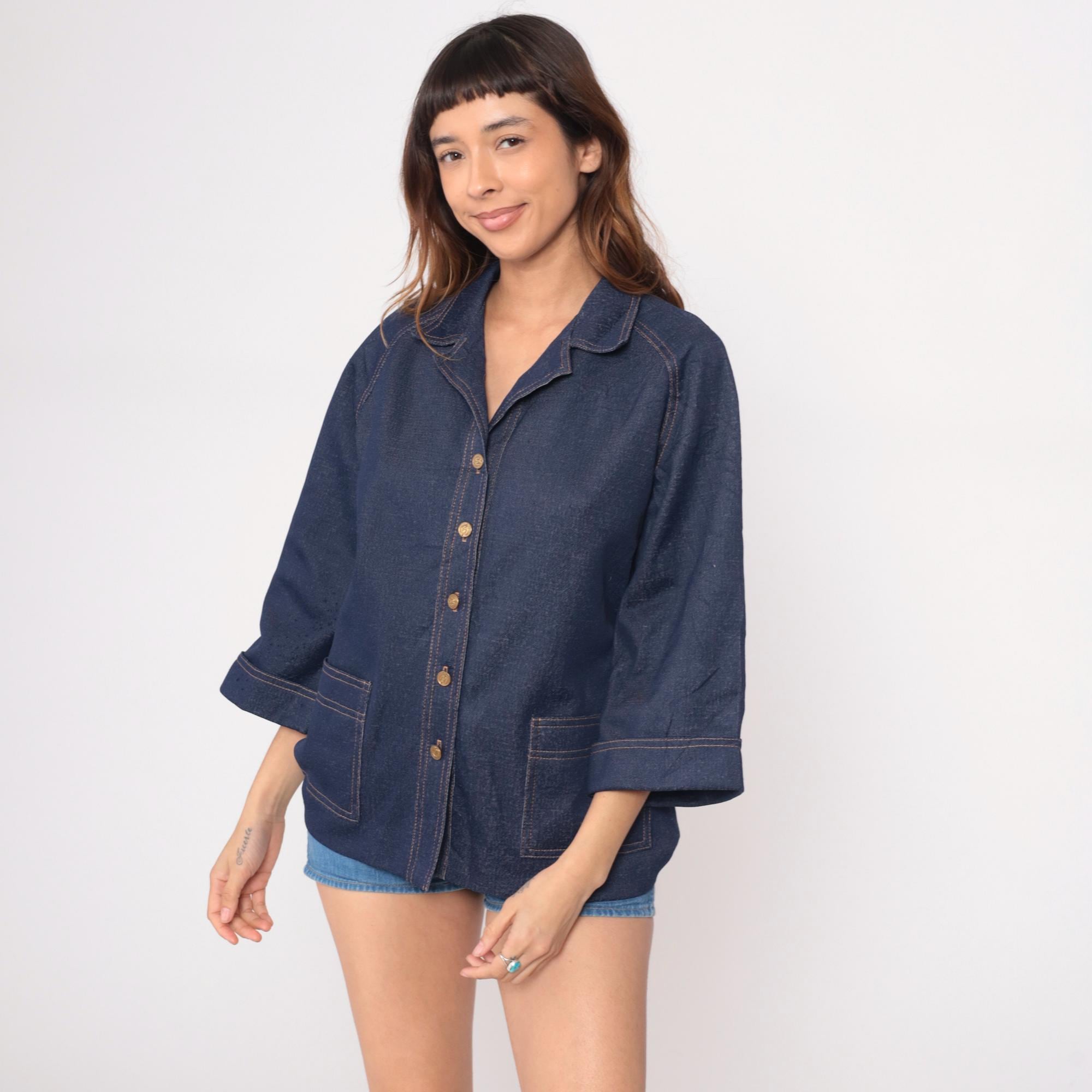 70s dark blue denim jacket from graff with wide notched collar and boxy silhouette. Full button front closure with gold-toned buttons, two chest patch pockets with button flap closures, and two lower patch pockets. Three-quarter length sleeves with button cuffs and contrast tan topstitching throughout.