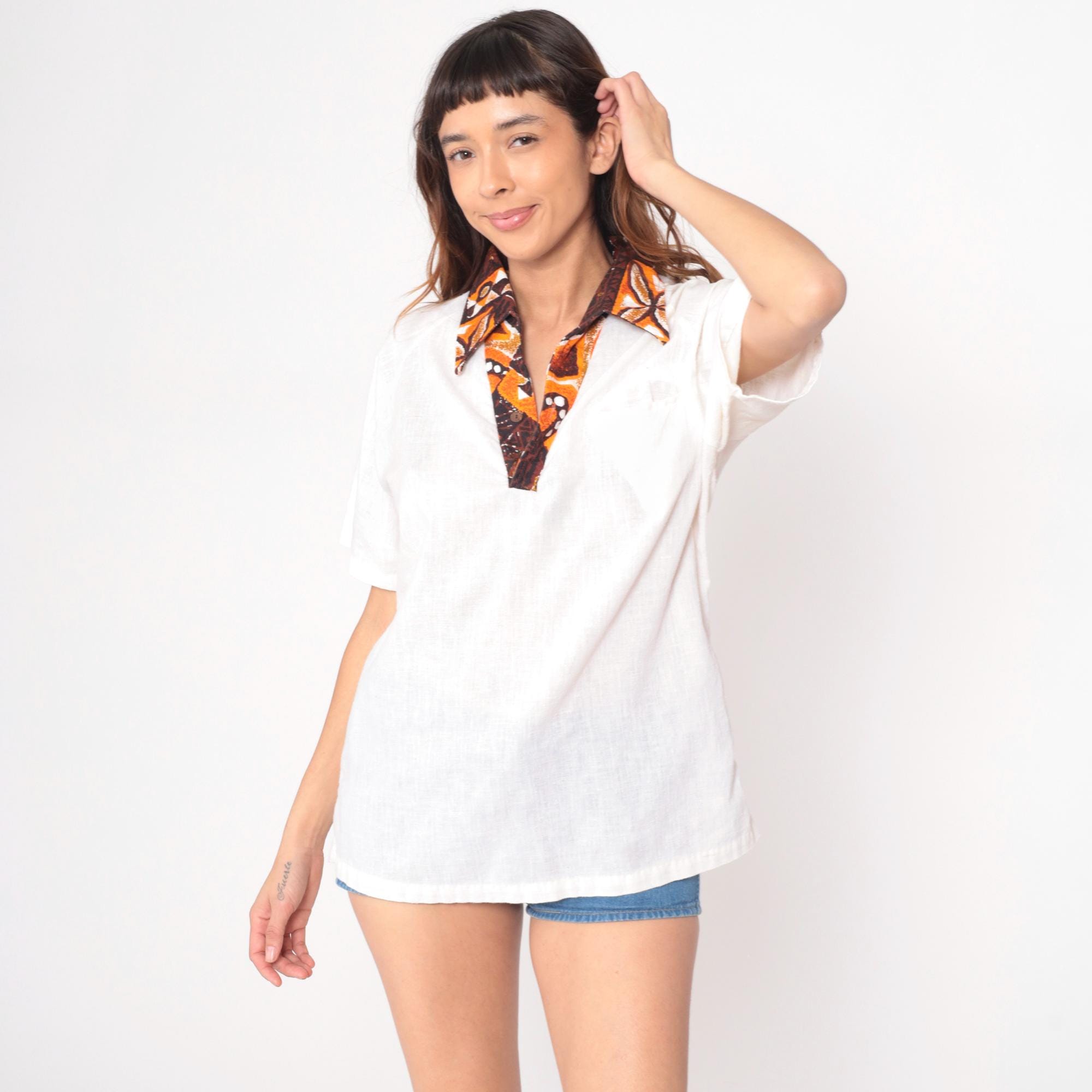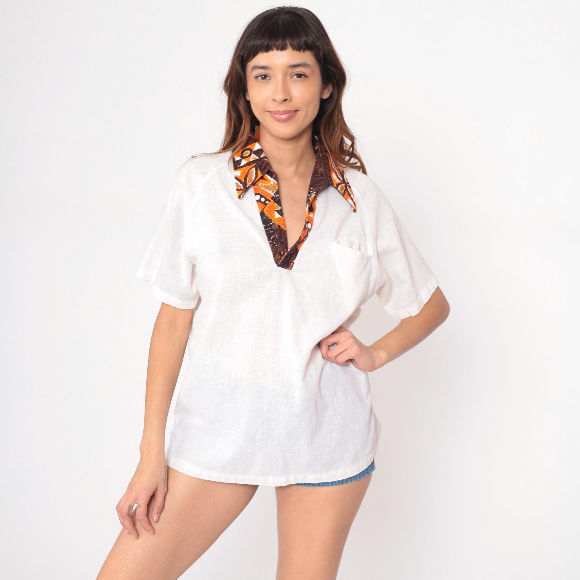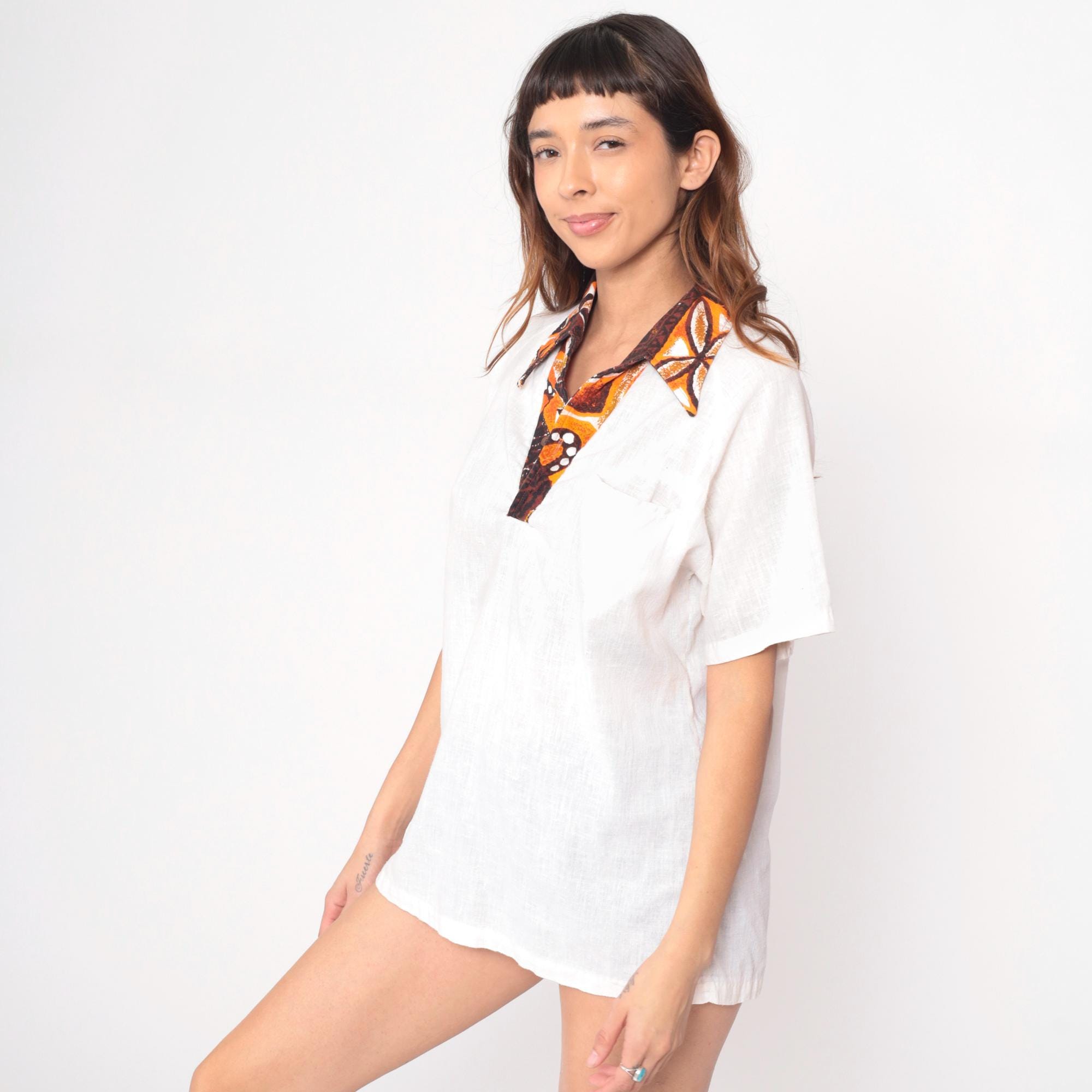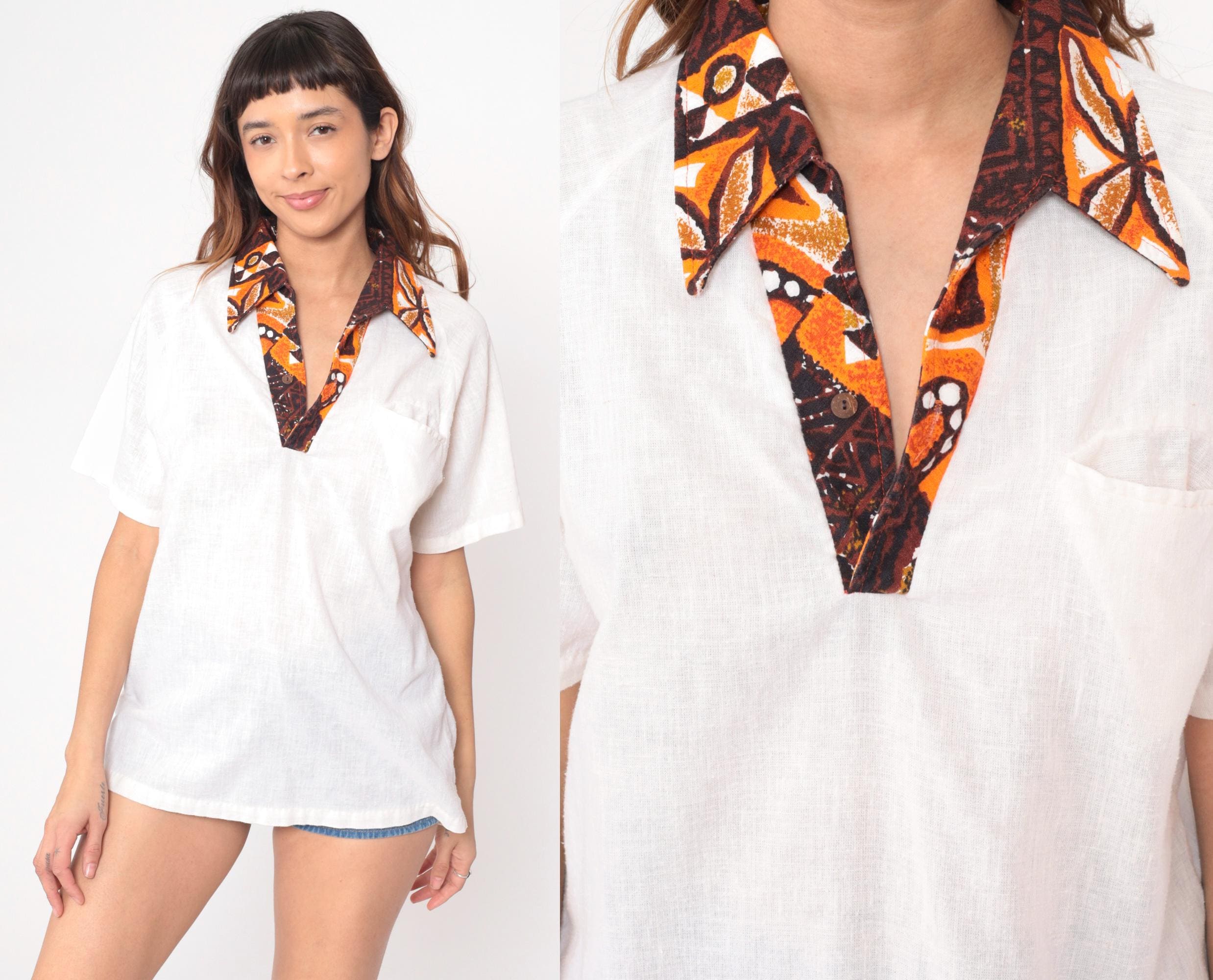 70s cream Hawaiian shirt from Kimolo Fashions with brown and orange batik-style collar and placket trim. Pointed collar, short sleeves, V-neck opening with contrast fabric detail extending down front.