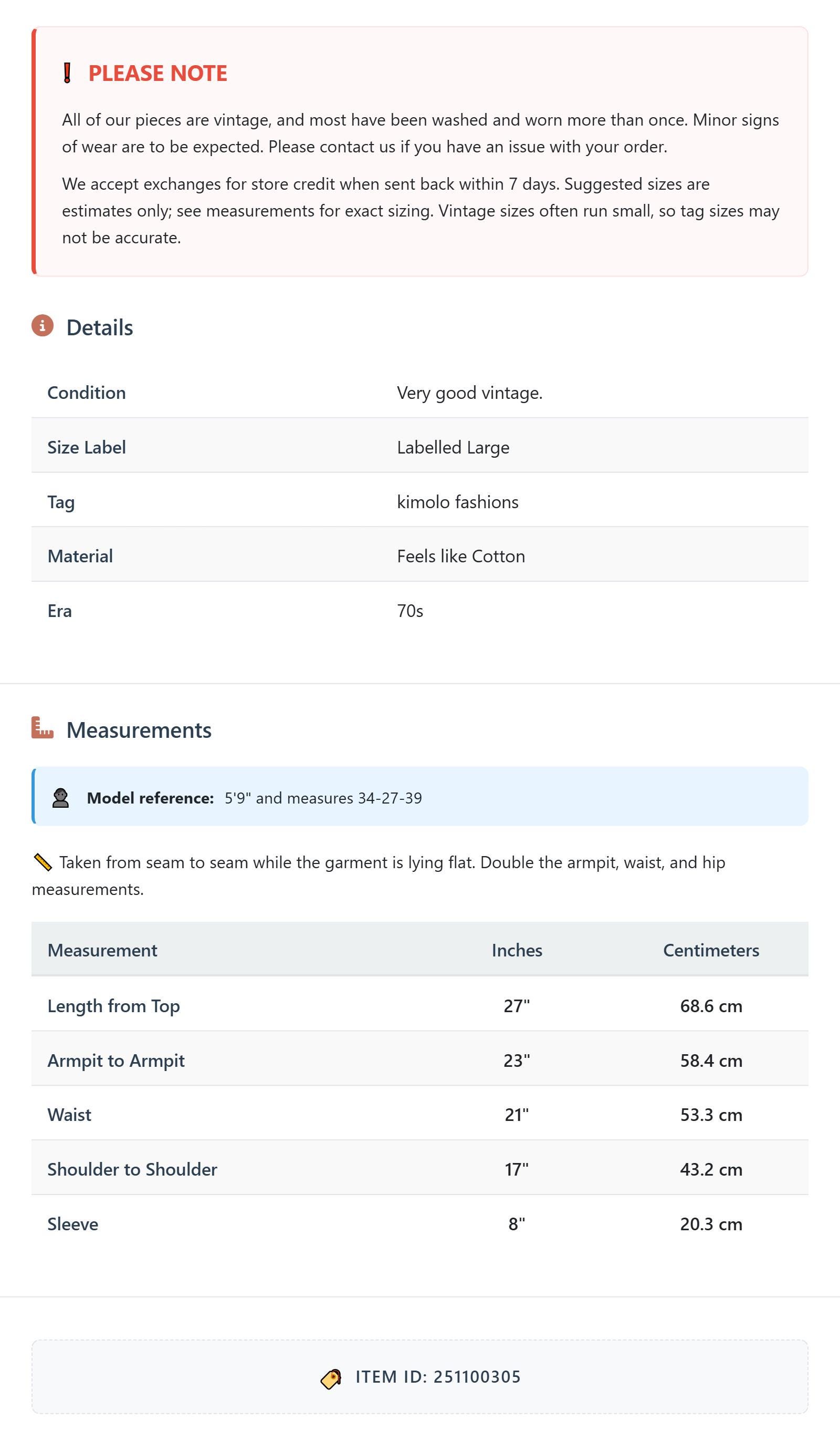 All of our pieces are vintage, and most have been washed and worn more than once. Minor signs of wear are to be expected. Please contact us if you have an issue with your order. We accept exchanges for store credit when sent back within 7 days.