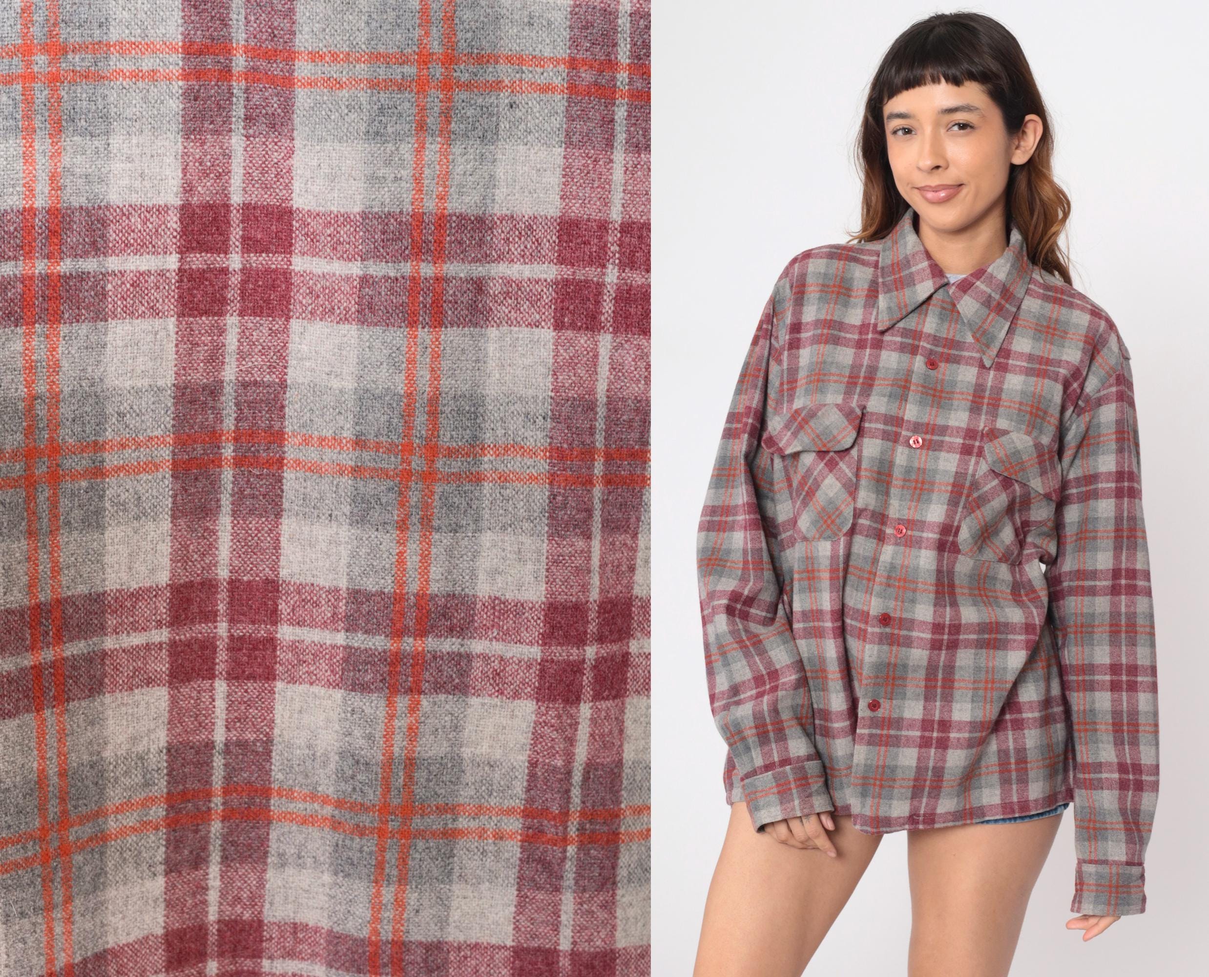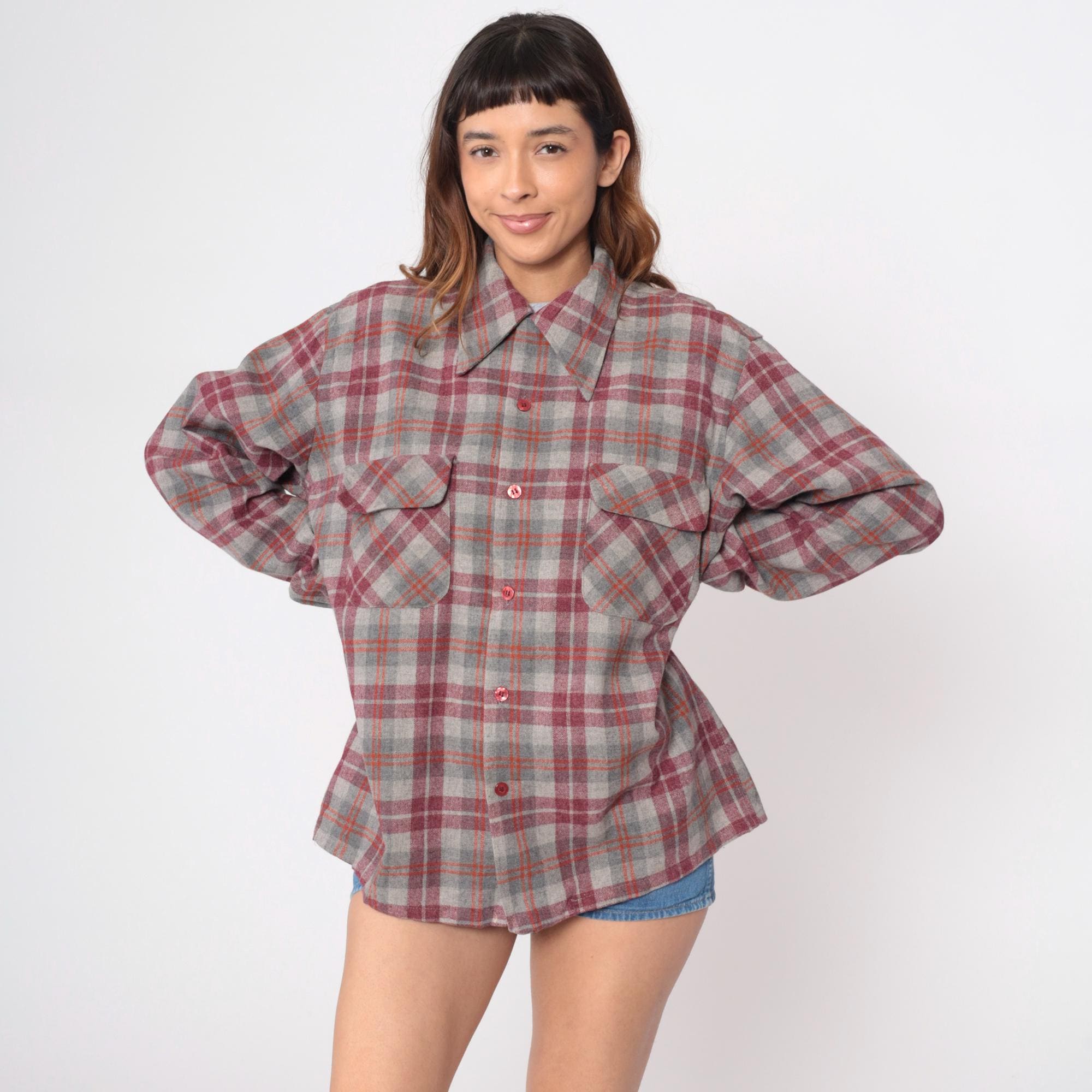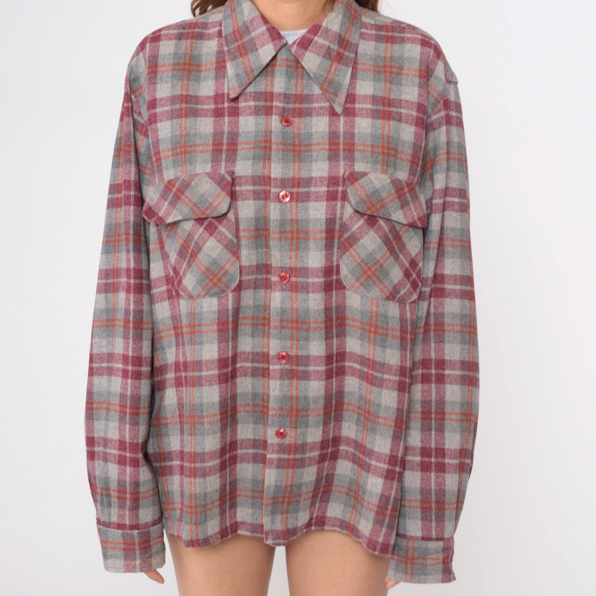 70s plaid flannel shirt from Royal Knight in burgundy, grey, cream, and orange check pattern. Long sleeves with button cuffs, pointed collar, two chest pockets with flaps and rounded edges. Button front closure with matching burgundy buttons.