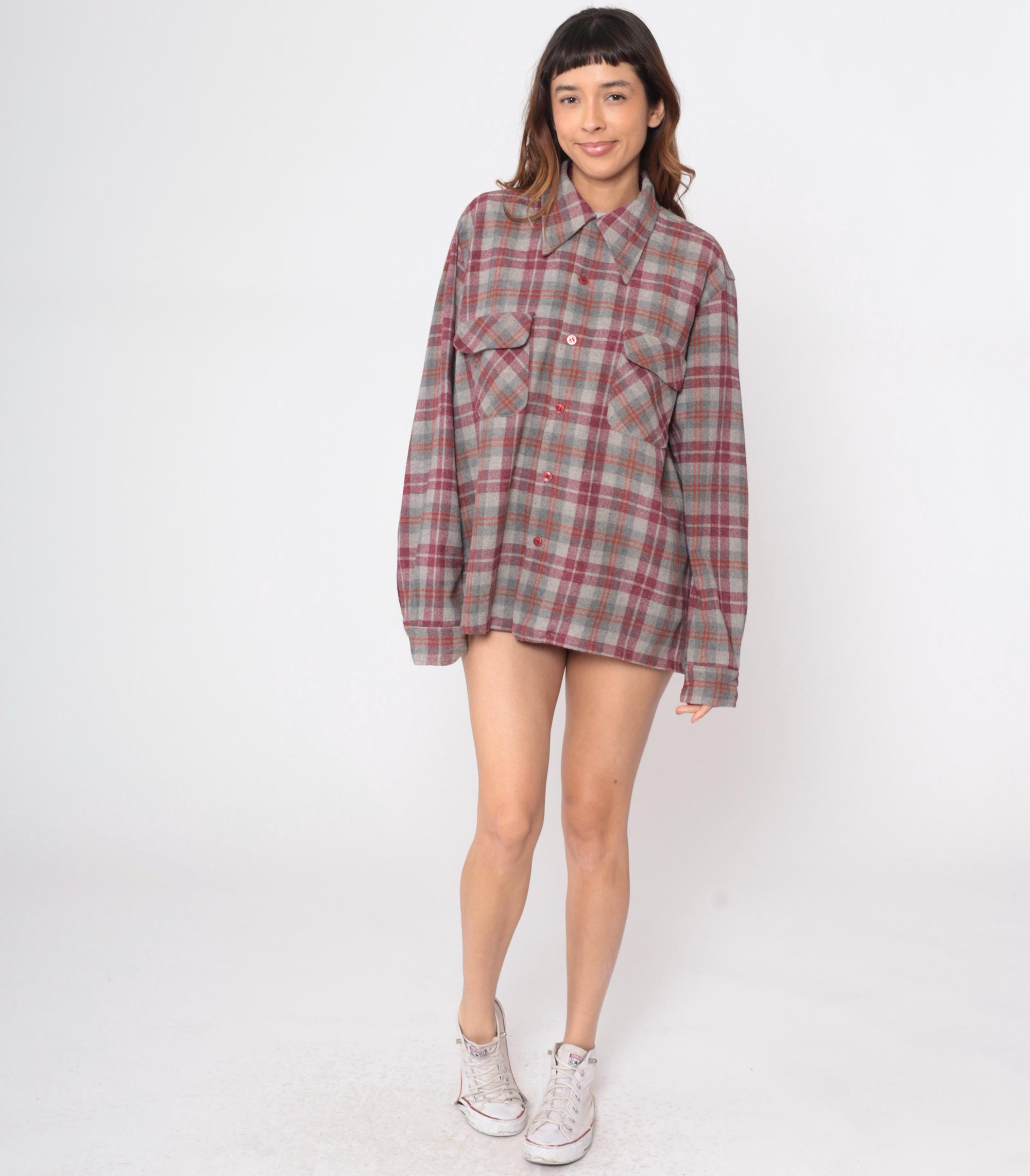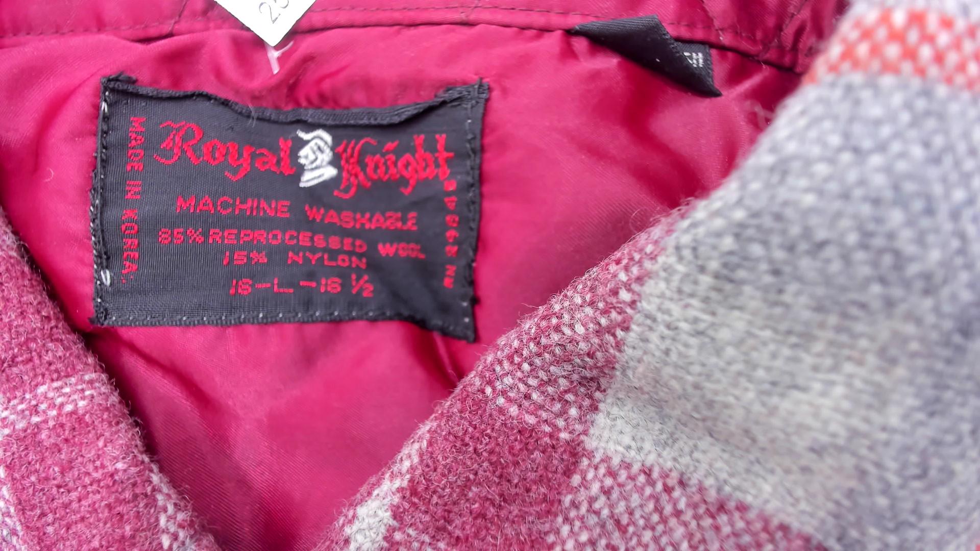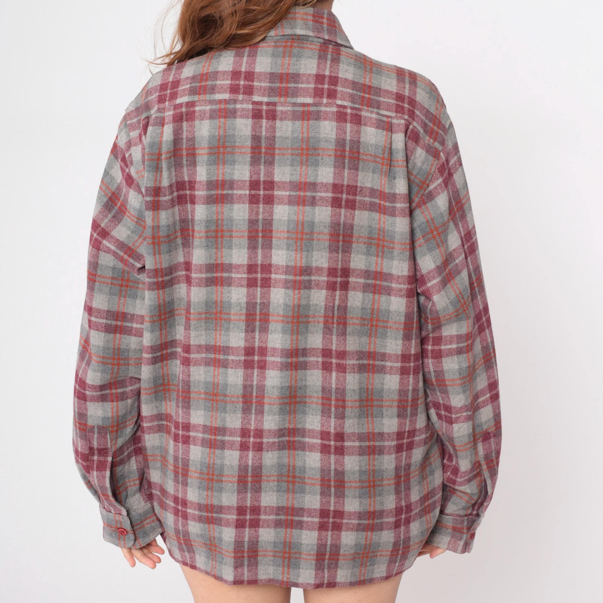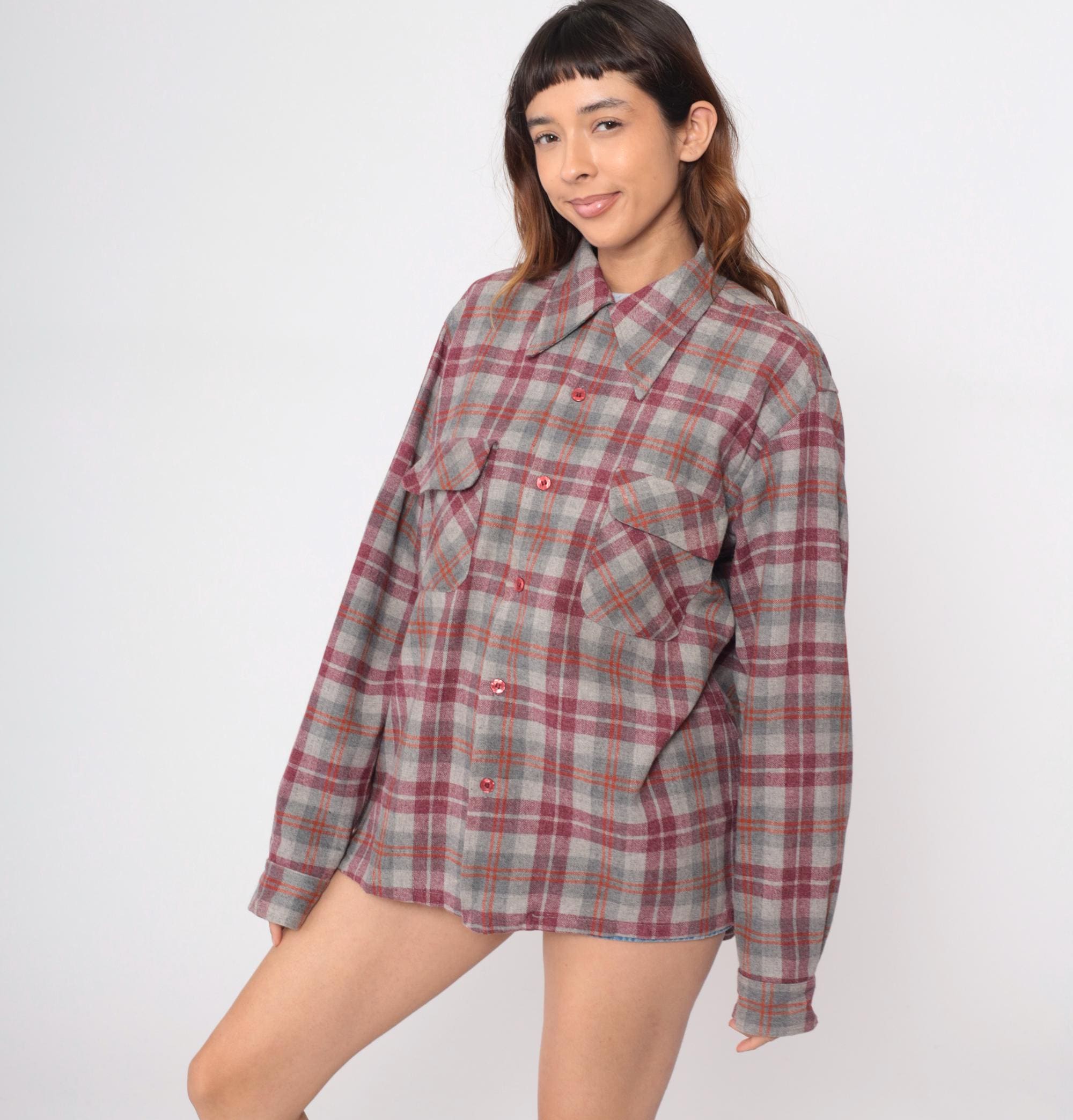 70s plaid flannel shirt from Royal Knight in burgundy, grey, cream, and orange check pattern. Long sleeves with button cuffs, pointed collar, two chest pockets with flaps and rounded edges. Button front closure with matching burgundy buttons.