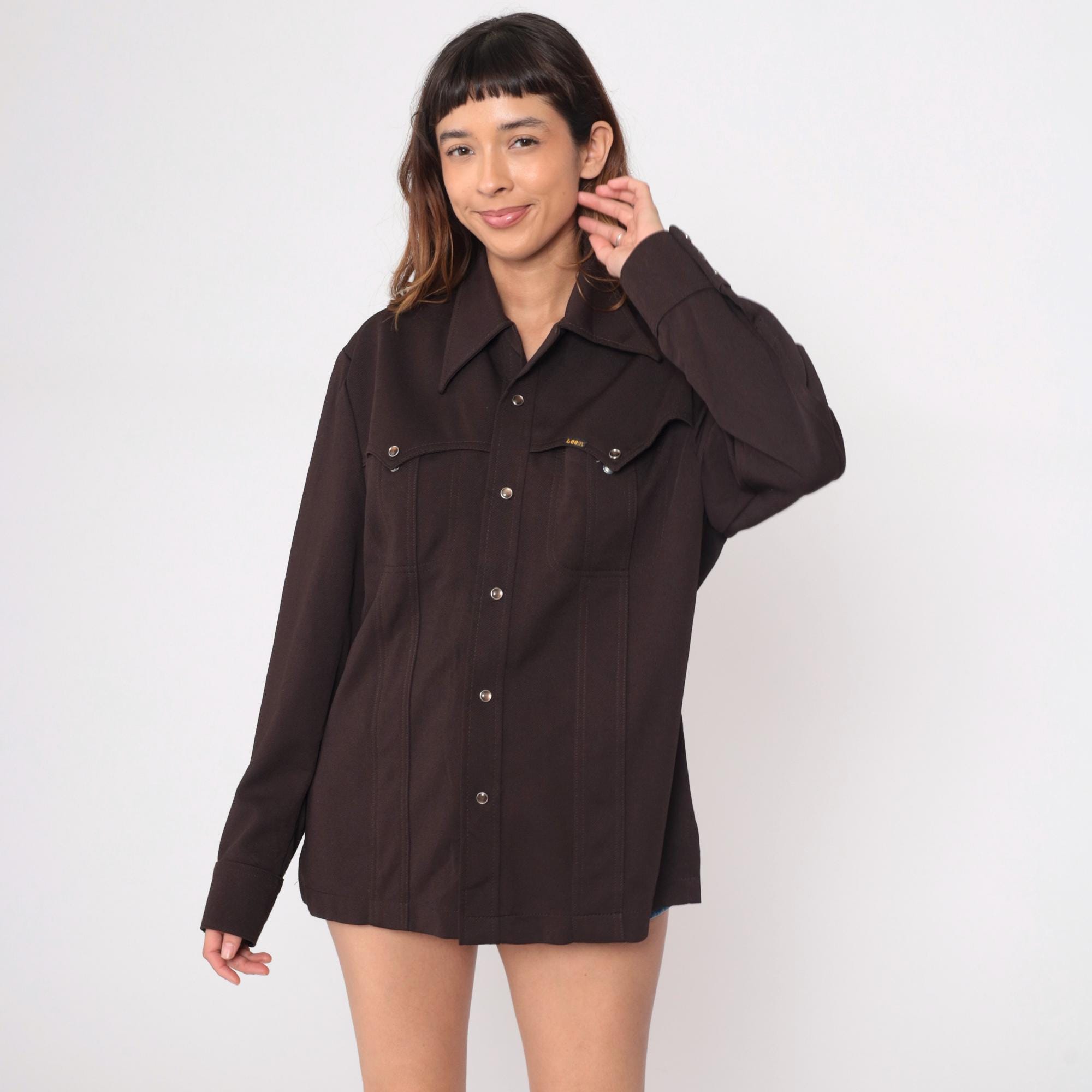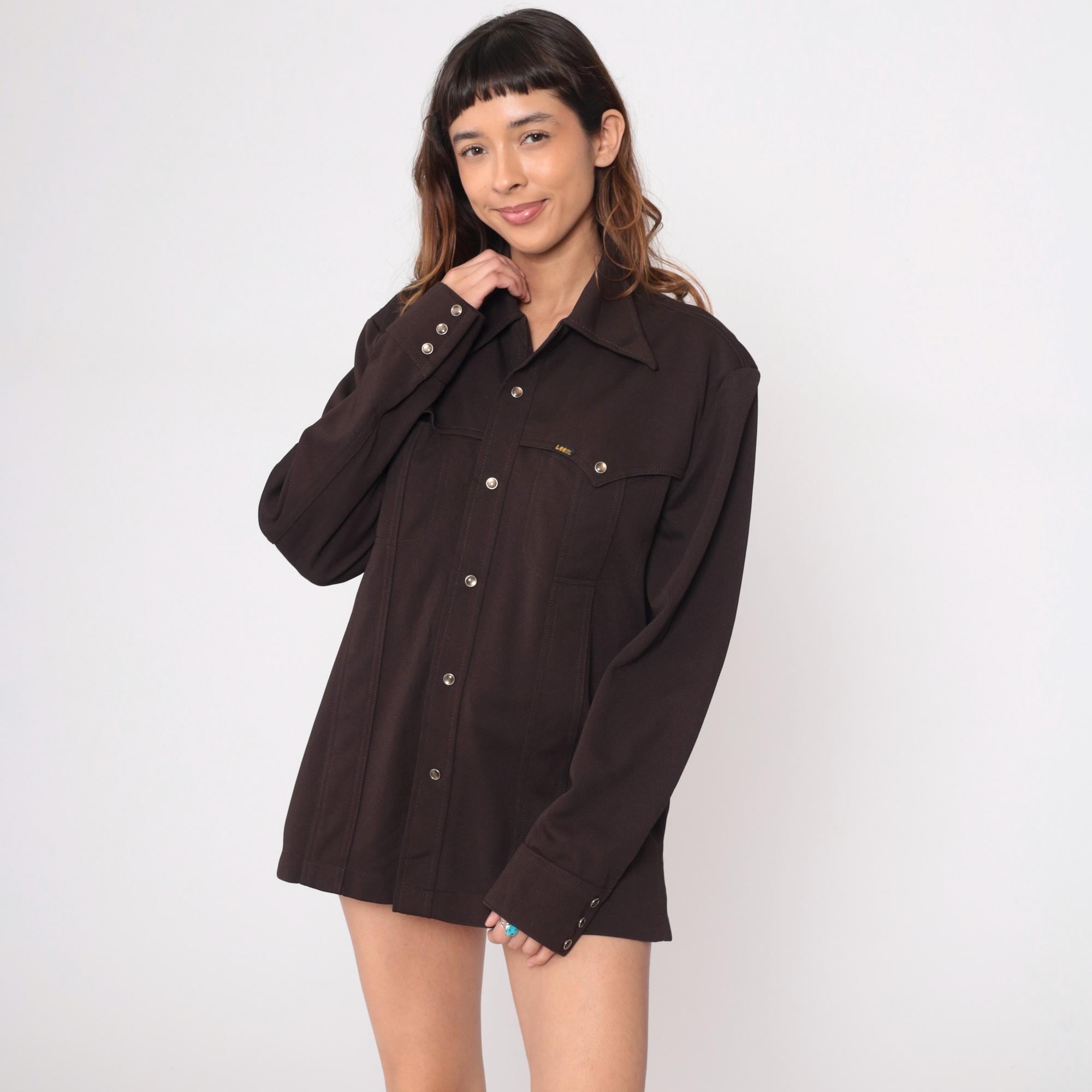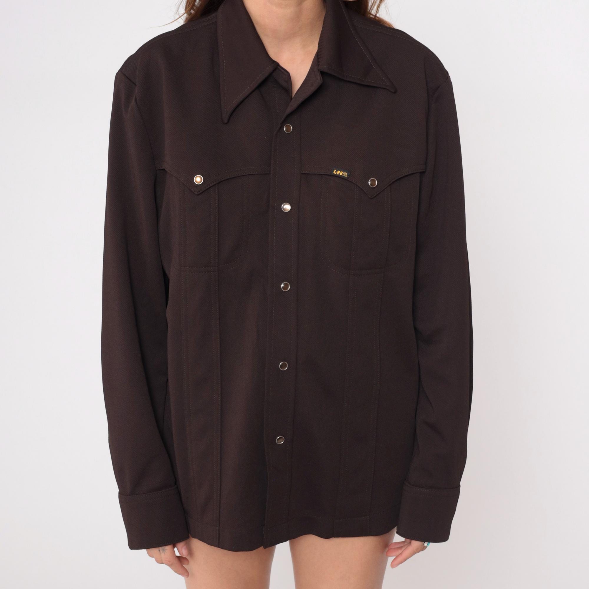 70s chocolate brown western shirt from Lee with snap button front closure and pointed collar. Two chest pockets with pointed flaps and snap button closures, western yoke detailing across the back shoulders. Long sleeves with snap button cuffs.