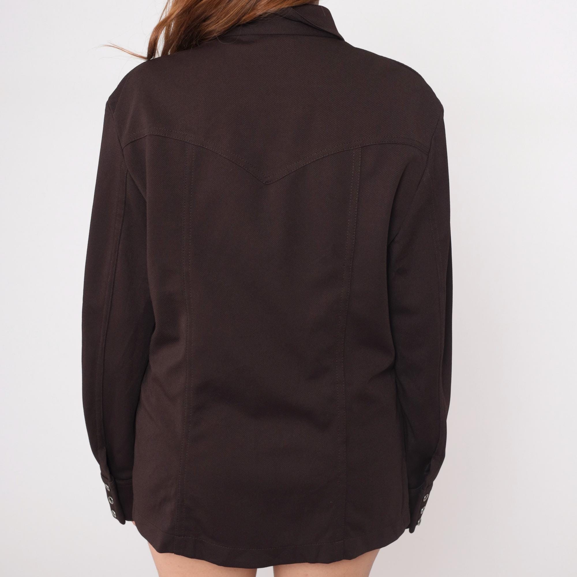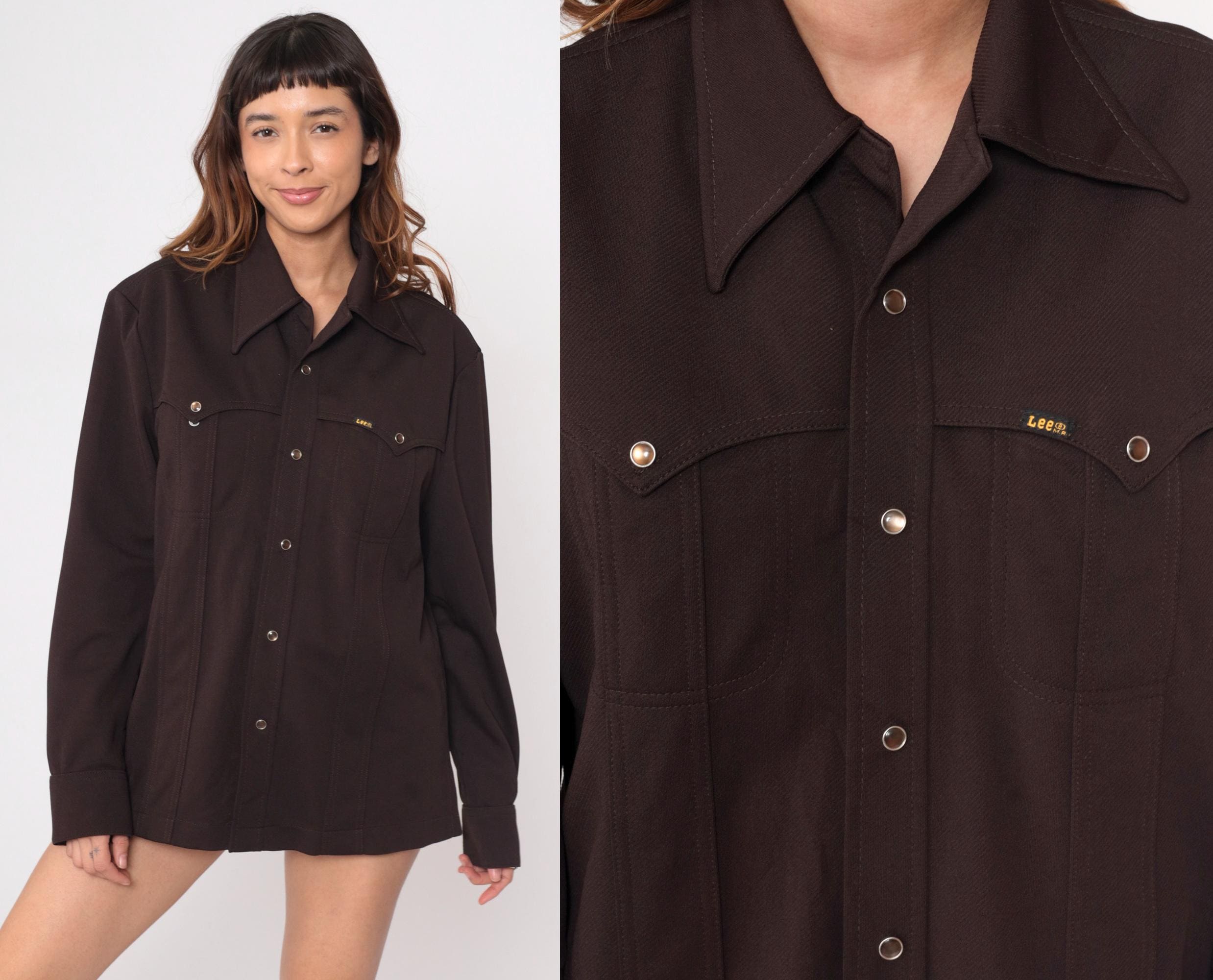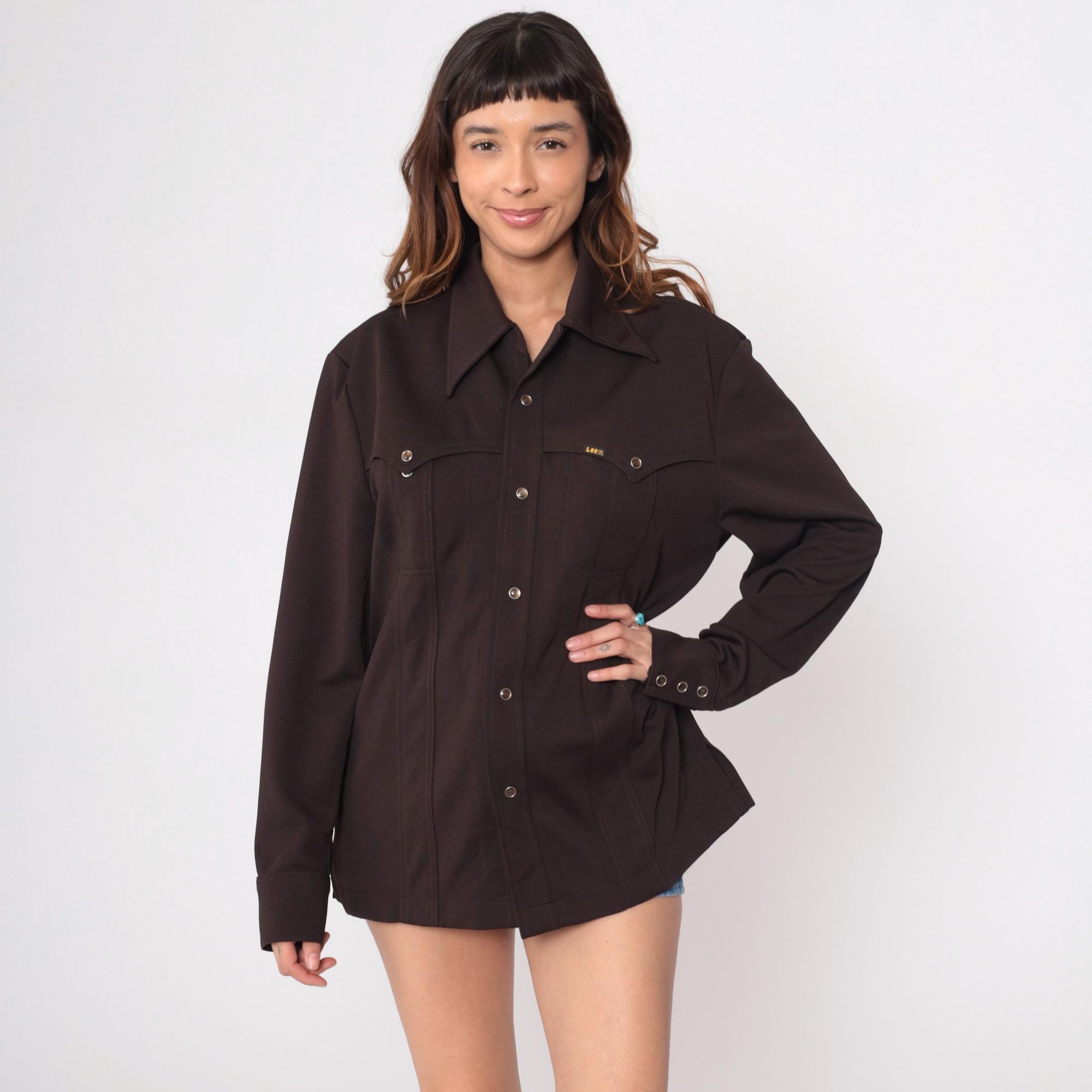 70s chocolate brown western shirt from Lee with snap button front closure and pointed collar. Two chest pockets with pointed flaps and snap button closures, western yoke detailing across the back shoulders. Long sleeves with snap button cuffs.