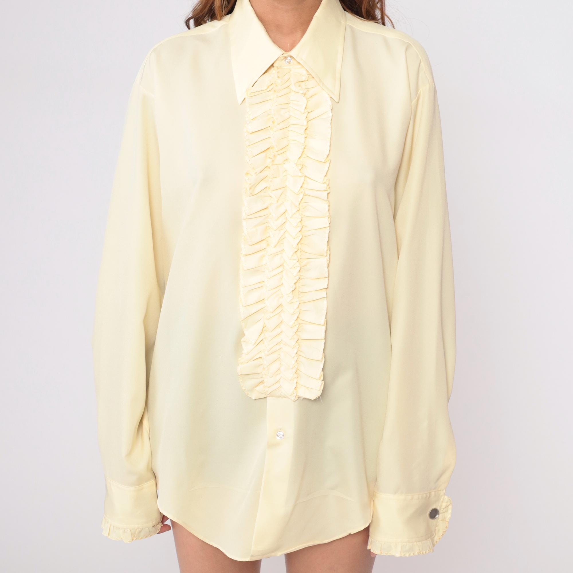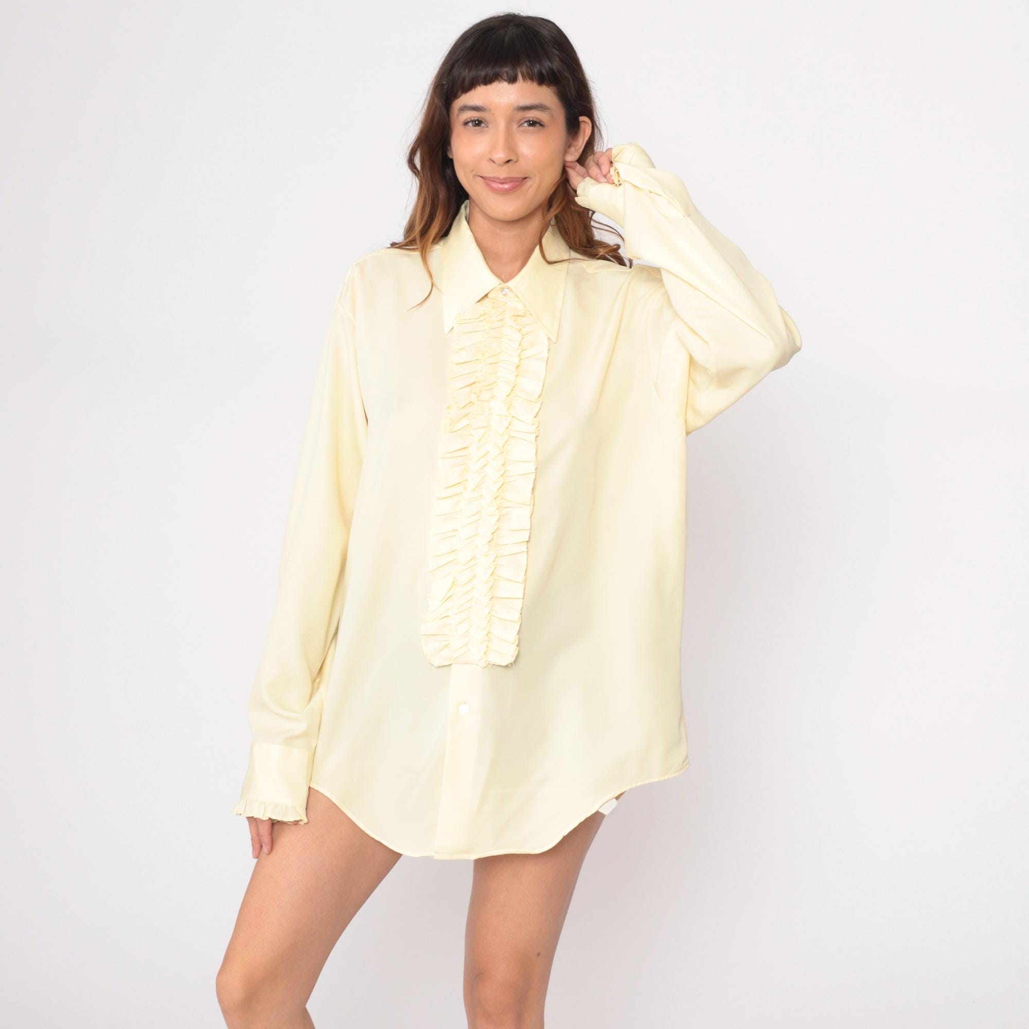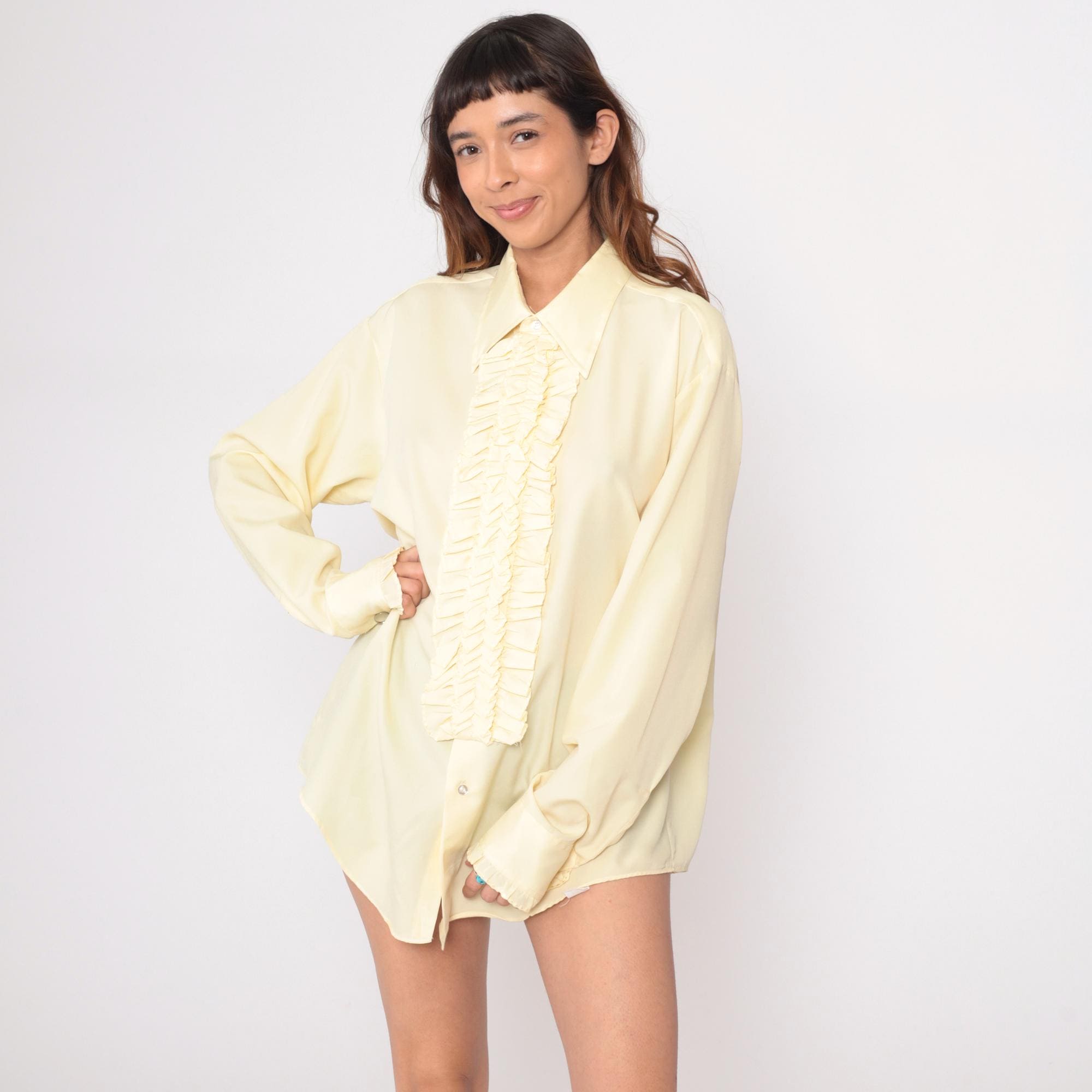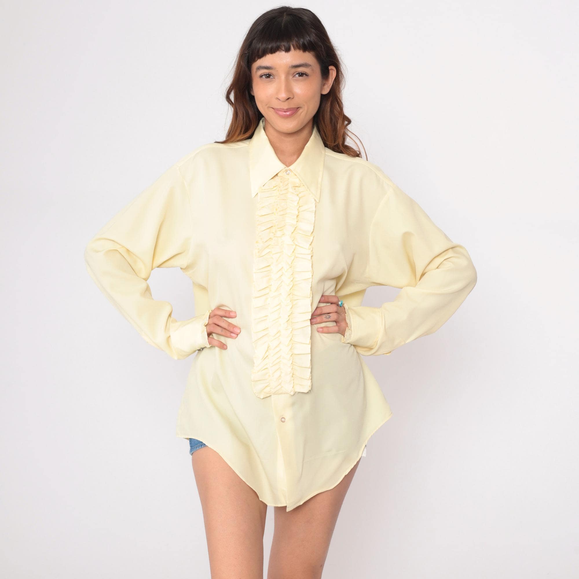 70s pale yellow shirt from Joe Namath Arrow Collar Man with wide pointed collar and ruffled front placket detail. Long sleeves with button cuffs, full button front closure with coordinating pale buttons.